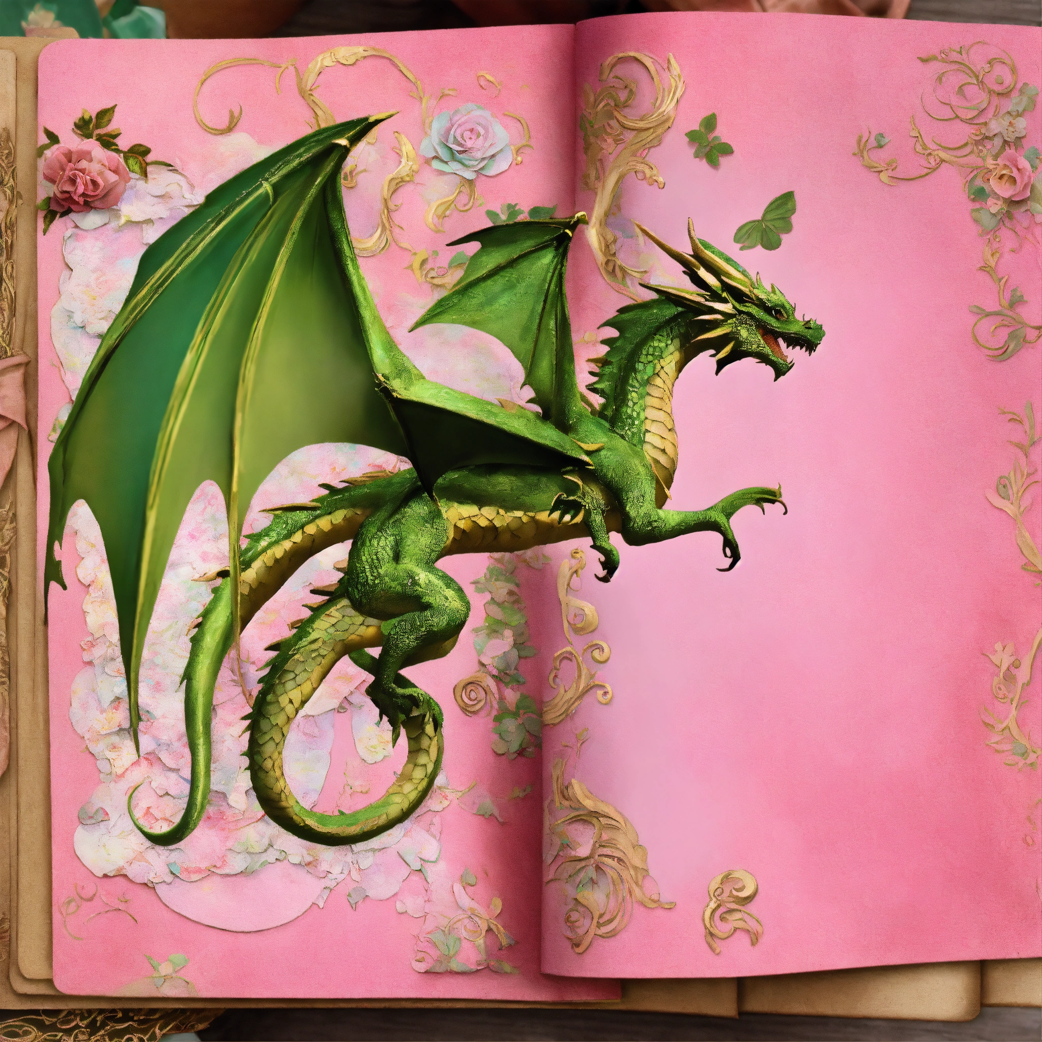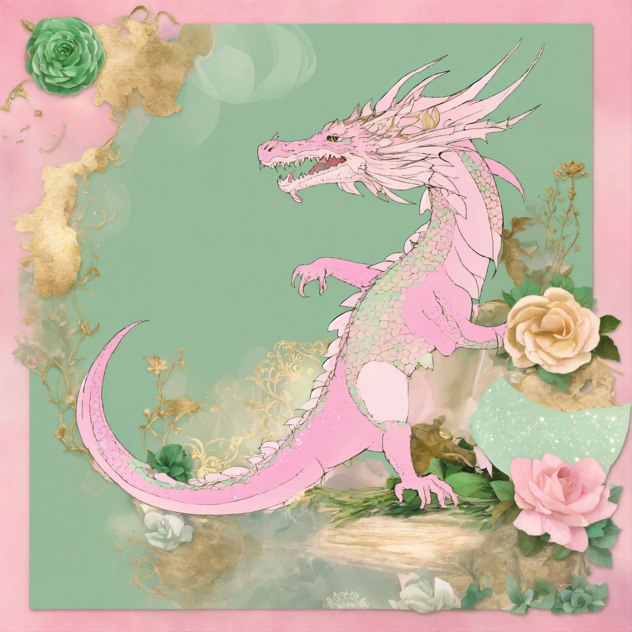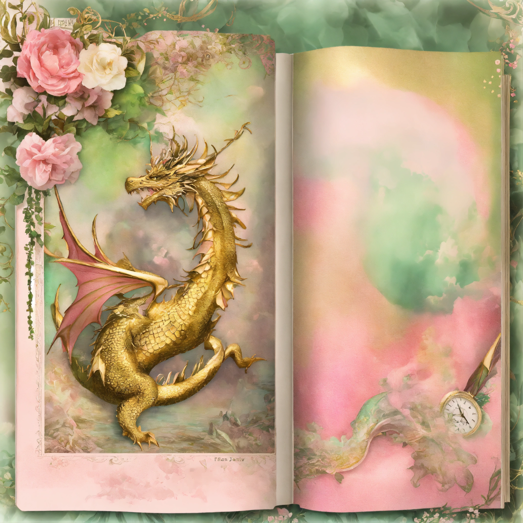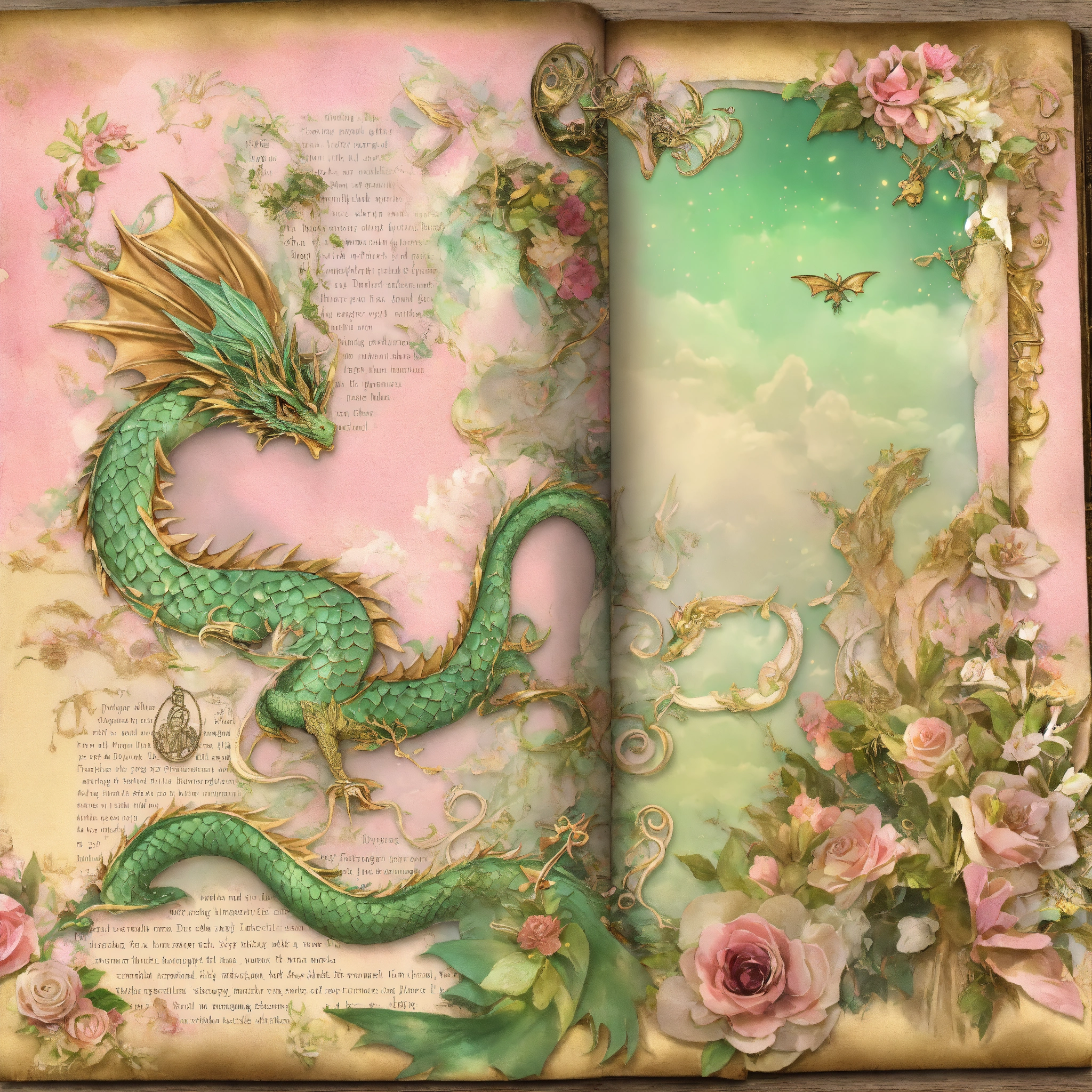 Shabby chic dreamy mist pastel junk journals fairytale dragon, pastel pink and green and gold, paper layouts, dragon junk journal kit vintage journal papers dragon fantasy junk journal scrapbook collage sheet craft page ephemera digital swirling magical fairytale abstract art style