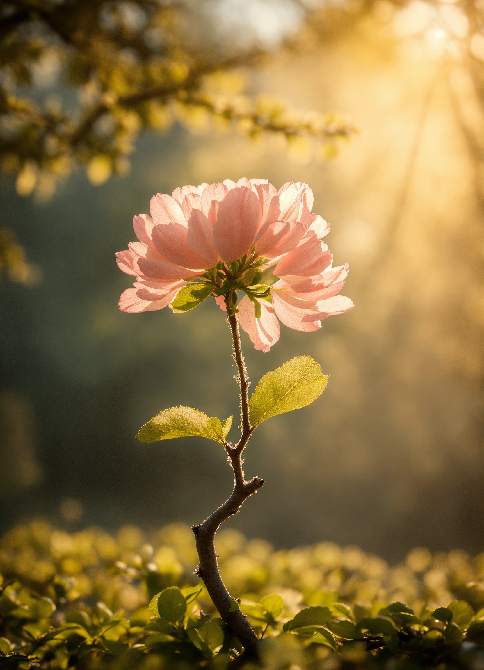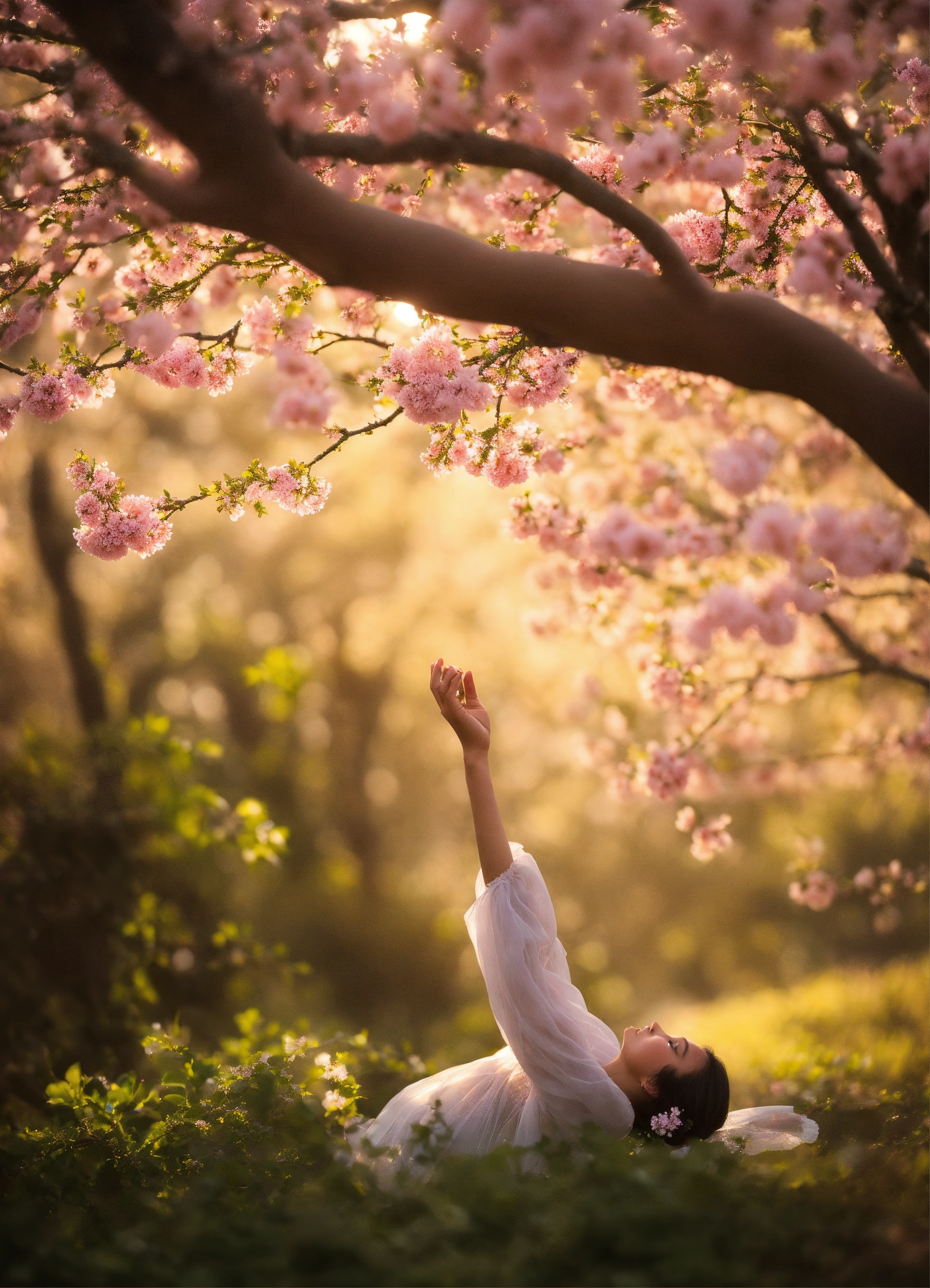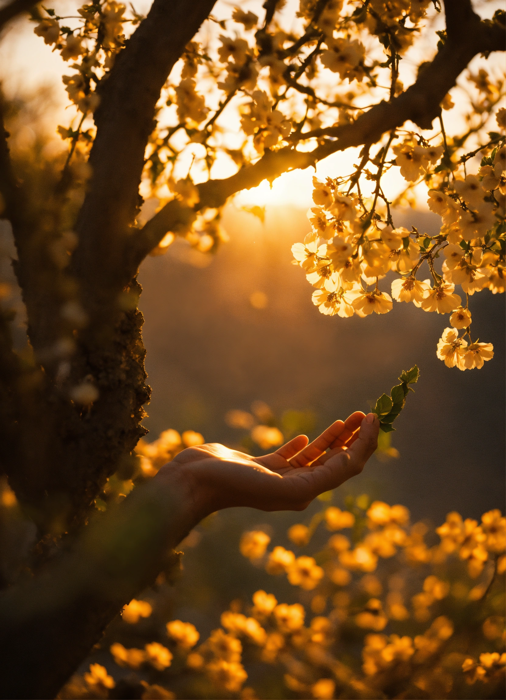 "create an image capturing a hand reaching upward into the air, delicately grasping a blooming branch. the hand should be depicted in a natural and graceful posture, showcasing the connection between human touch and the beauty of nature. the blooming branch should be resplendent with flowers, conveying a sense of vitality and renewal. the image should evoke a feeling of serenity and the wonder of the natural world."