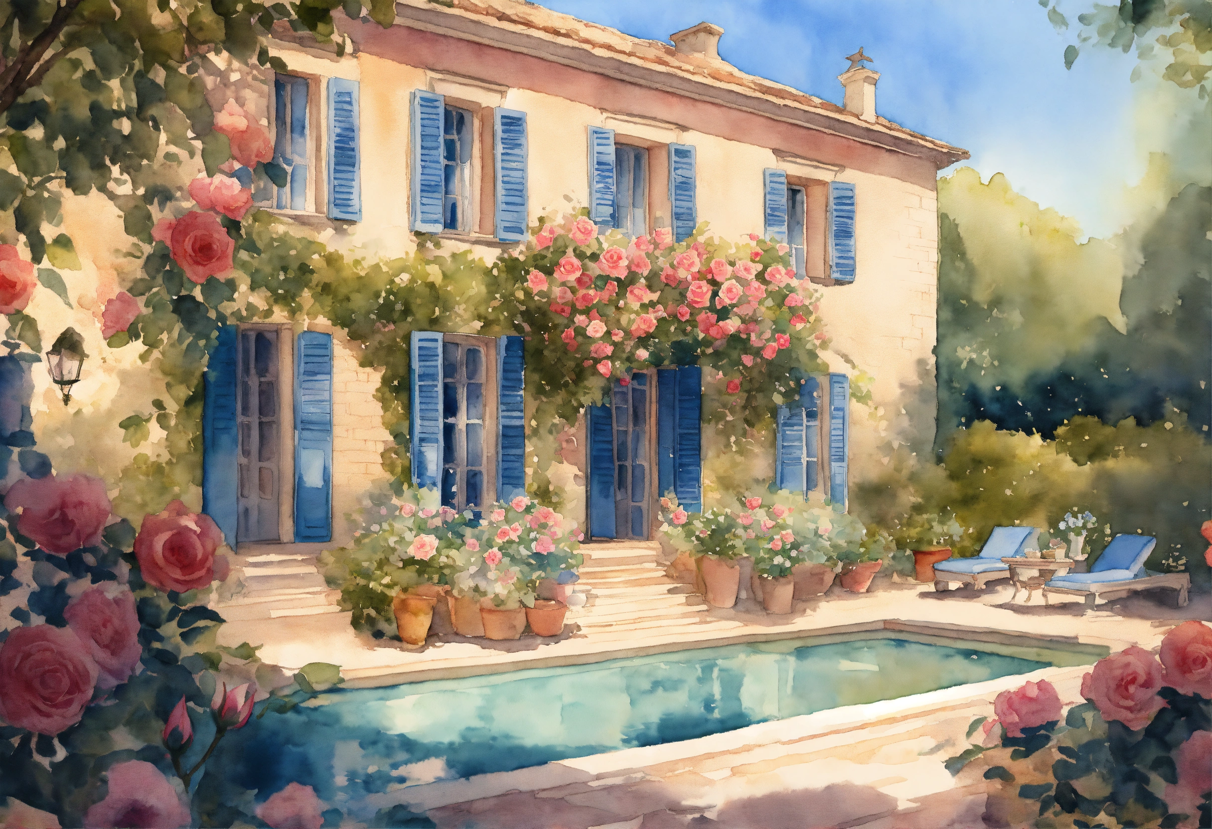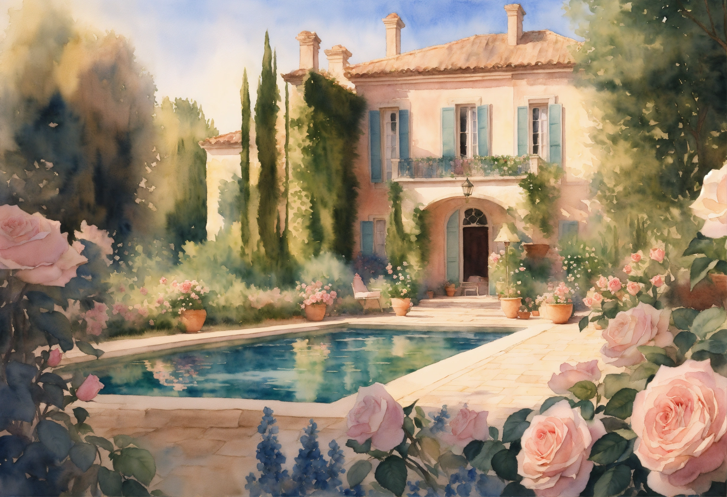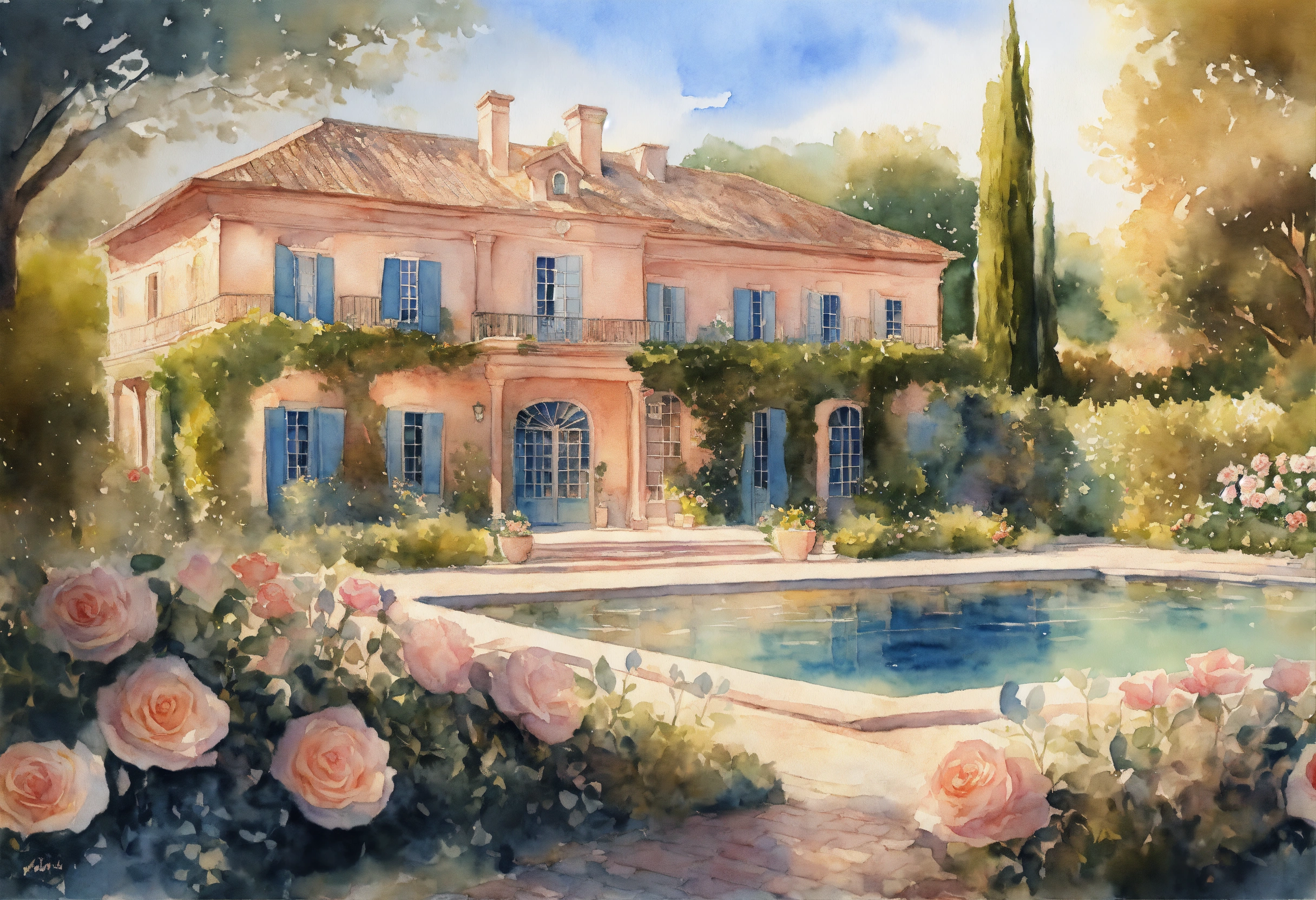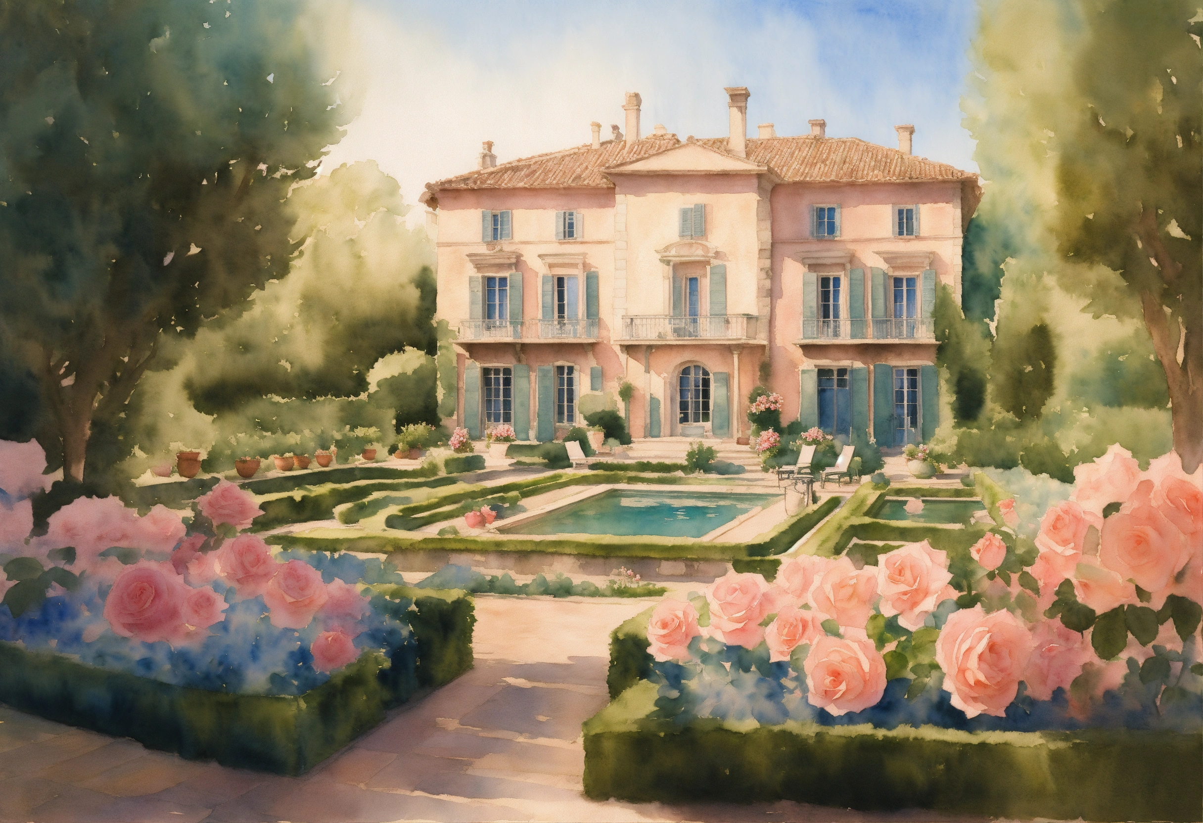 Watercolour painting, pastel colours, warm light, intricate and detailed, beautiful garden, beautiful mansion, pool, provence, 8k, ultra-detailed, sharp focus, rose garden