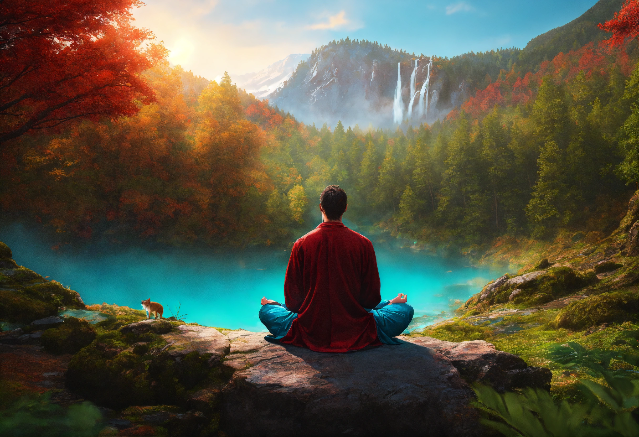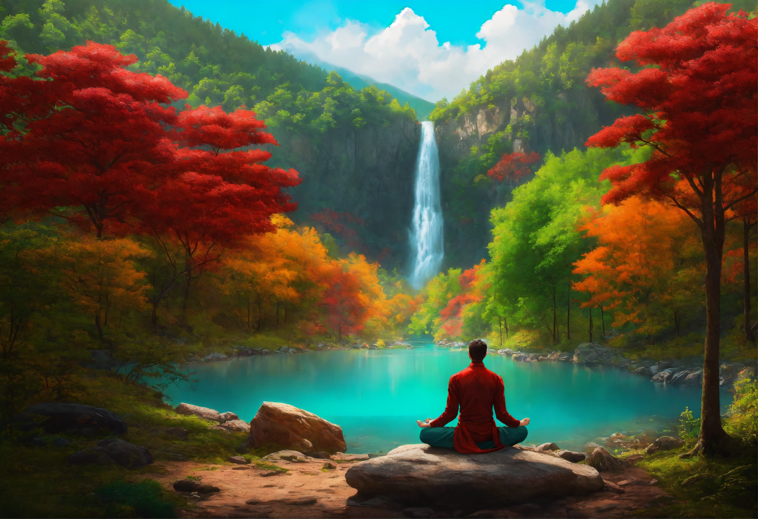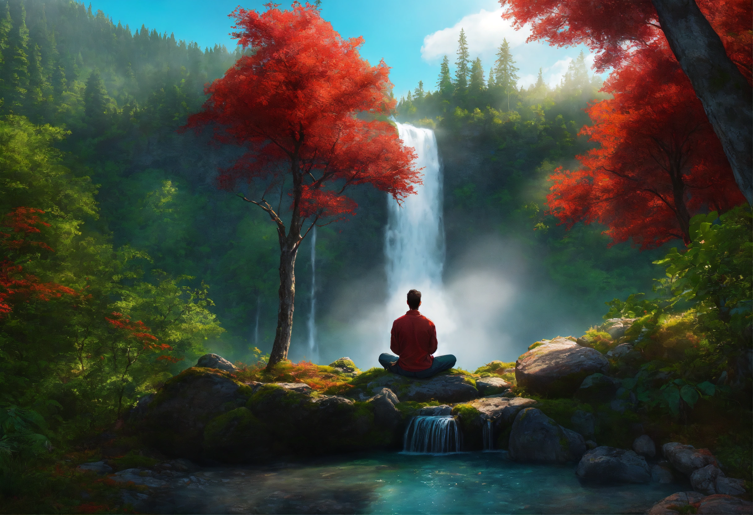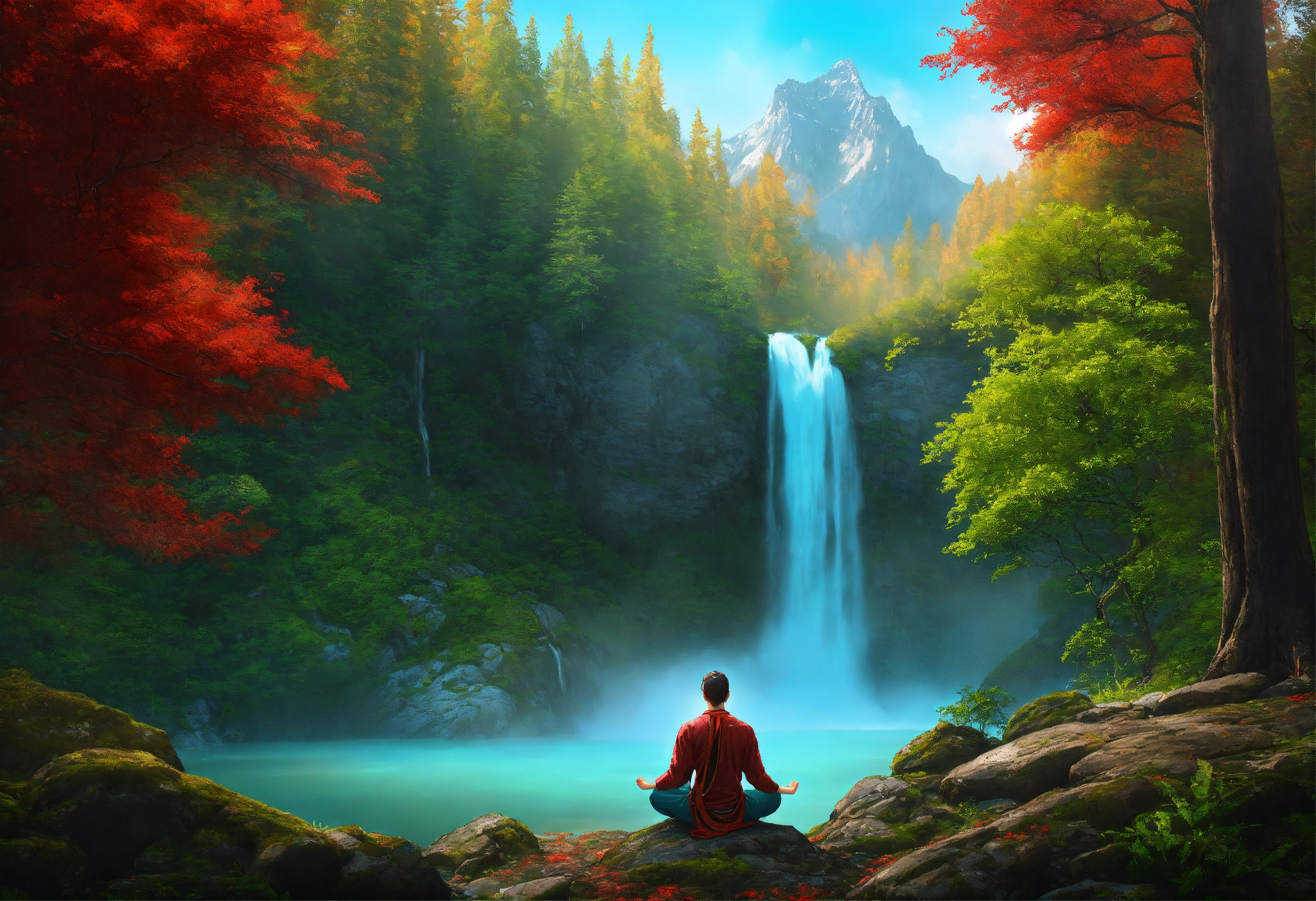 A hyperrealistic image of a man meditating in the mountains surrounded by forest. the forest has green, red and cyan trees. it is very early in the morning. there is a waterfall.