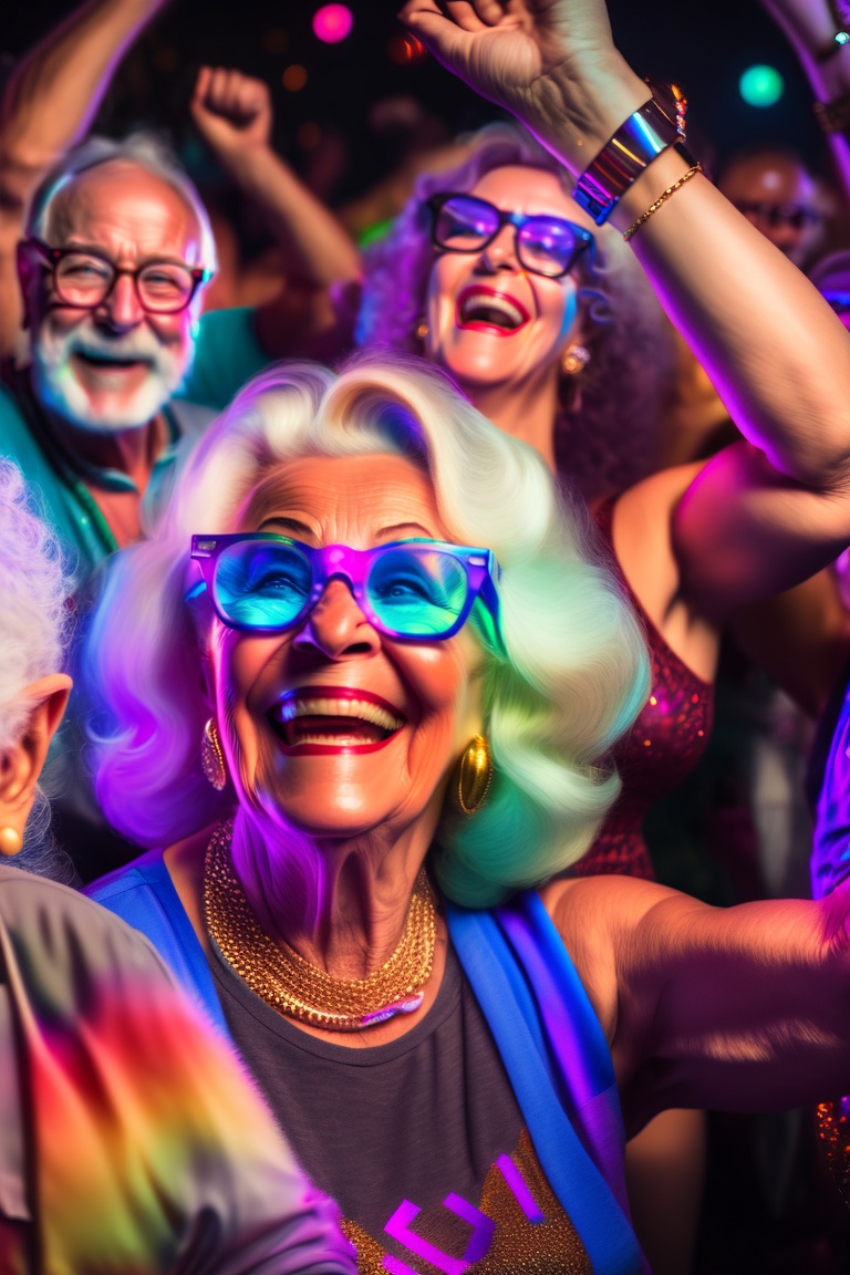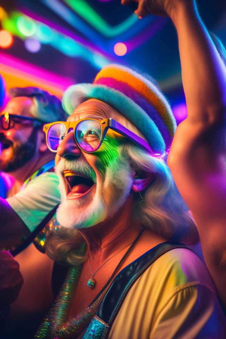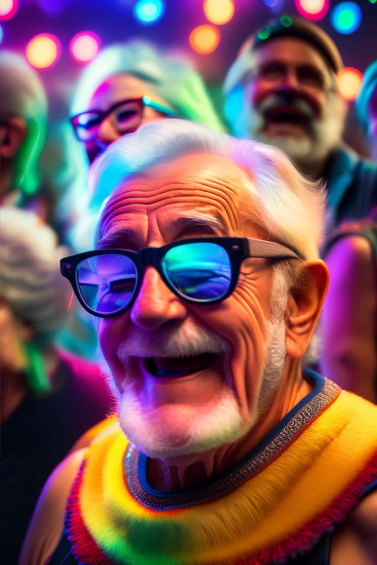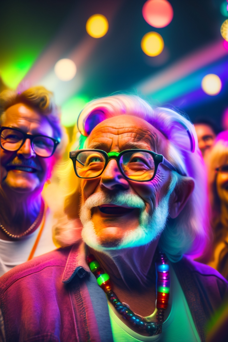 Old people raving at a psychedelic party during 80’s, happiness at its extreme, wearing glasses and garlands, tap to the beats, super f, cinematic lighting, fkaa, txaa, rtx, ssao, post processing, post-production, full color, hdr, realistic, 8k, color grading, portrait ¾-detailed, beautifully color-coded, insane details, intricate details, shutter speed 1/1000, f/22, white balance, 32k
