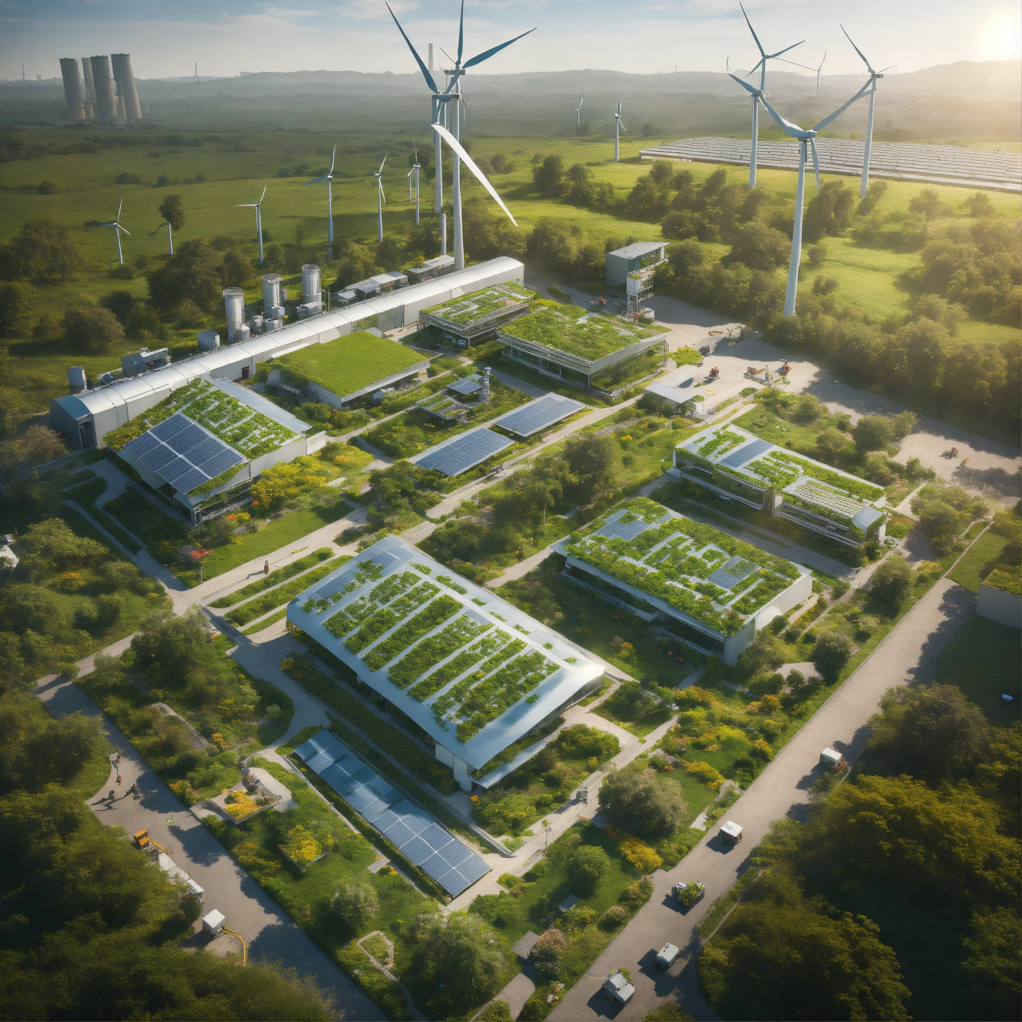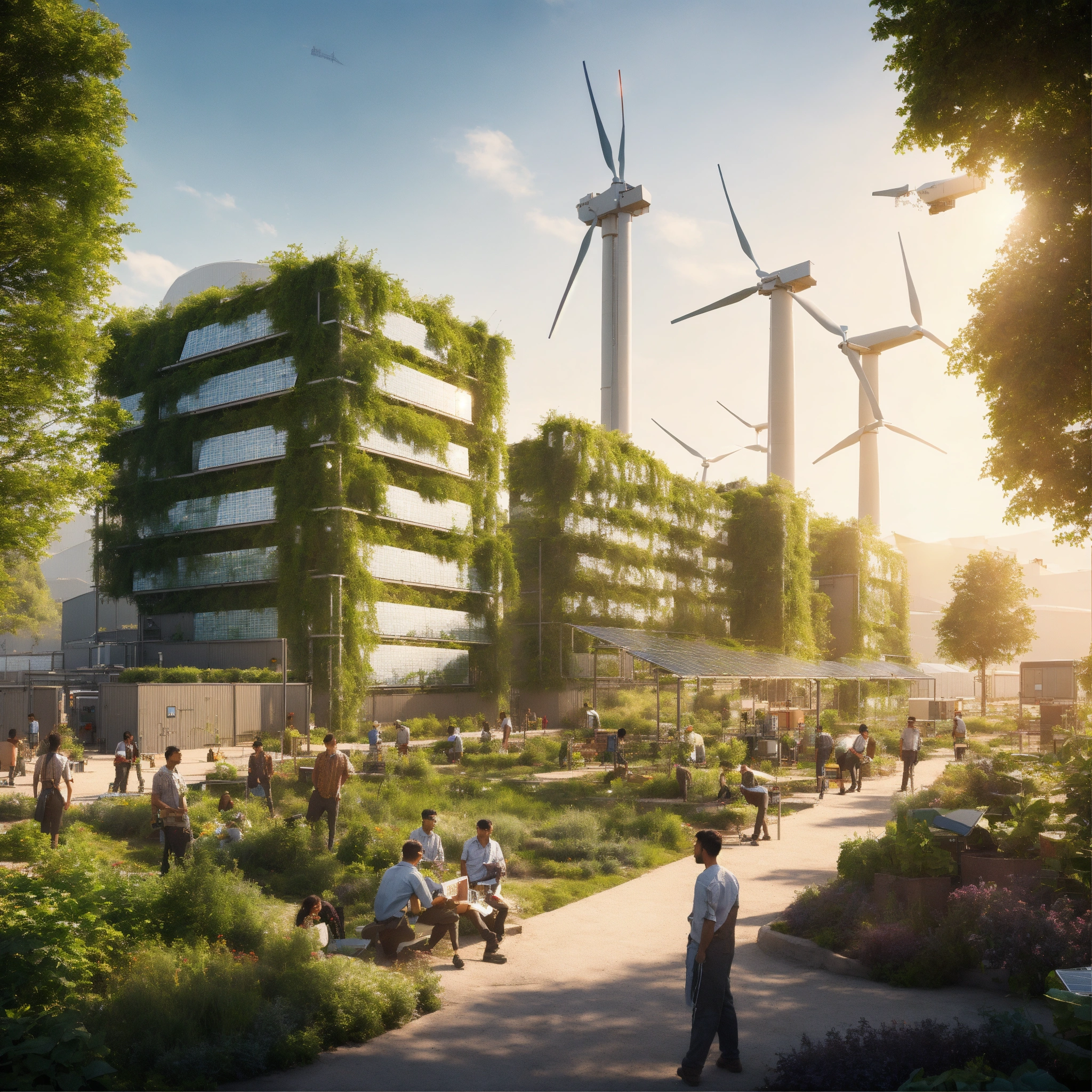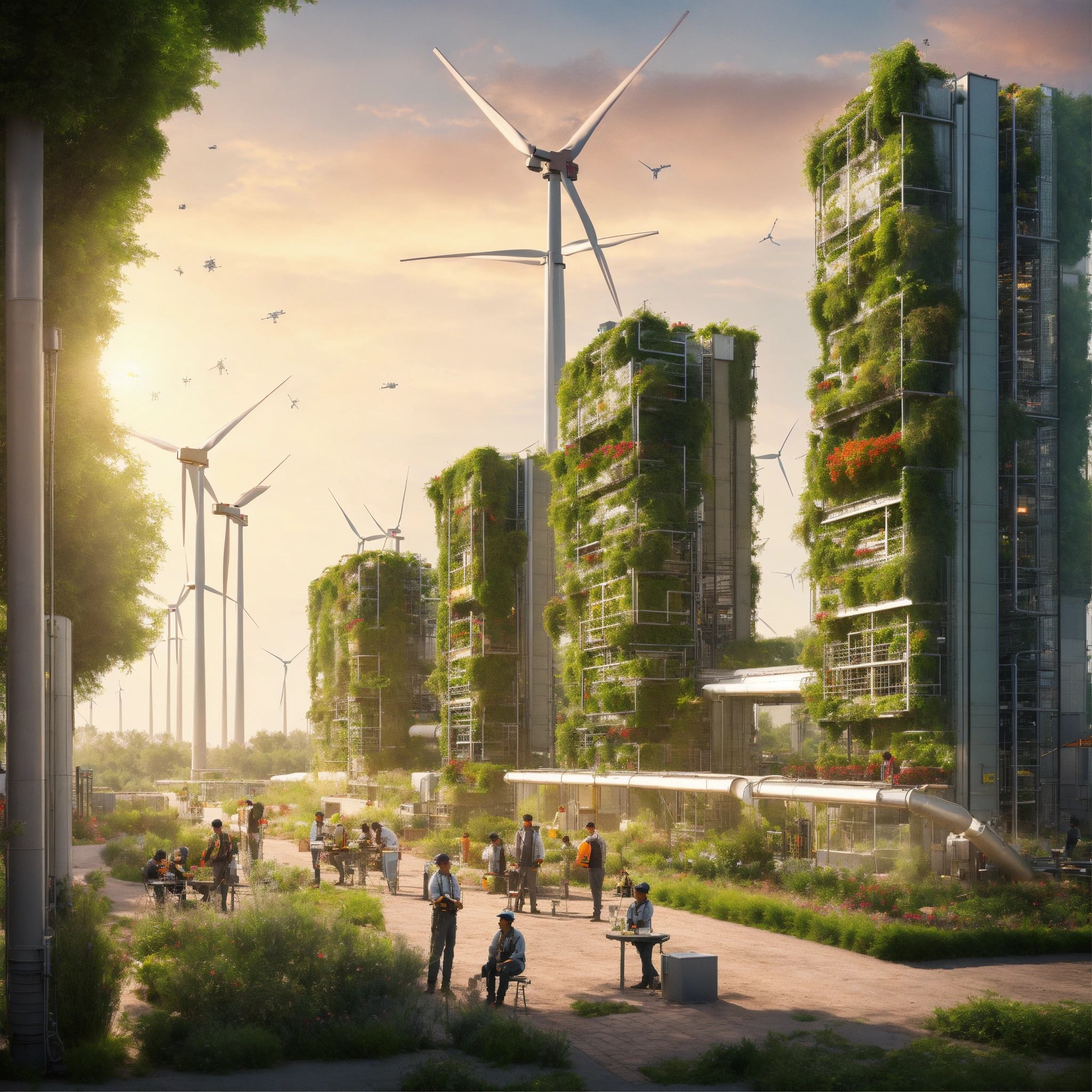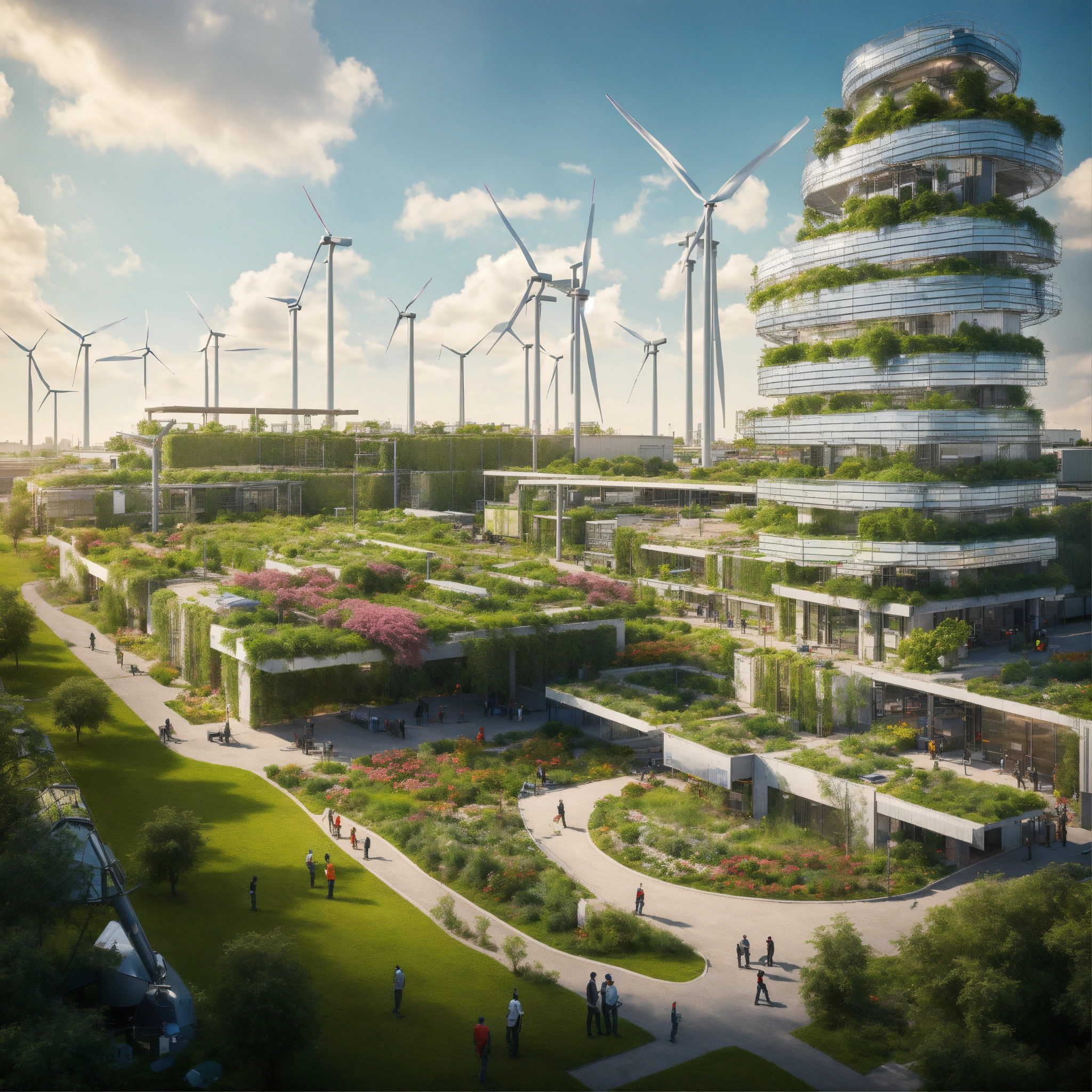 Visualize a sprawling eco-industrial park with futuristic factories, surrounded by green belts. the factories have vertical gardens growing on their exterior walls. in the foreground, workers relax in a park setting, with wind turbines and solar panels in the background, signifying renewable energy sources.