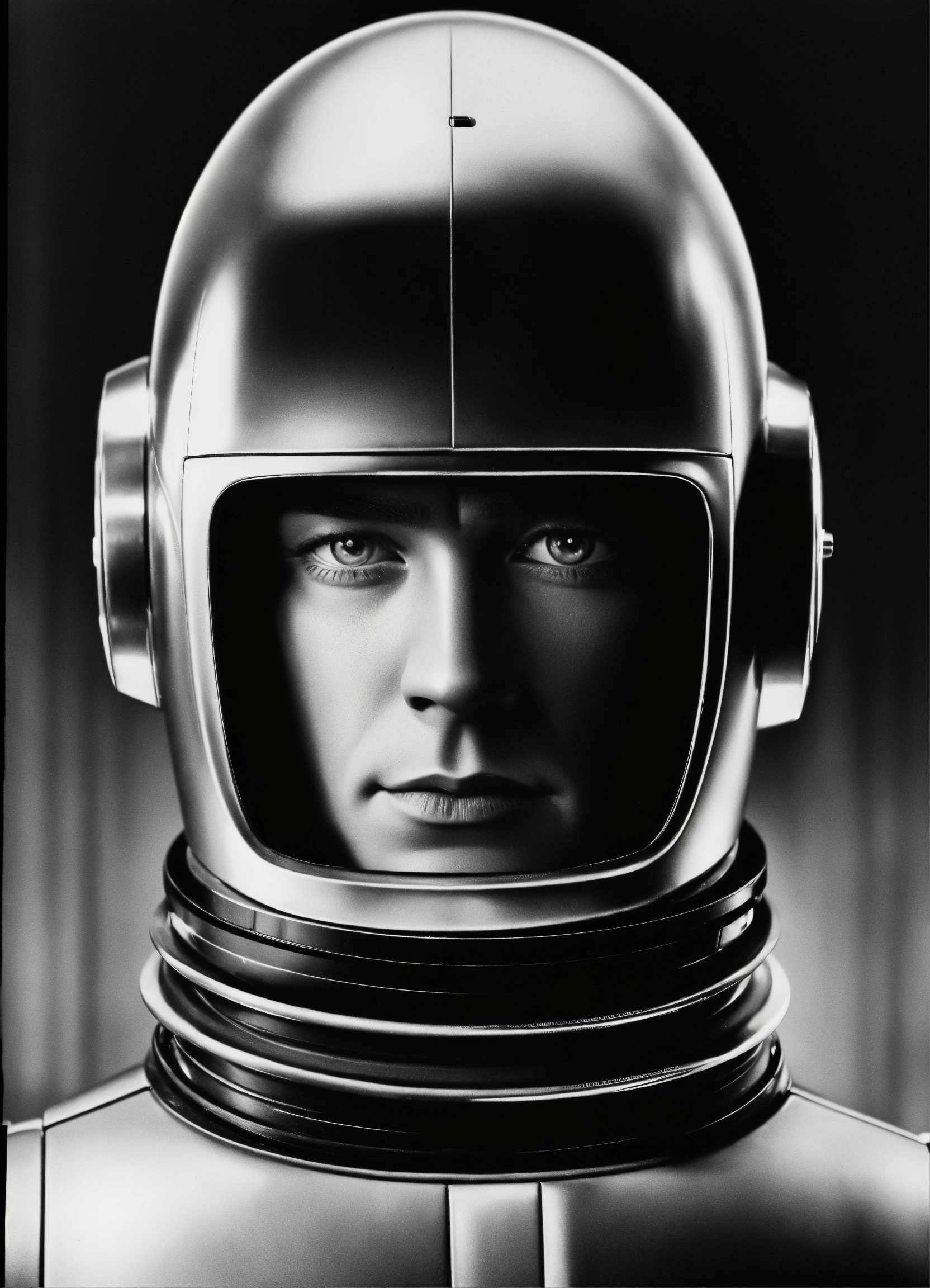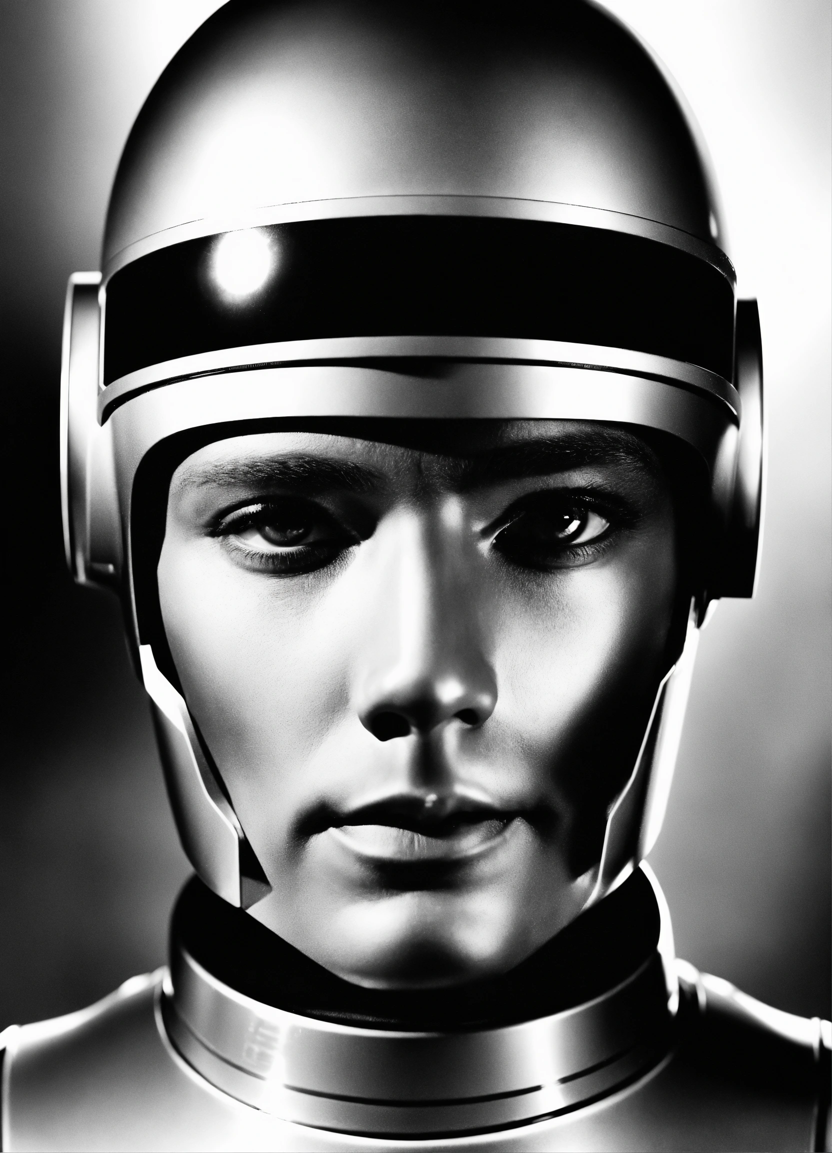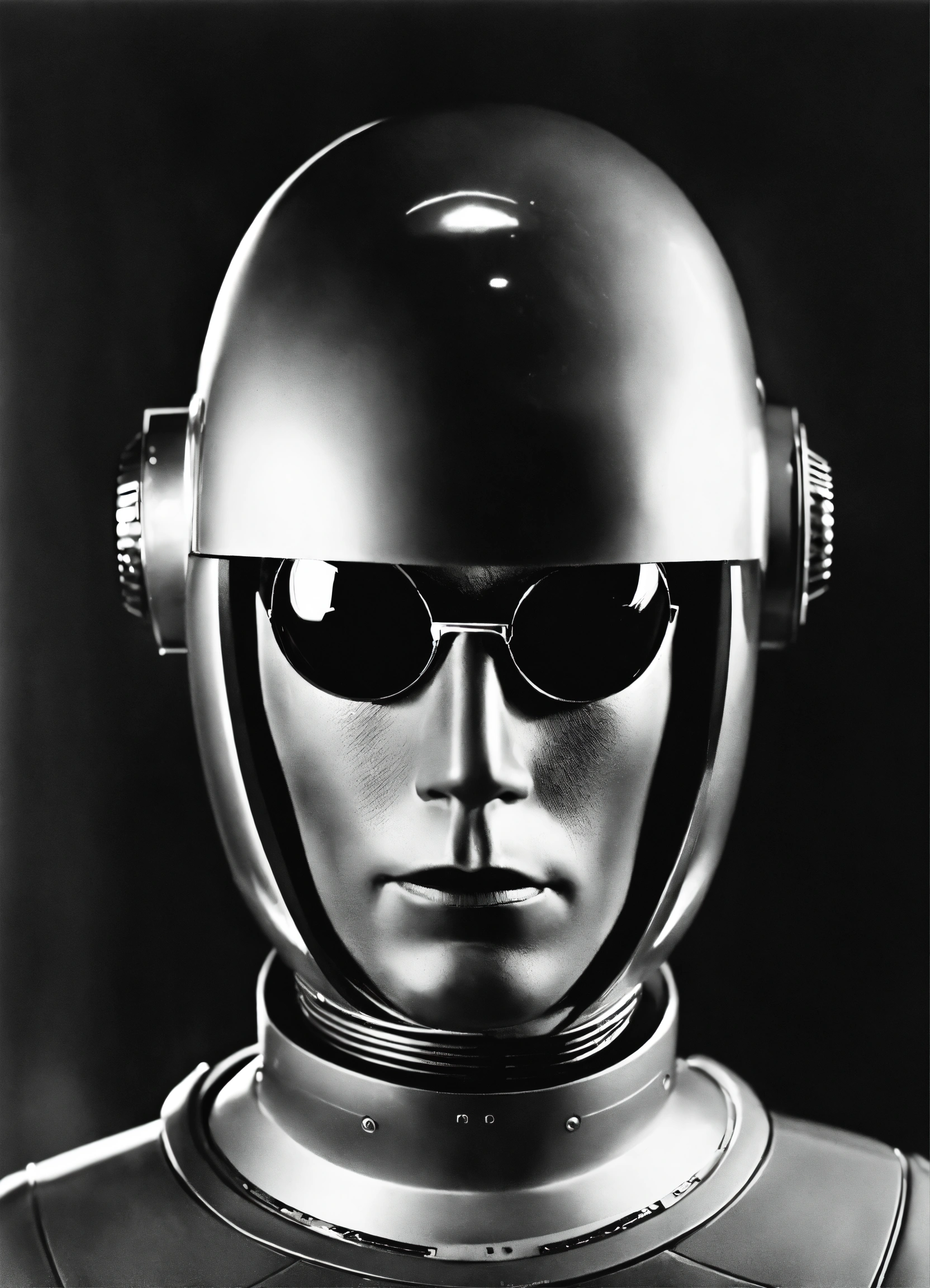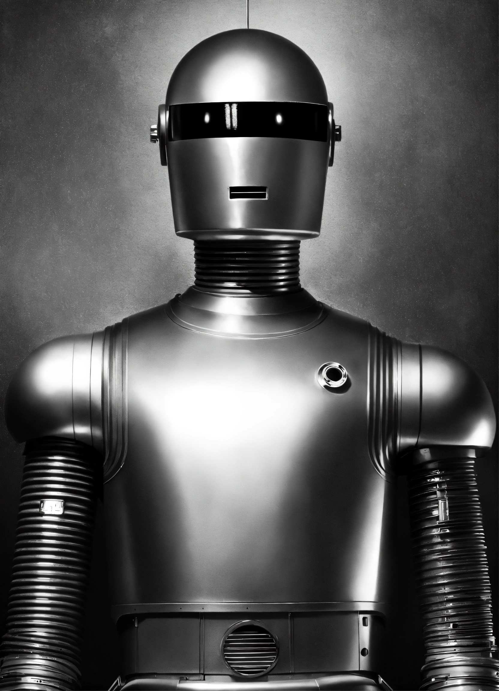 A black and white movie poster portrait of gort, the robot from the movie "the day the earth stood still" with a rectangular visor and the robot's neck smoothly transitions to the body.