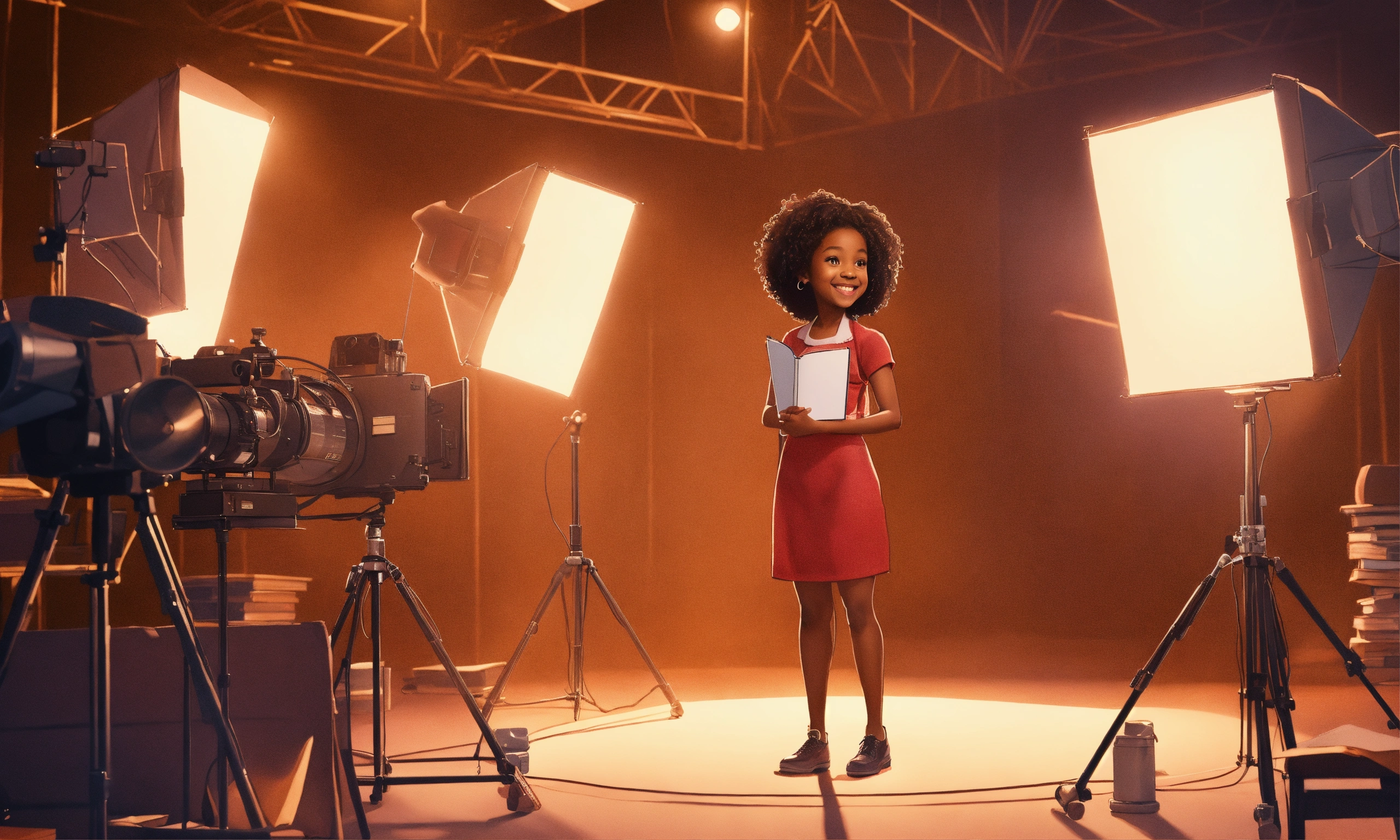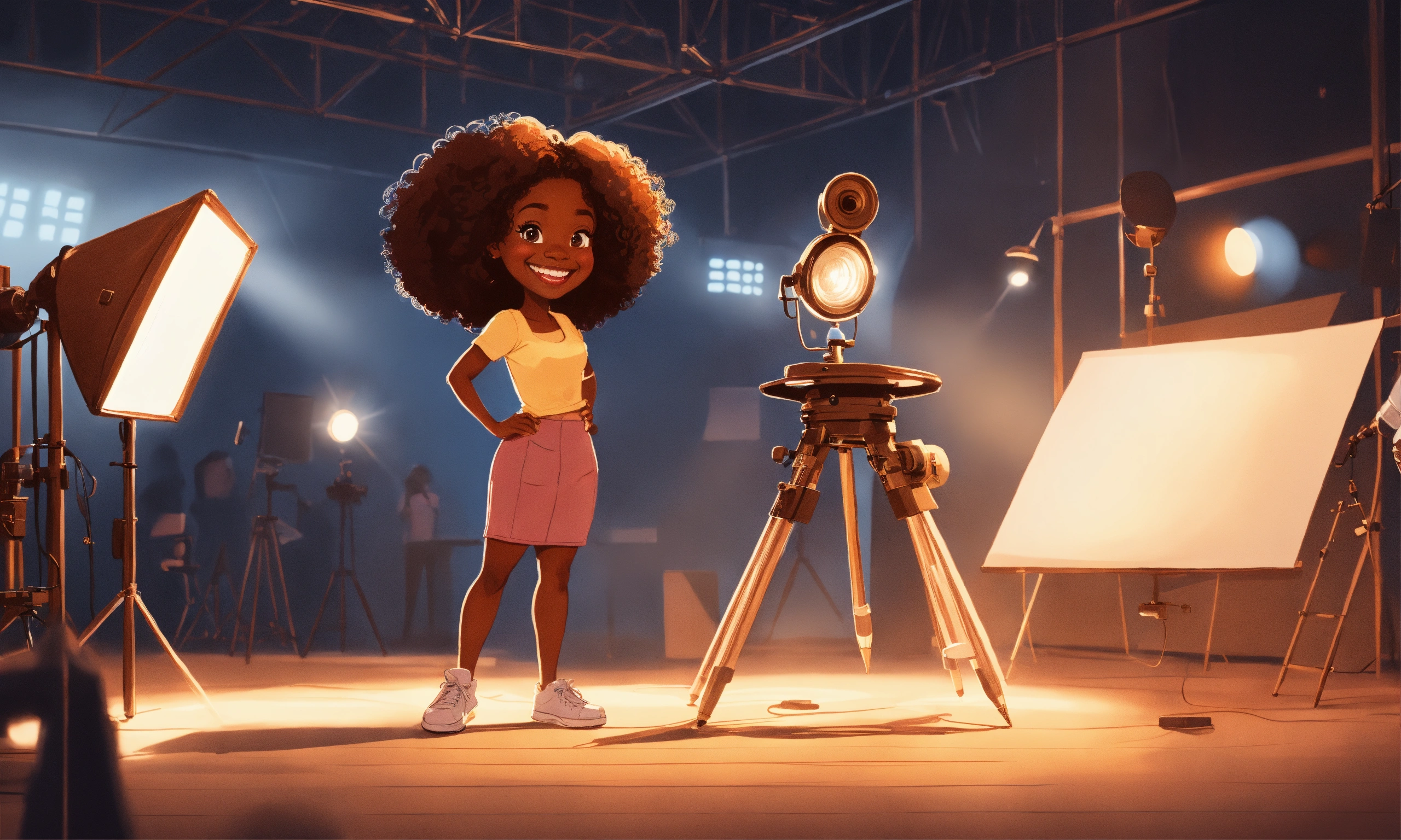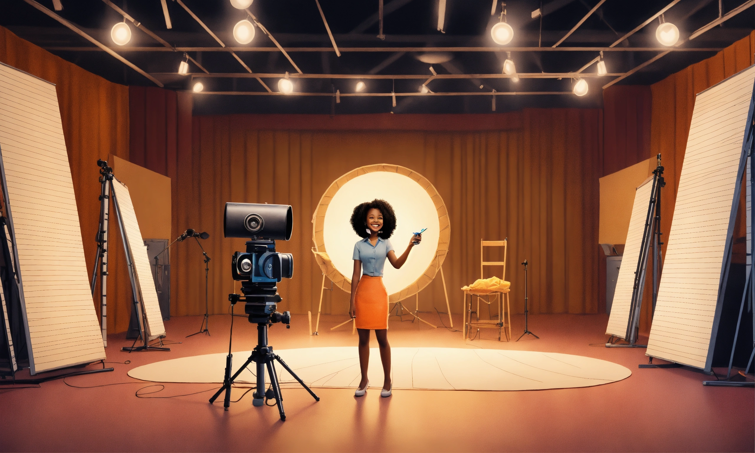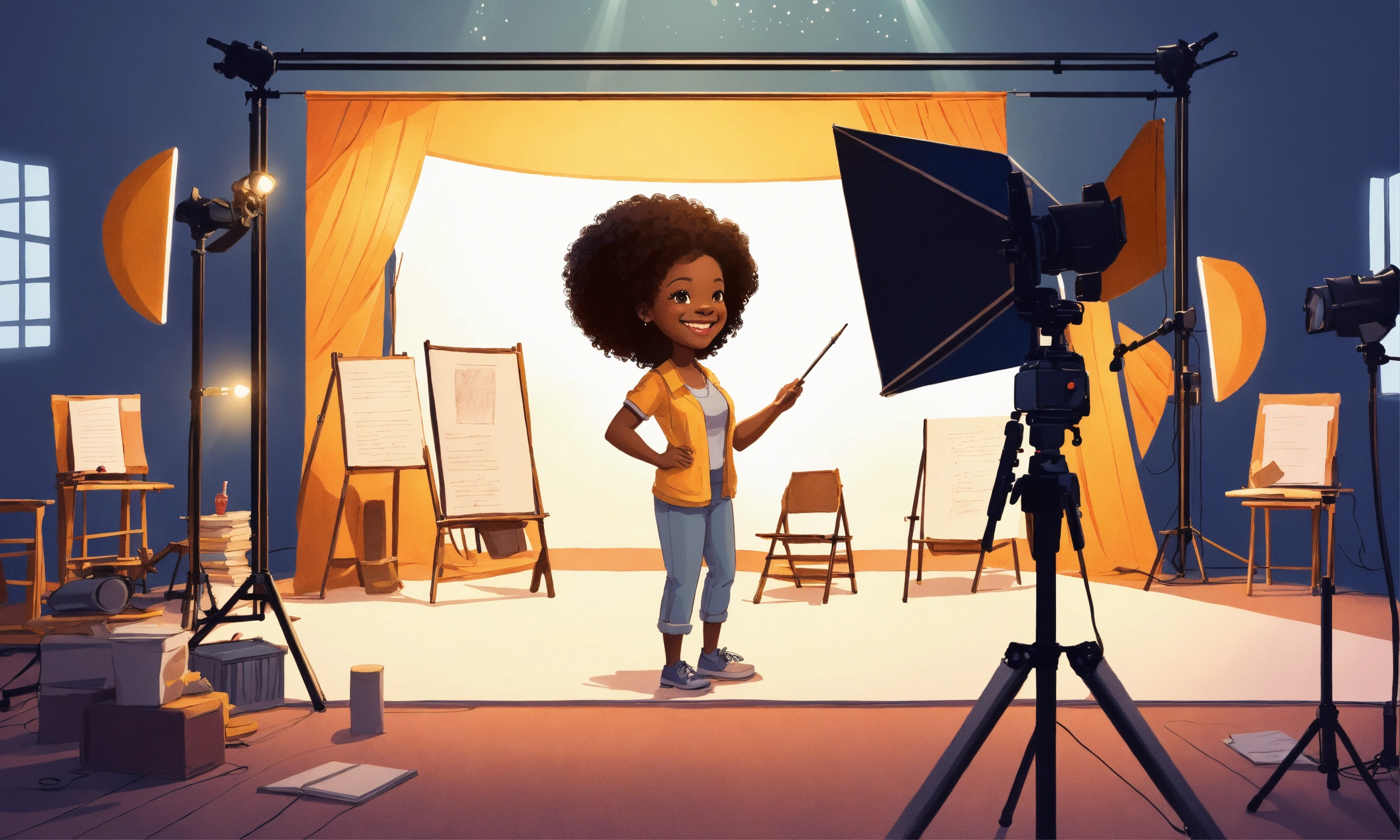 Smiling black woman, standing on a film set or massive soundstage with pencil and script, studio lights, director's chair, camers, award winning children's book illustration style, 2d illustration, white background, front view
