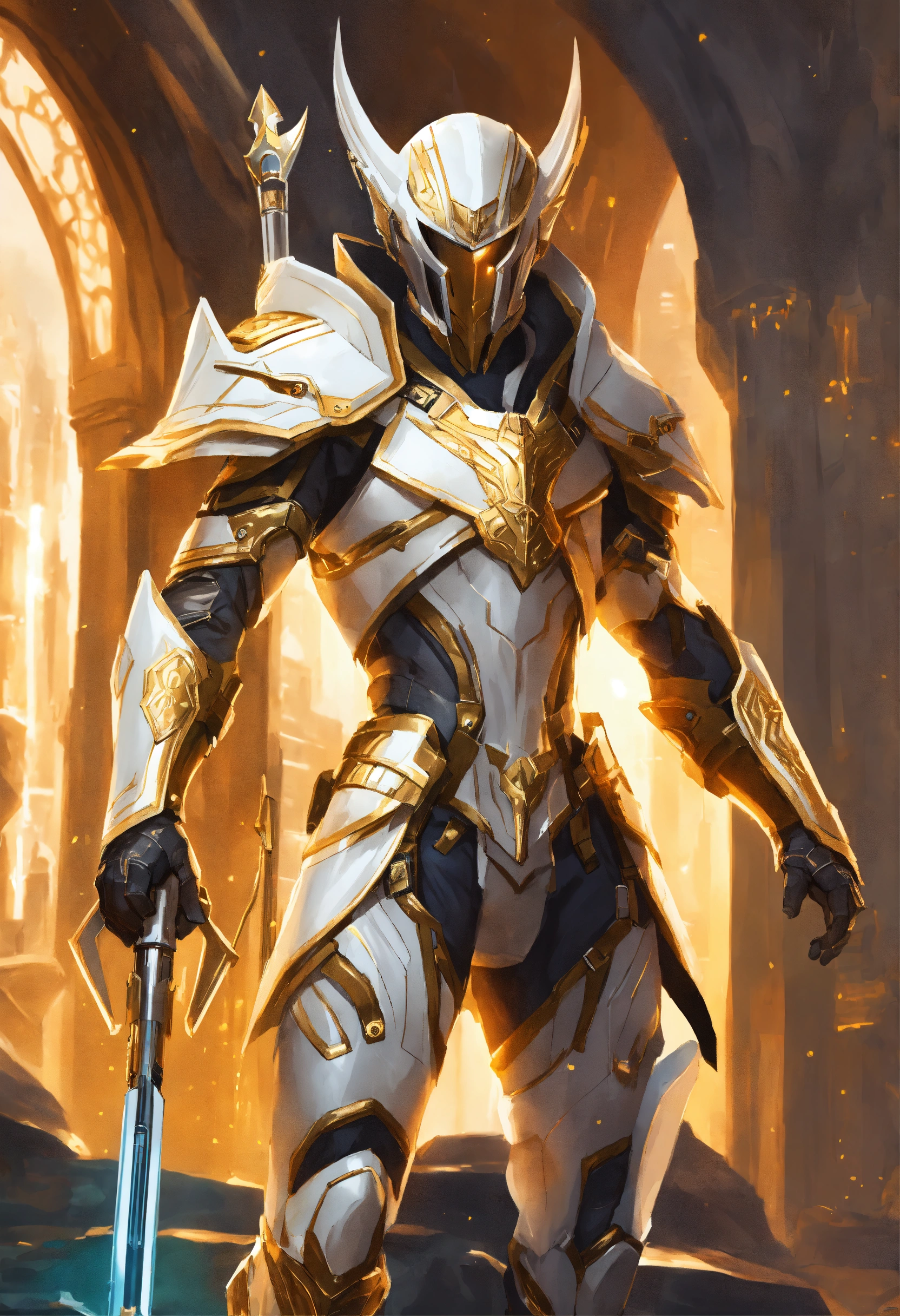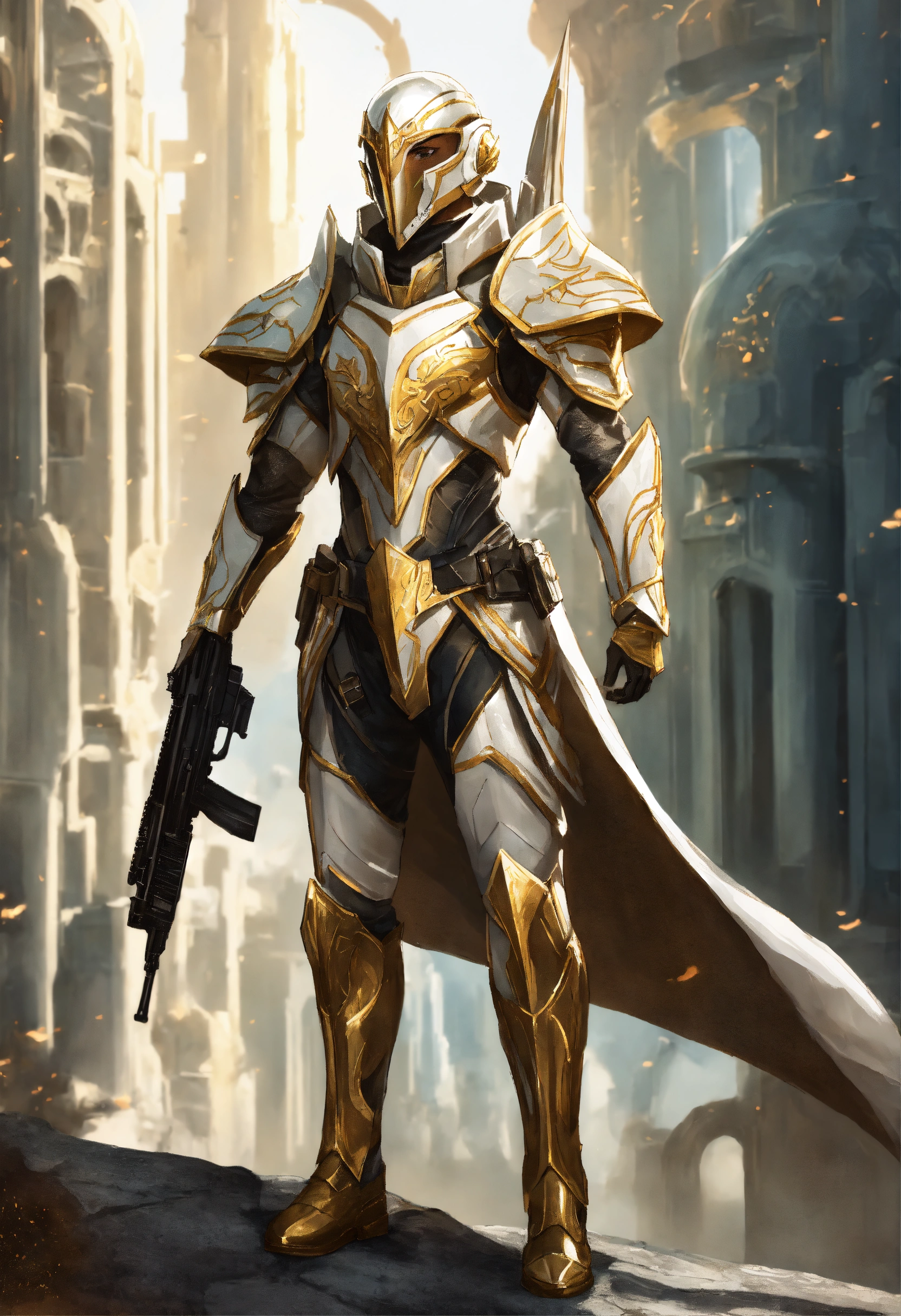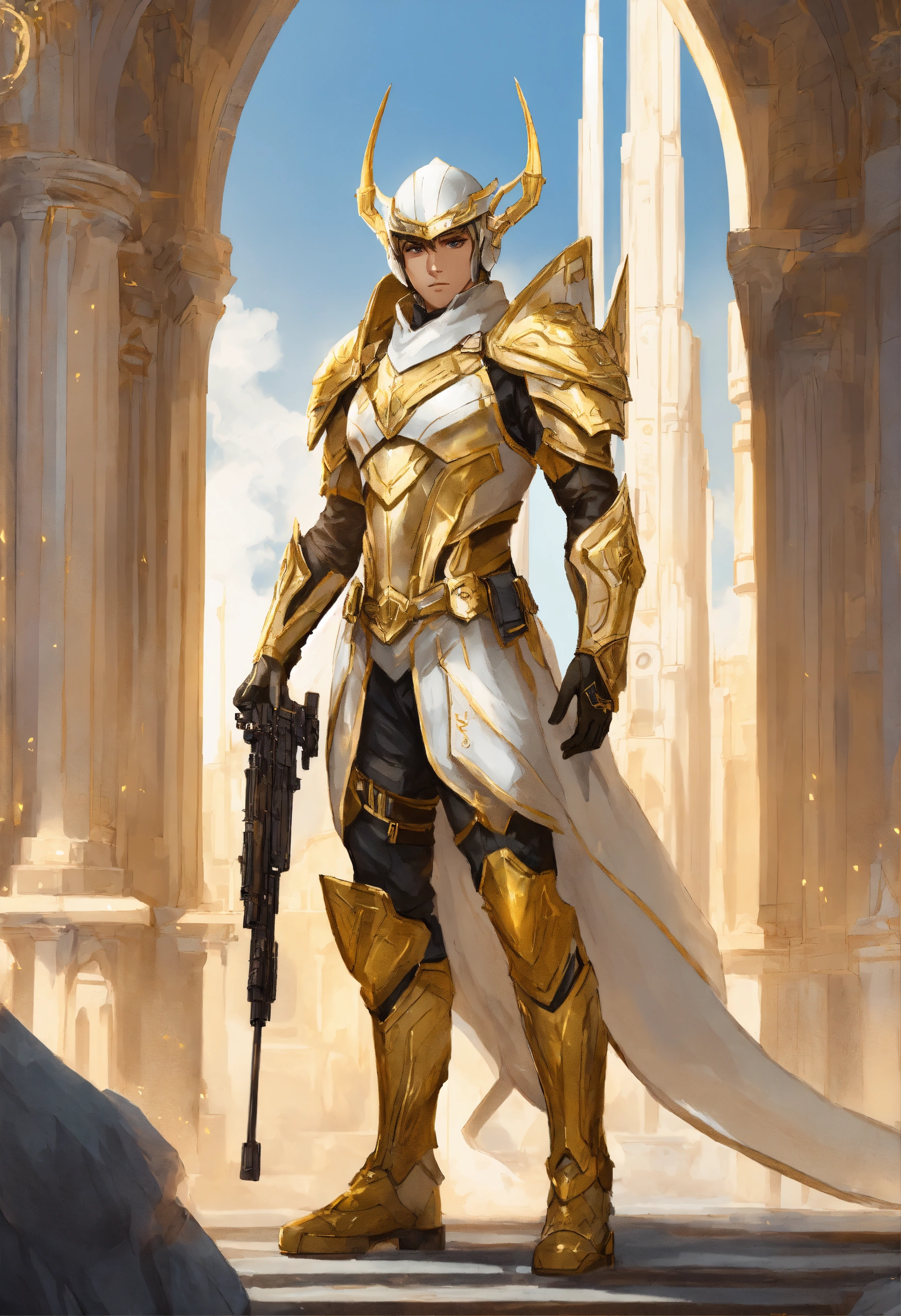 Epic drawing of a full body of a high elf sci fi soldier wearing slender sci fi armor, white and gold sci fi armor and helmet, boots, male, holding a machine gun, standing in a white marble elven city