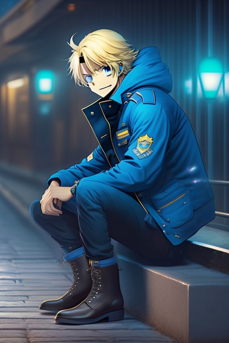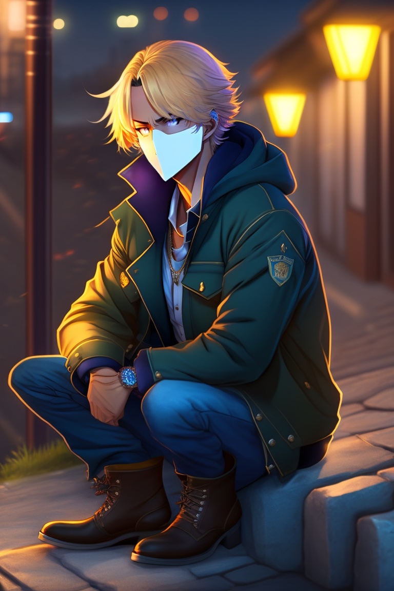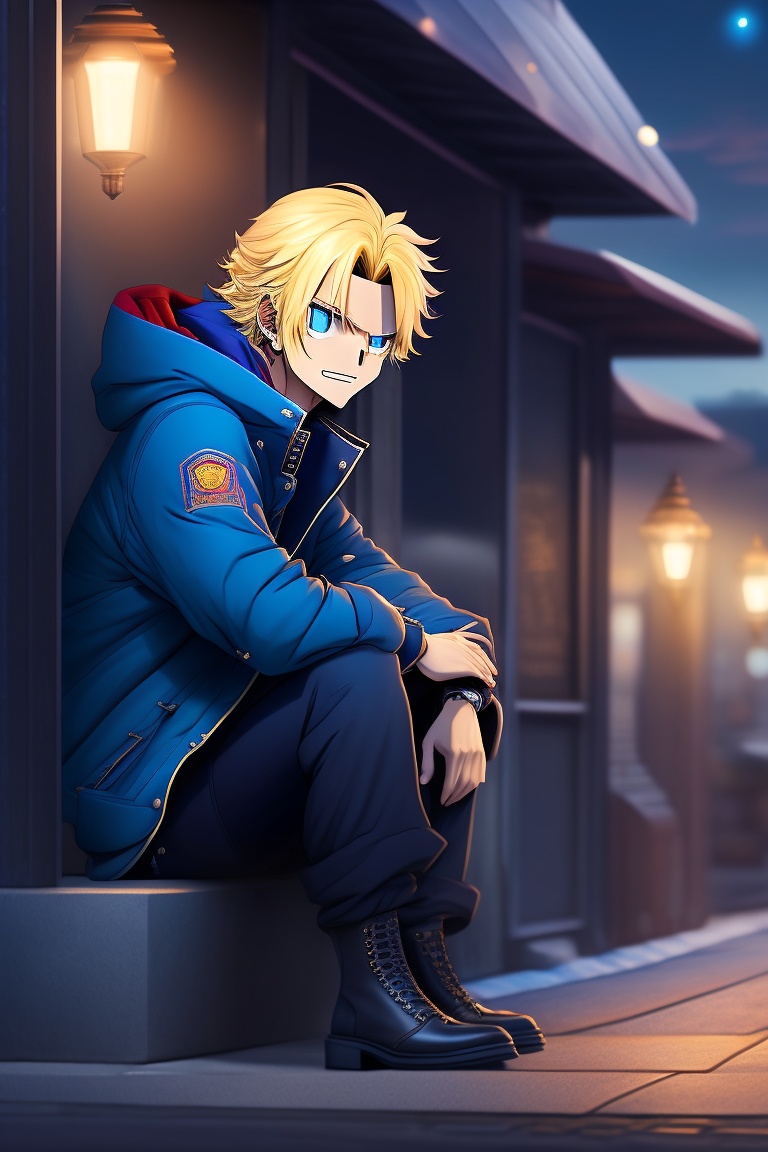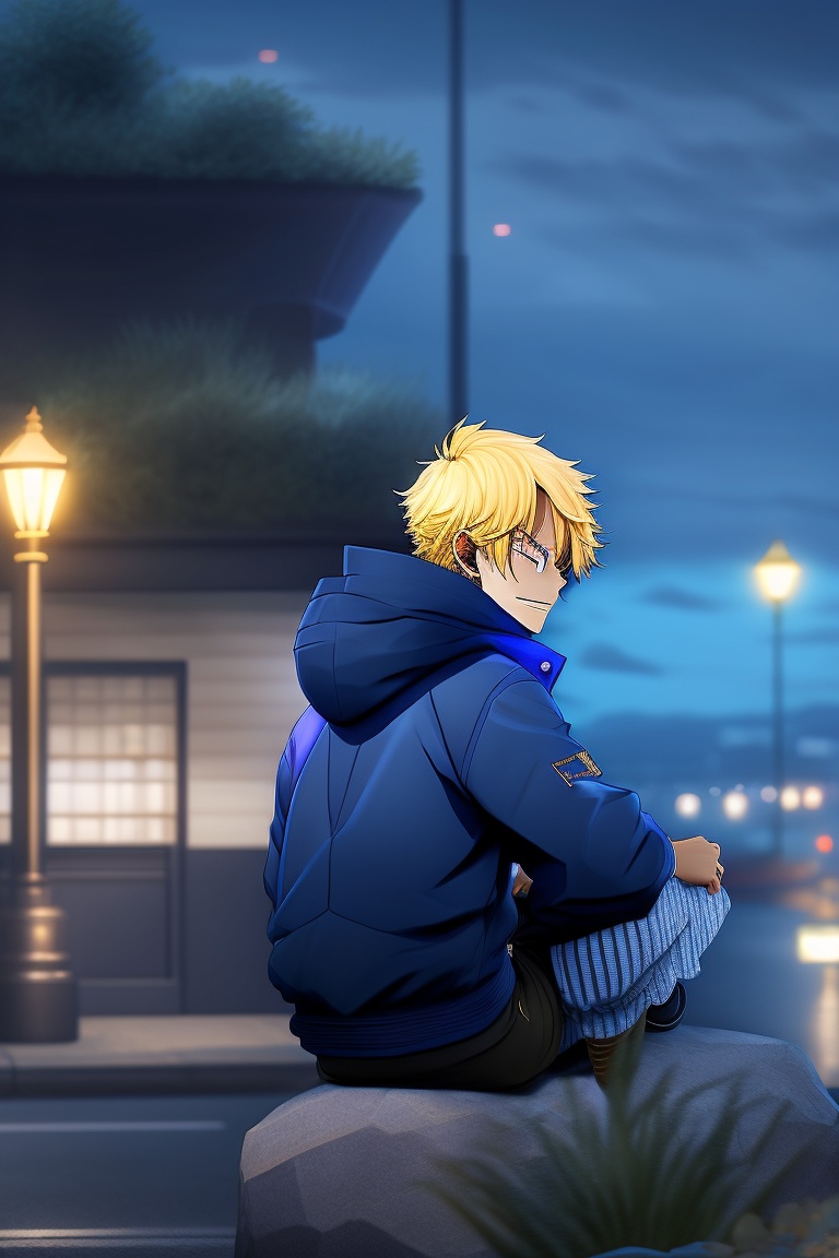 One piece sanji anime character, being homeless, on the edge of the city, sitting position, night conditions