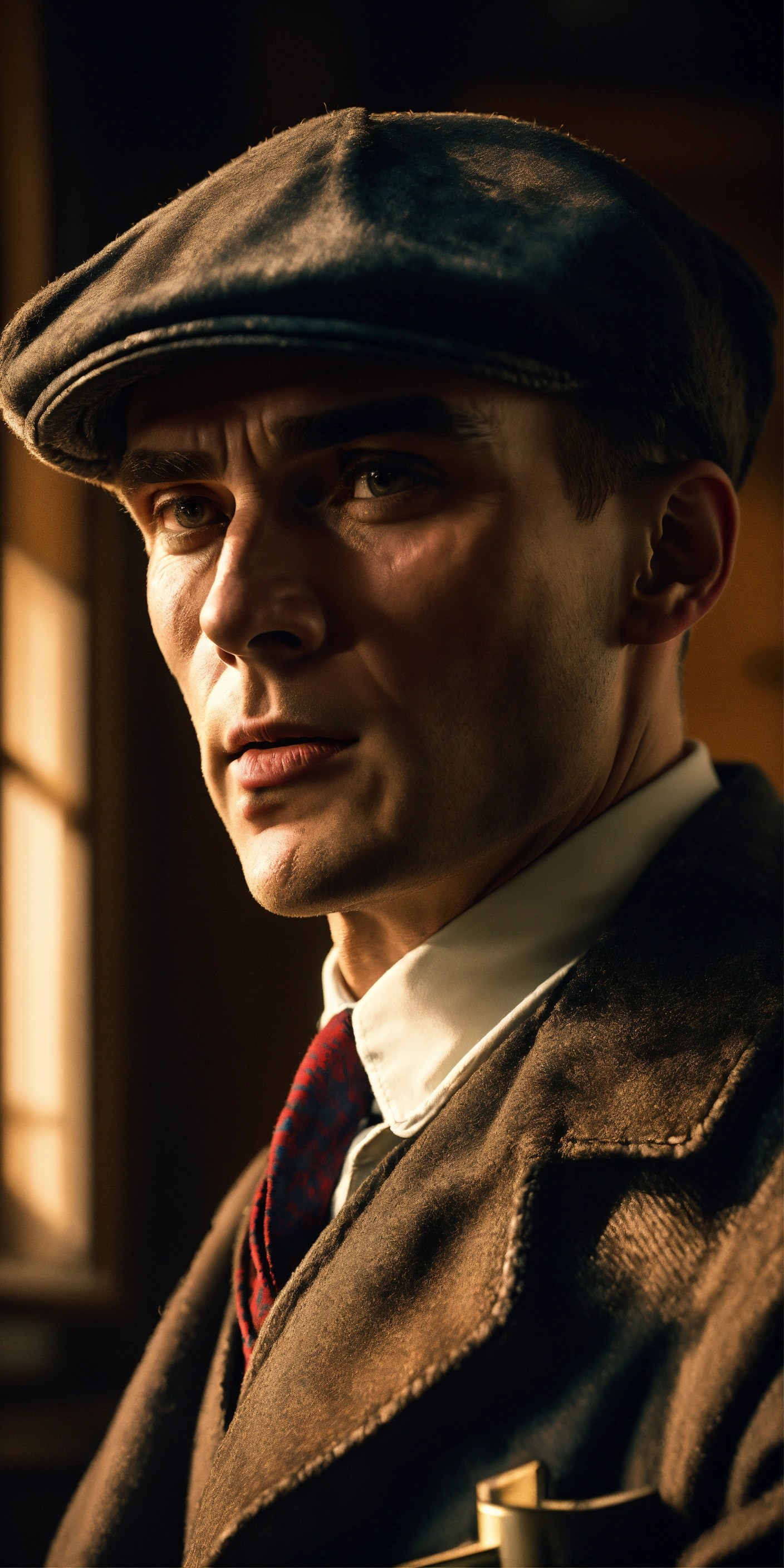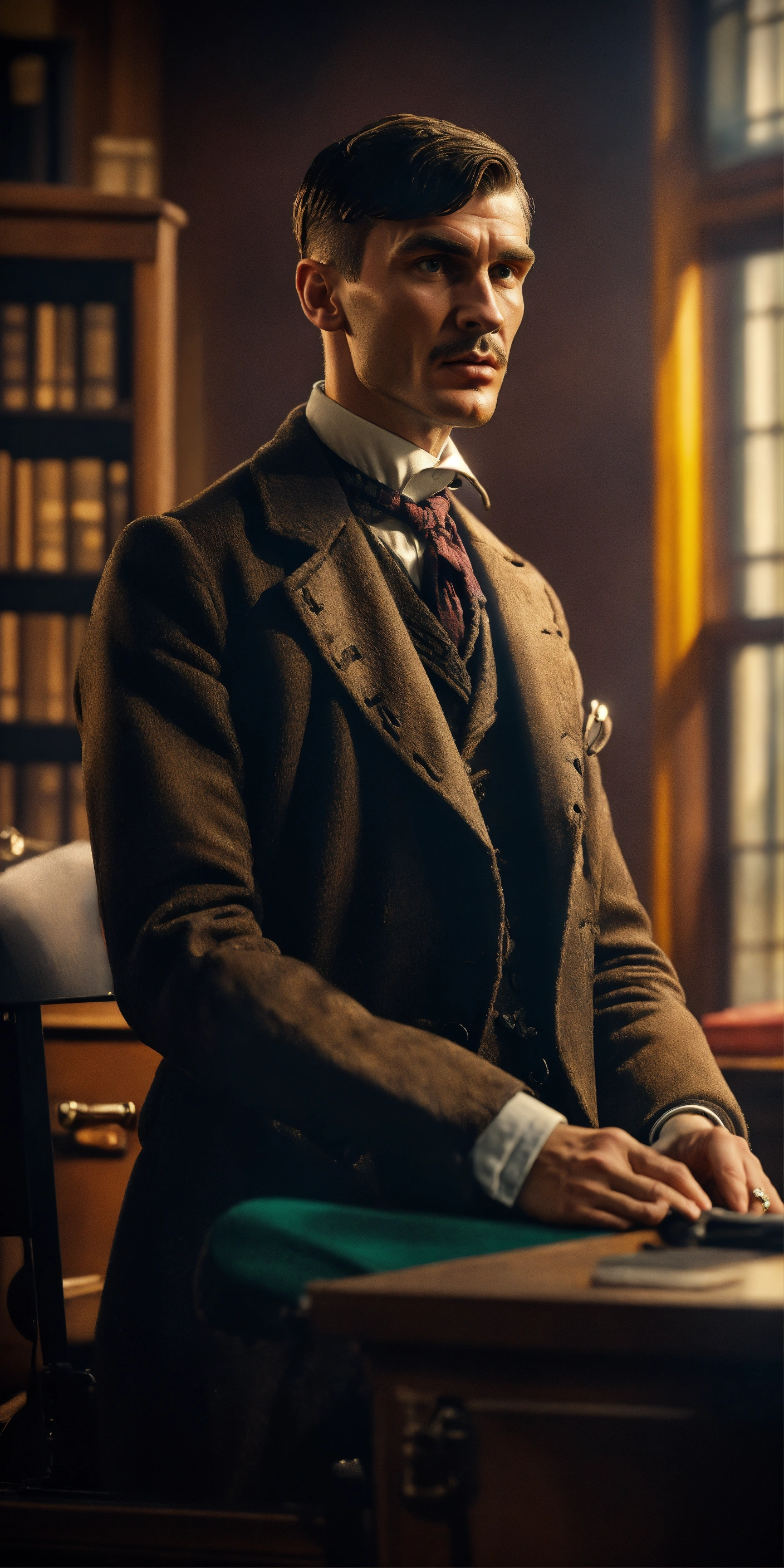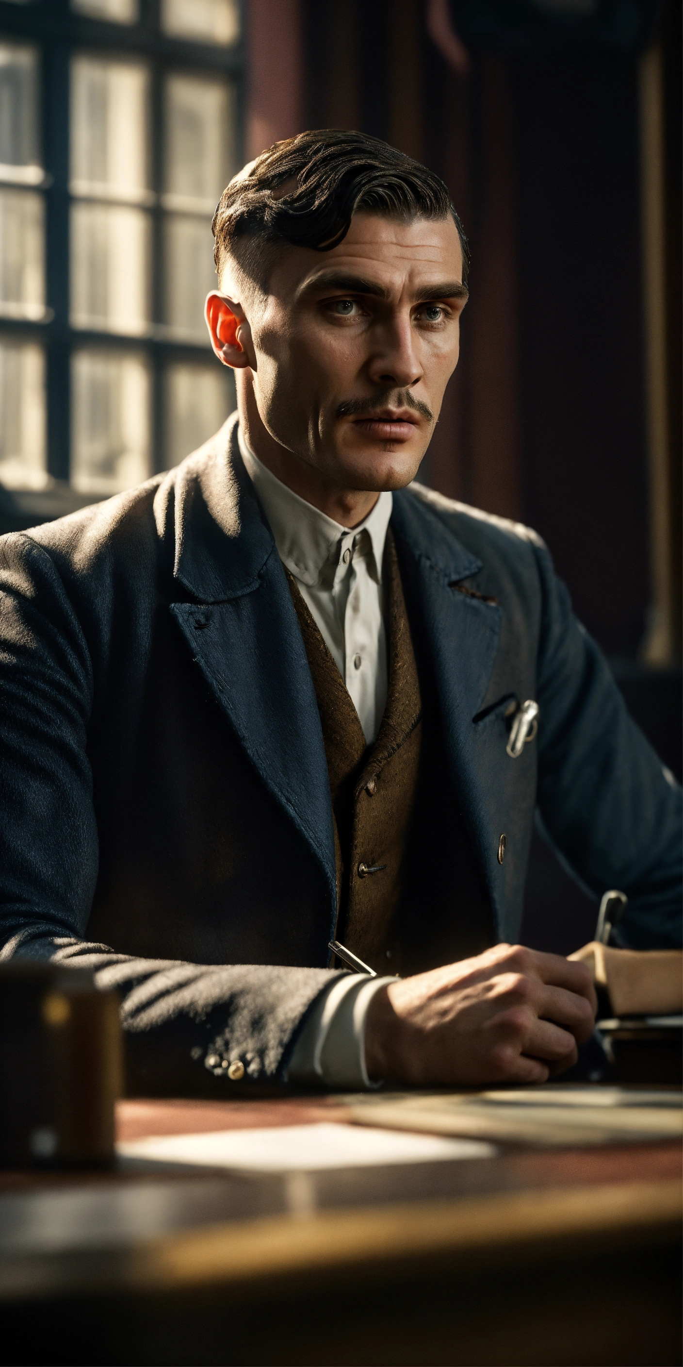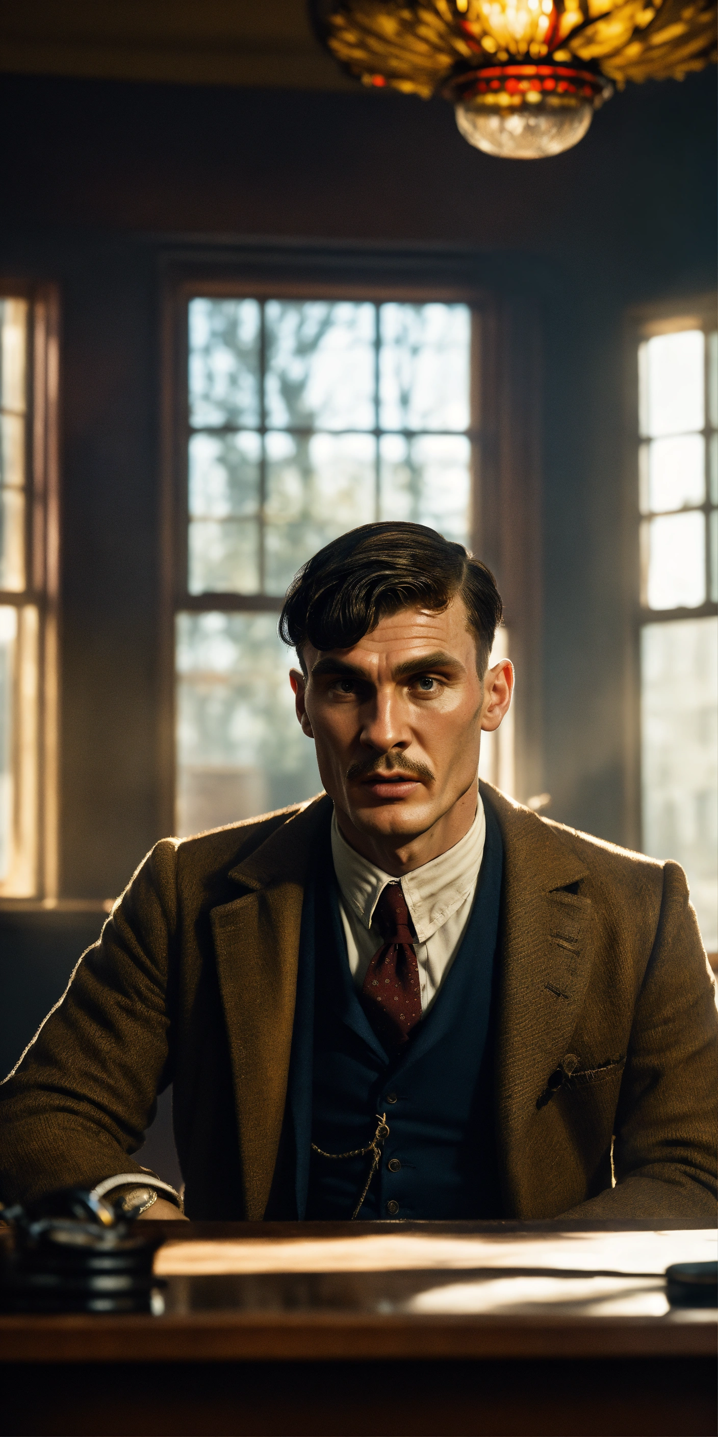 Character in the style of thomas shelby, front view, brightly colored image background, placing the character sitting behind a desk, looking towards the camera, with a large window behind, sharp focus, dramatic spotlighting, very detailed, 8k, autofocus creates an incredibly realistic image, slight blur in the background, studio quality