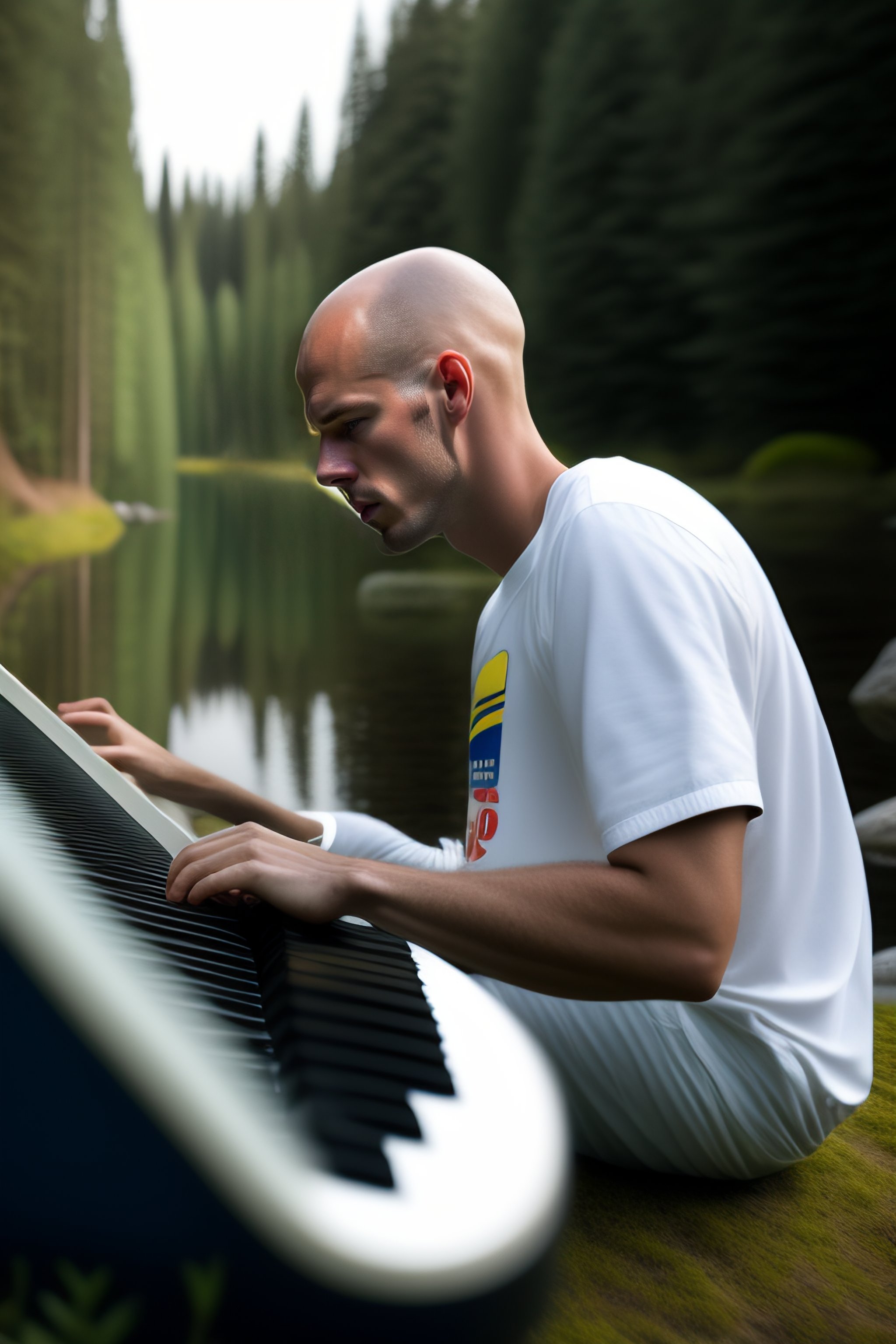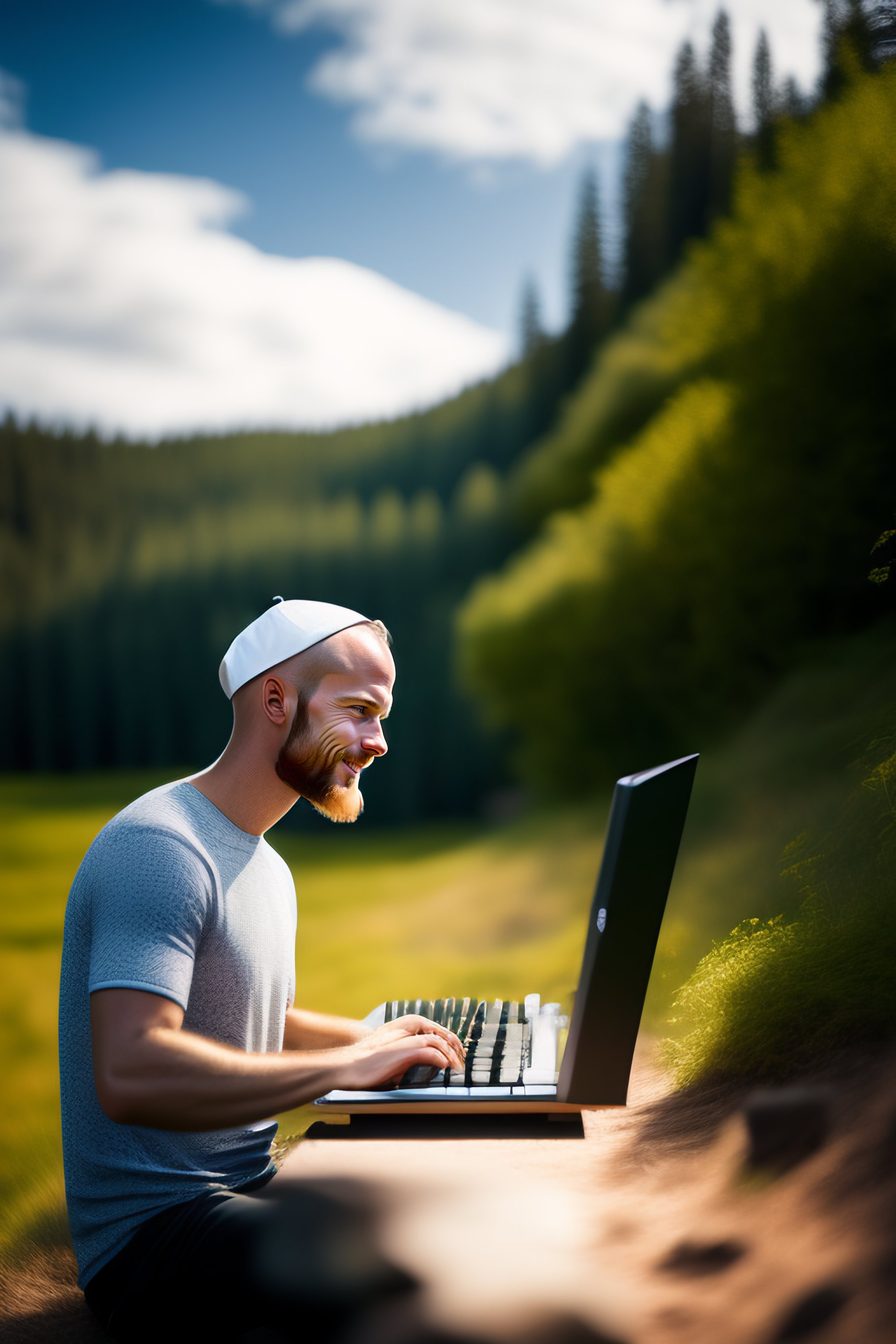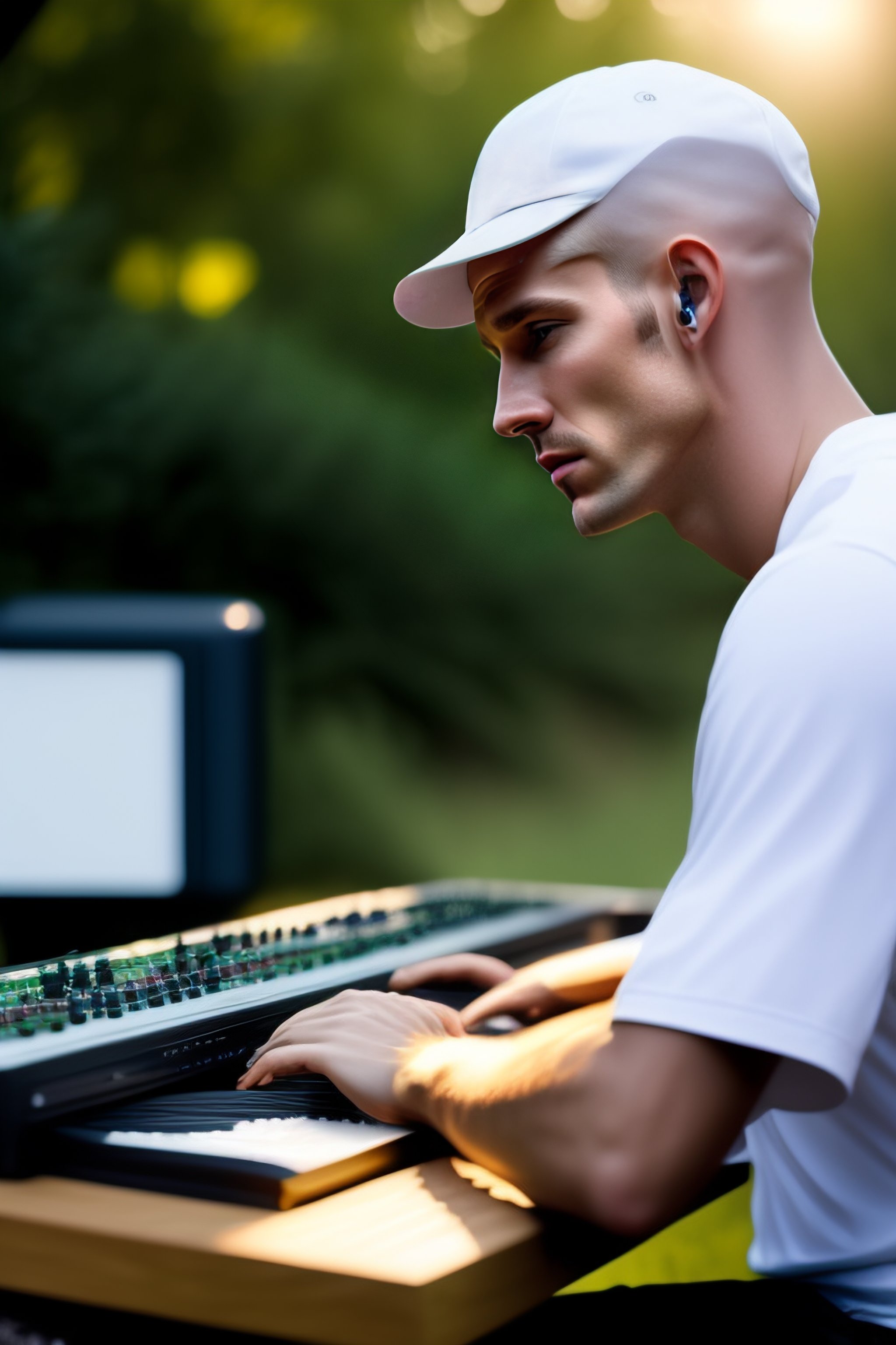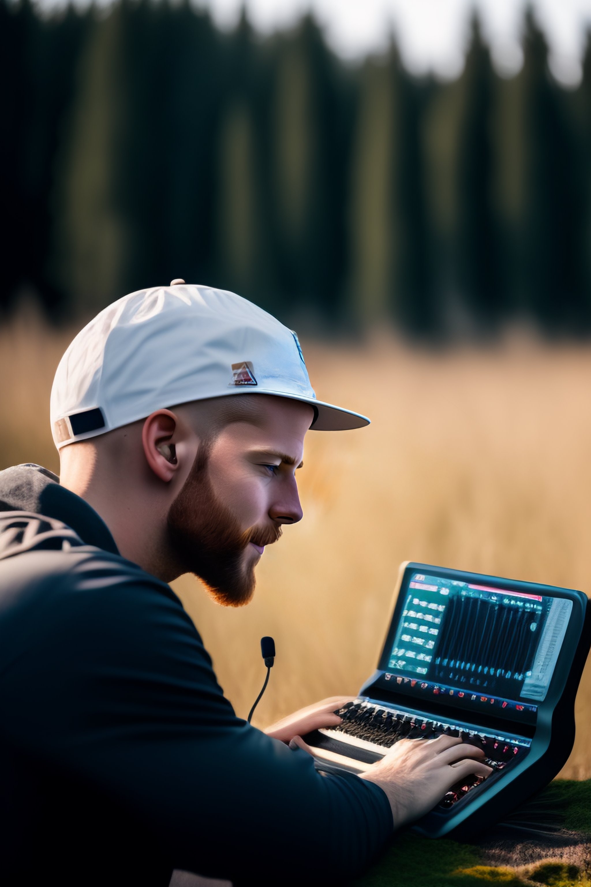 Swedish short guy with no hair and a white cap making music in the nature using a keyboard and a computer with his back fronting the camera