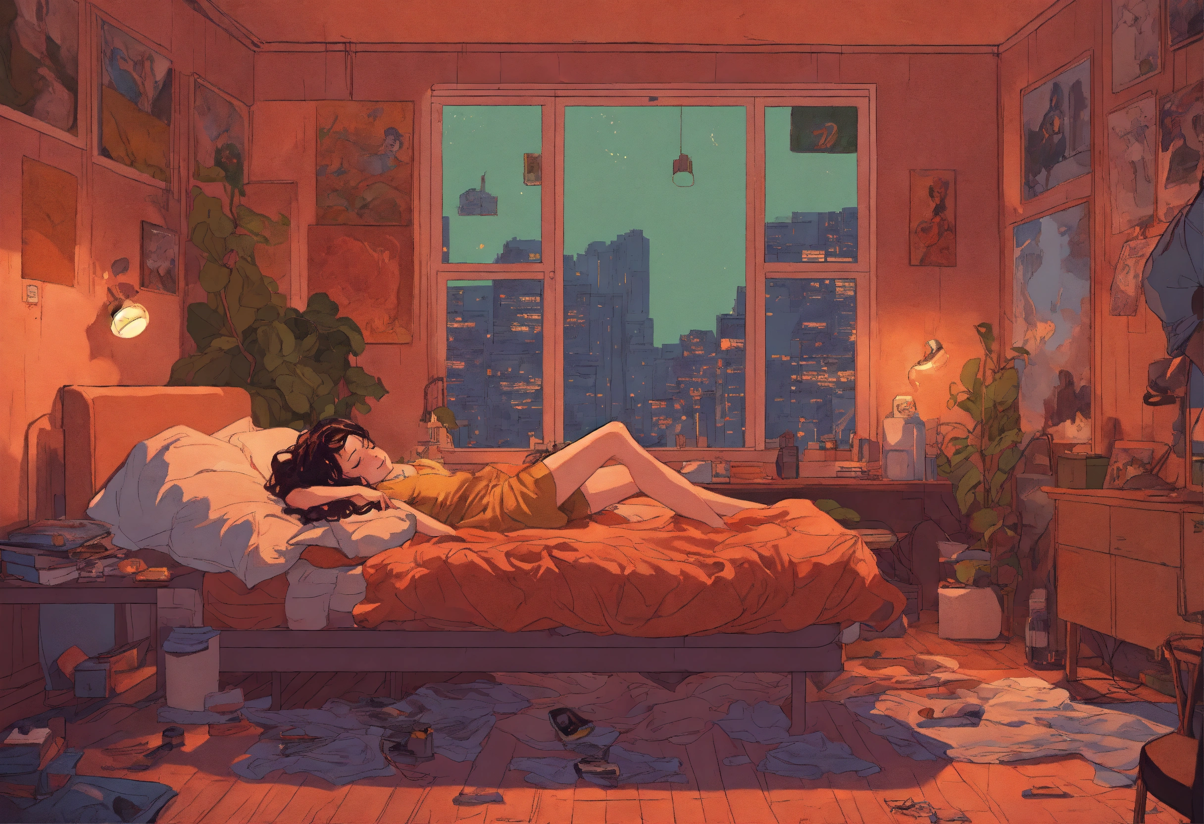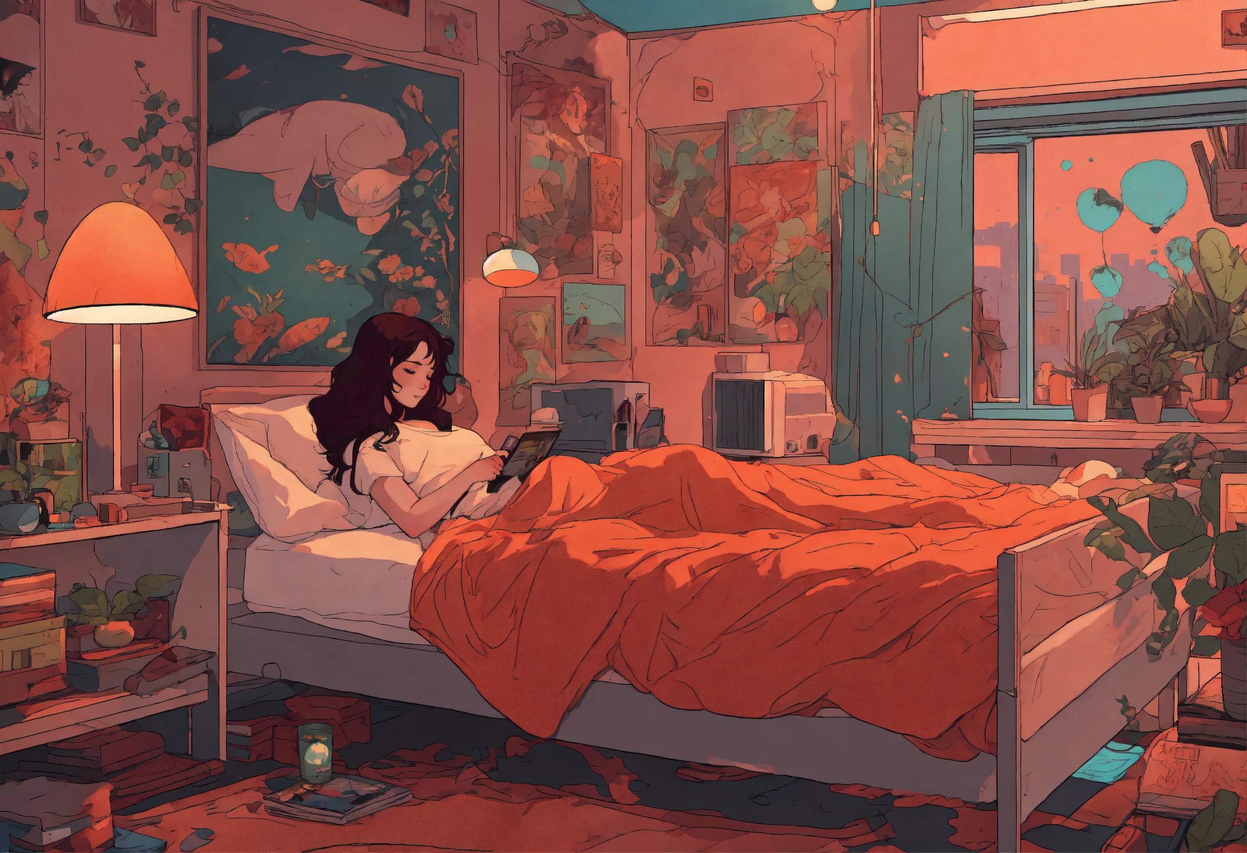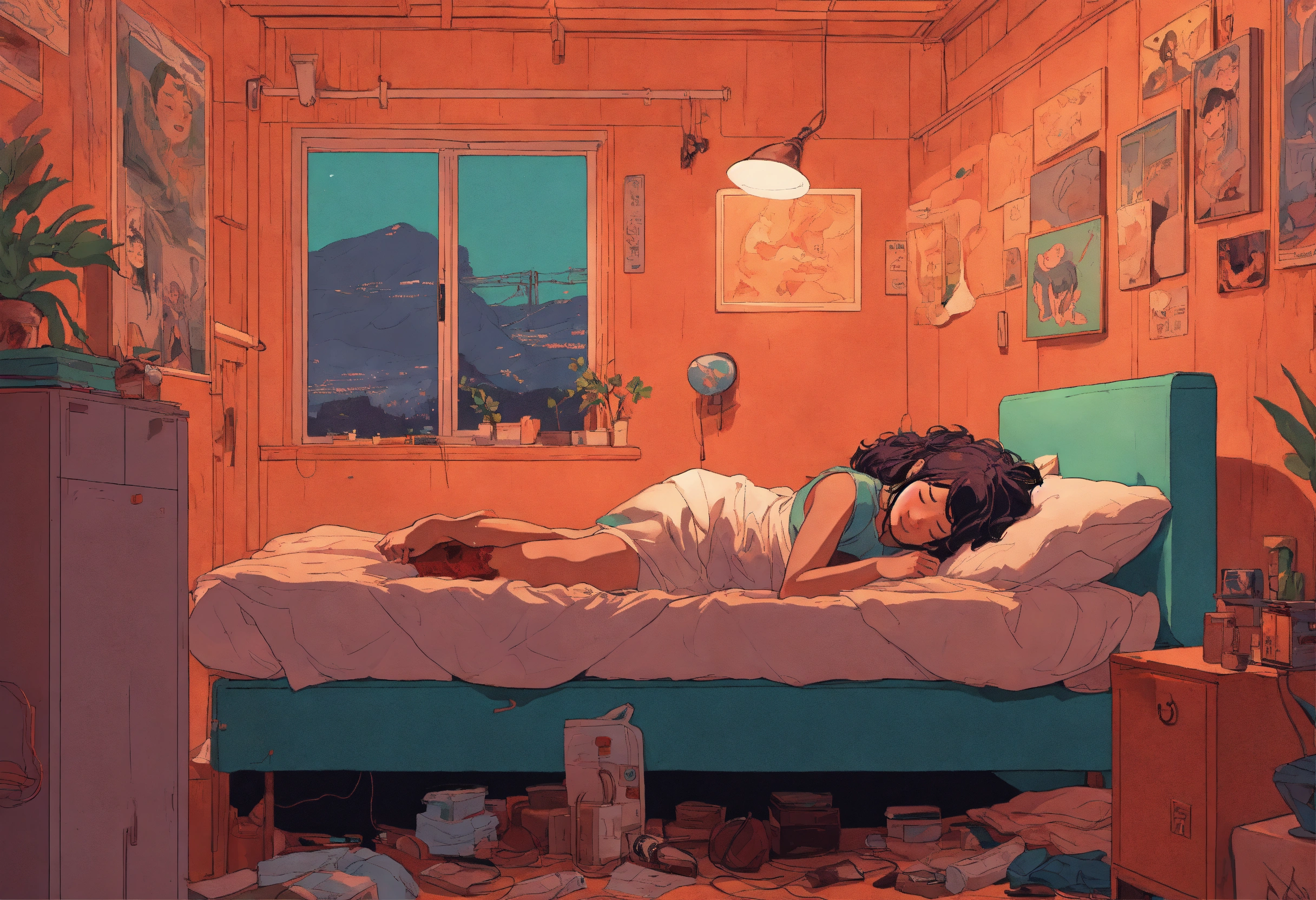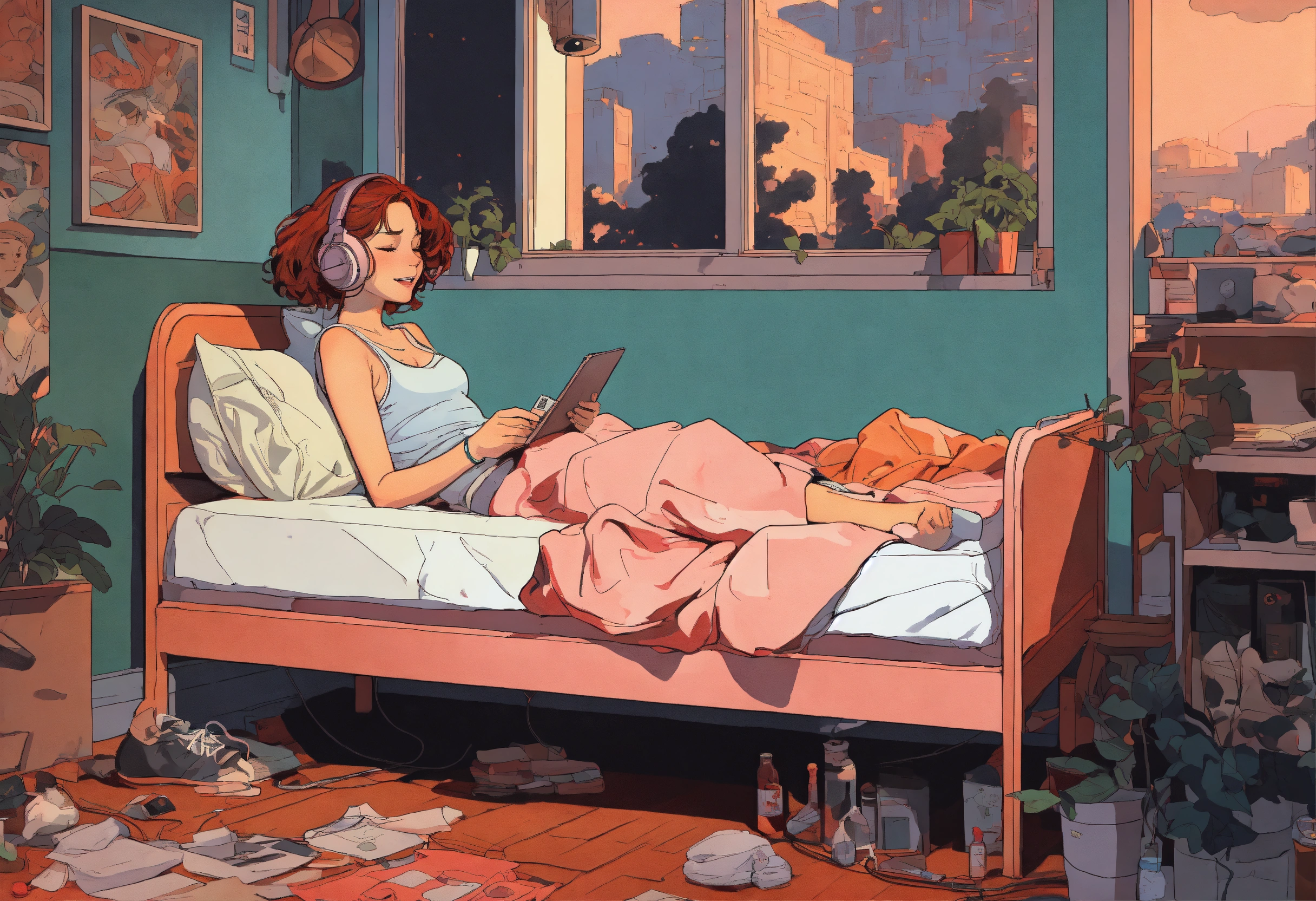 A blend of comic book art and lineart in full natural colors. lofi music, beautiful girl listening to music and sleeping bed wallpaper, in the style of tomer hanuka, jordan roukes, emotionally charged portraits, smilecore, rustic futurism, henrietta harris, darkly comedic, rough painting, children's illustration
