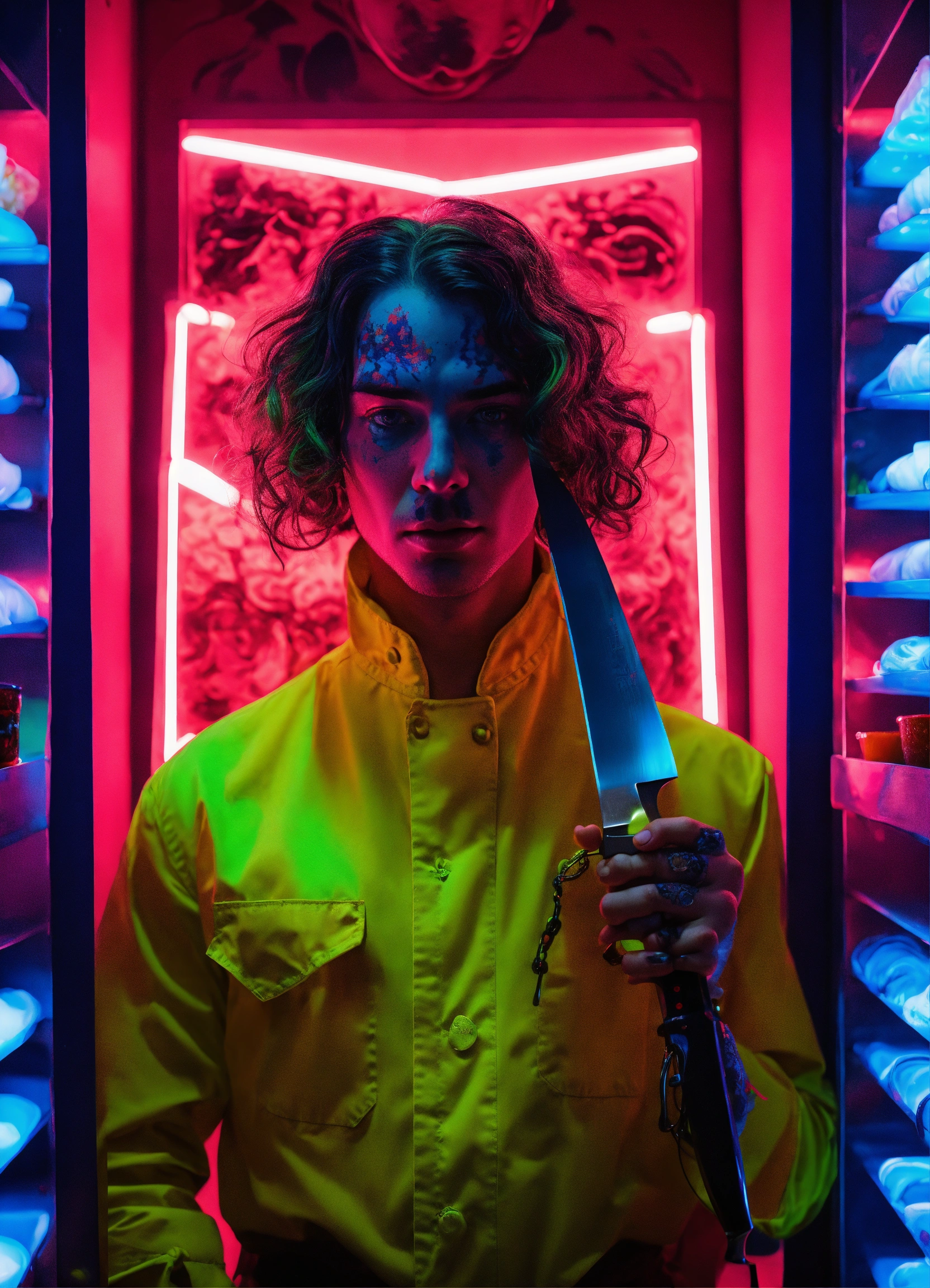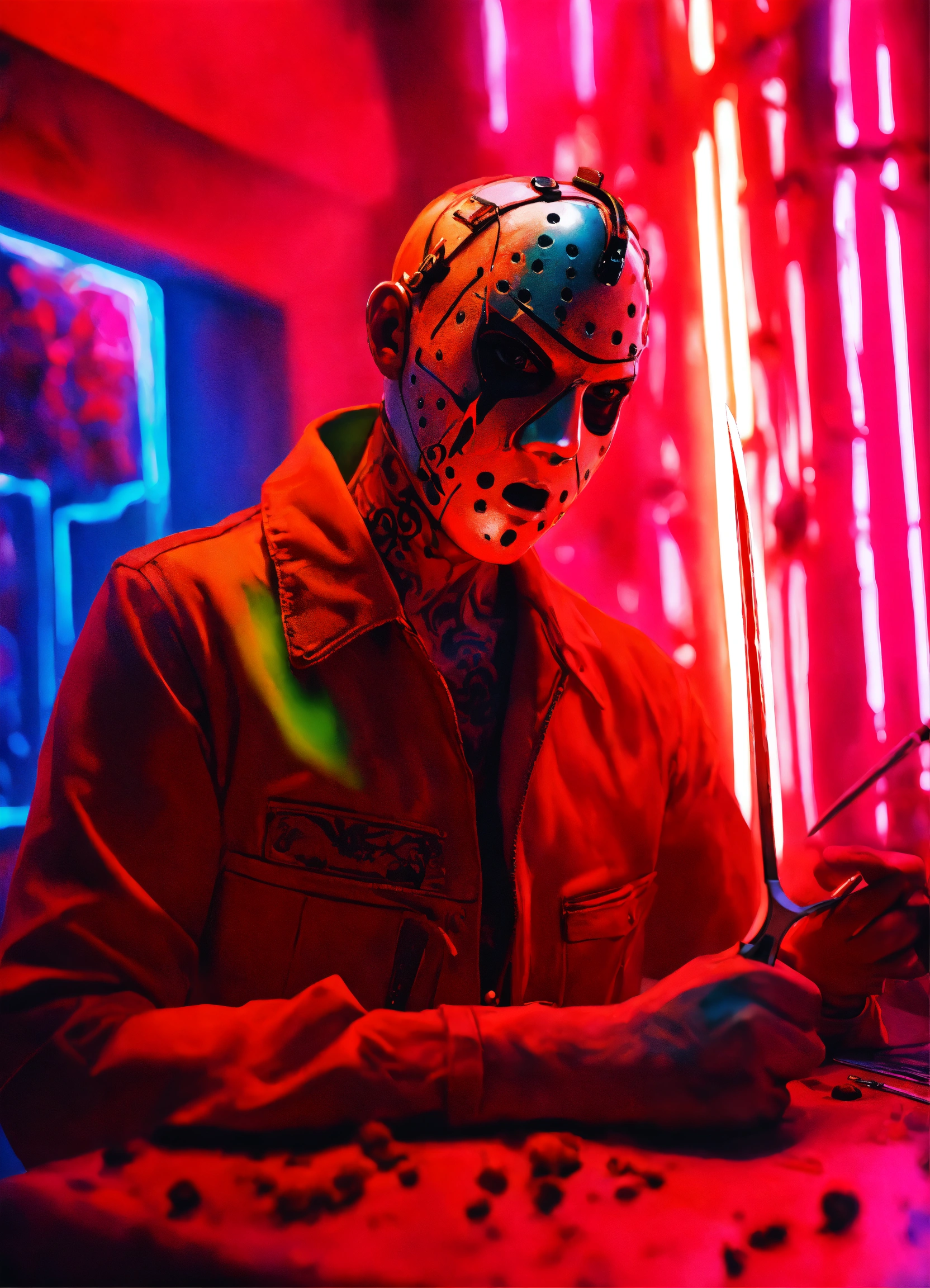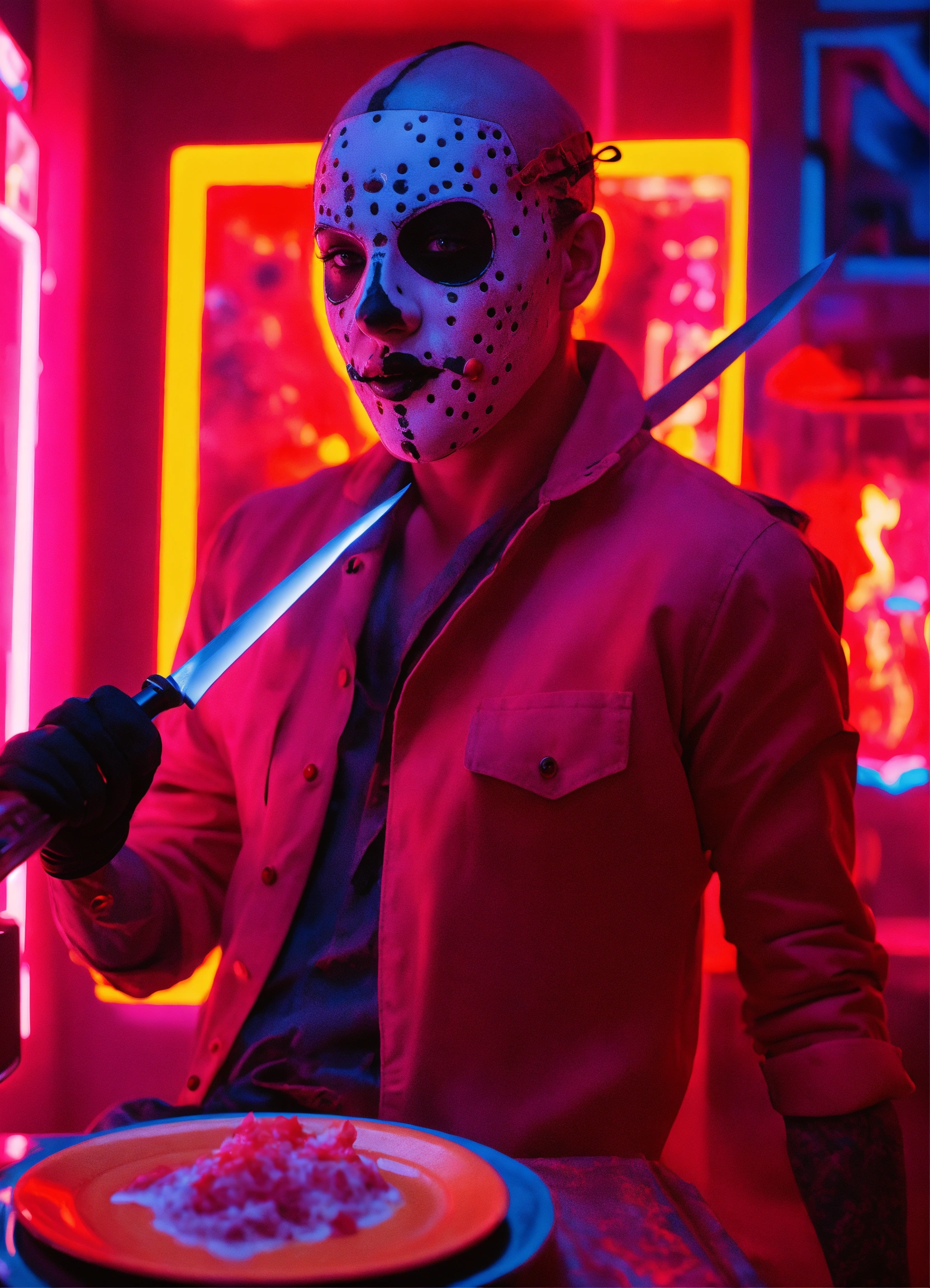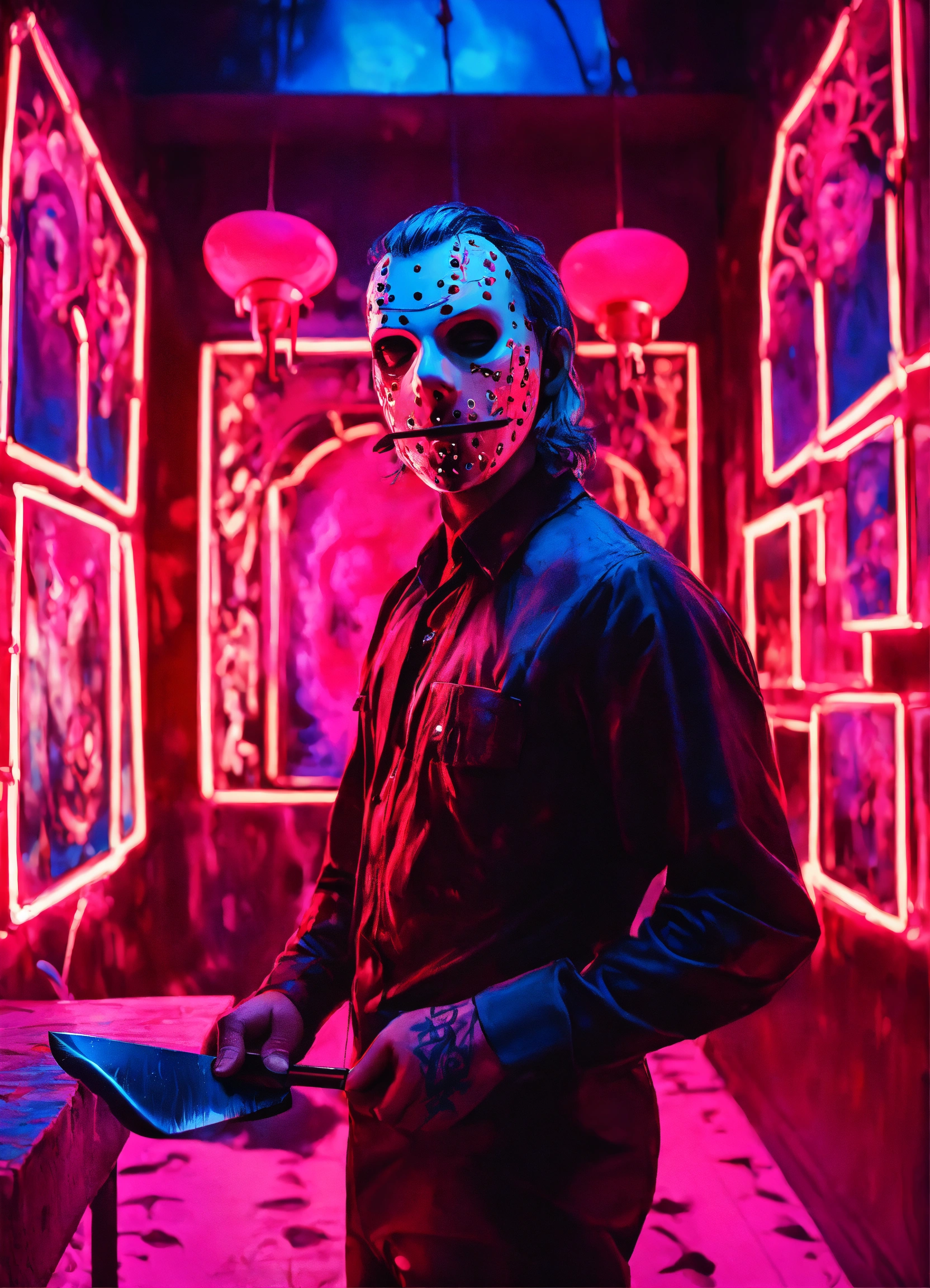 Close up portrait photography, of a jason from the movie friday the 13th holding a chefs knife in a dmt neon room, an attractive, 80 degree view, art by sergio lopez, natalie shau, james jean and salvador dali