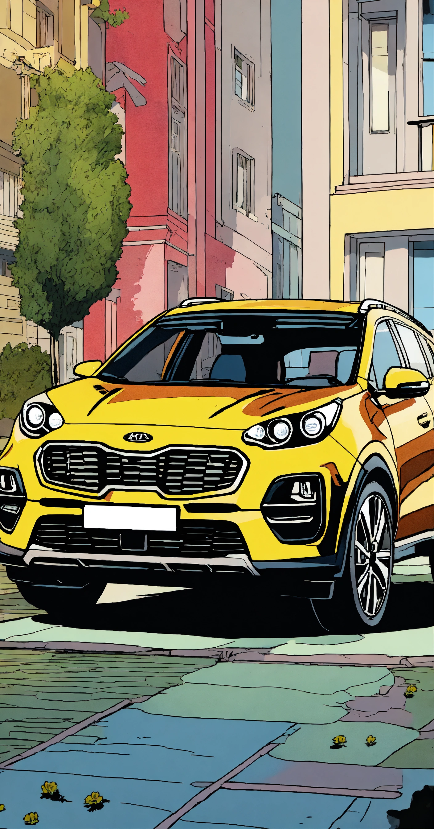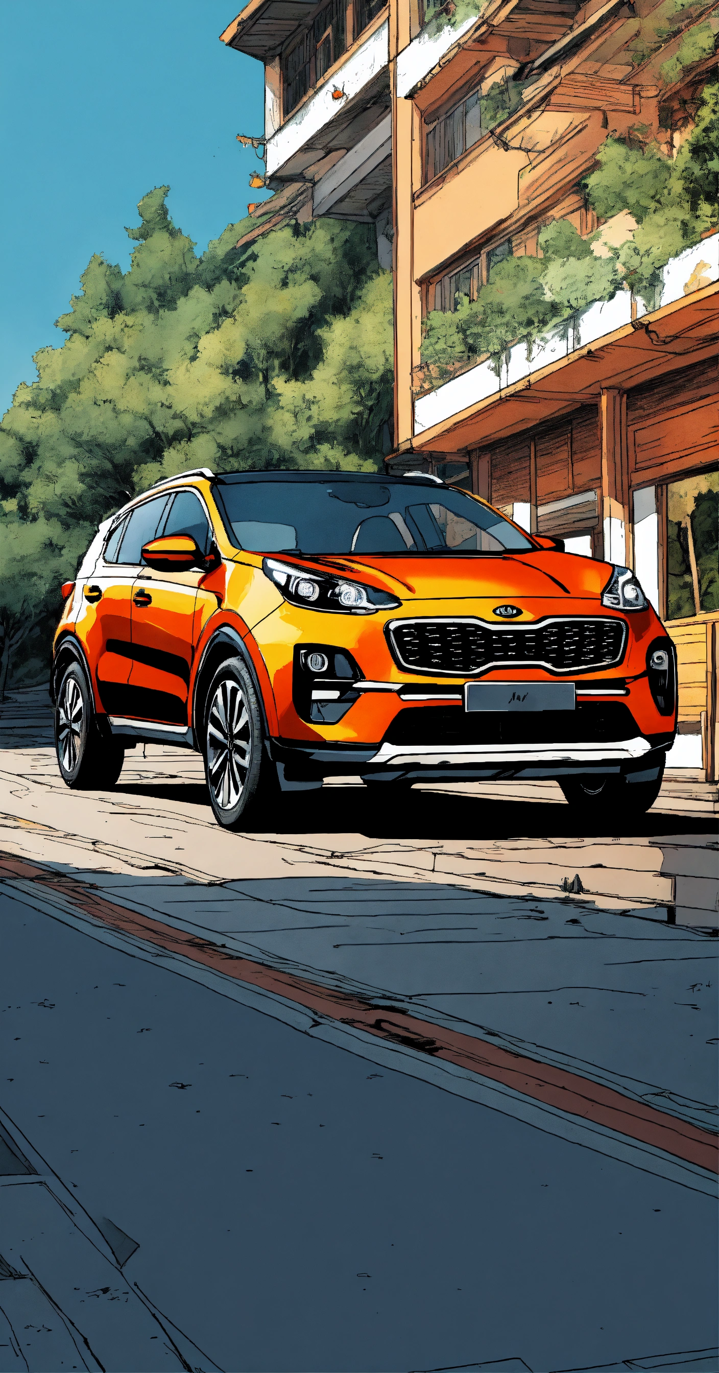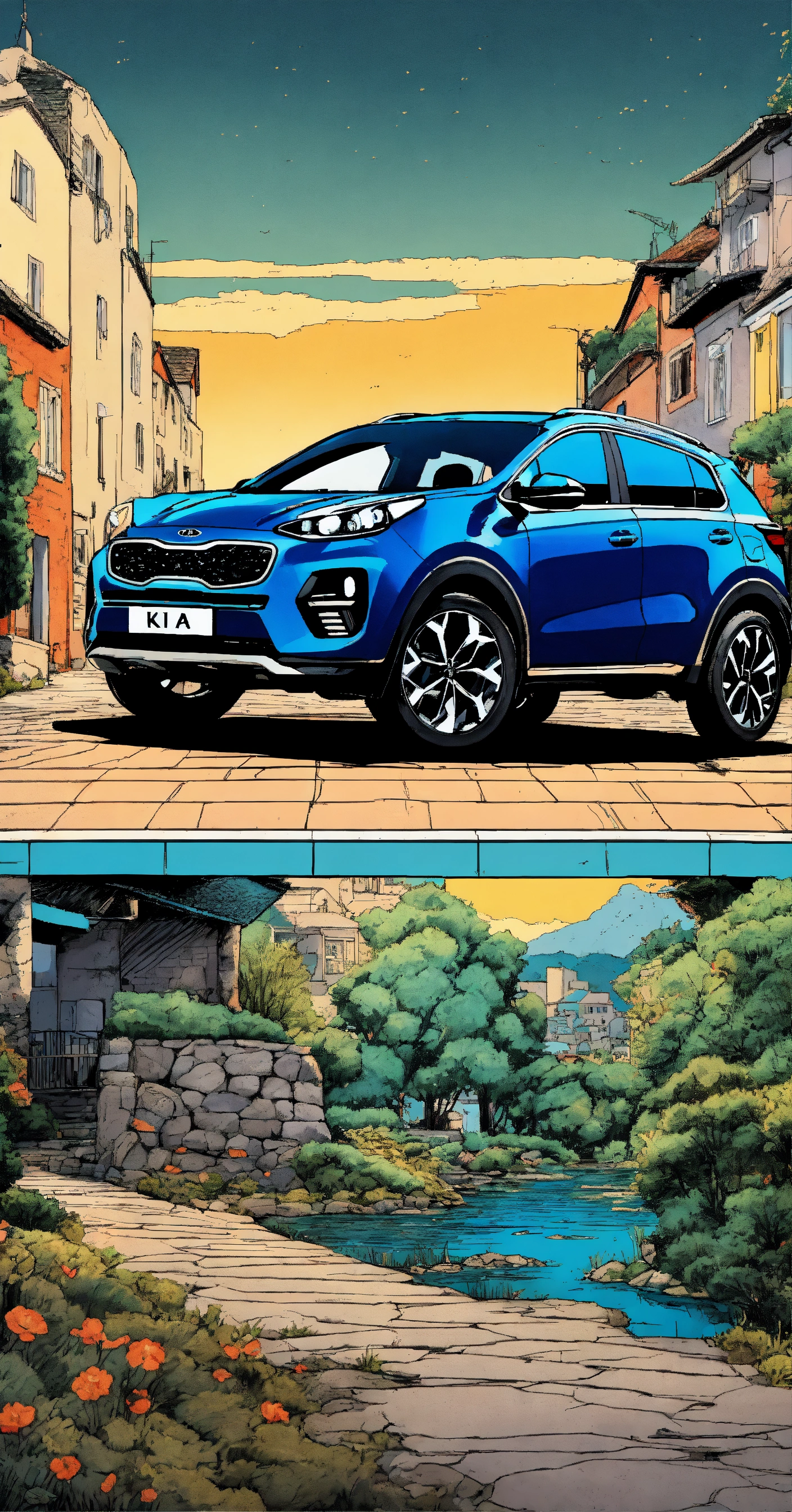Detailed pen and ink illustration of kia sportage 2022, dark color of the car, by herge, in the style of tin-tin comics, colorful, detailed, high quality, minimalism, aesthetic