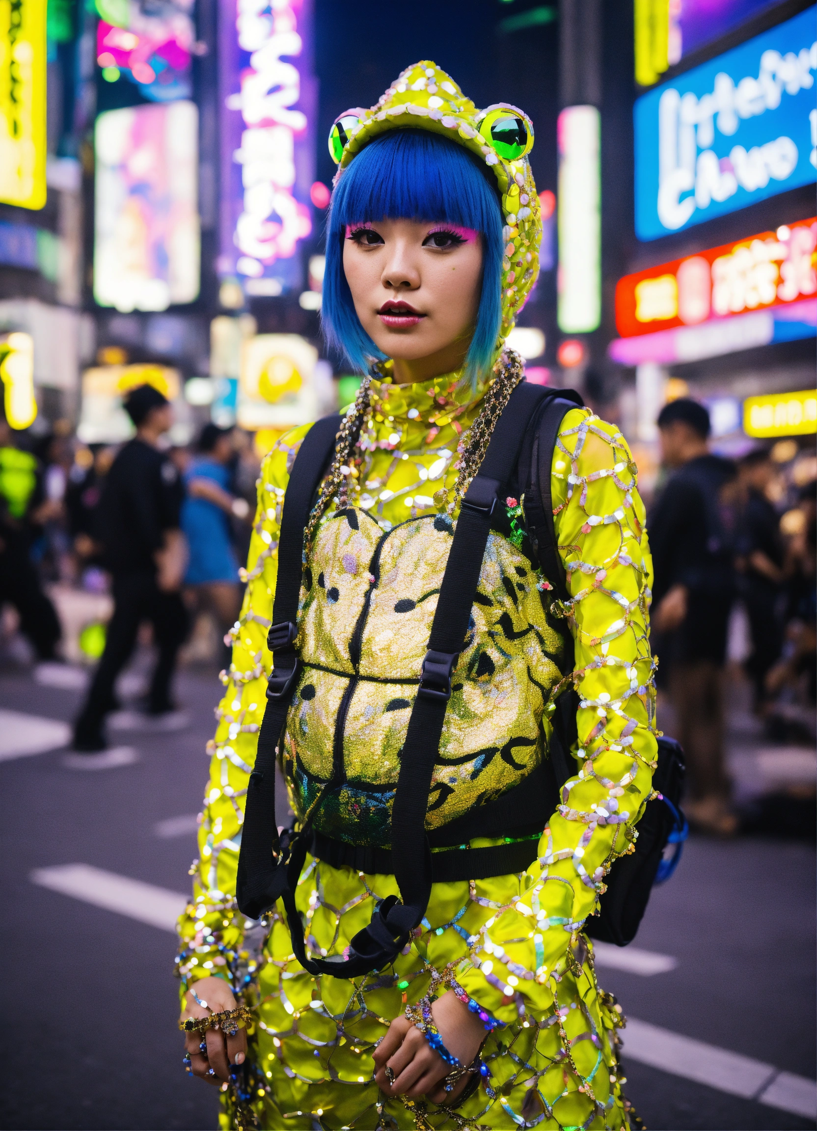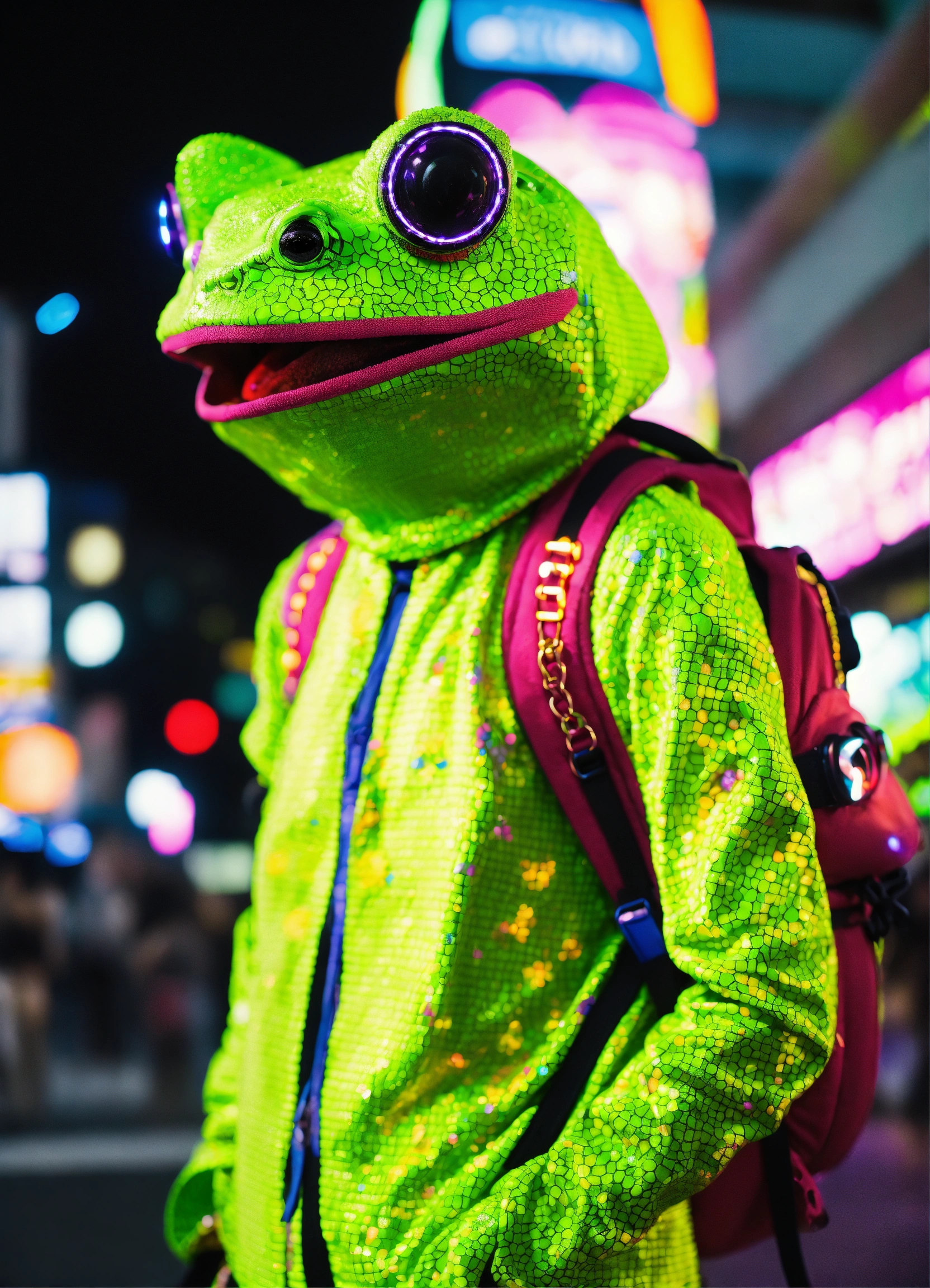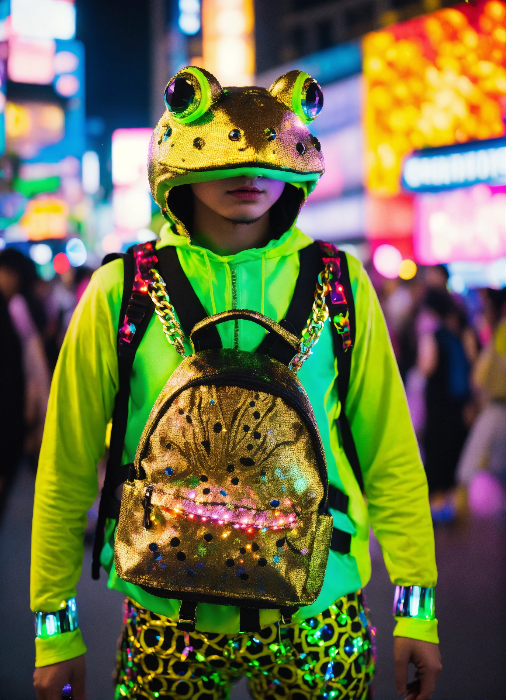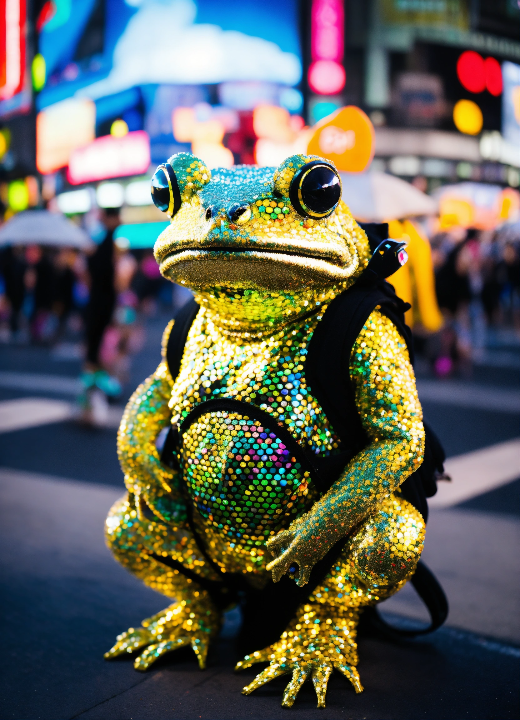 Fashion shoot at shibuya crossing of electric daisy carnival raver techno toad full body portrait made out of a 3d psychedelic toad patterned light neon optical illusion, rave kawaii toad backpack with crystal hemp gold black chains, ninja samurai toad folk costume in a fashion magazine