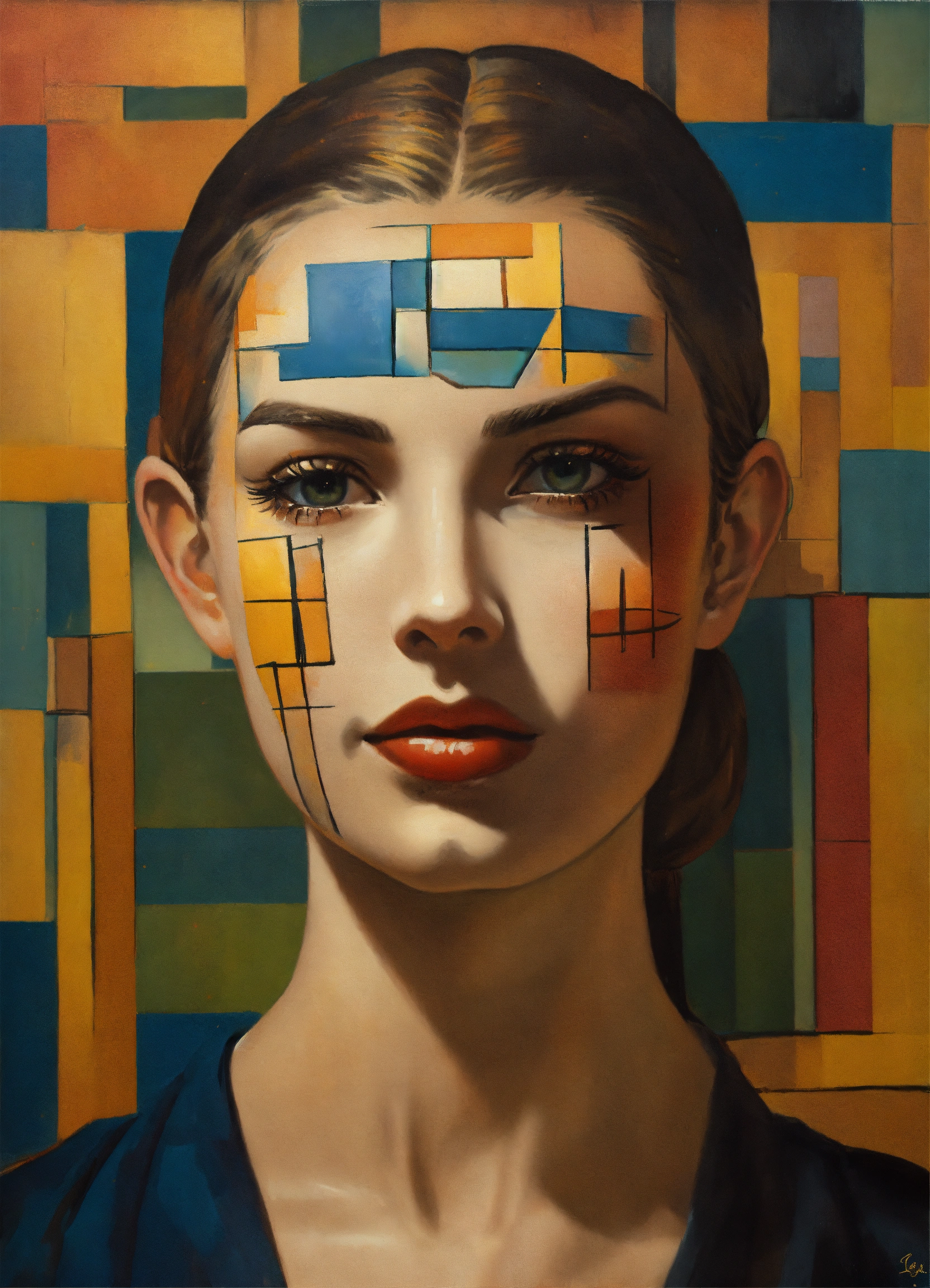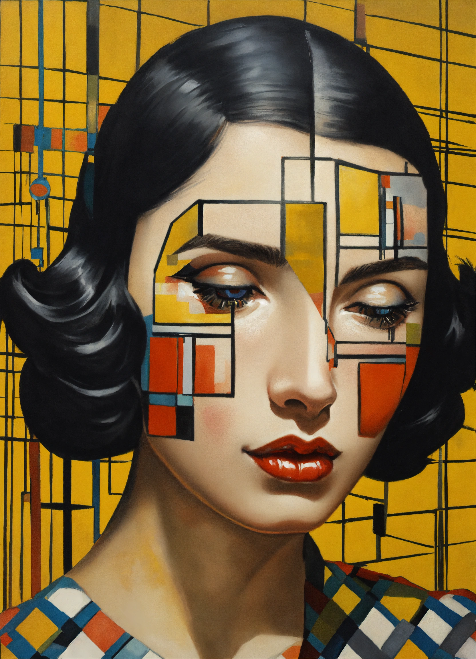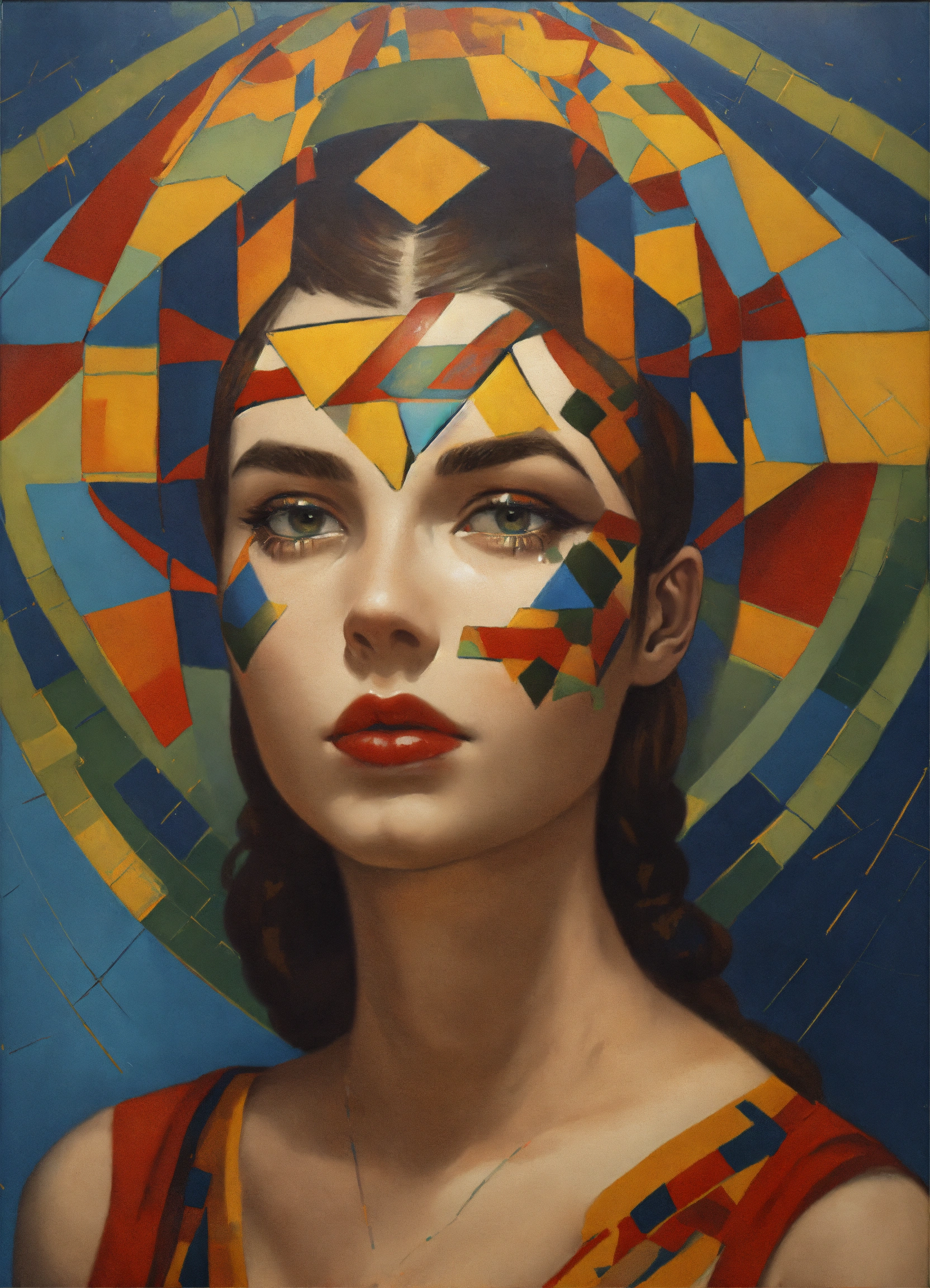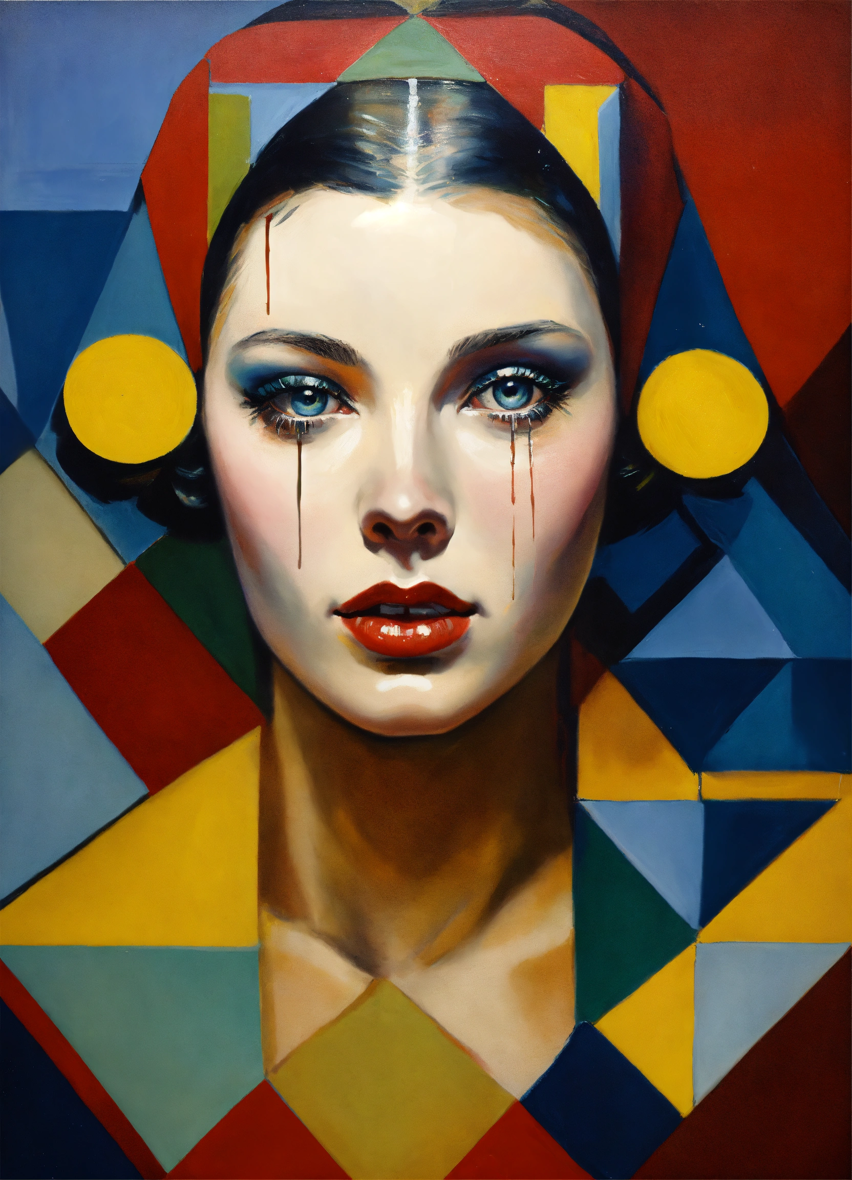 Smart 1940 oil face painting with geometrical patterns dripping out of her head