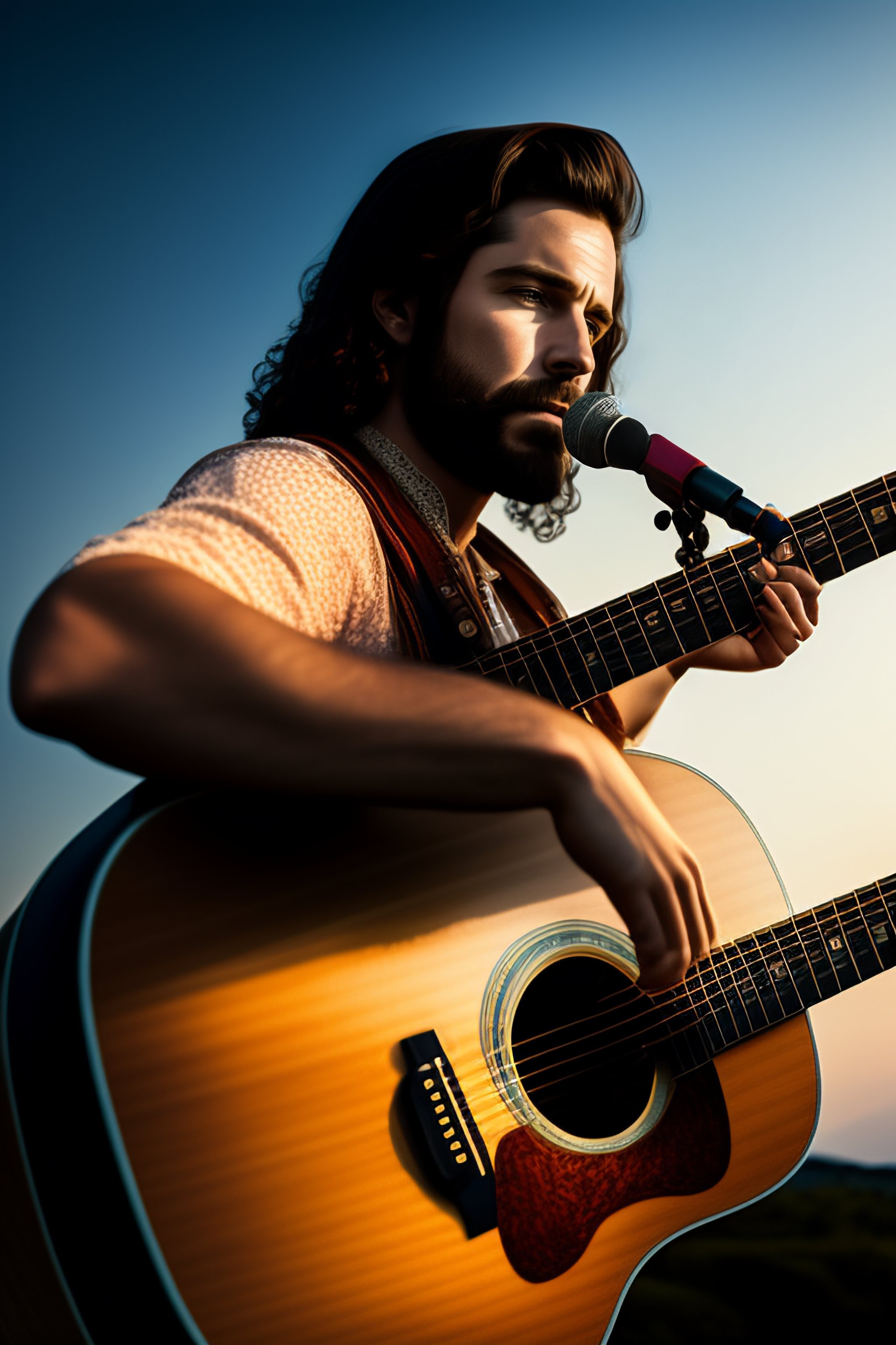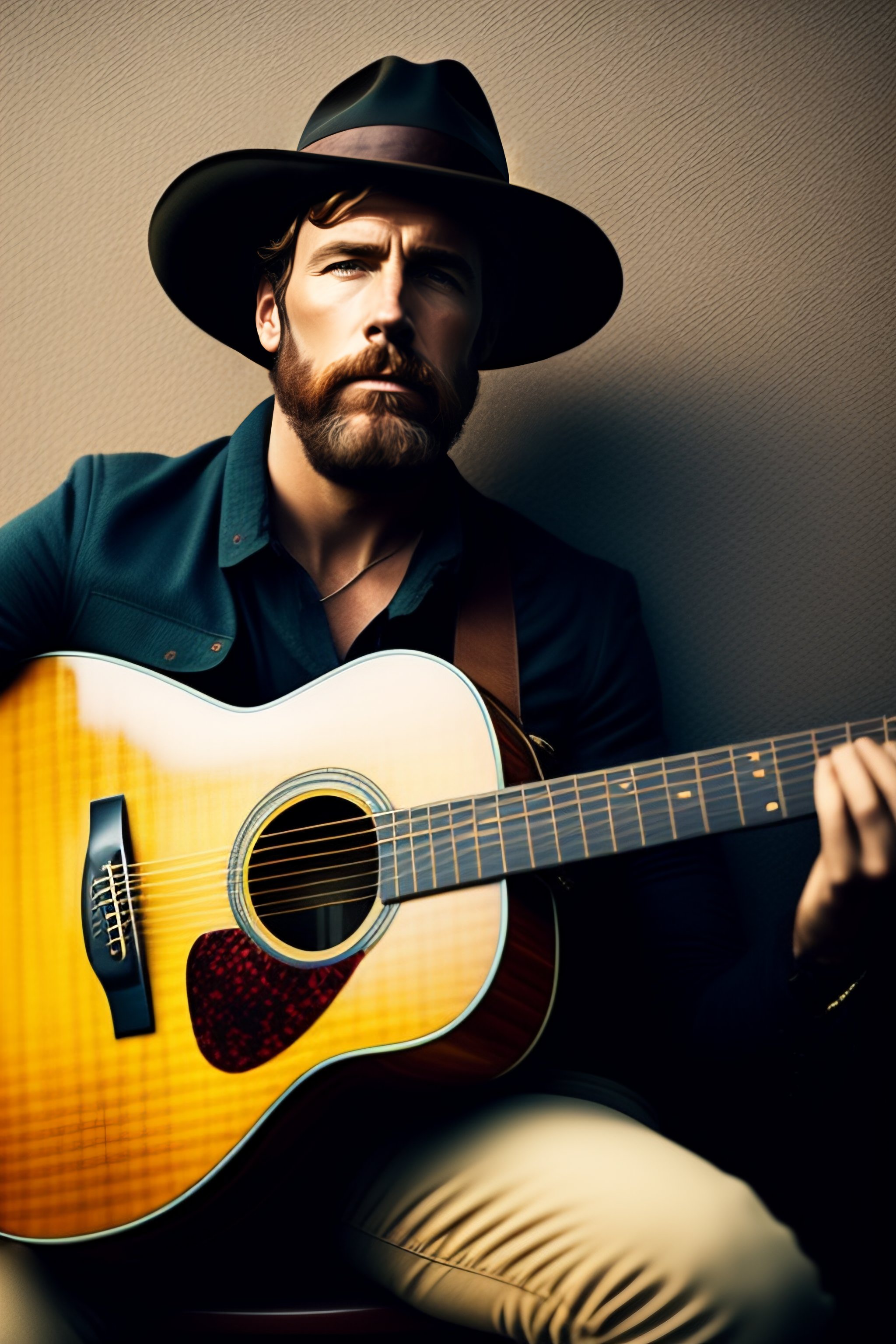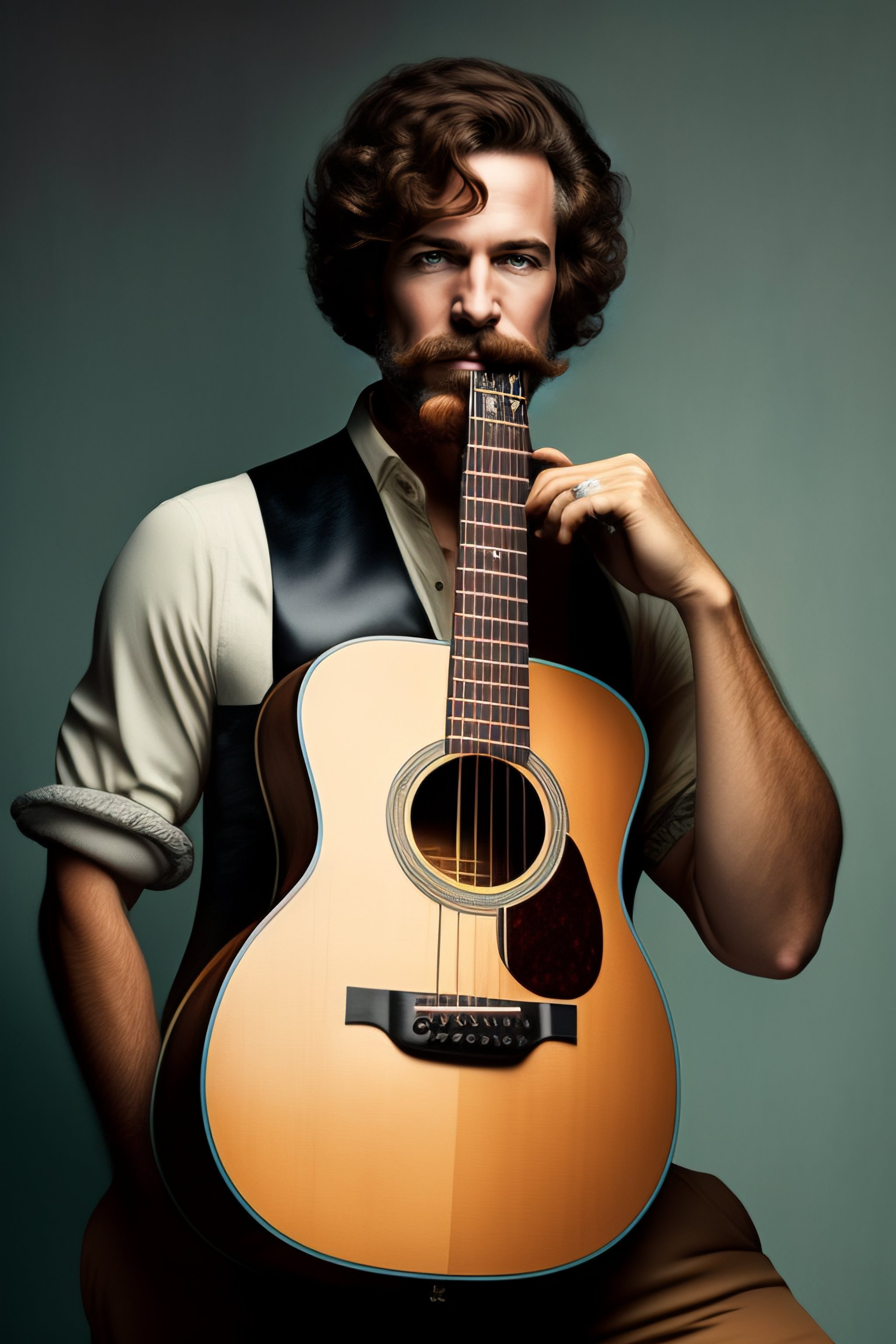 A folk songwriter with a martin guitar and a cuban cigar