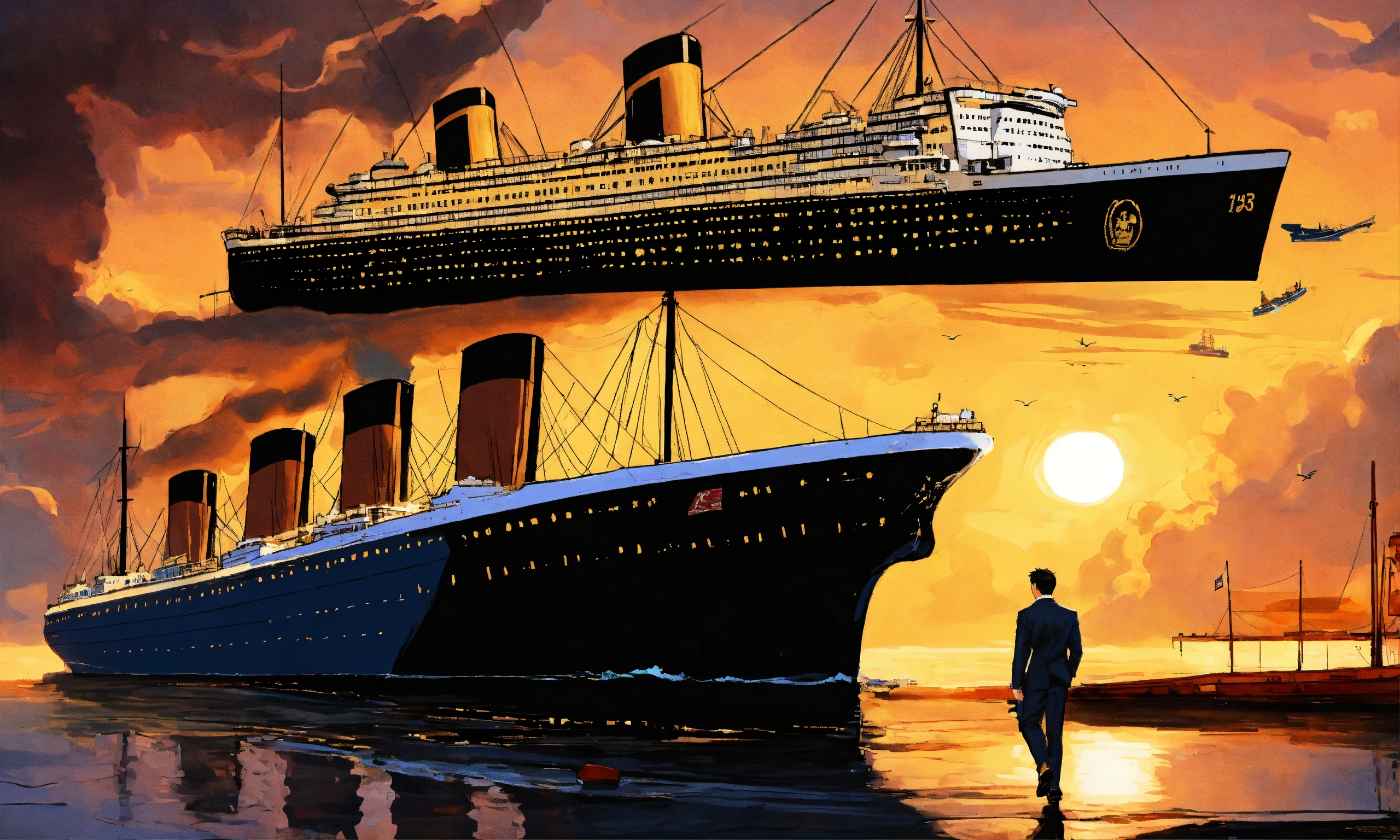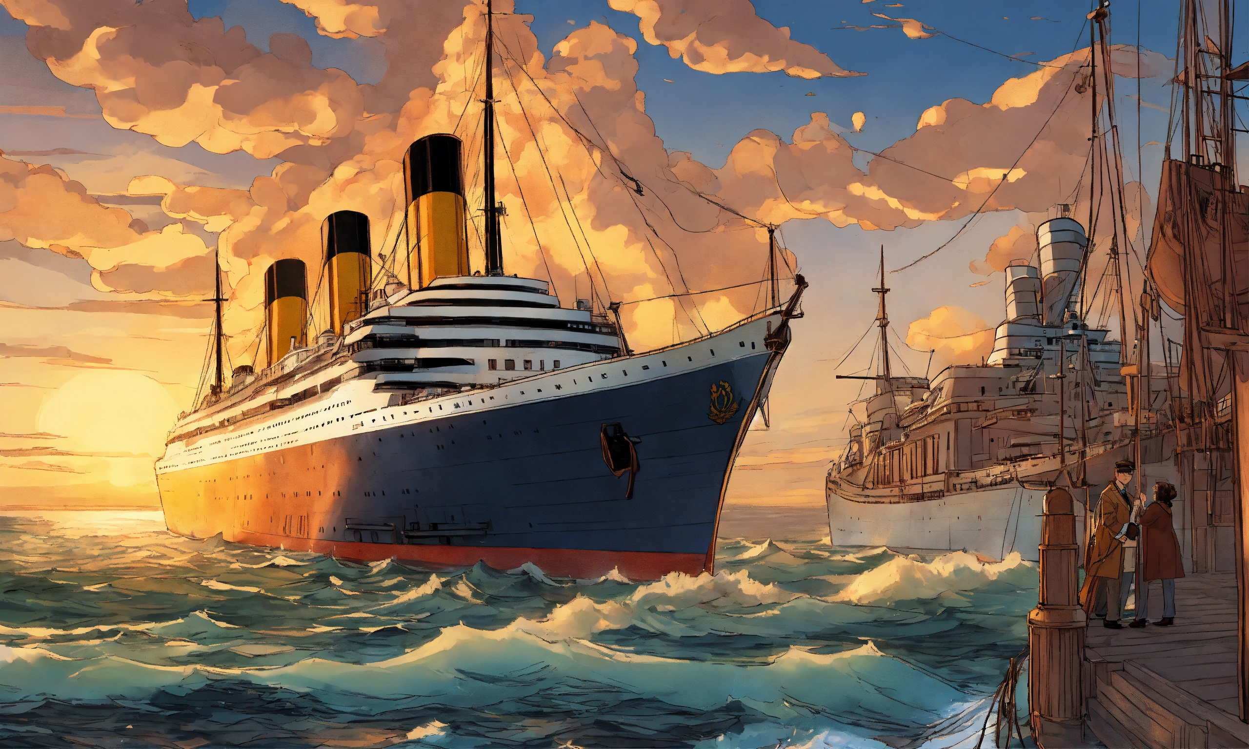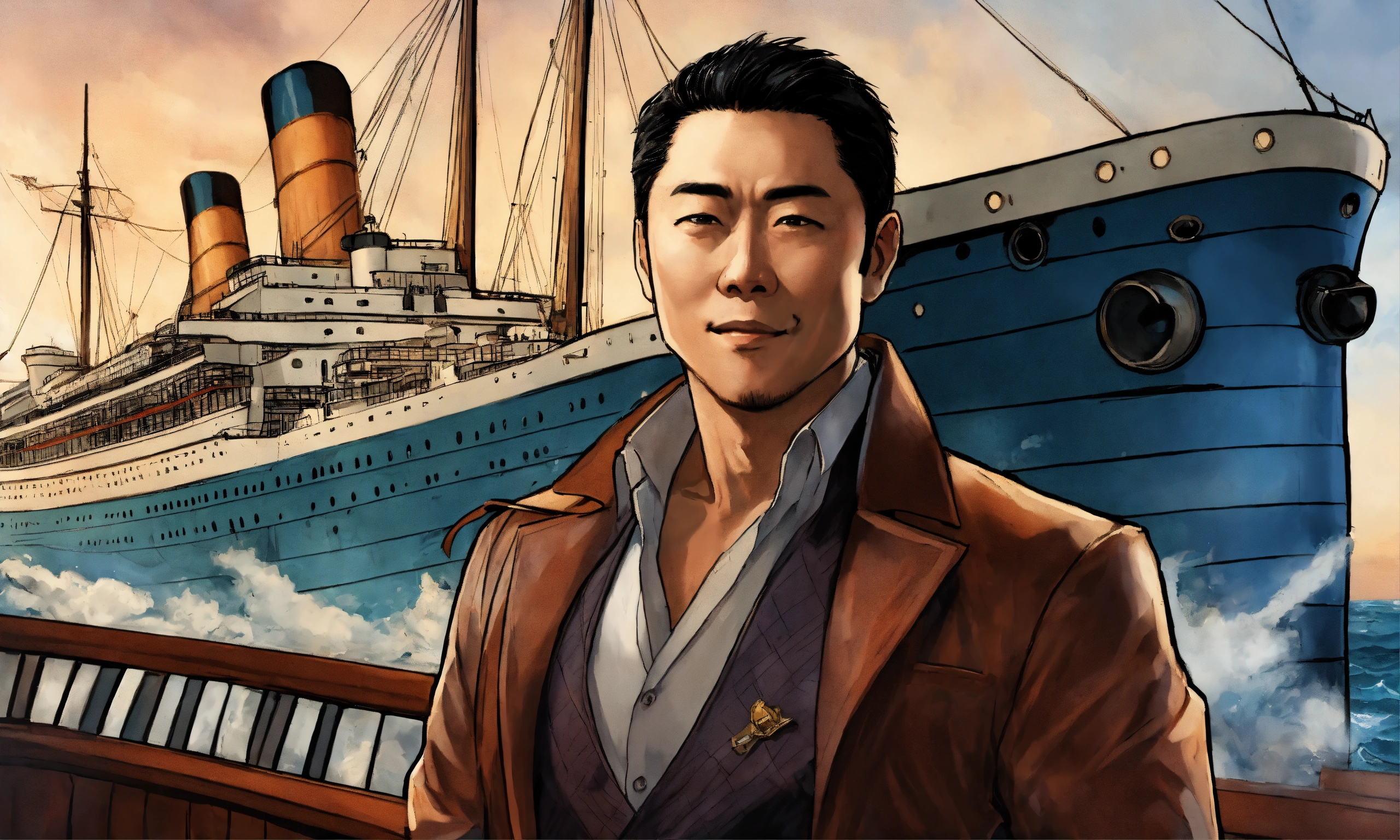Draw me a picture in the form of a comic book, in the background there is a large, beautiful ship that looks like the titanic, in the foreground there is a close-up of a man in the image of jet li, jet li’s clothes are a suit for the captain of the ship, with a smiling expression beatifull