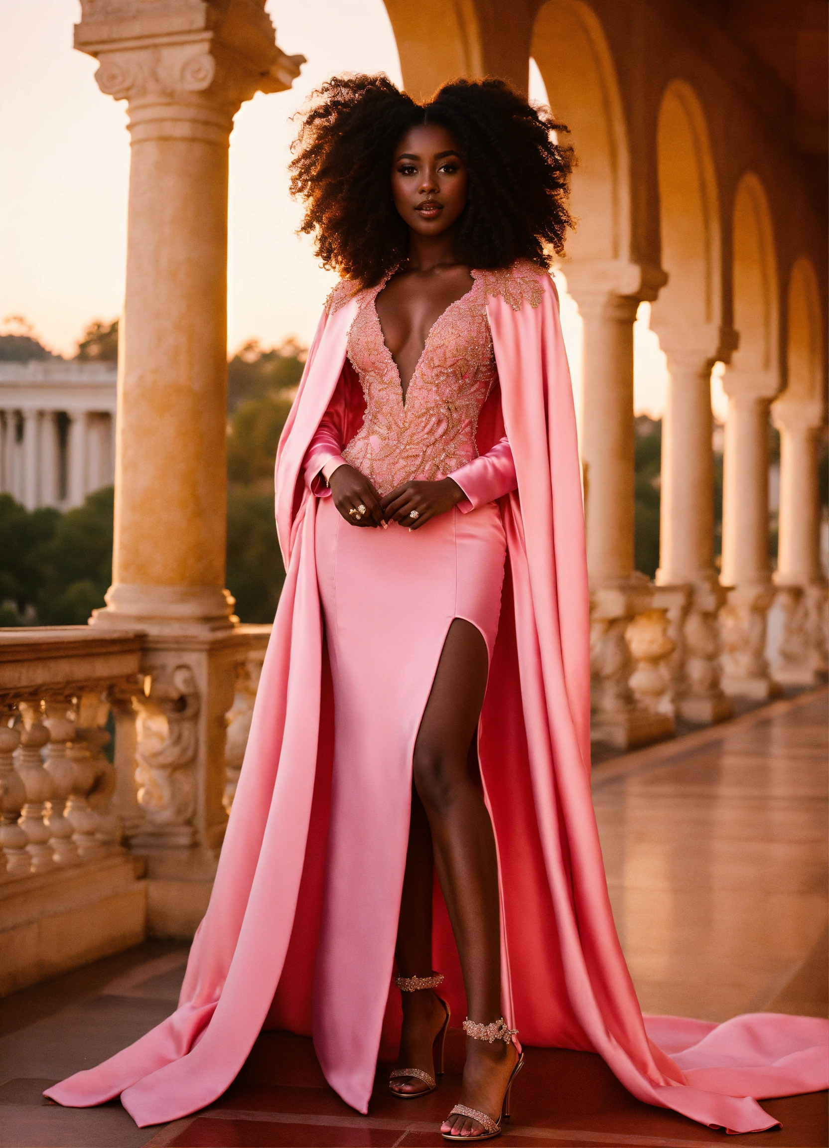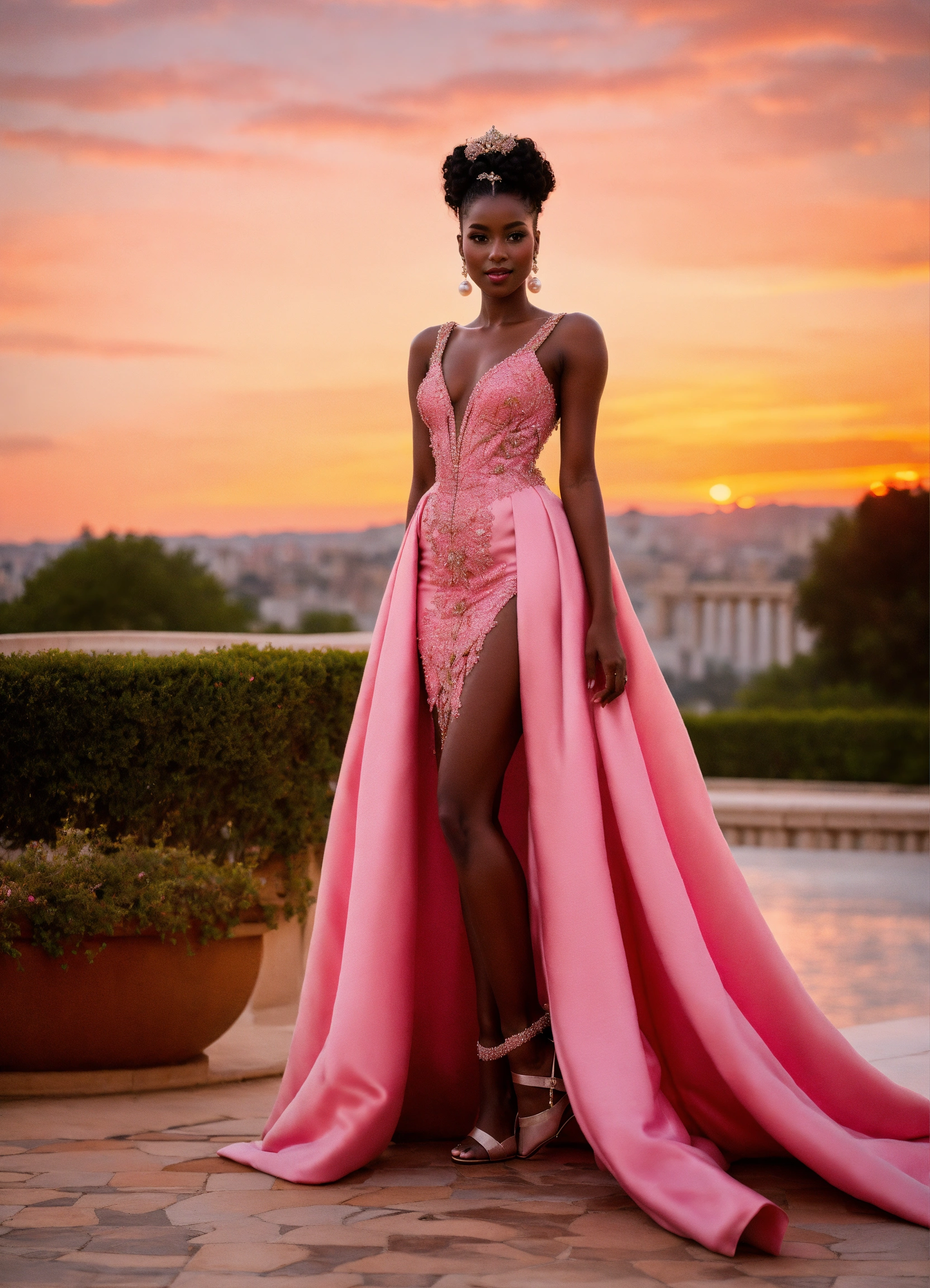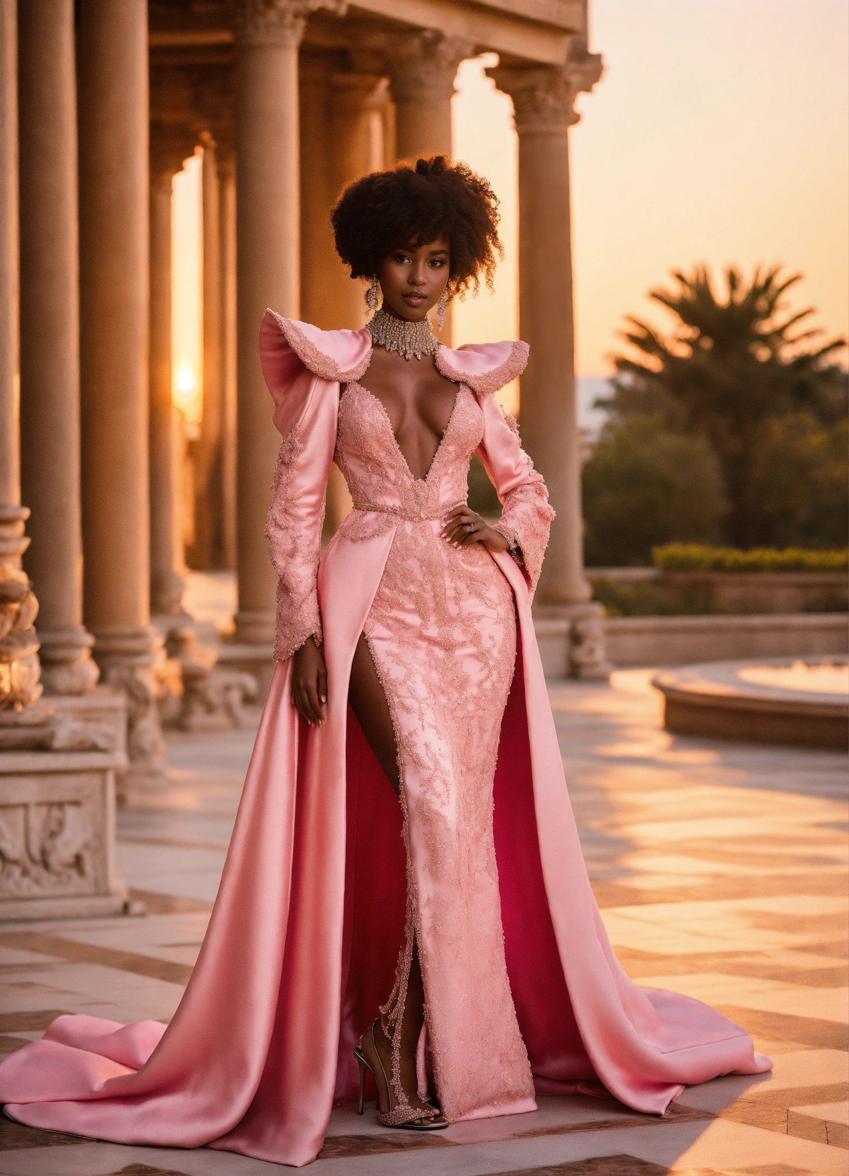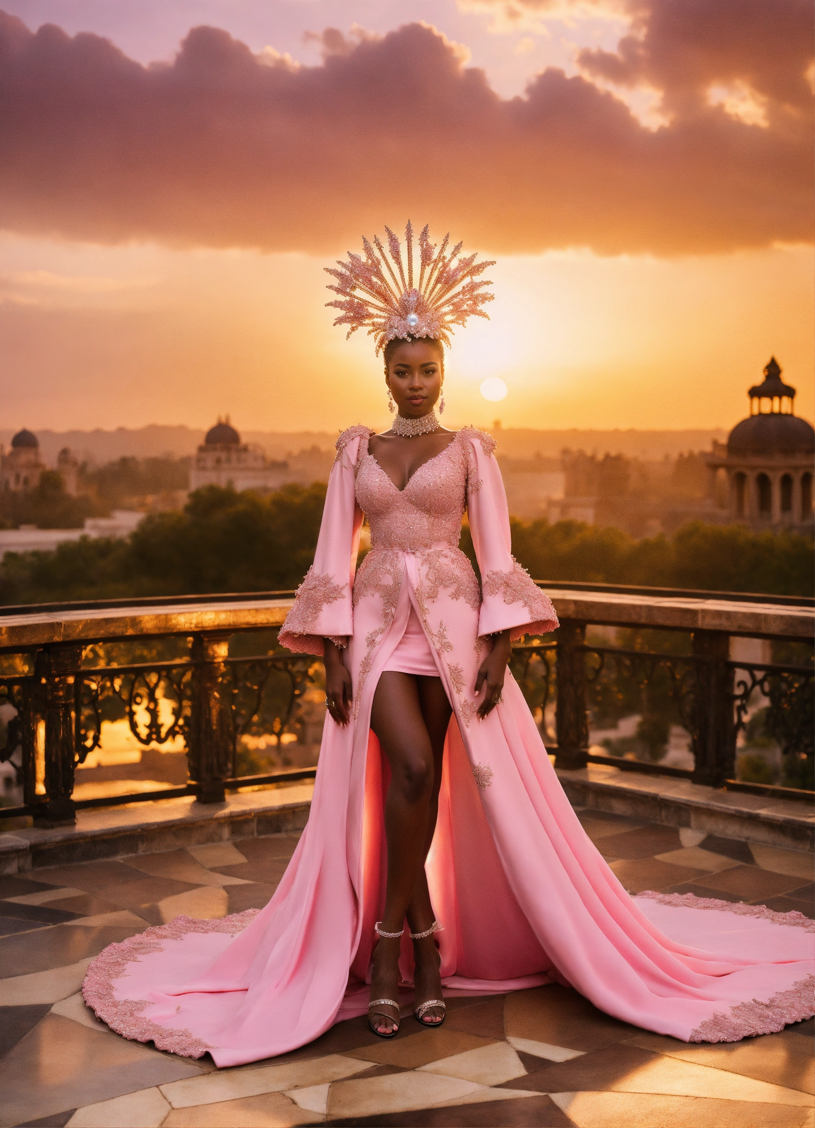 Alien queen, dark skin, pinned up natural hair. pearl-embellished head-peice, wide hips. dressed in pink haute couture dress and robe, open toe heels, standing on a sumptuous palace terrace at sunset. outgoing persona.