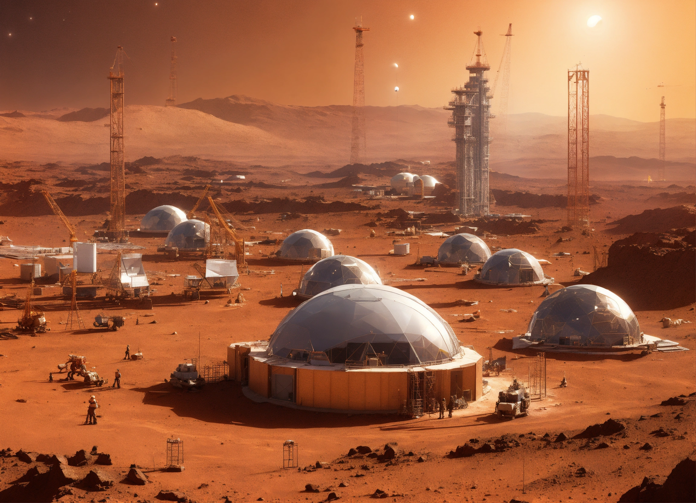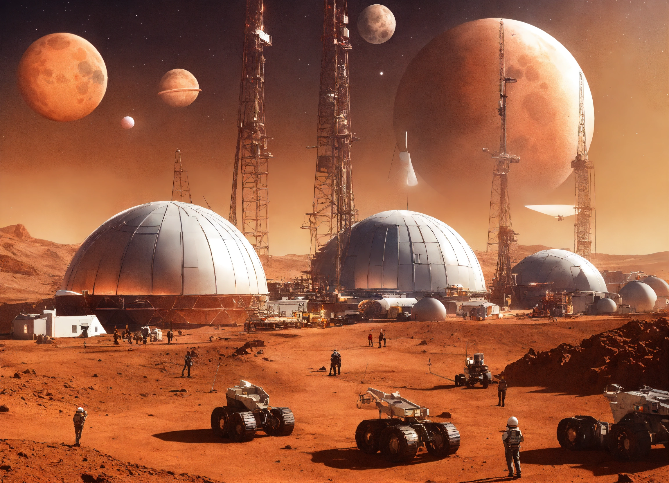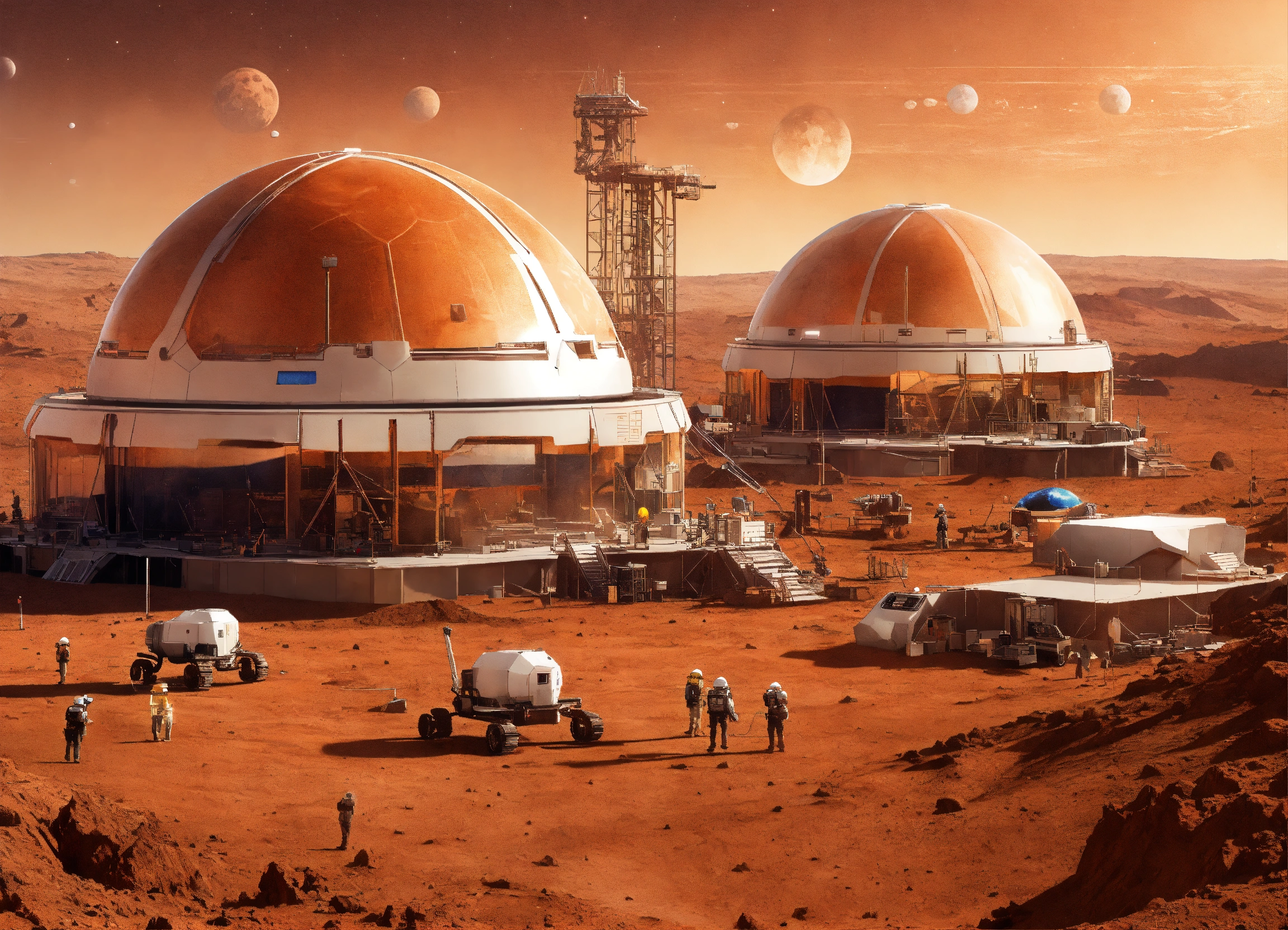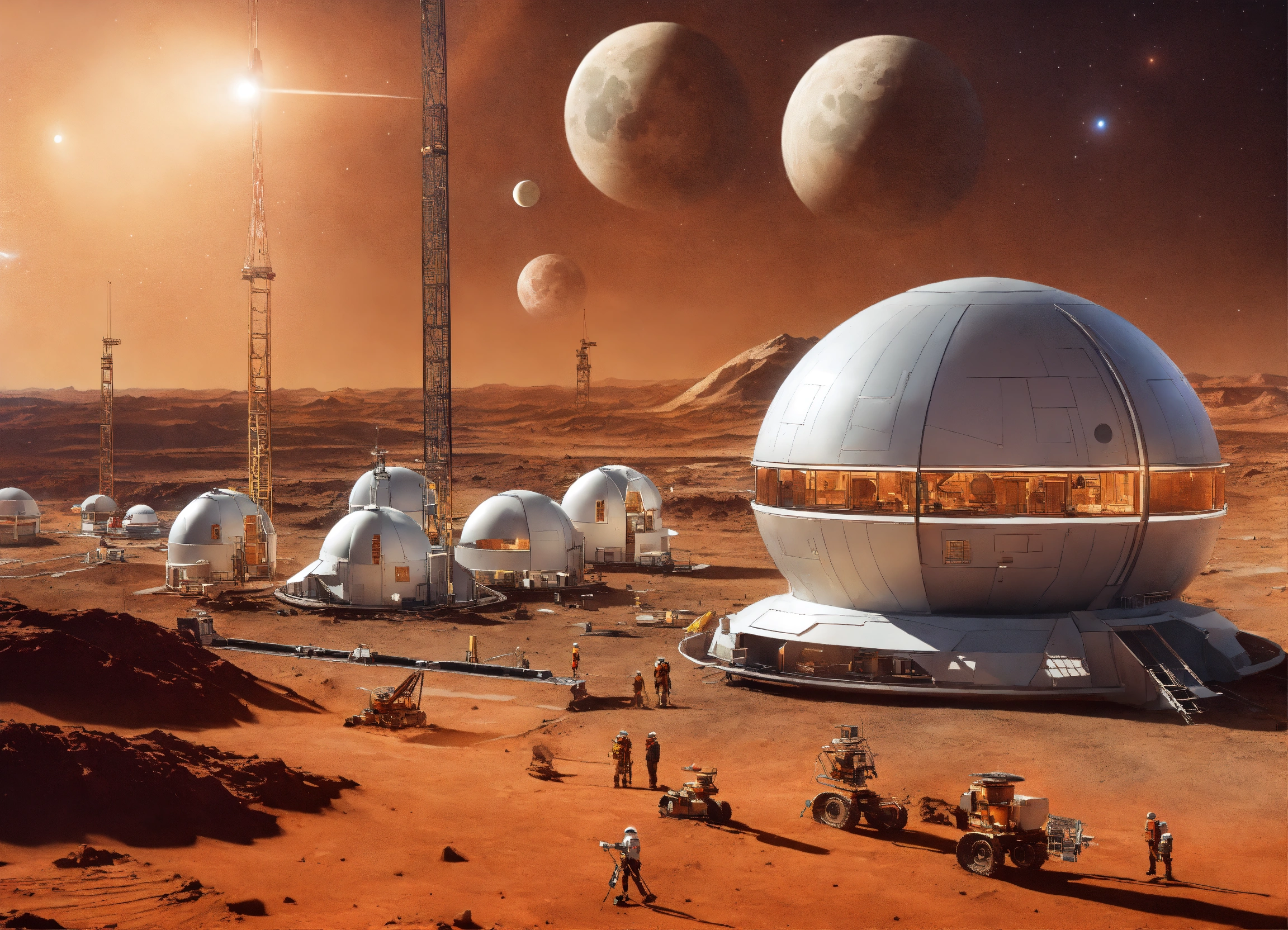 Picture of construction on mars using space age technology, show multiple moons in the background, show domes and other space age houses with space age construction cranes and people