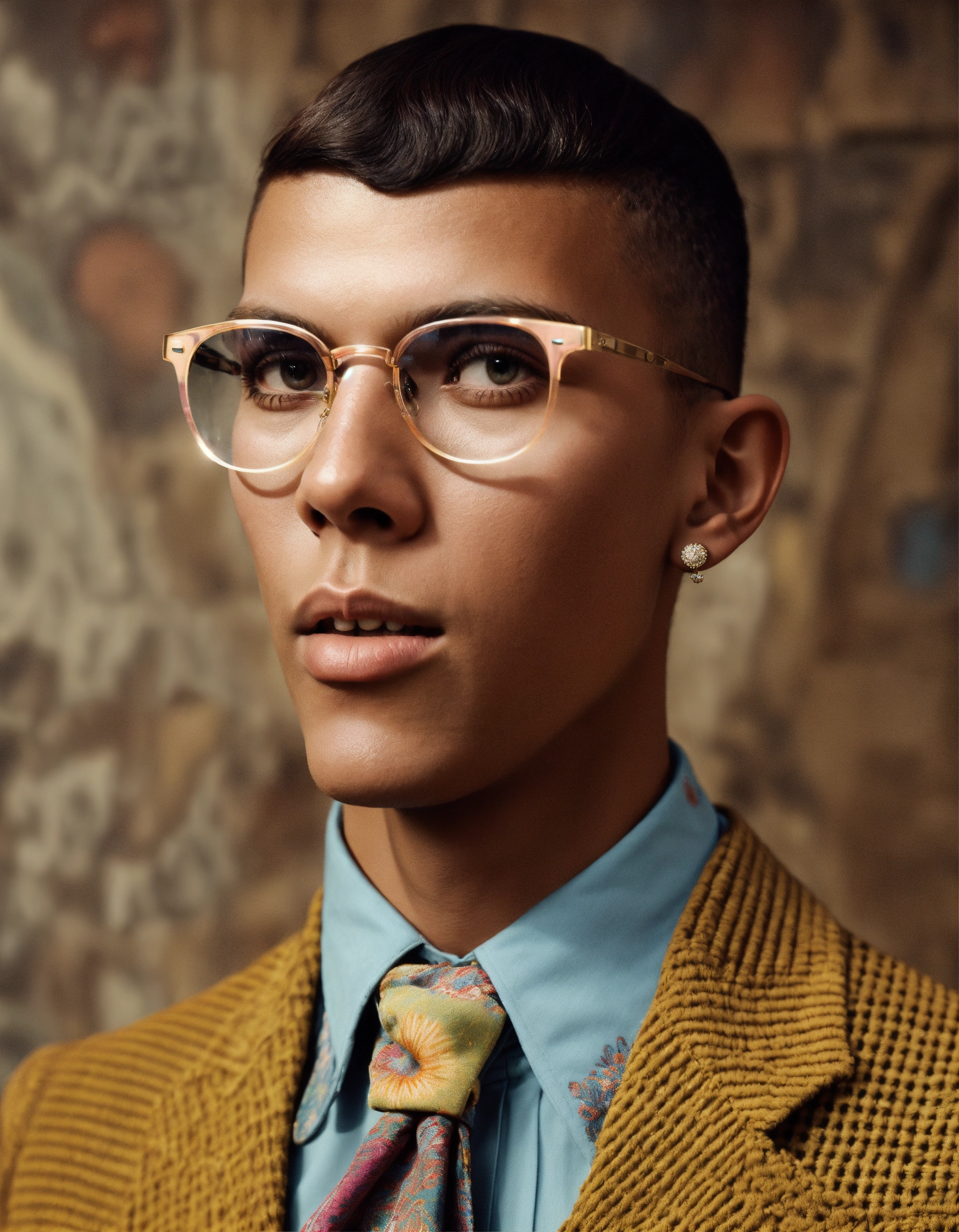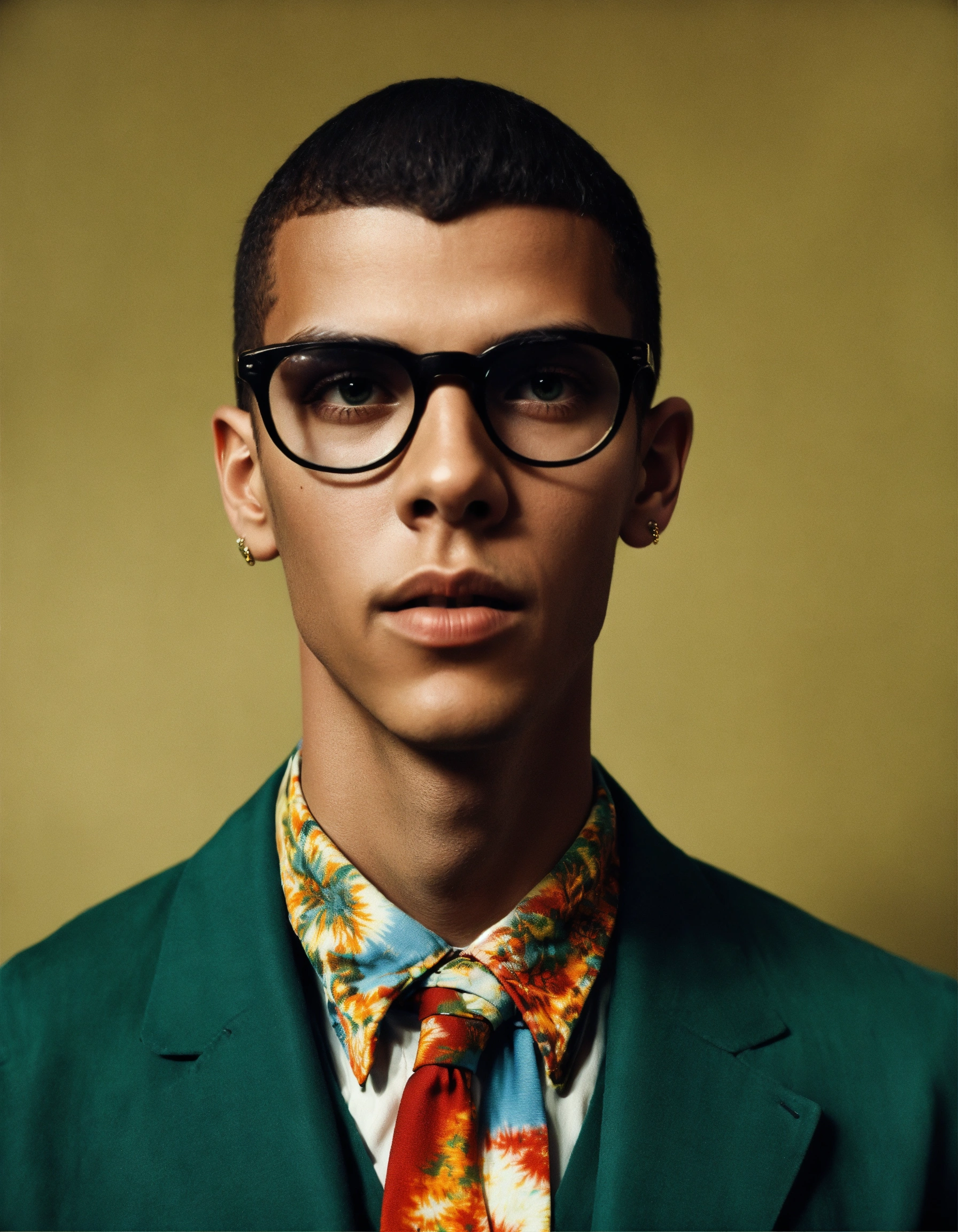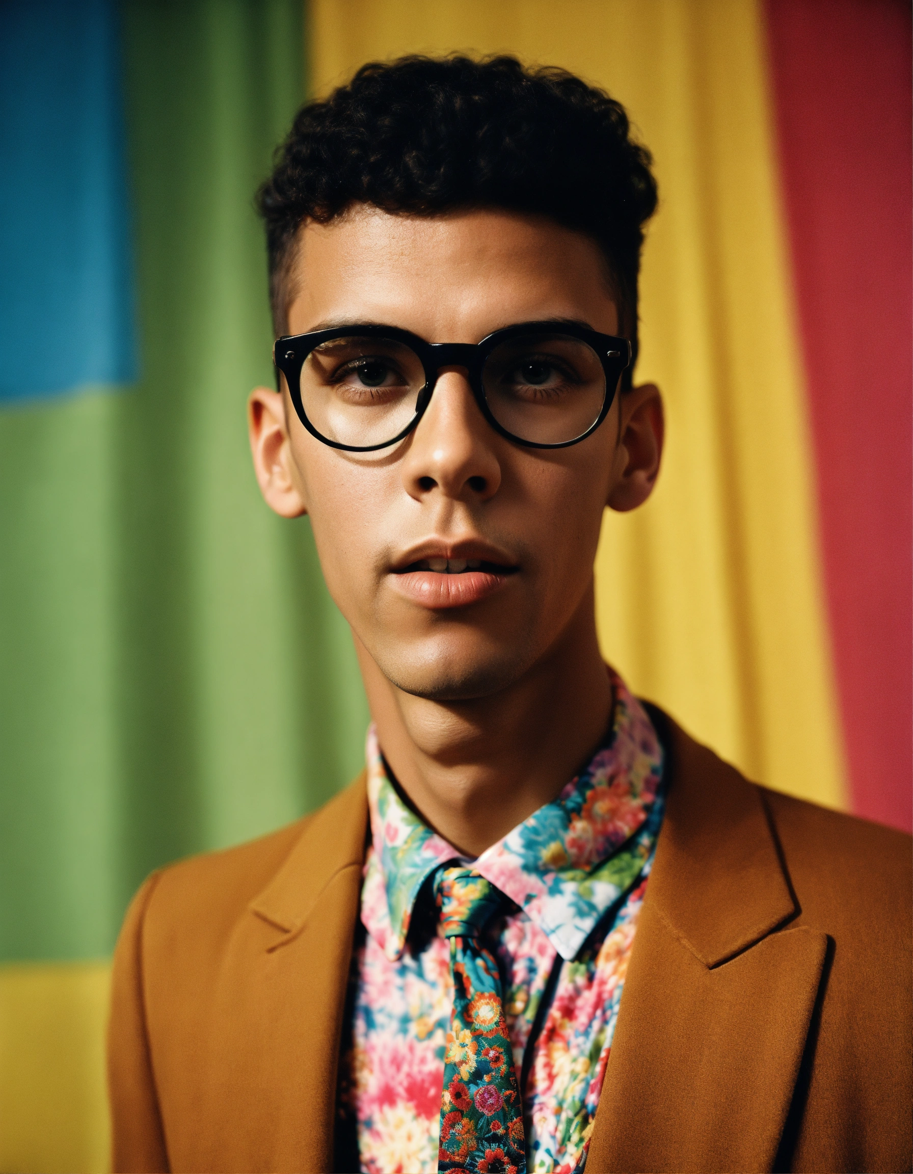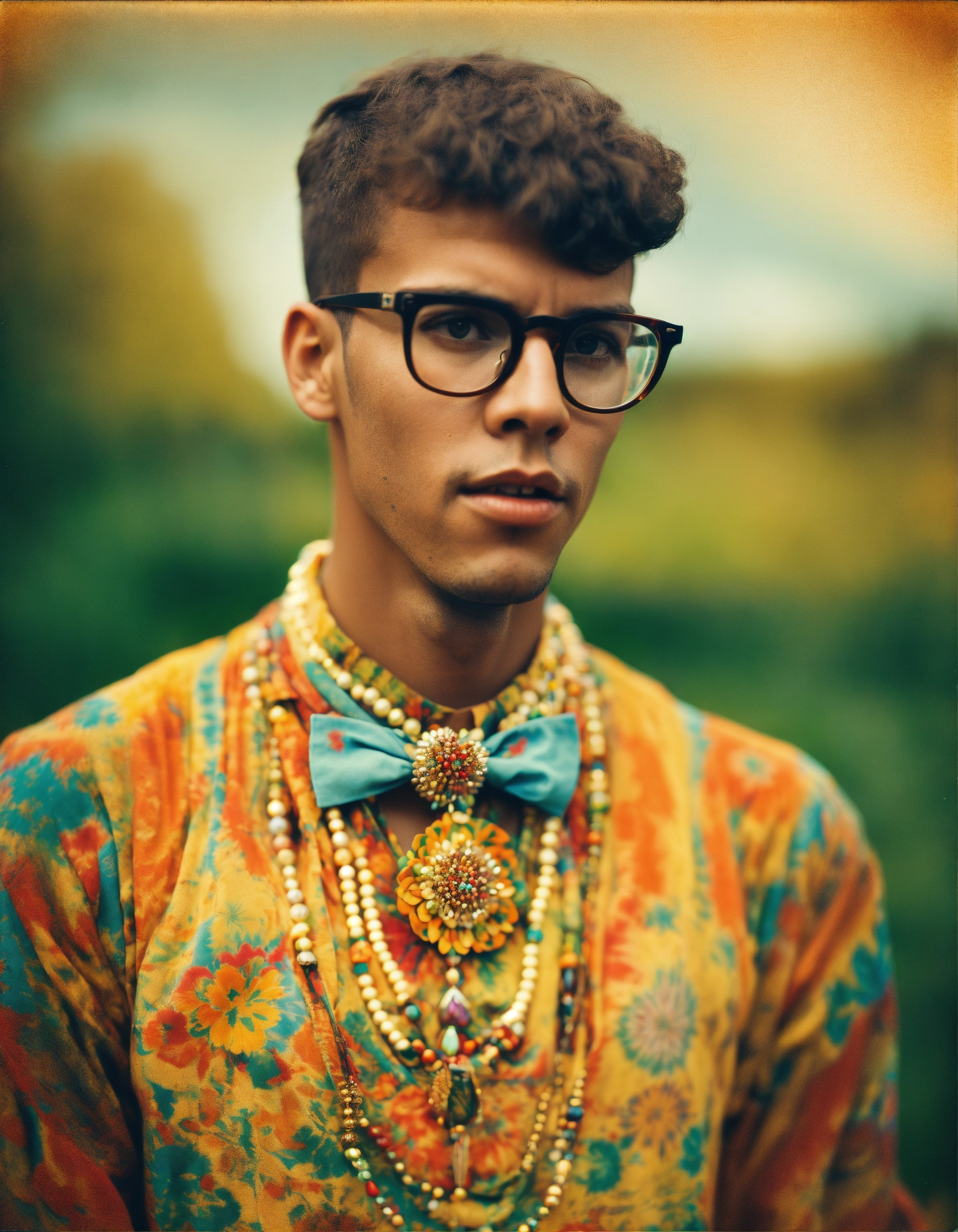 Imagine the french singer stromae dressed in the iconic bohemian style of that period. he should be wearing brightly colored tie-dye shirts, bead necklaces, headbands, and round glasses. his face should be perfectly recognizable. add realistic and meticulous details to capture the essence of the hippie movement. the image quality should evoke the vintage charm of polaroid photographs, with a slight fade on the edges, warm shades, and a grainy texture to accentuate the nostalgic feel.