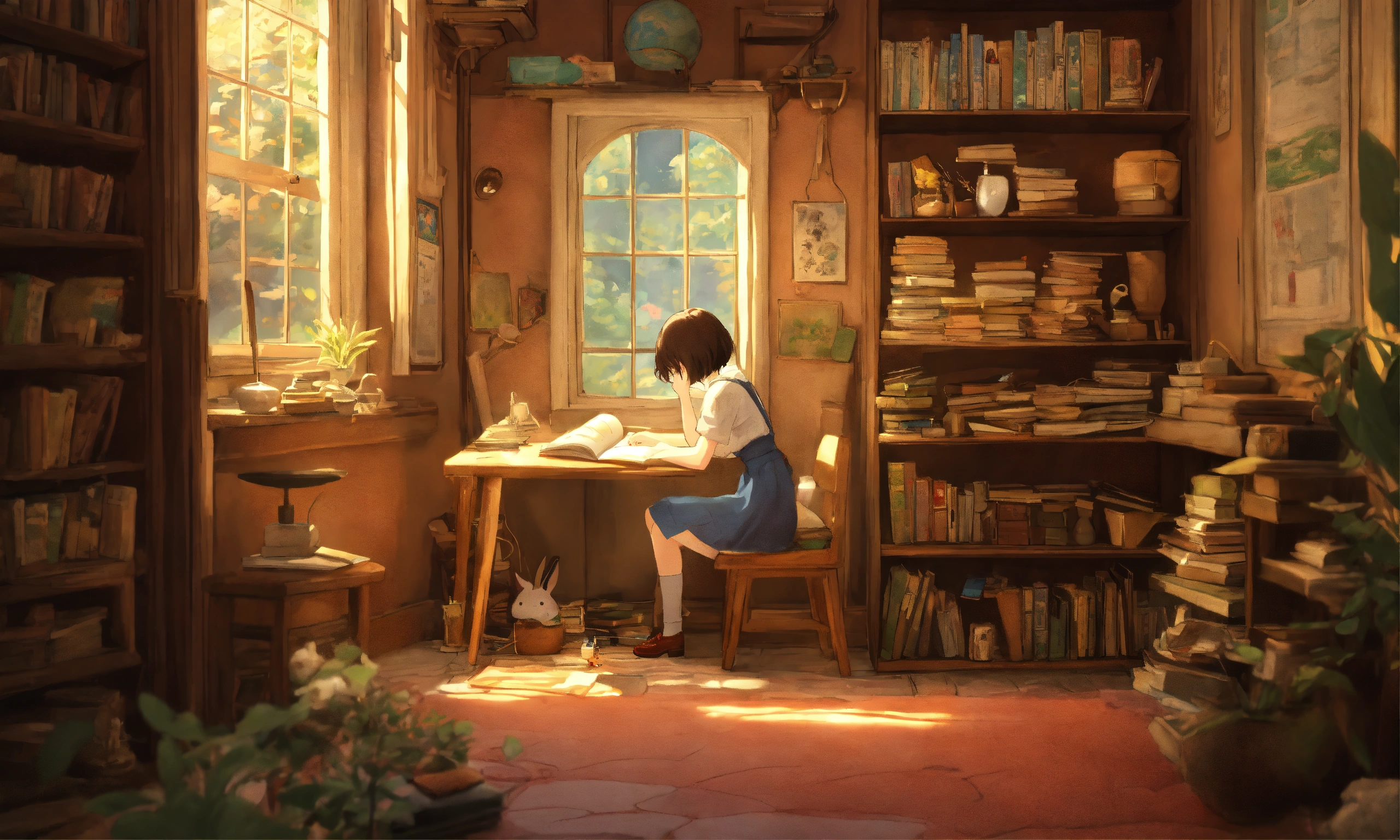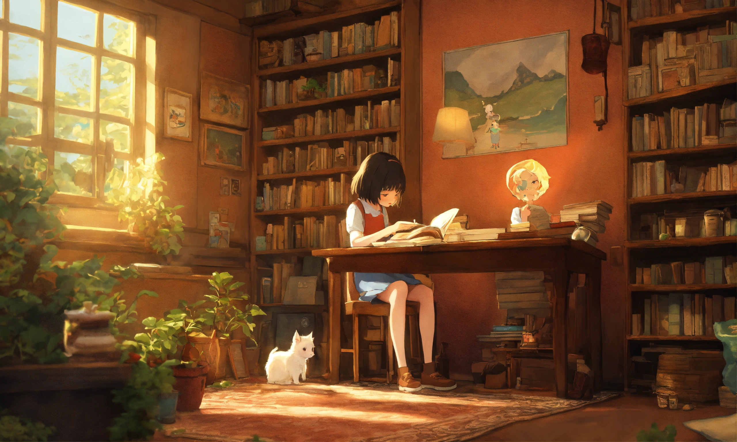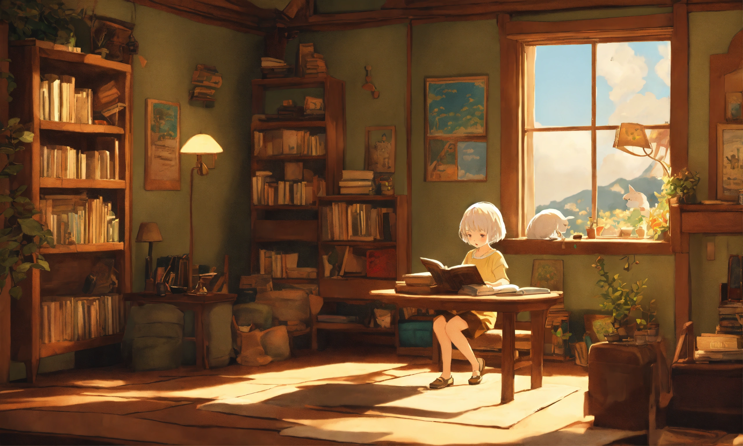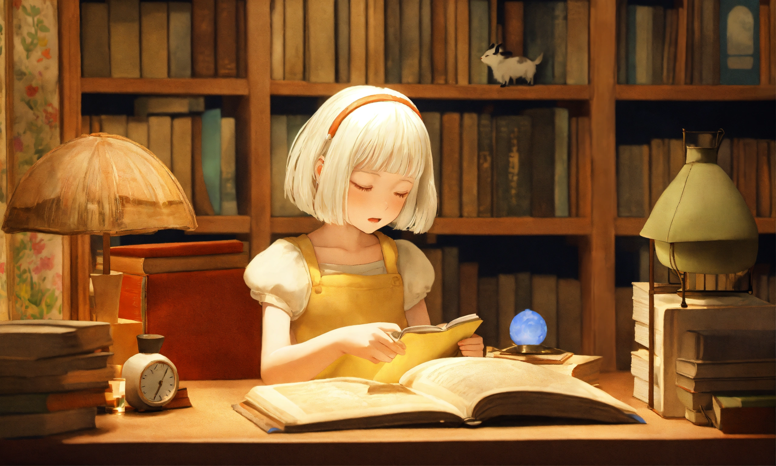 In a studio ghibli-inspired style, depict a diorama setting where an albino girl with medium-short hair is deeply engrossed in reading a book