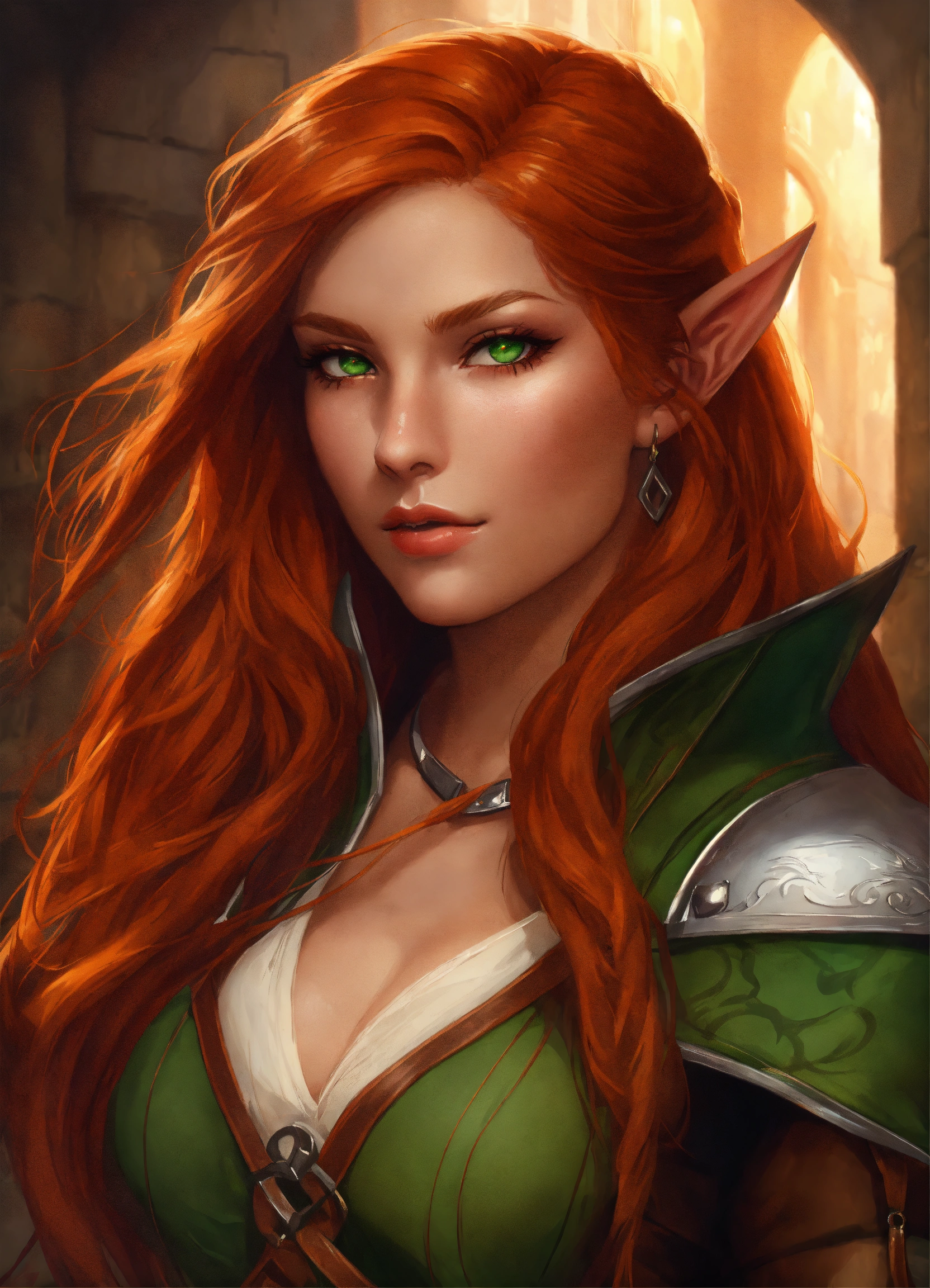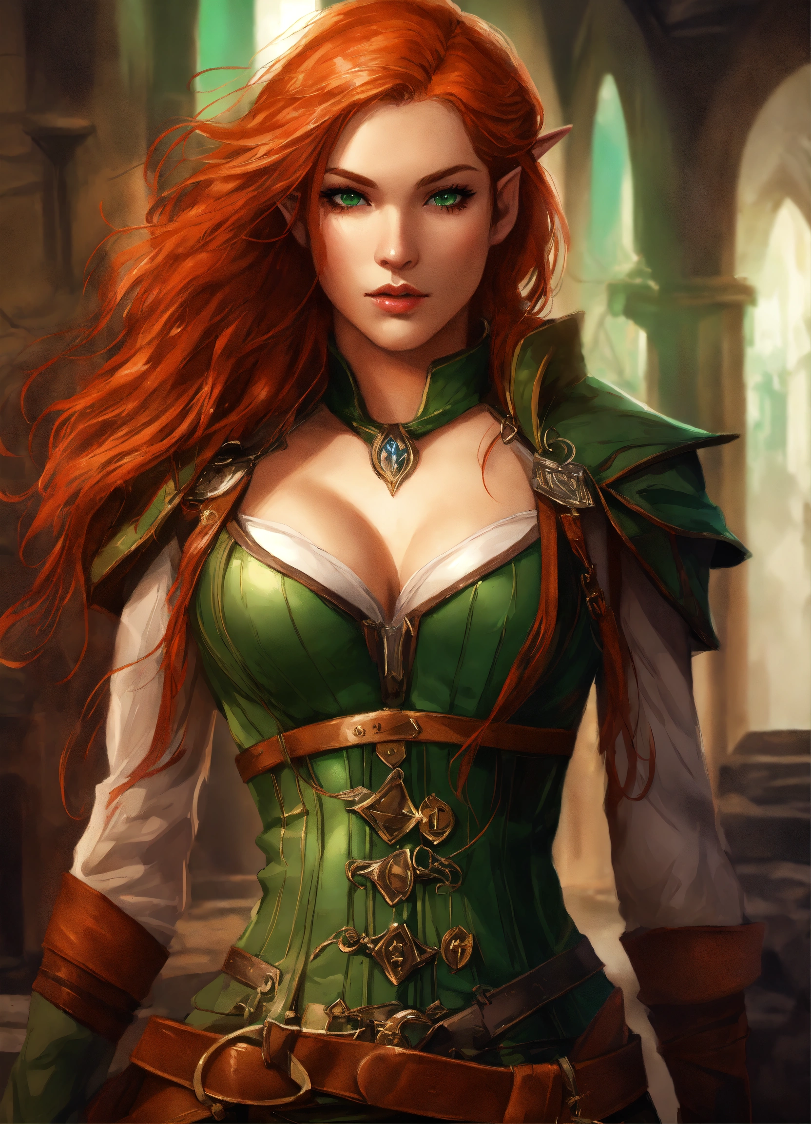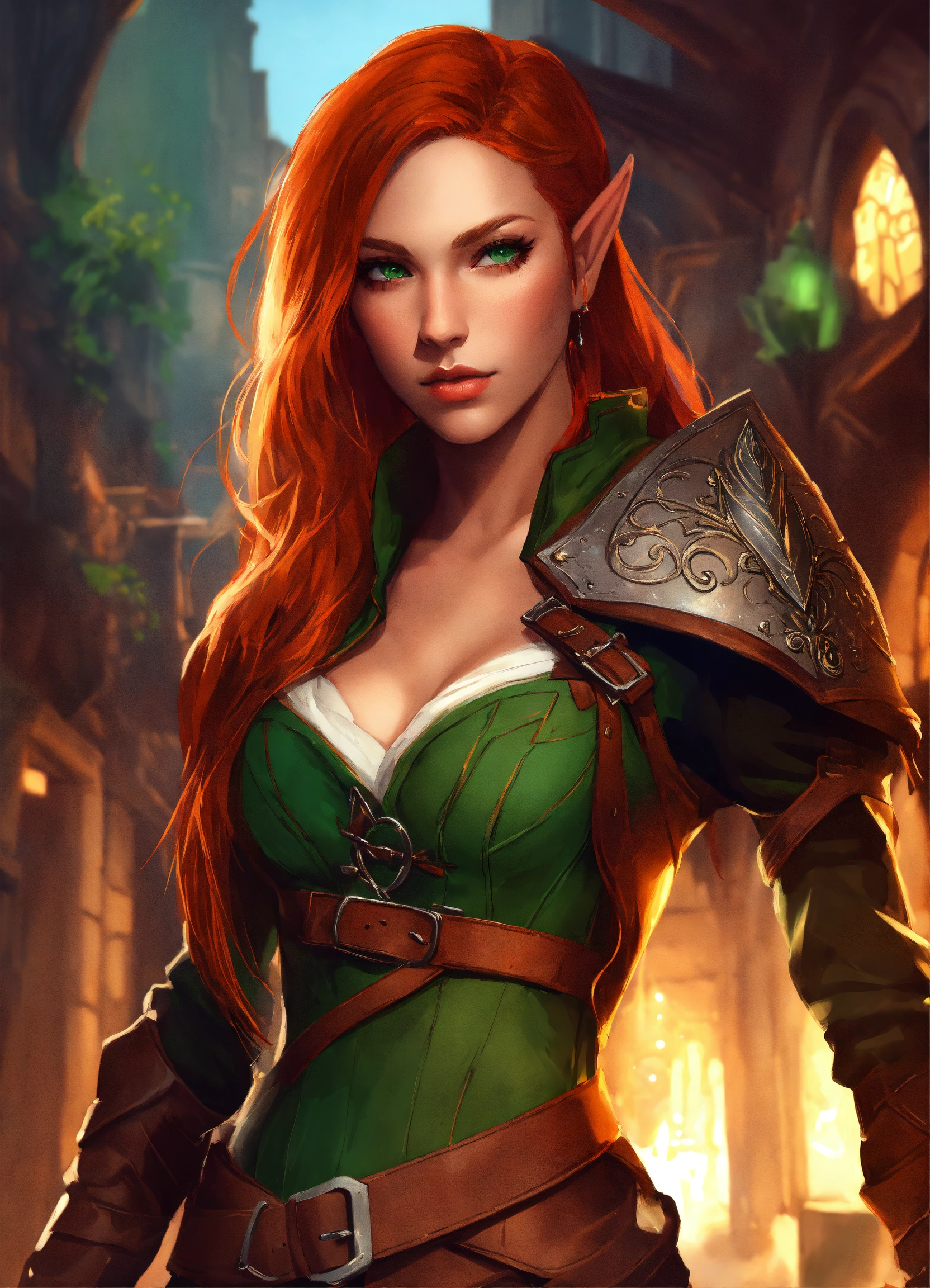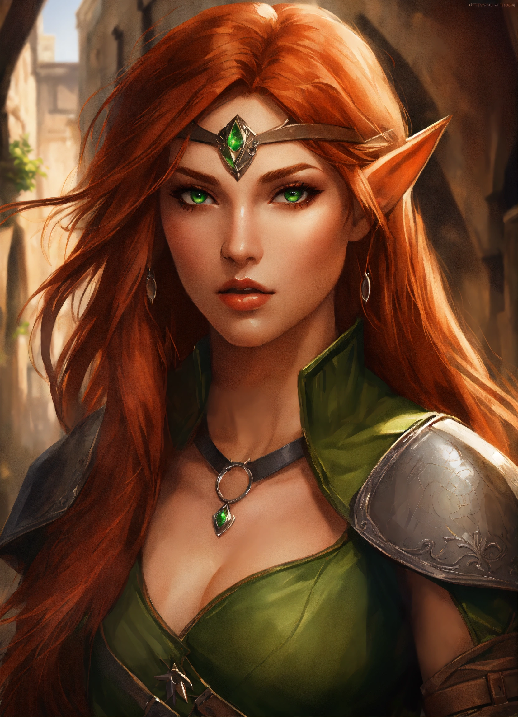 Portrait of a beautiful red haired elf rogue, long hair, concept art, dungeons and dragons, fantasy, in an alley, symmetrical face, attractive elf, green eyes, enchanting aura, digital art, wearing brown leather corset, assassin, medieval fantasy, art by artgerm, brown leathers, long elf ears, no shoulder guards