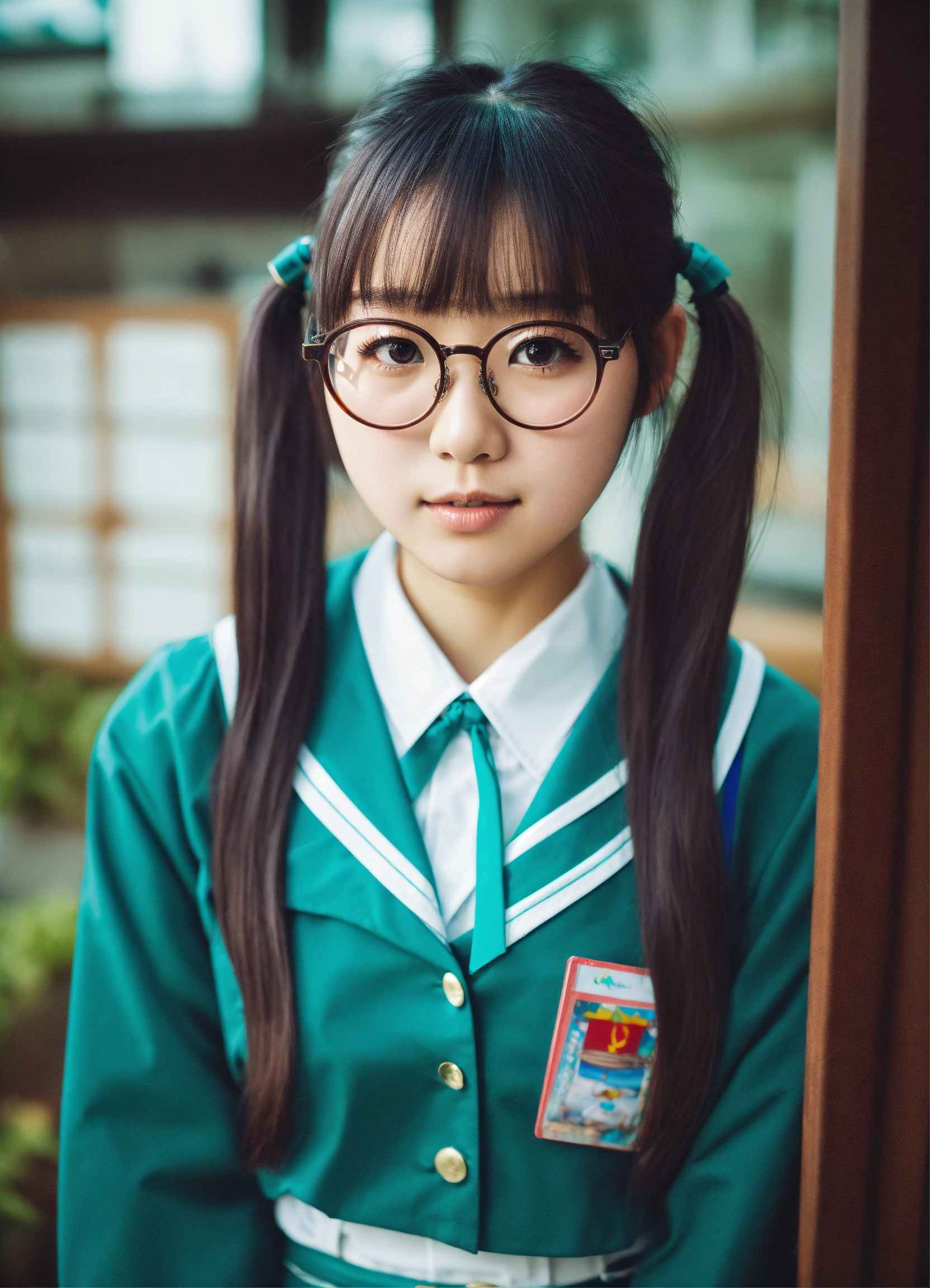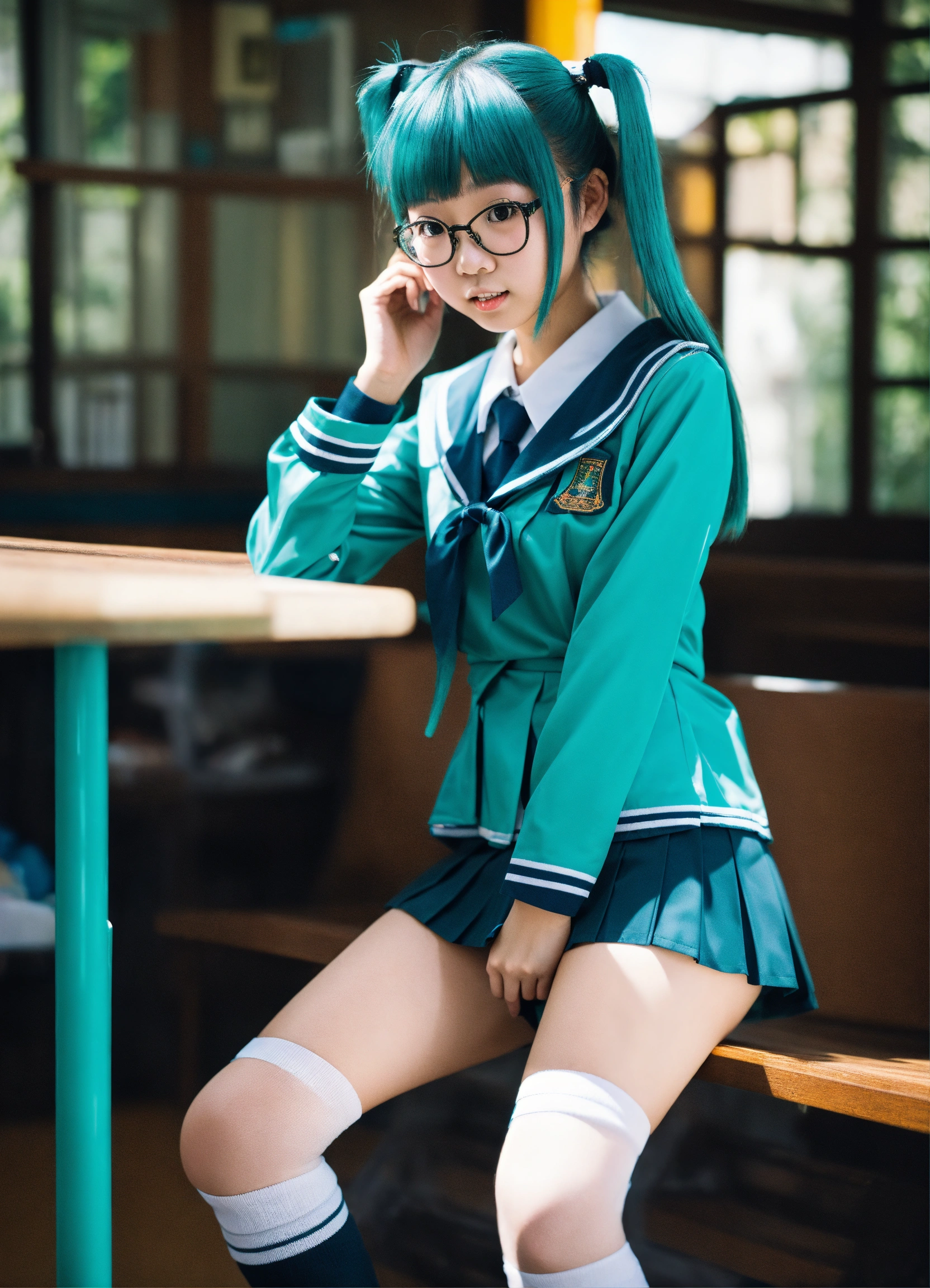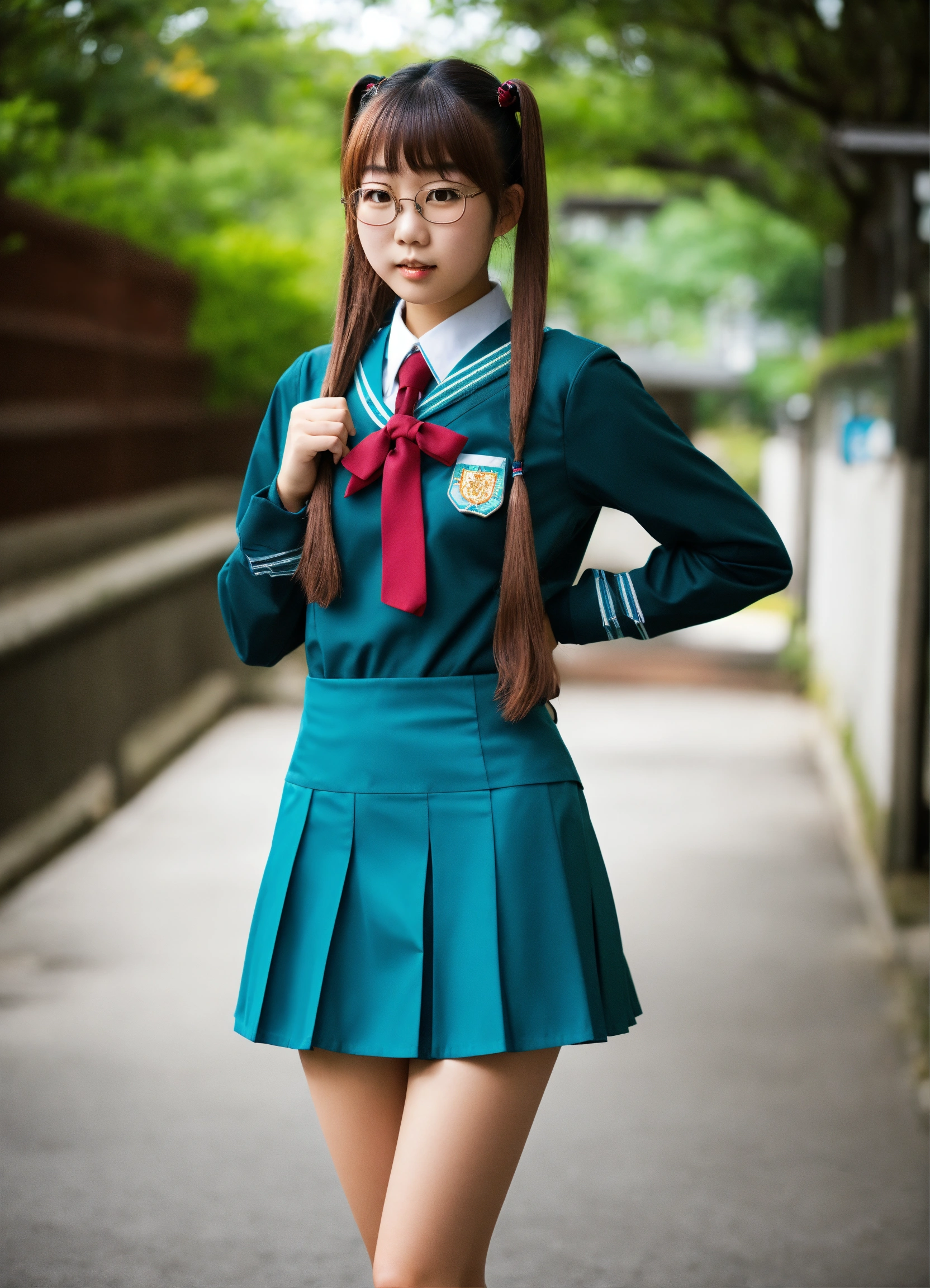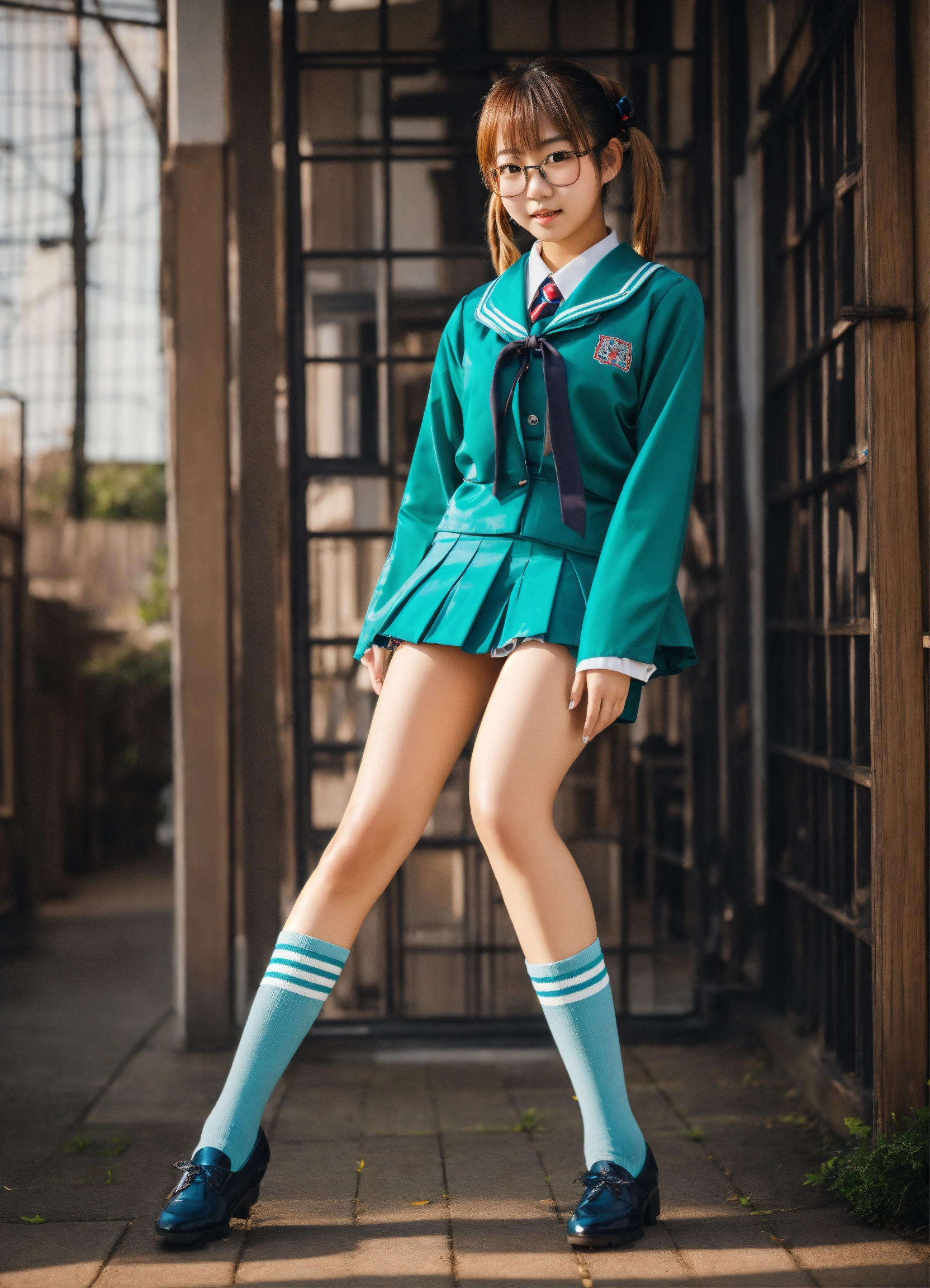 Japanese girl with twin tails and glasses in teal plastic school uniform with miniskirt
