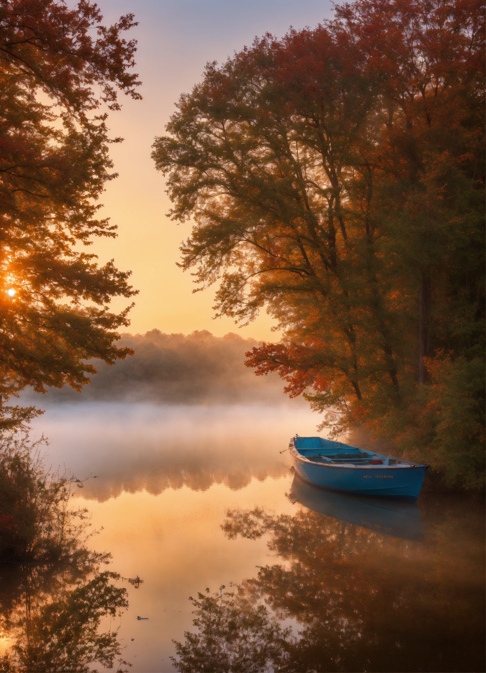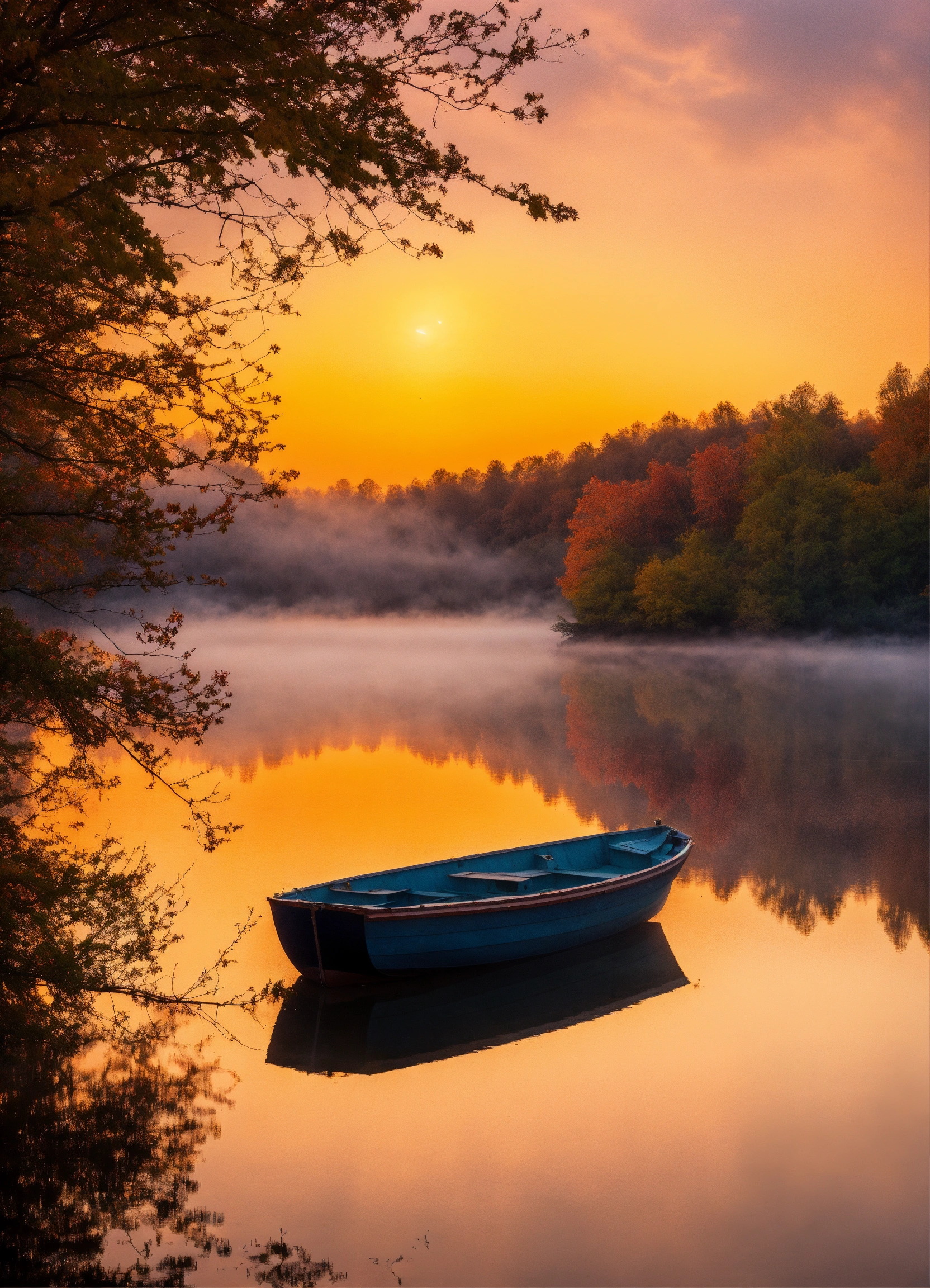 Sunrise on a foggy morning over a misty lake with a boat floating on it, in the middle of autumn, photography by alison brady, vibrant colors.