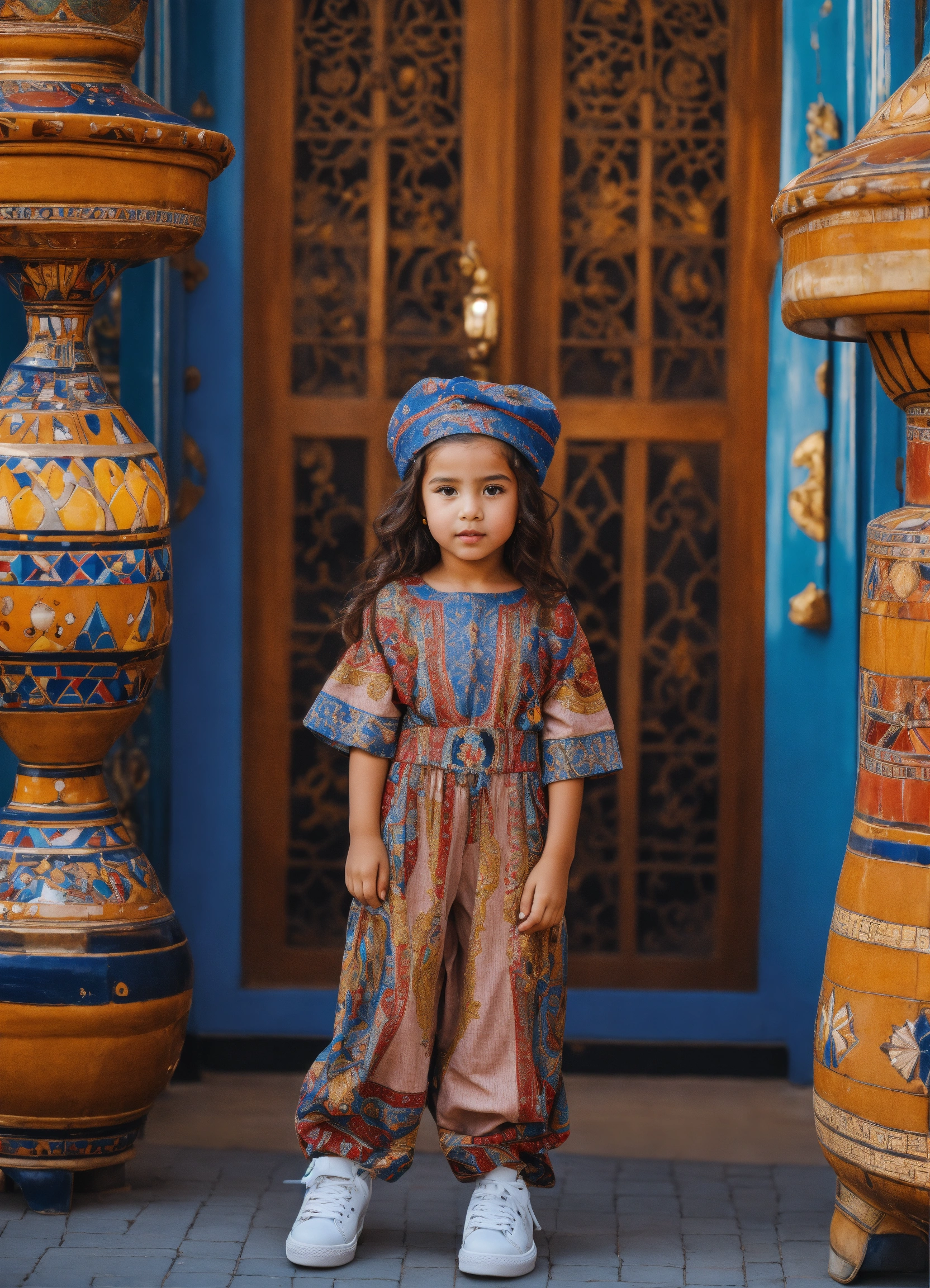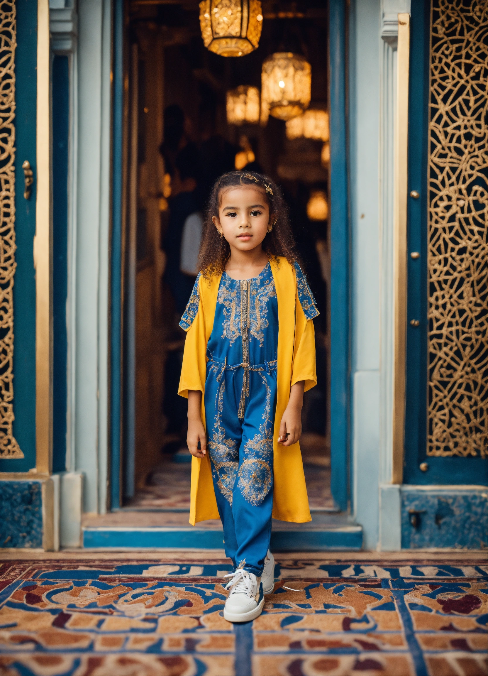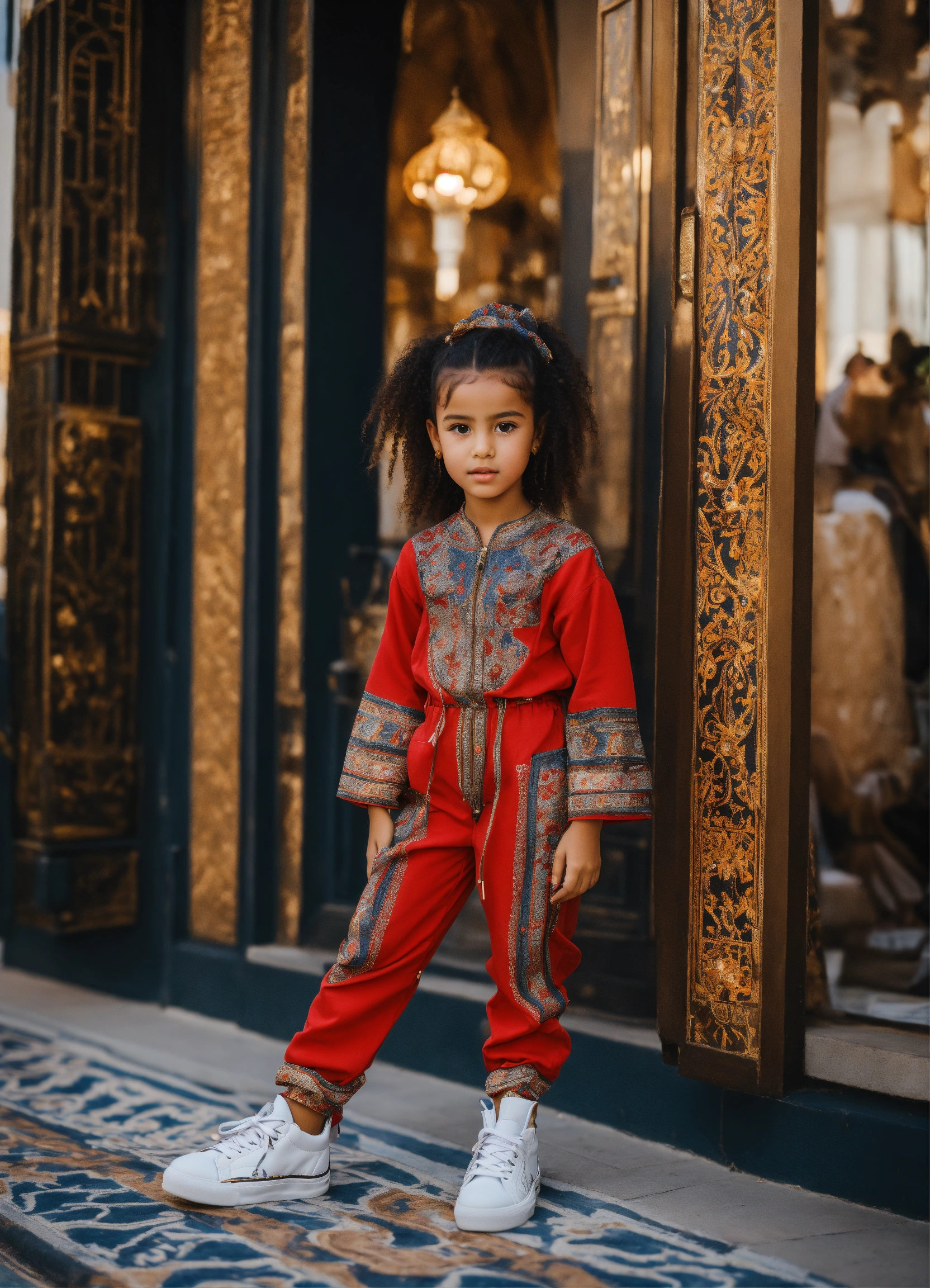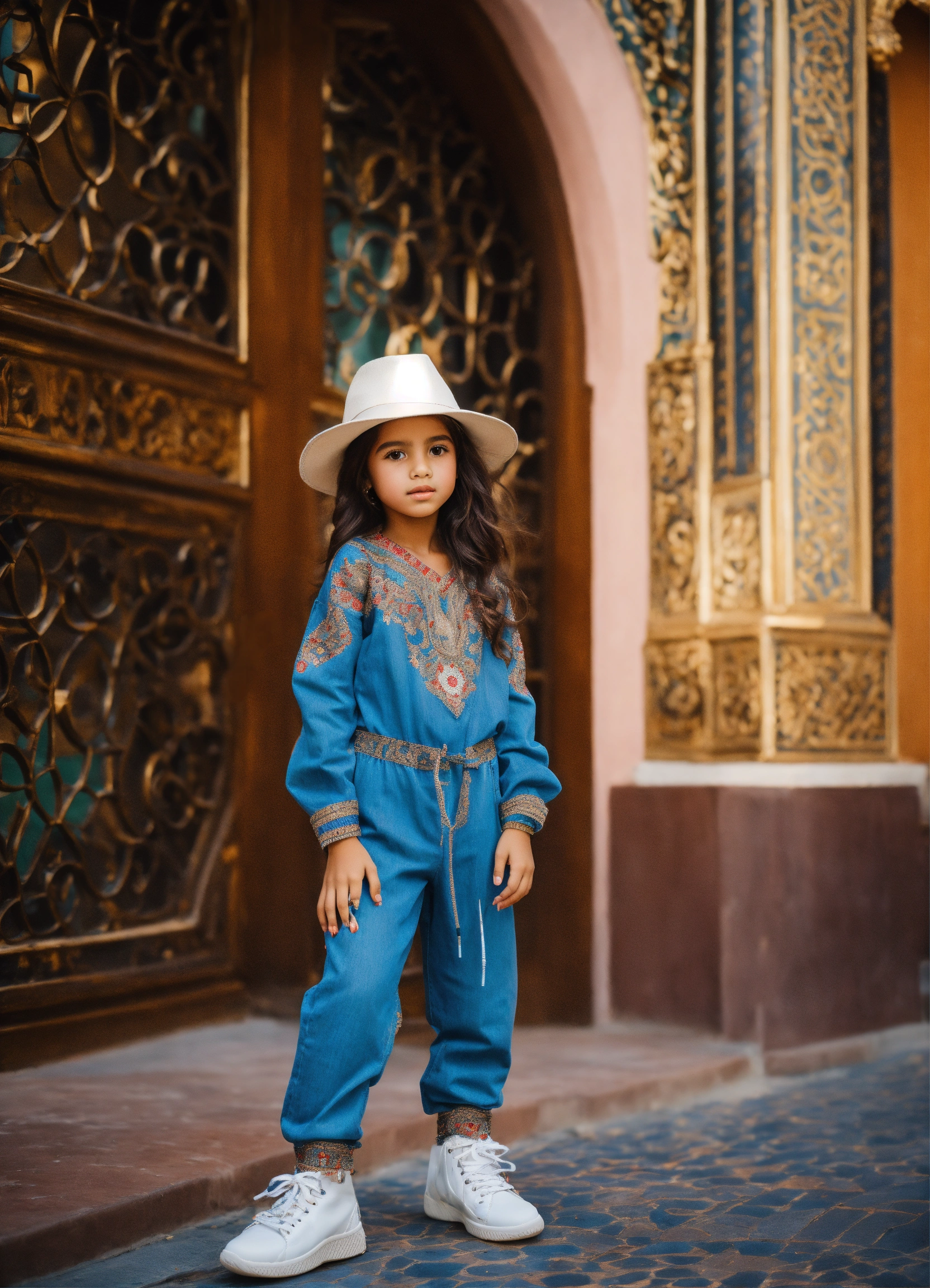 Beautiful little morrocan girl wearing jumpsuit jean's, morrocan style with luxury sneakers boots, haute couture, in front decor luxury place in city of europe