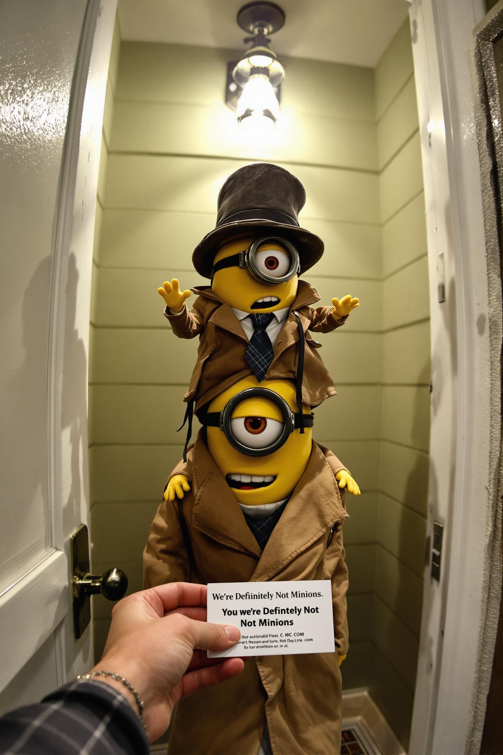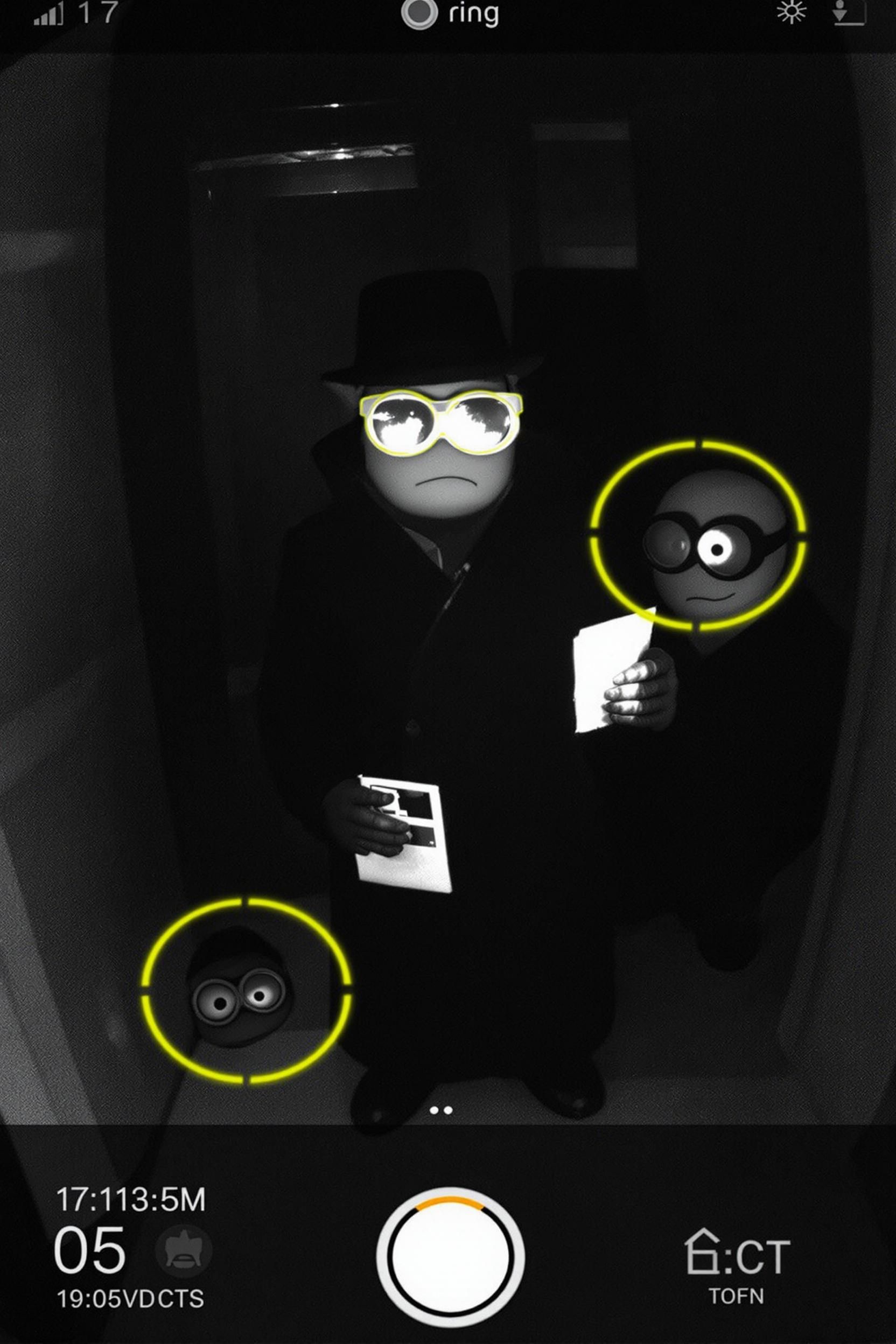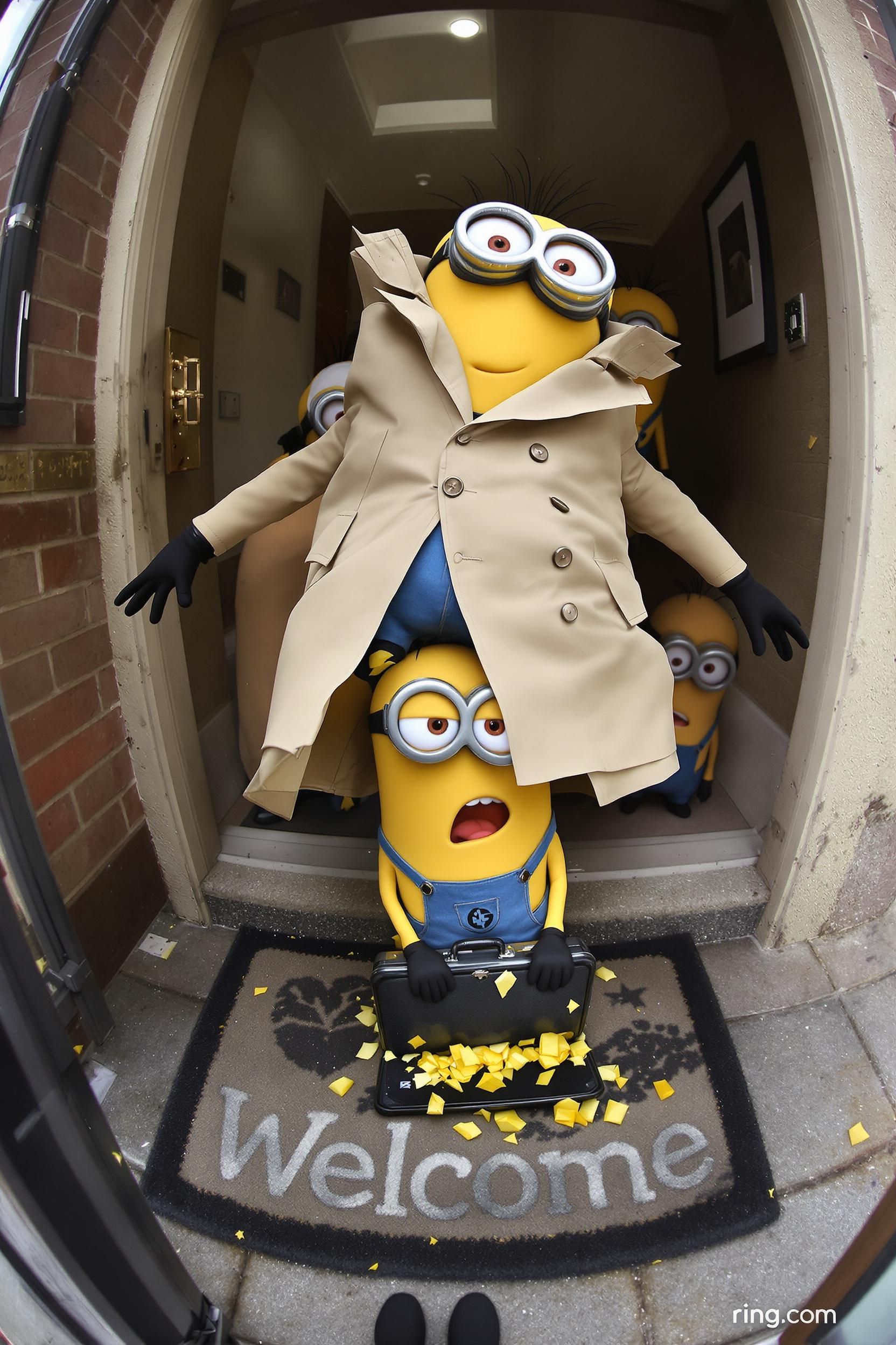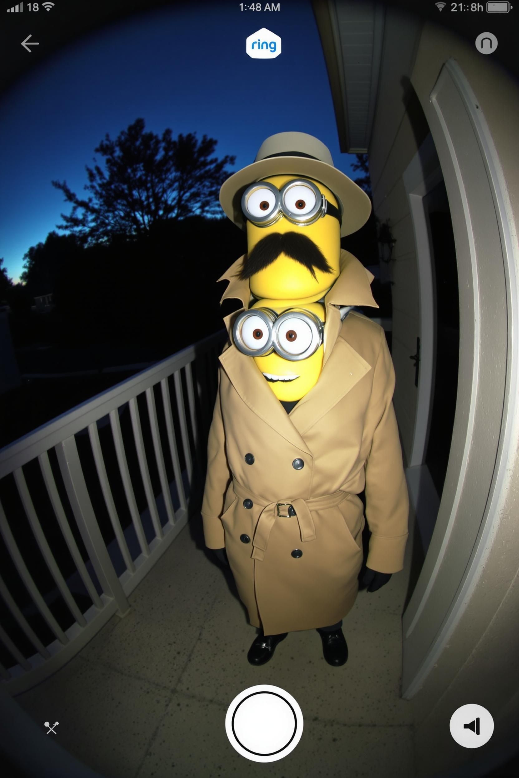 Ring doorbell video of three minions in trench coat attempting to pose as one adult human