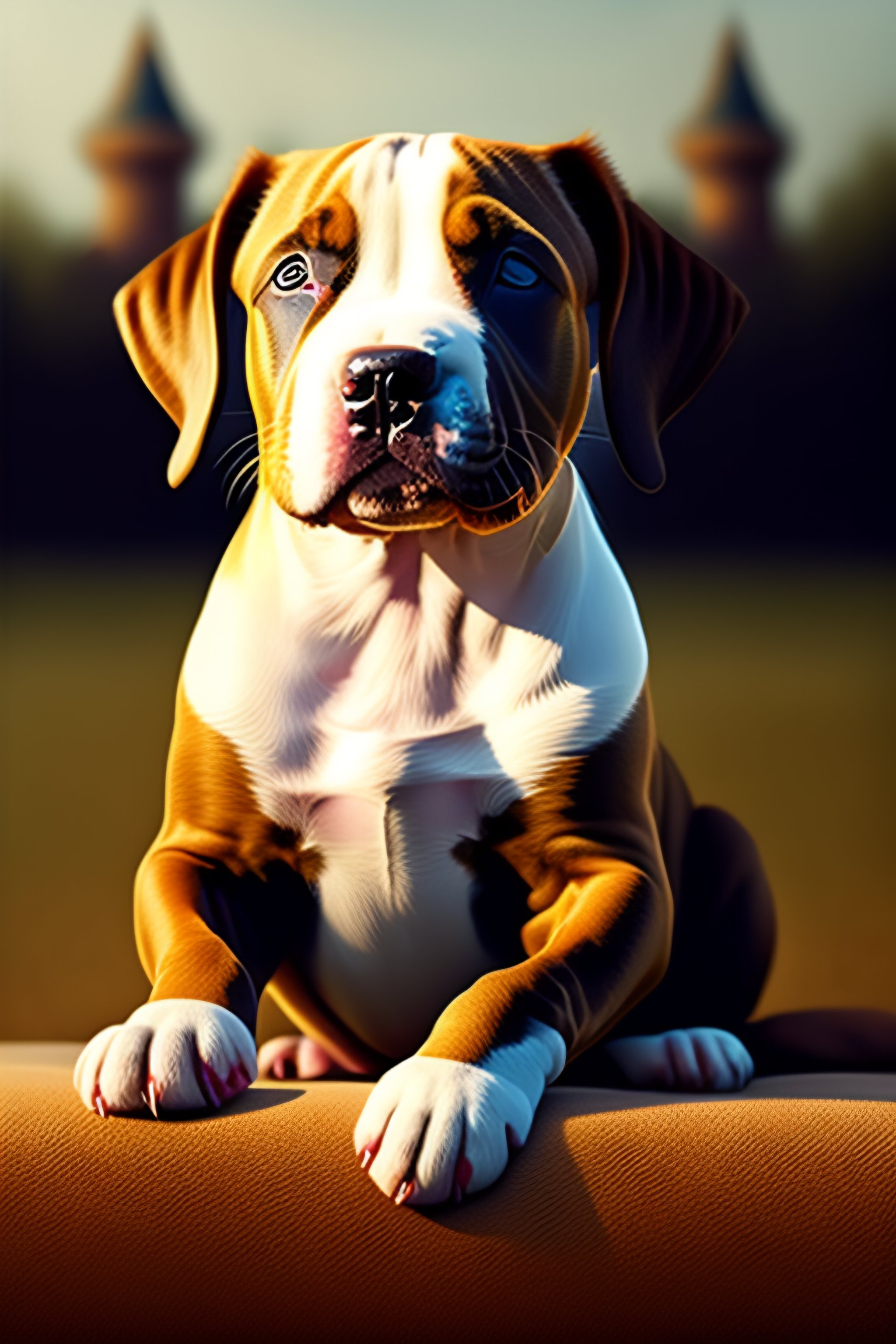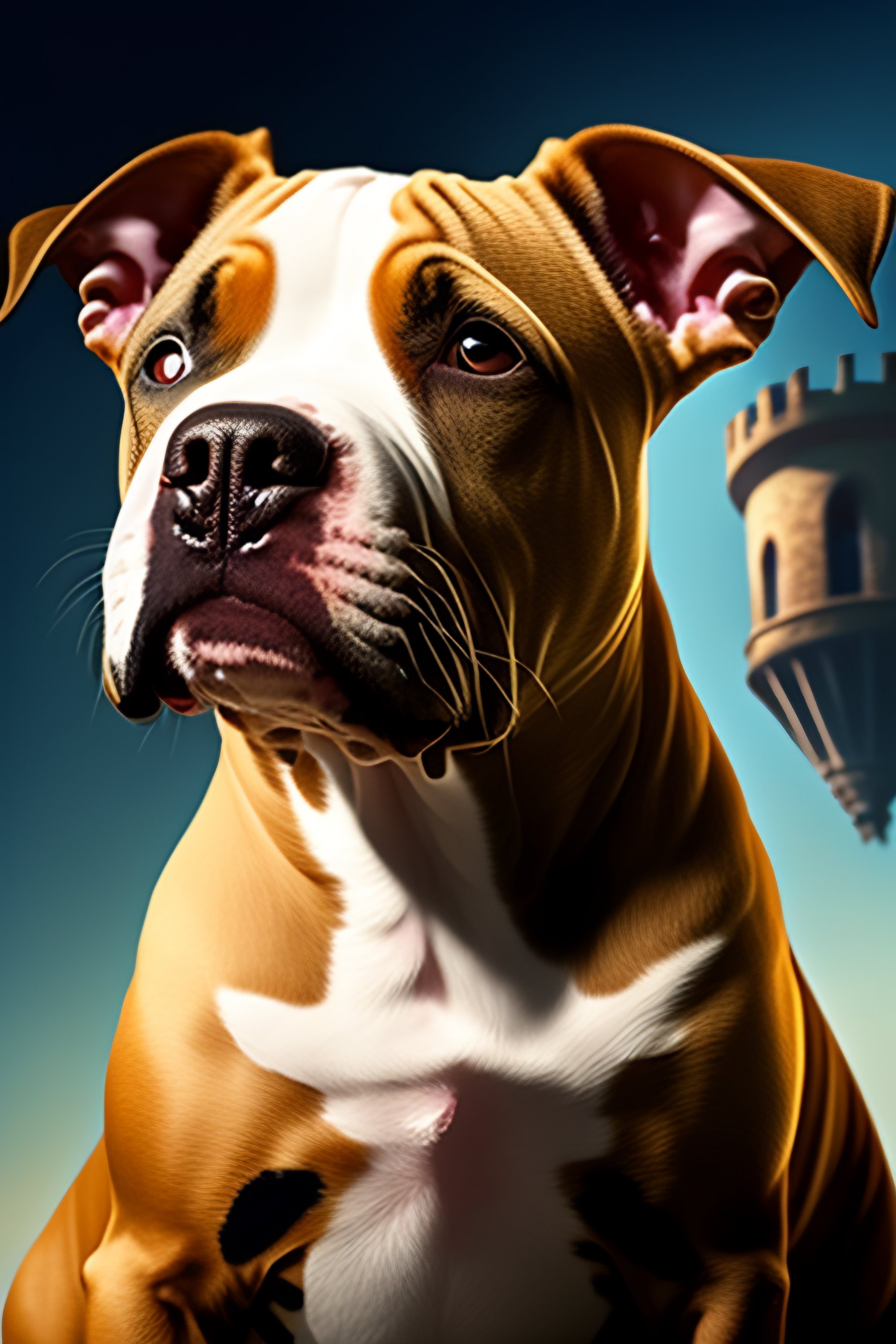 Pit bull puppy is sleeping with a butterfly on his nose, pit bull puppy is in front of a castle at night