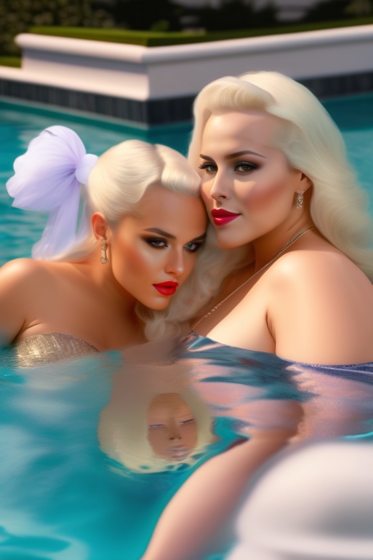 A photo of christina aguilera and mercedes carrera b b w lencería transparente pawg having a trío with marilyn monroe in the pool, photo from behind