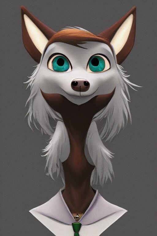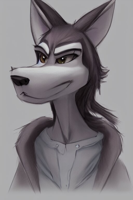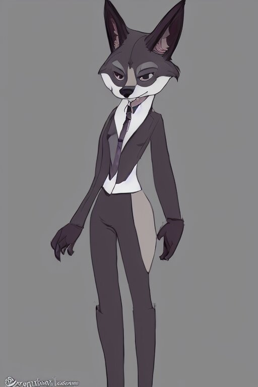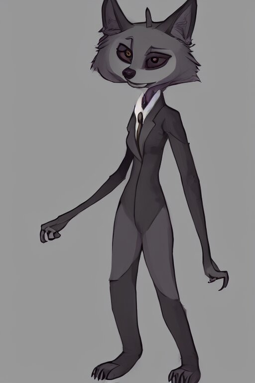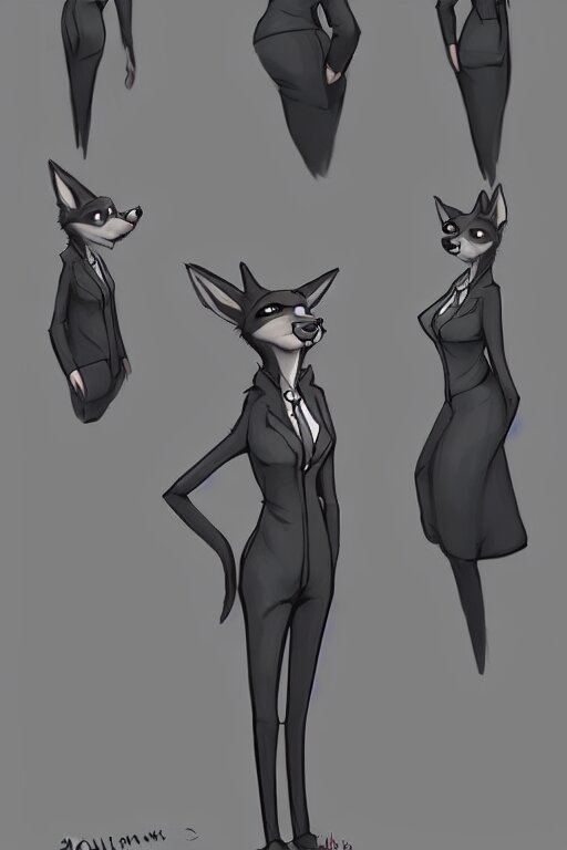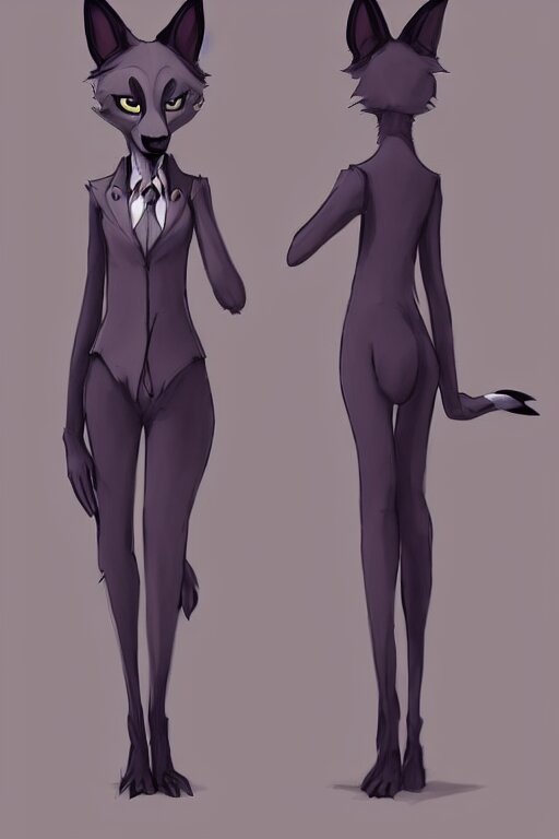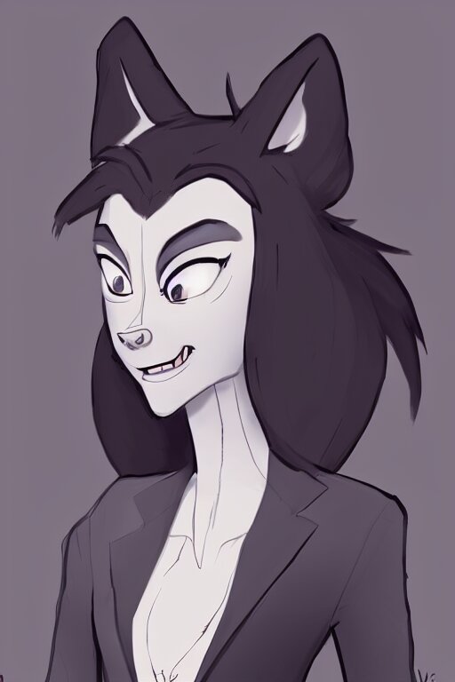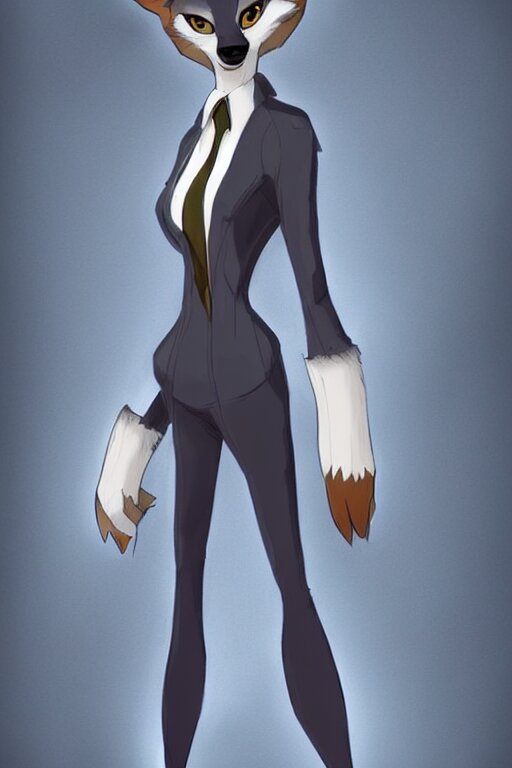 Concept art of anthromorphic female wolf, in style of cory loftis, female fursona, furry, furaffinity, 4 k, deviantart, furry art, fursona art, wearing black business suit, business suit, in style of zootopia, wolf fursona, cyberpunk, female, very expressive detailed feminine face