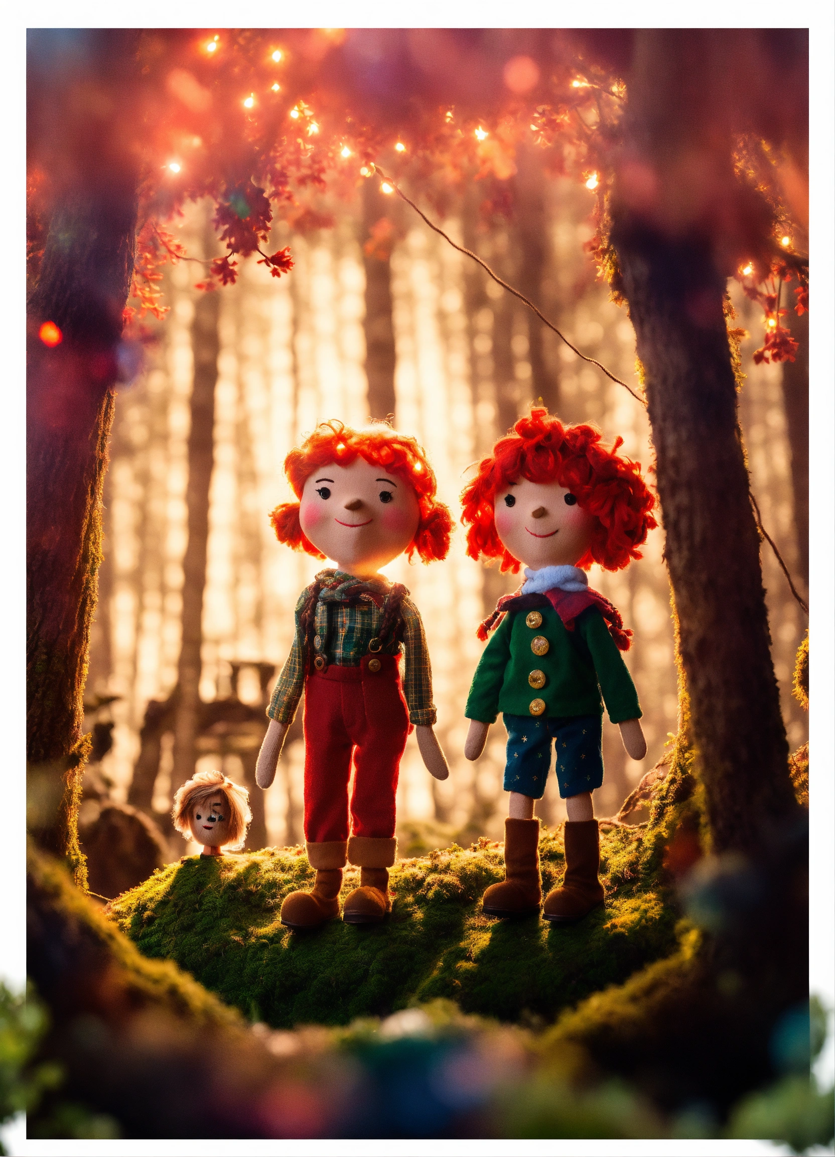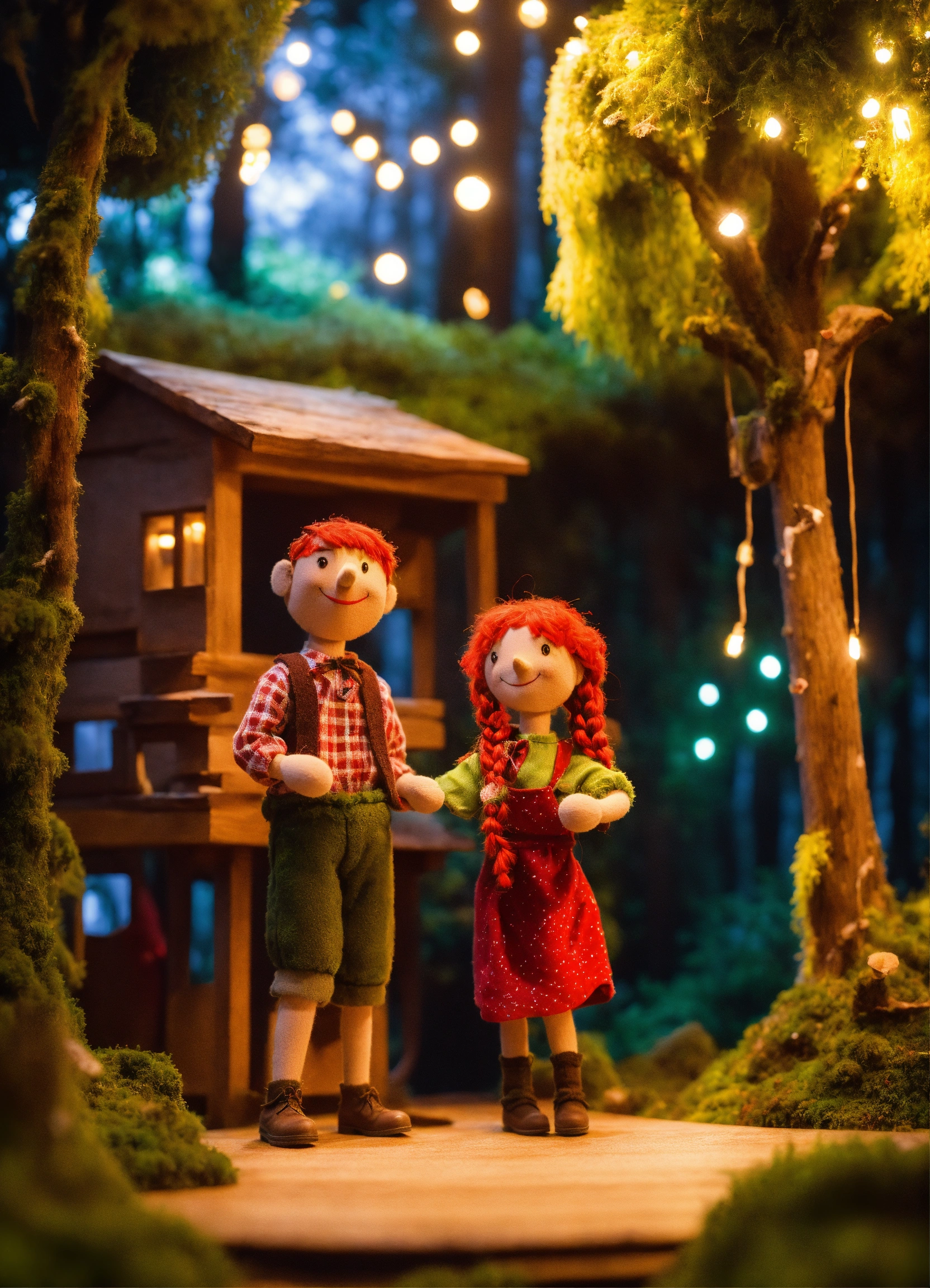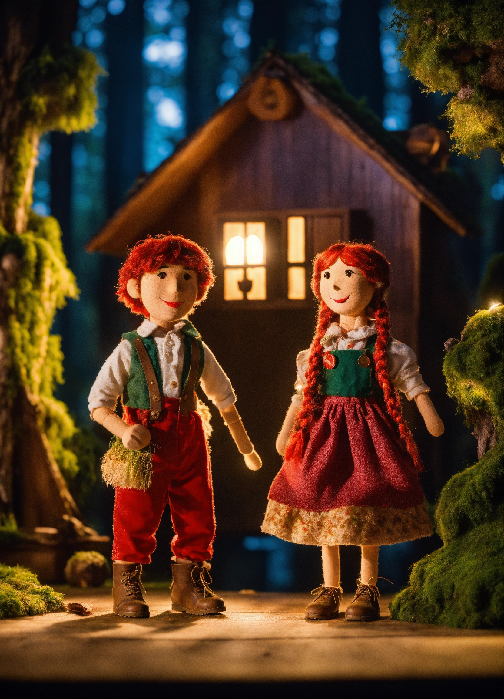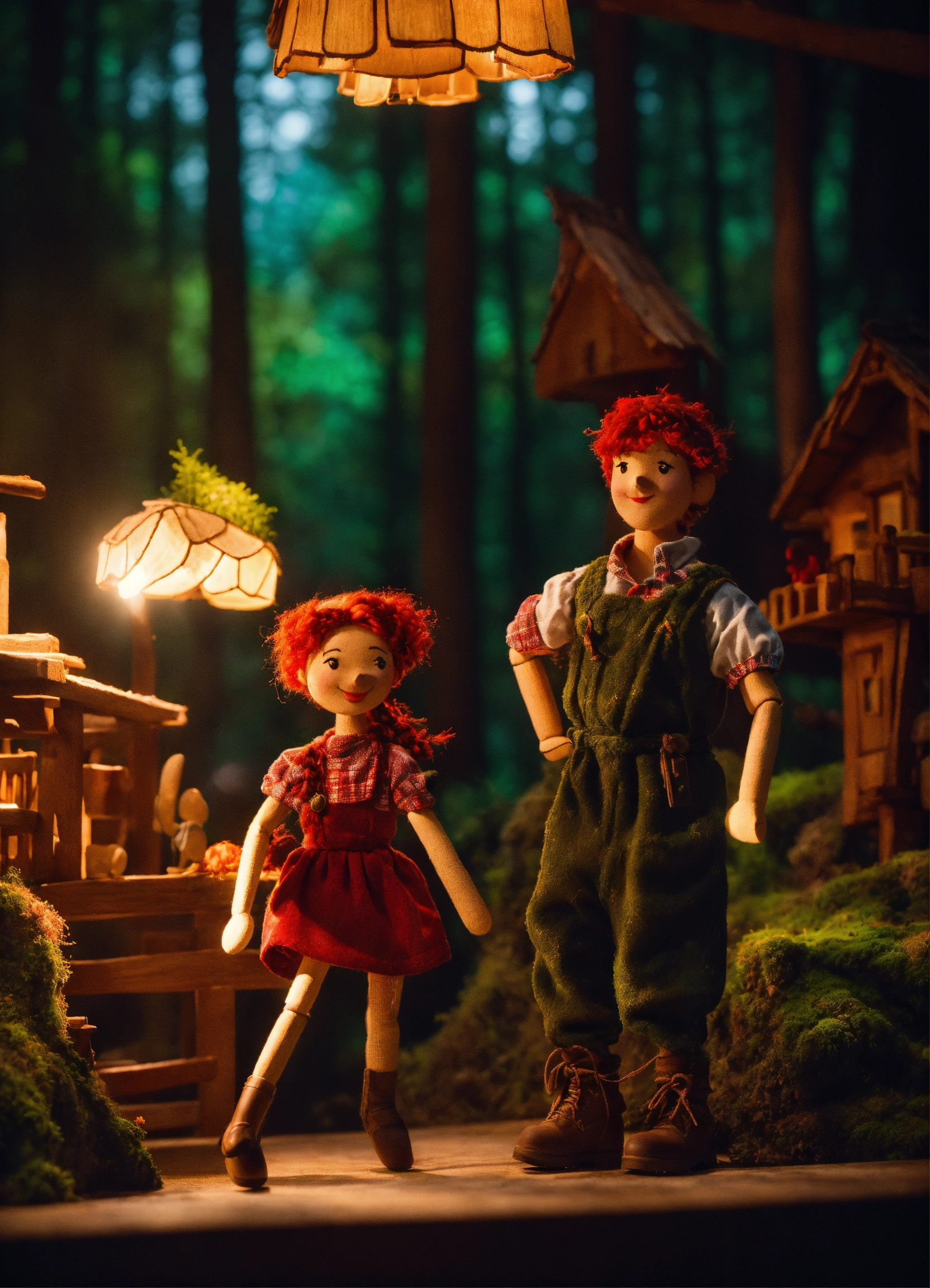 Two wooden puppets, a dark-haired boy, a red-haired girl with braids, happy, dressed in steiner style fabric, on a theater stage with a beautiful light, surrounded by a forest. a lumberjack's house in the distance. they are the same sizea beautiful light theater stage cinematic lighting, ultra 4k hd, illuminated by irridescent moss and fungi
