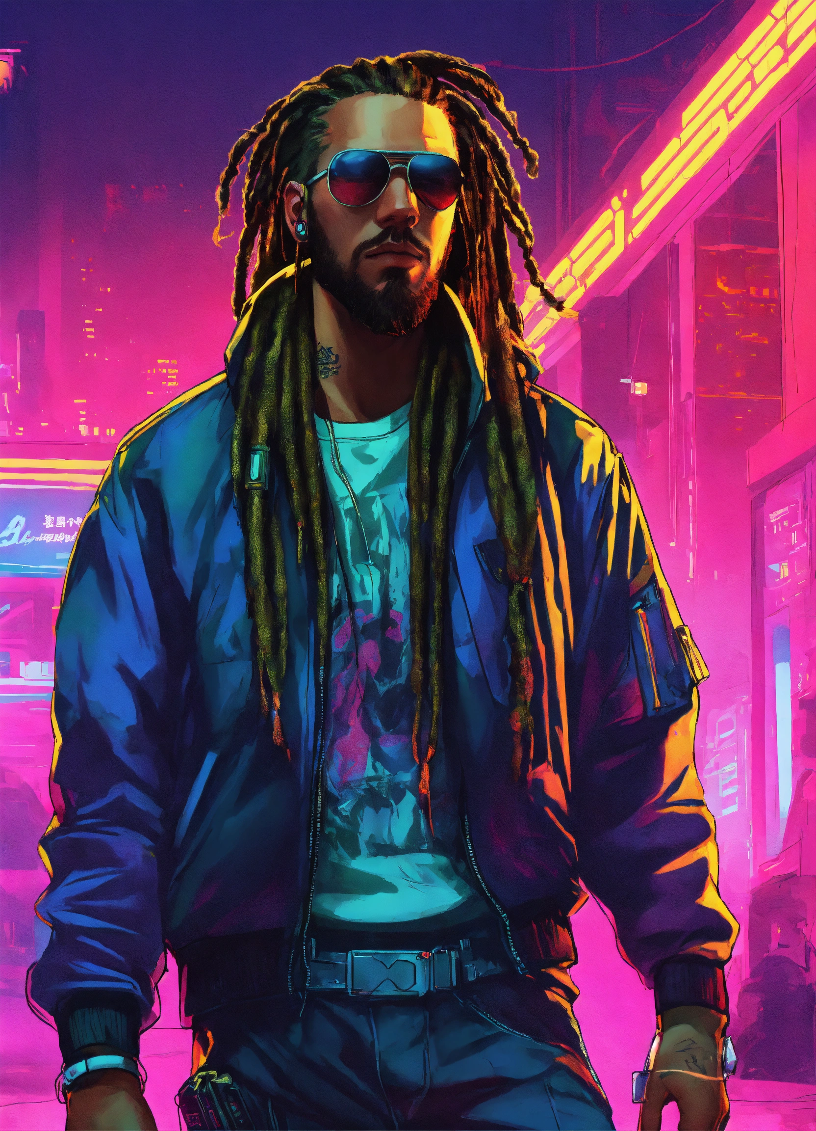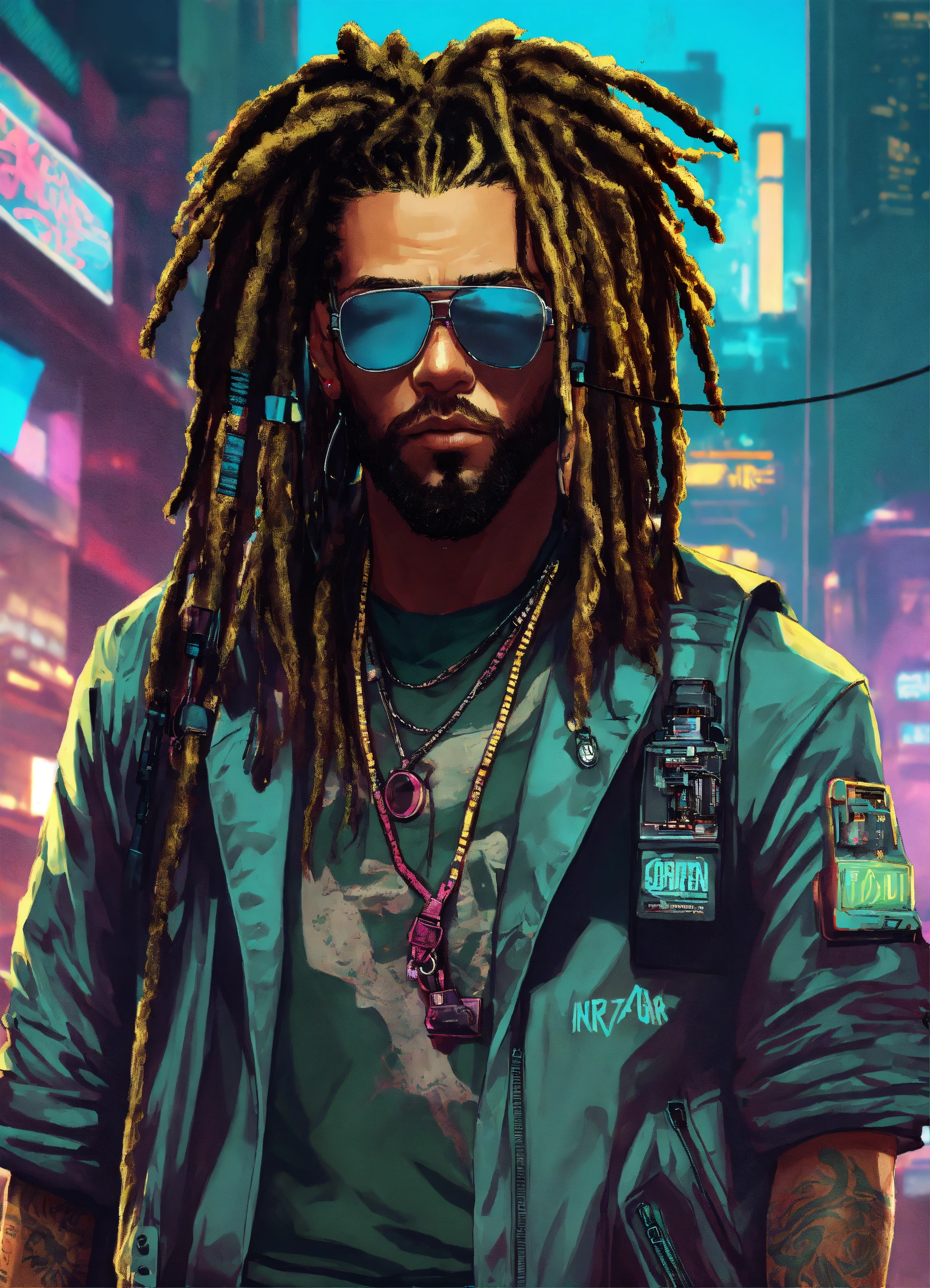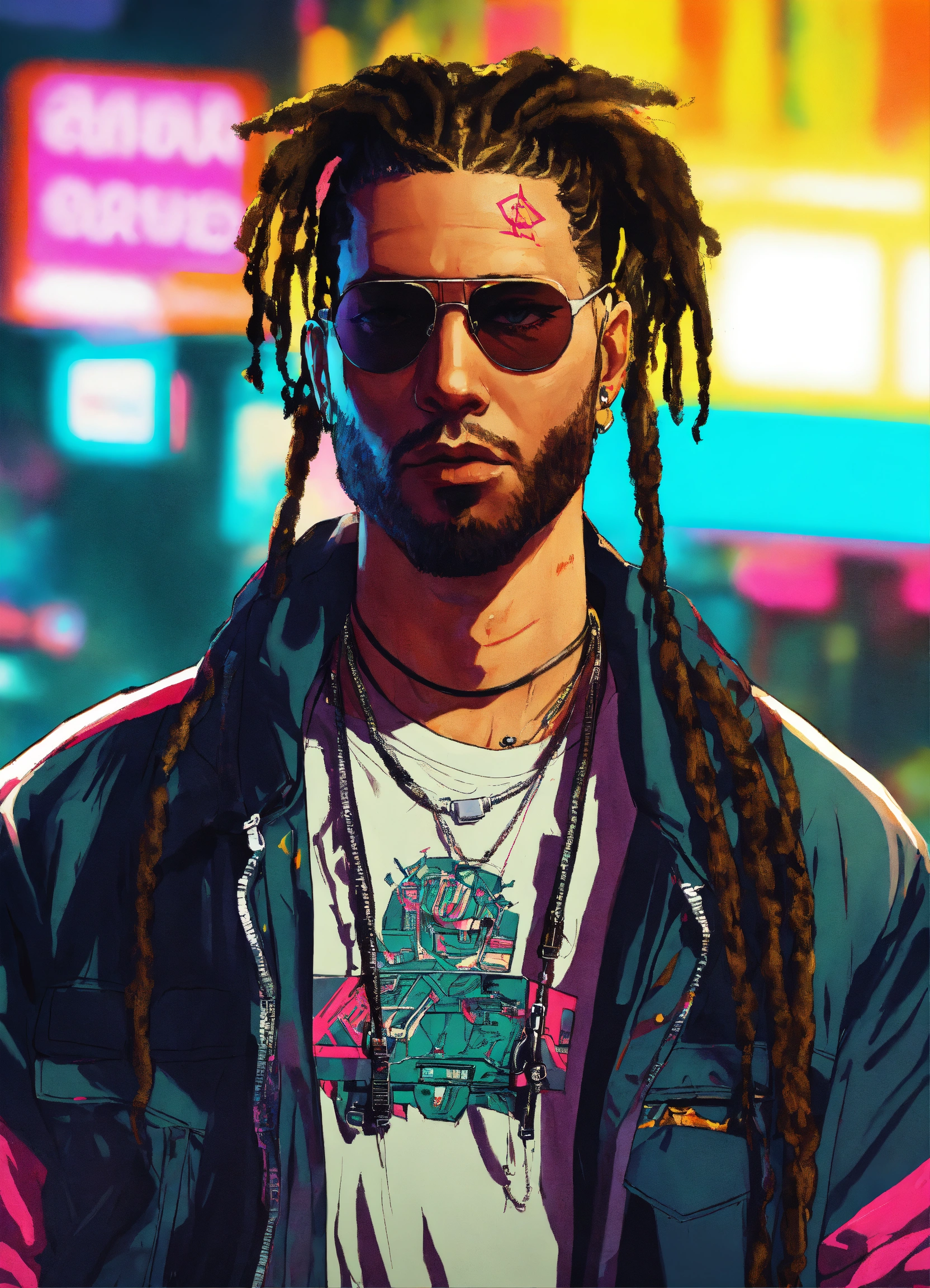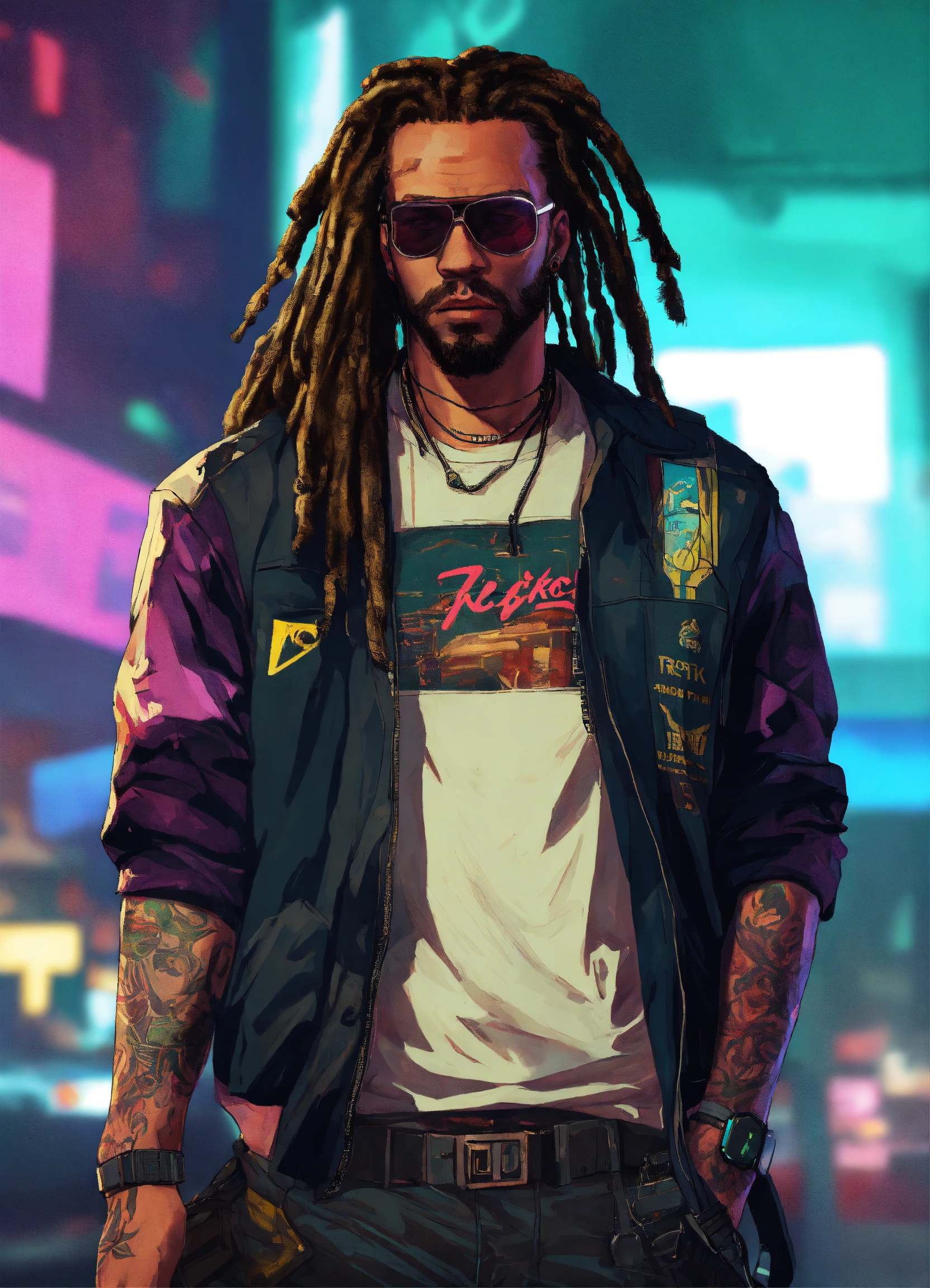 Cyberpunk white man with dreadlocks cyberpunk gang member gta poster style art