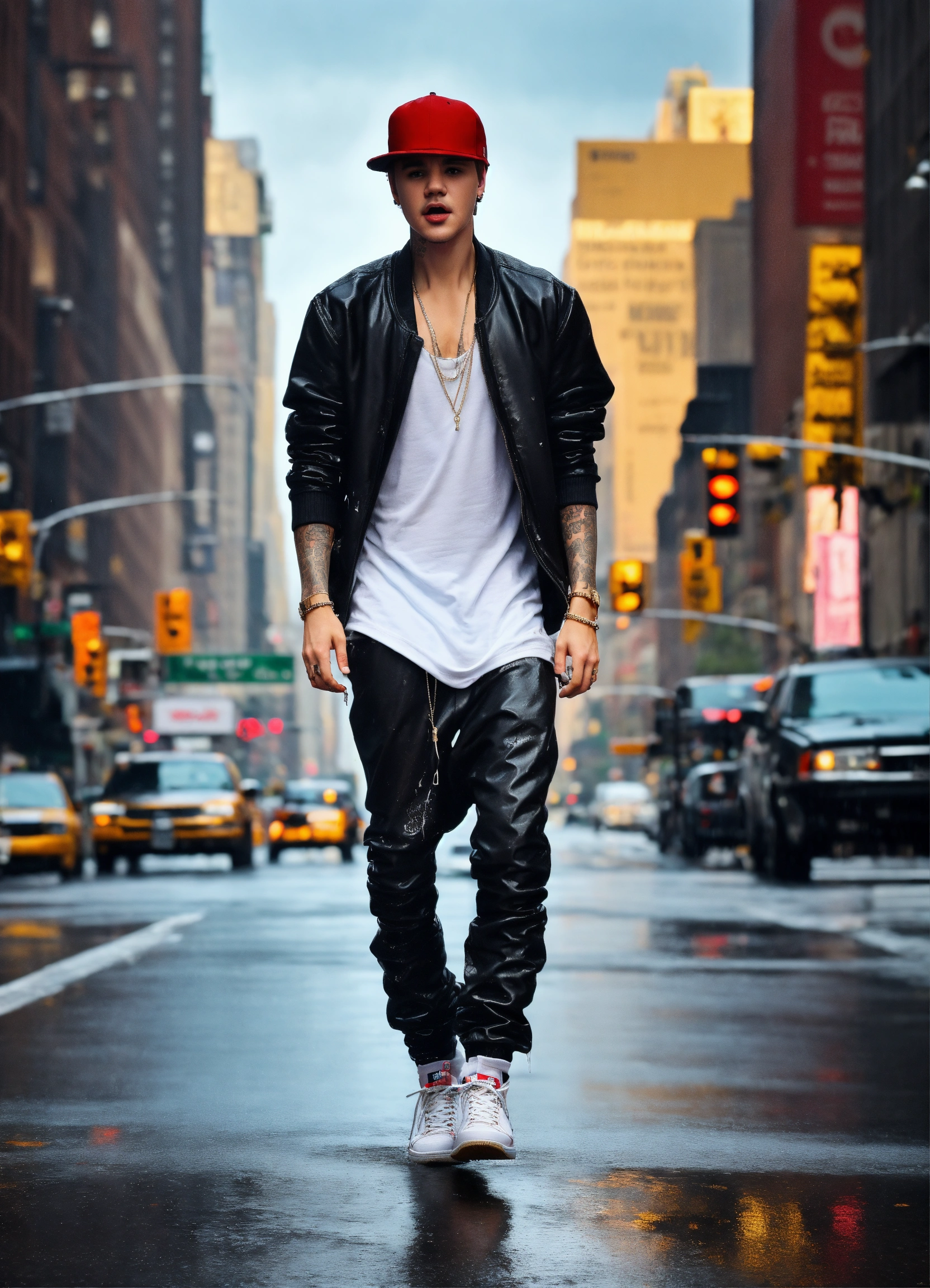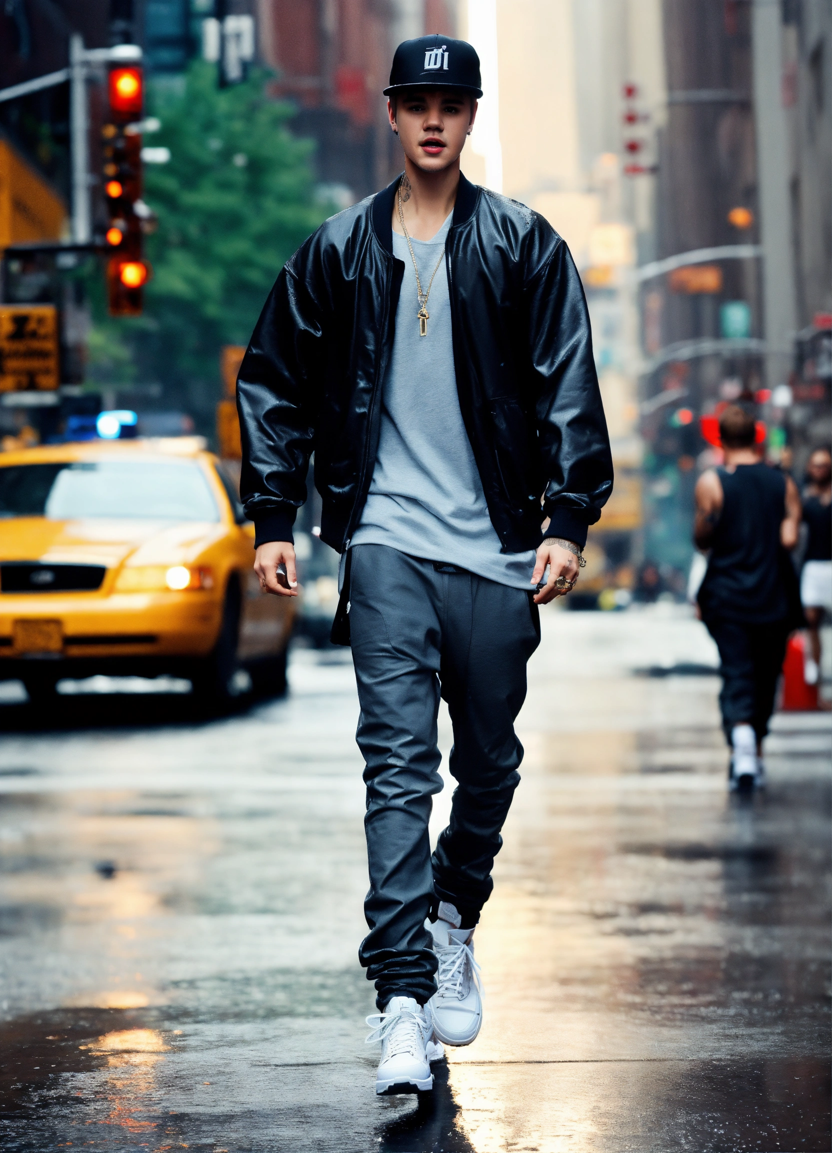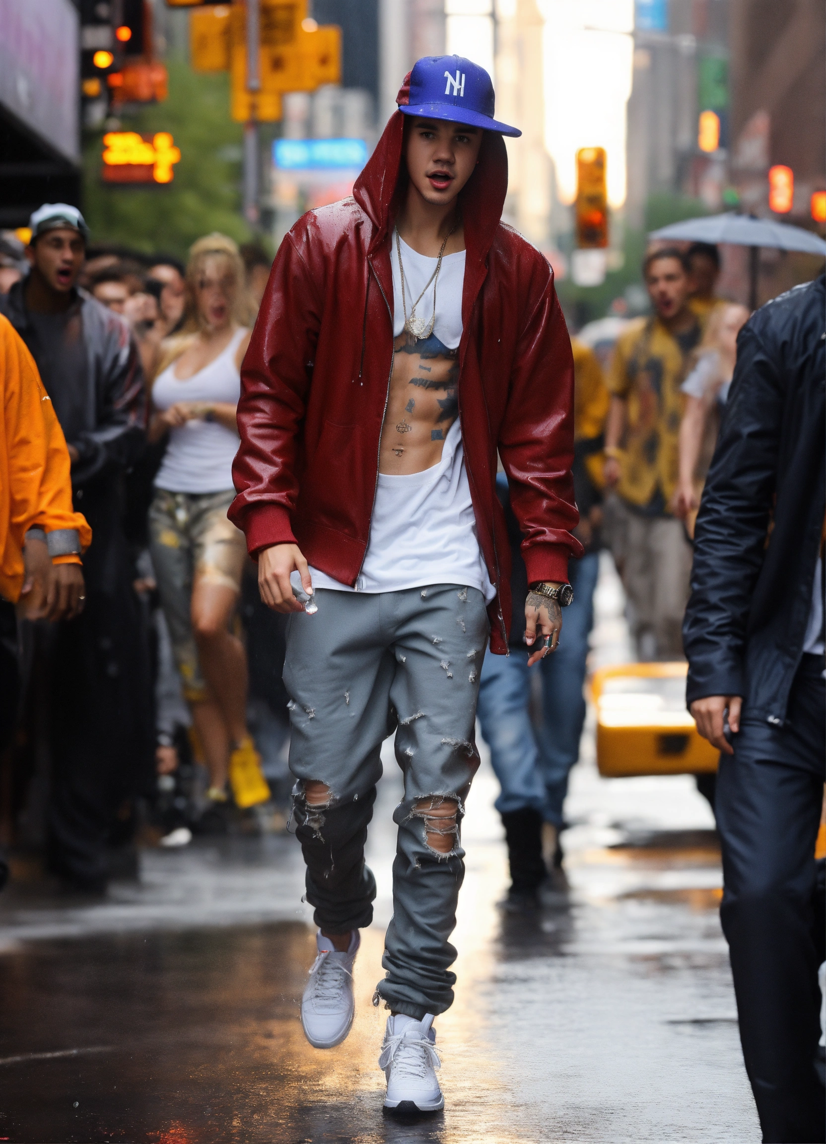 Create amazing realistic life-like photos of bieber walking on a street in new york, sagging pants, toned physique, drenched in sweat, pouring rain, backwards hat, arrogant, swagger, screaming fans