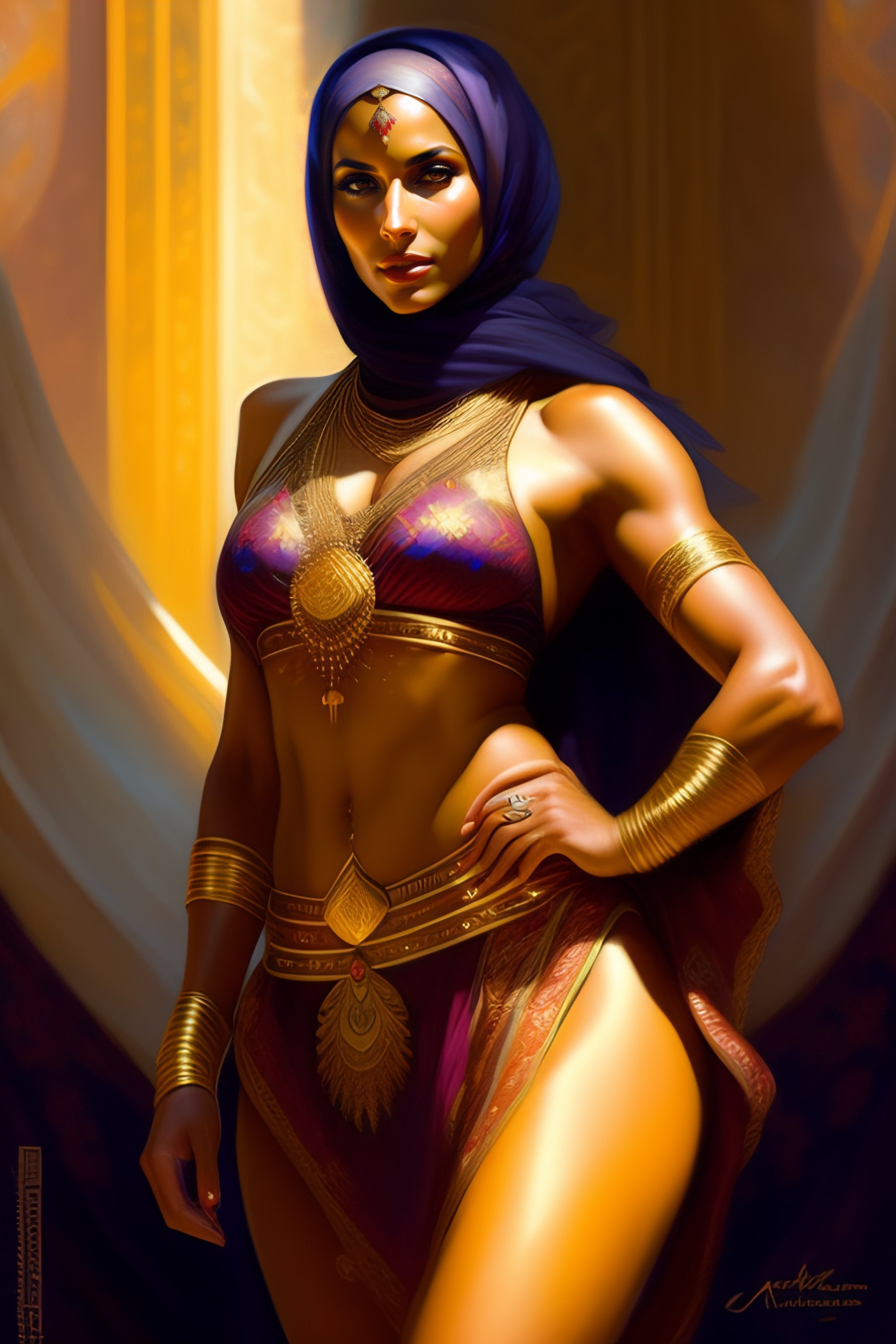 Muscular muslim hijabi woman doing belly dance having tight cul art by greg rutkowski and alphonse mucha