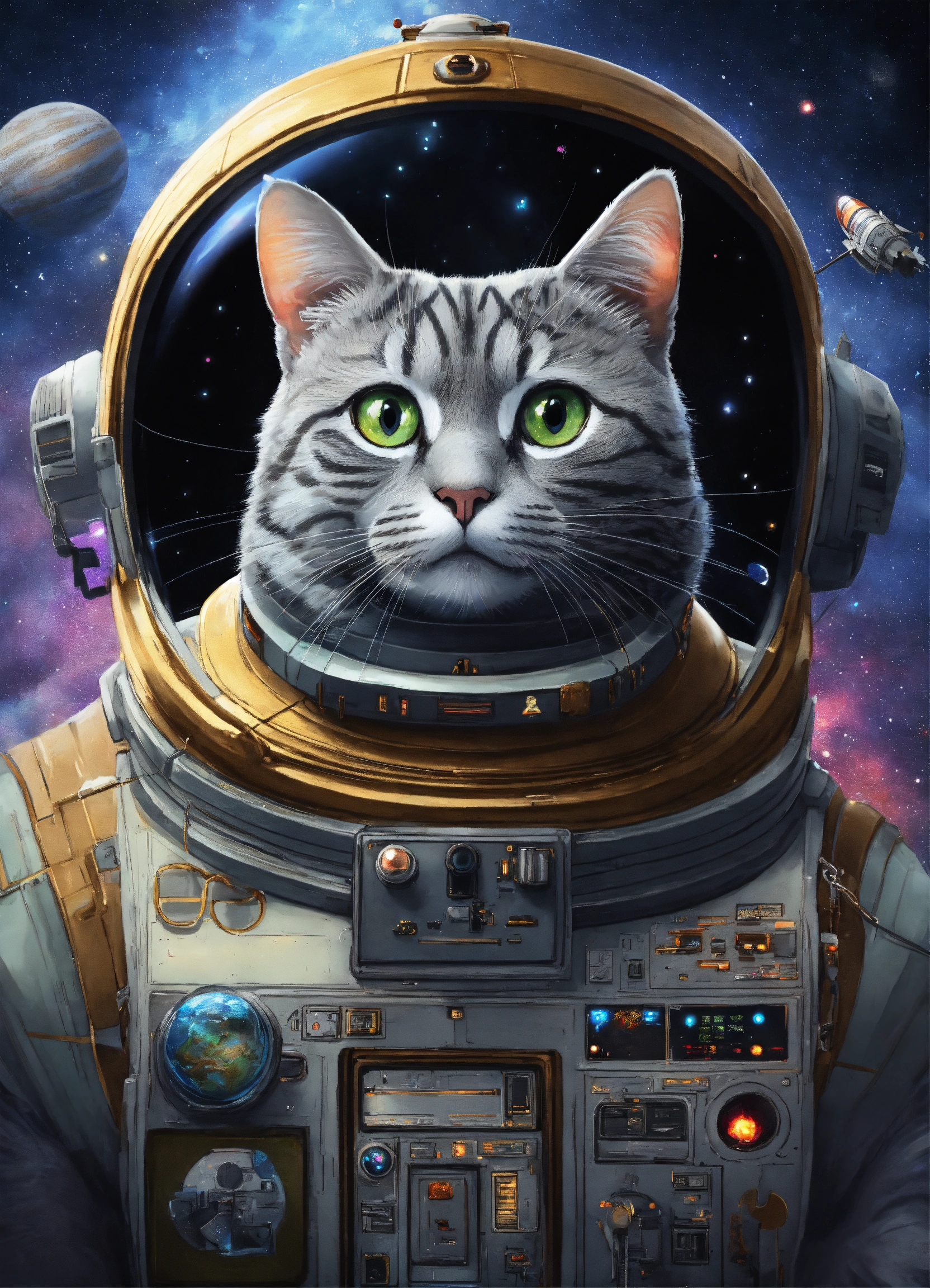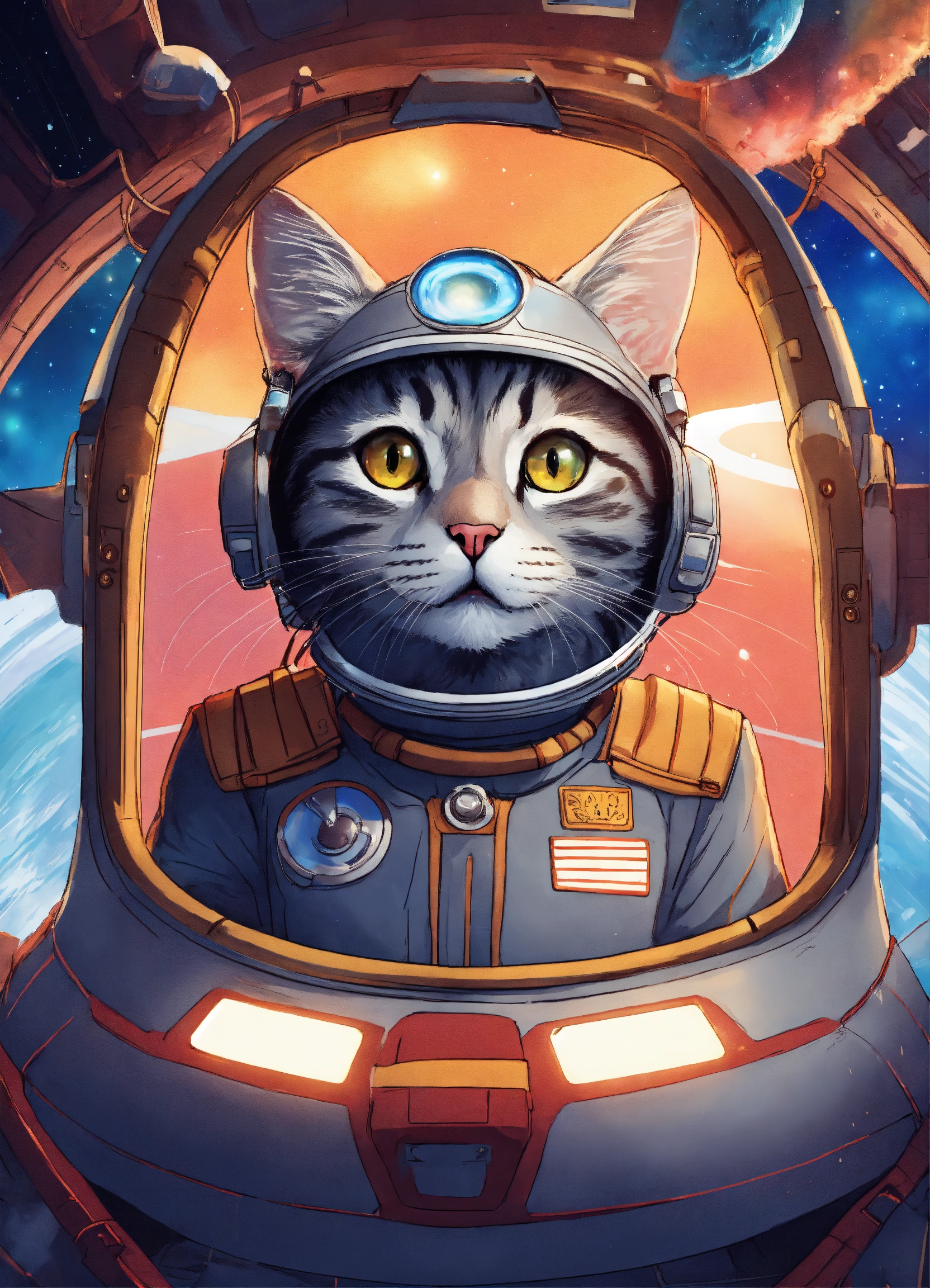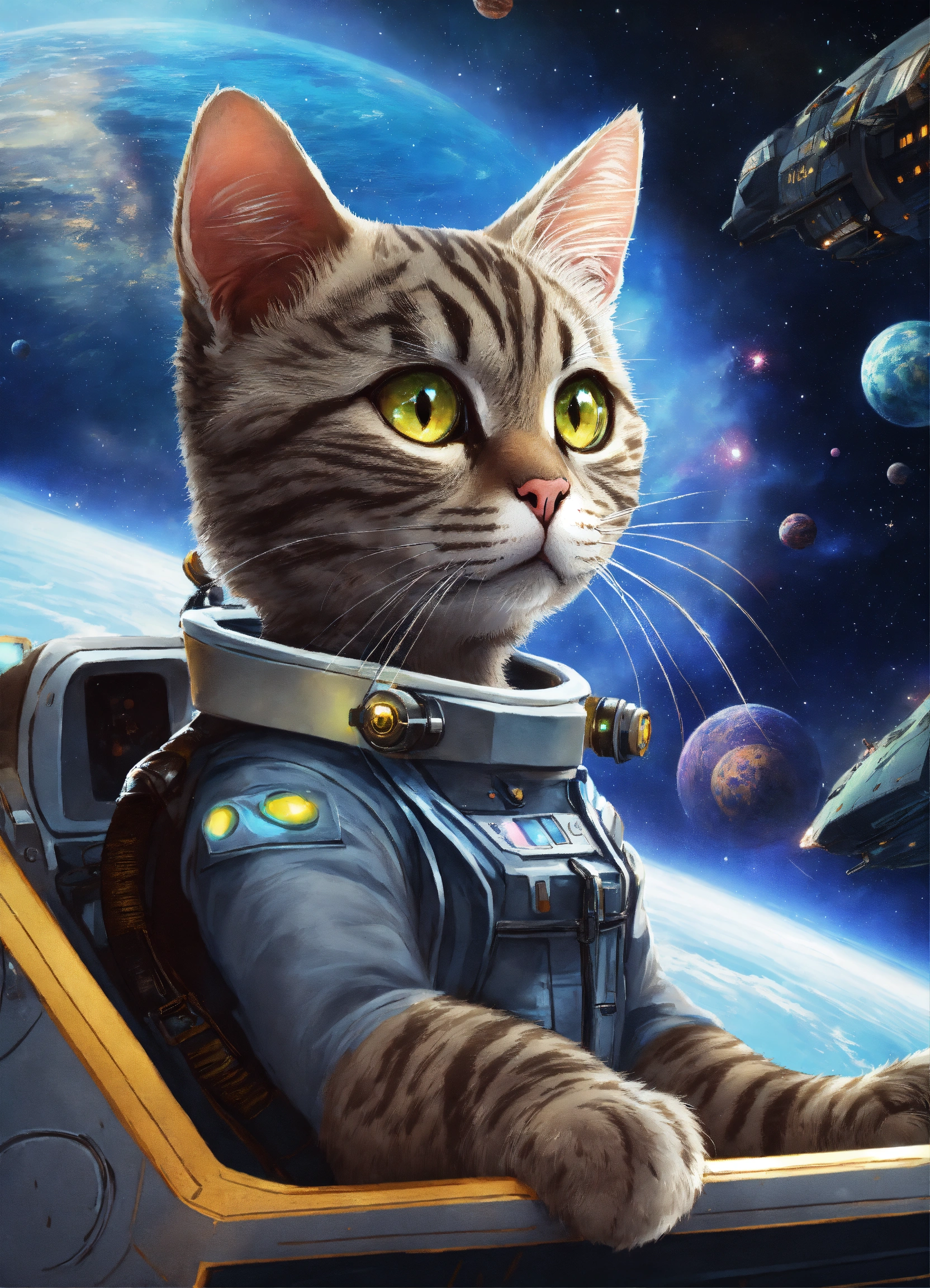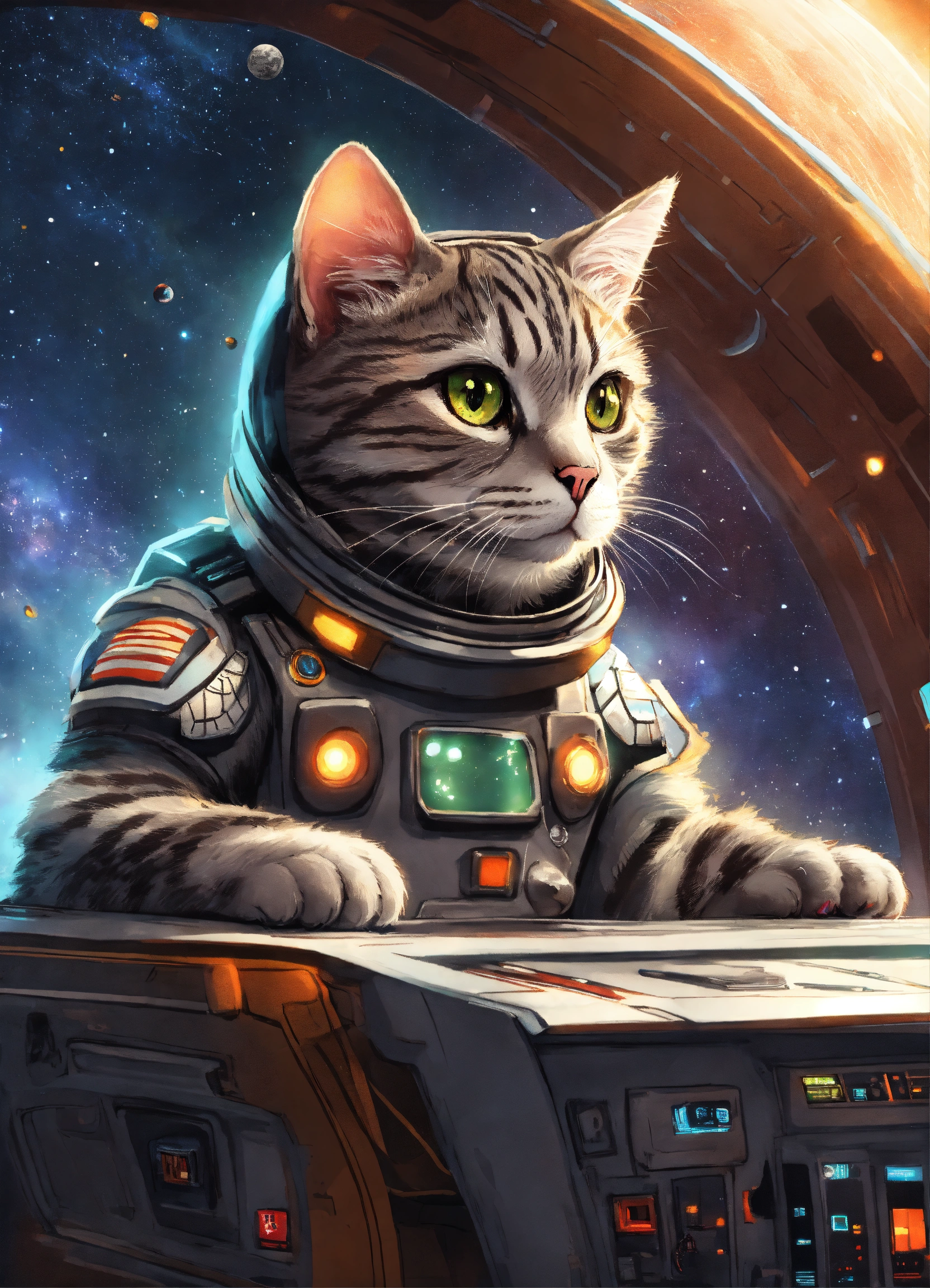 An anthropomorphic grey tabby cat piloting an intergalactic ship