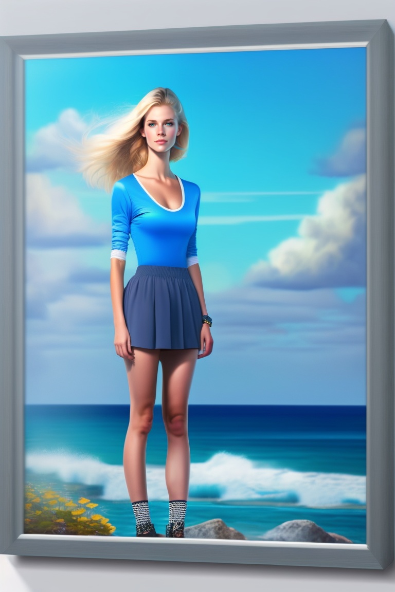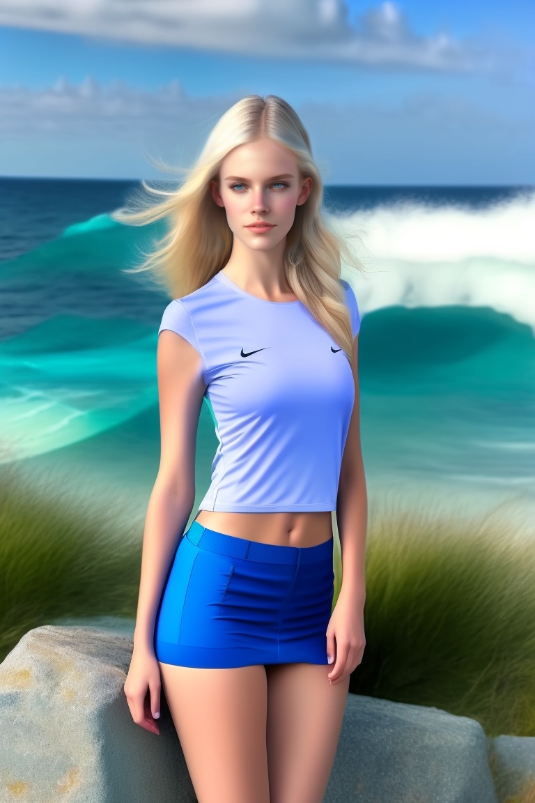 A very skinny blonde girl with grey eyes, no eyeglasses, facing en face, in a mini skirt with the blue sea at the background