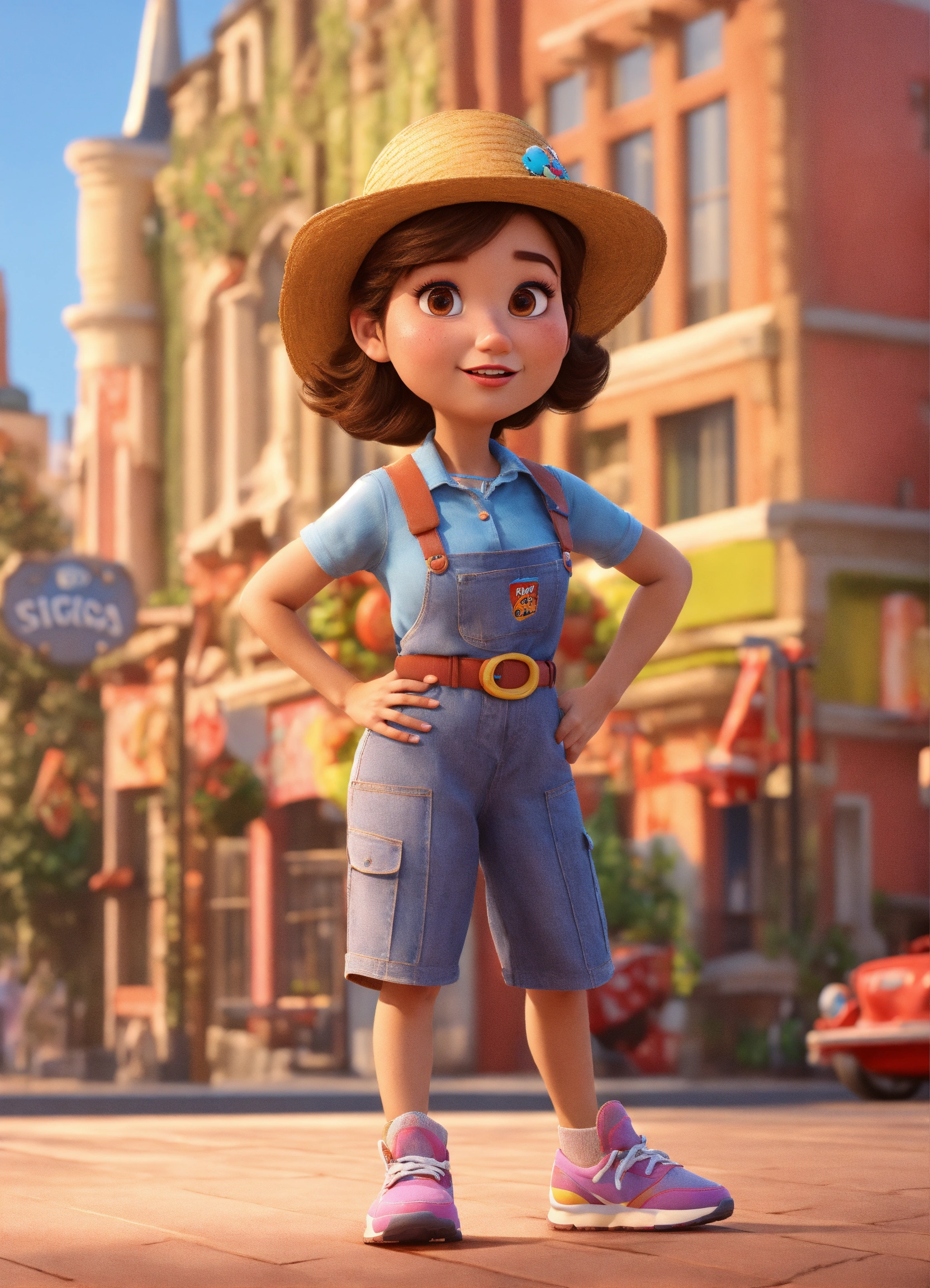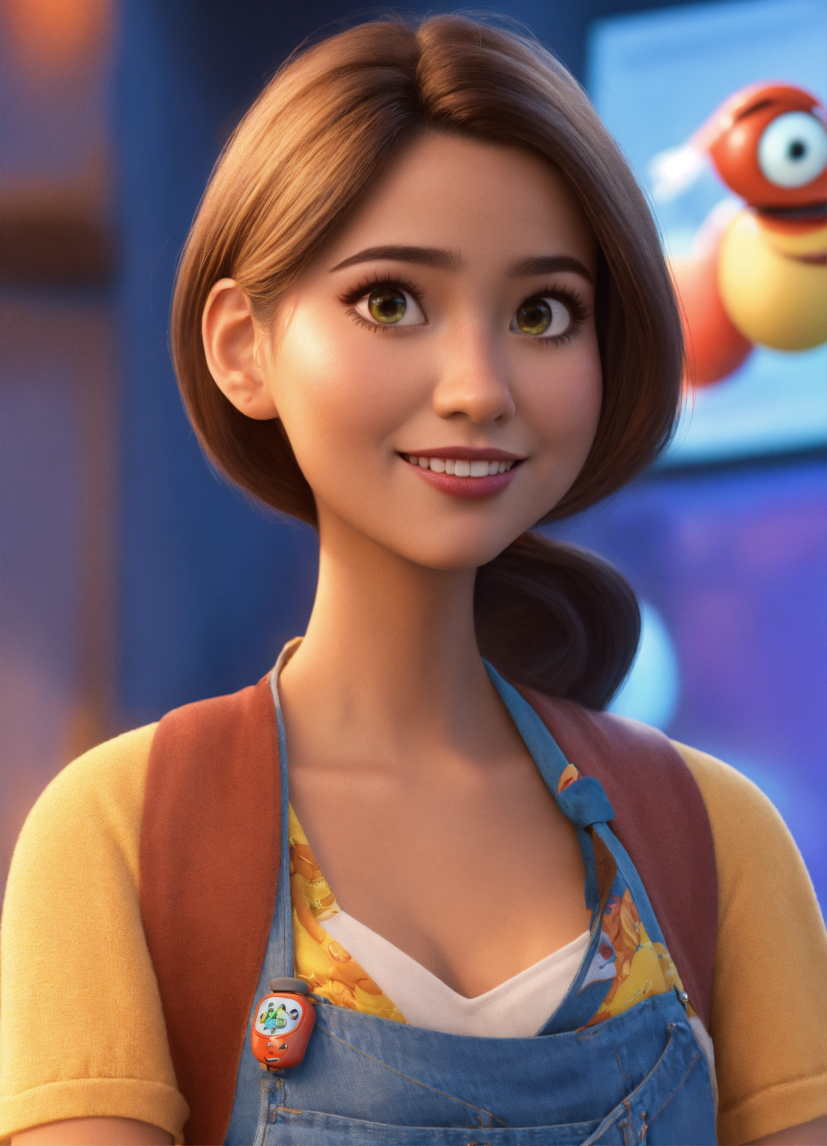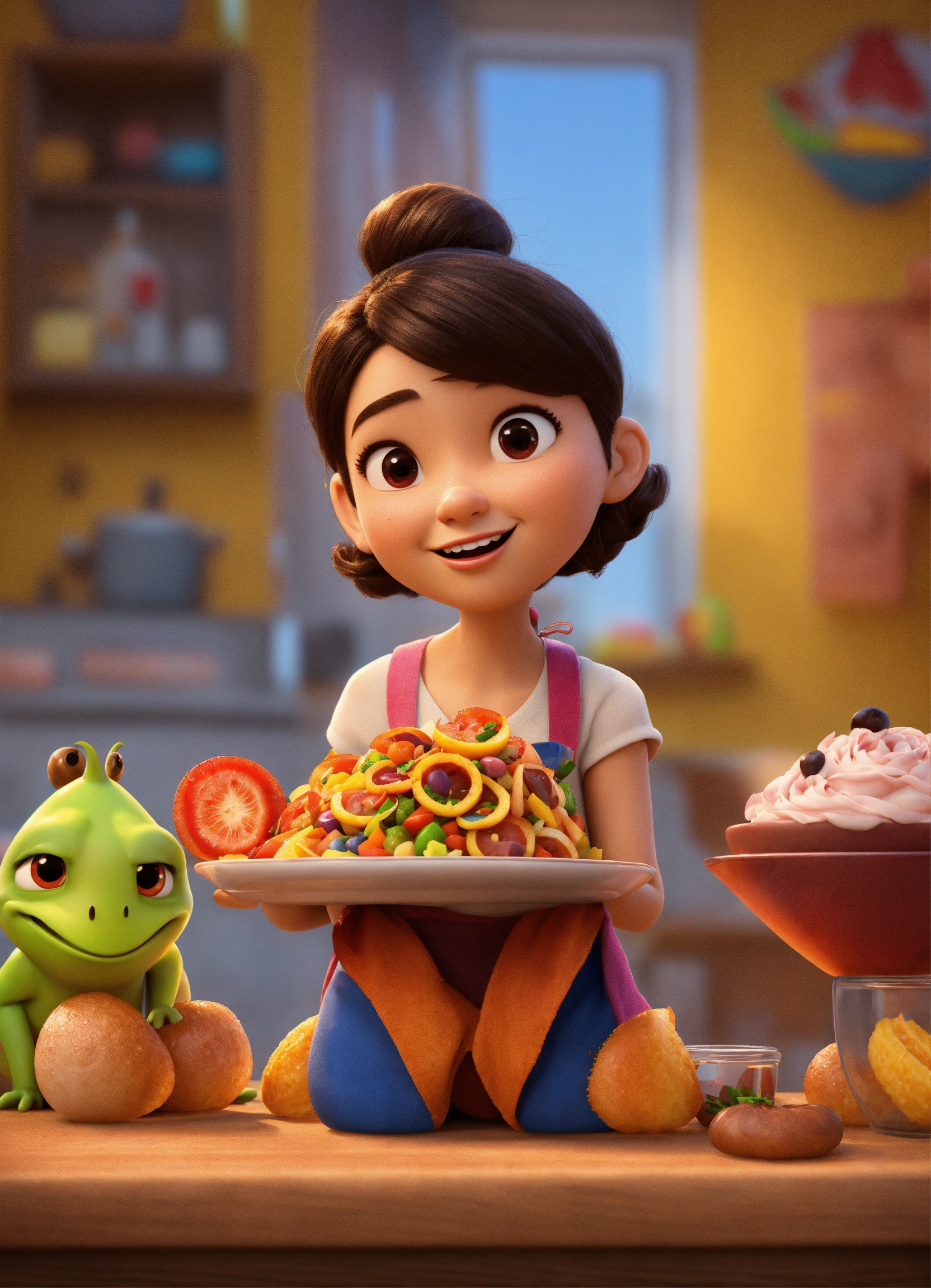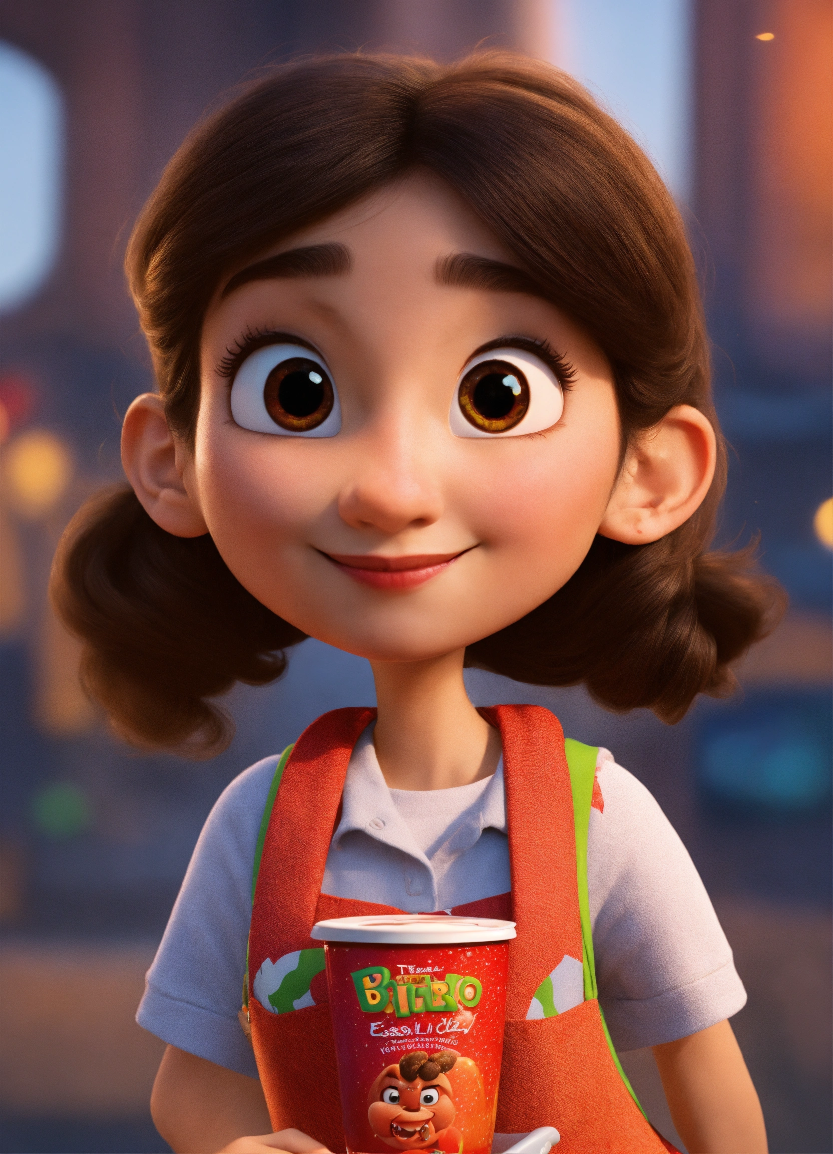 Linda chica, estilo pixar, estilo 3d, estilo disney, 8k, hermosa, con vestimenta de comida rapida, que en la vestimenta tenga un logo que diga bigotto