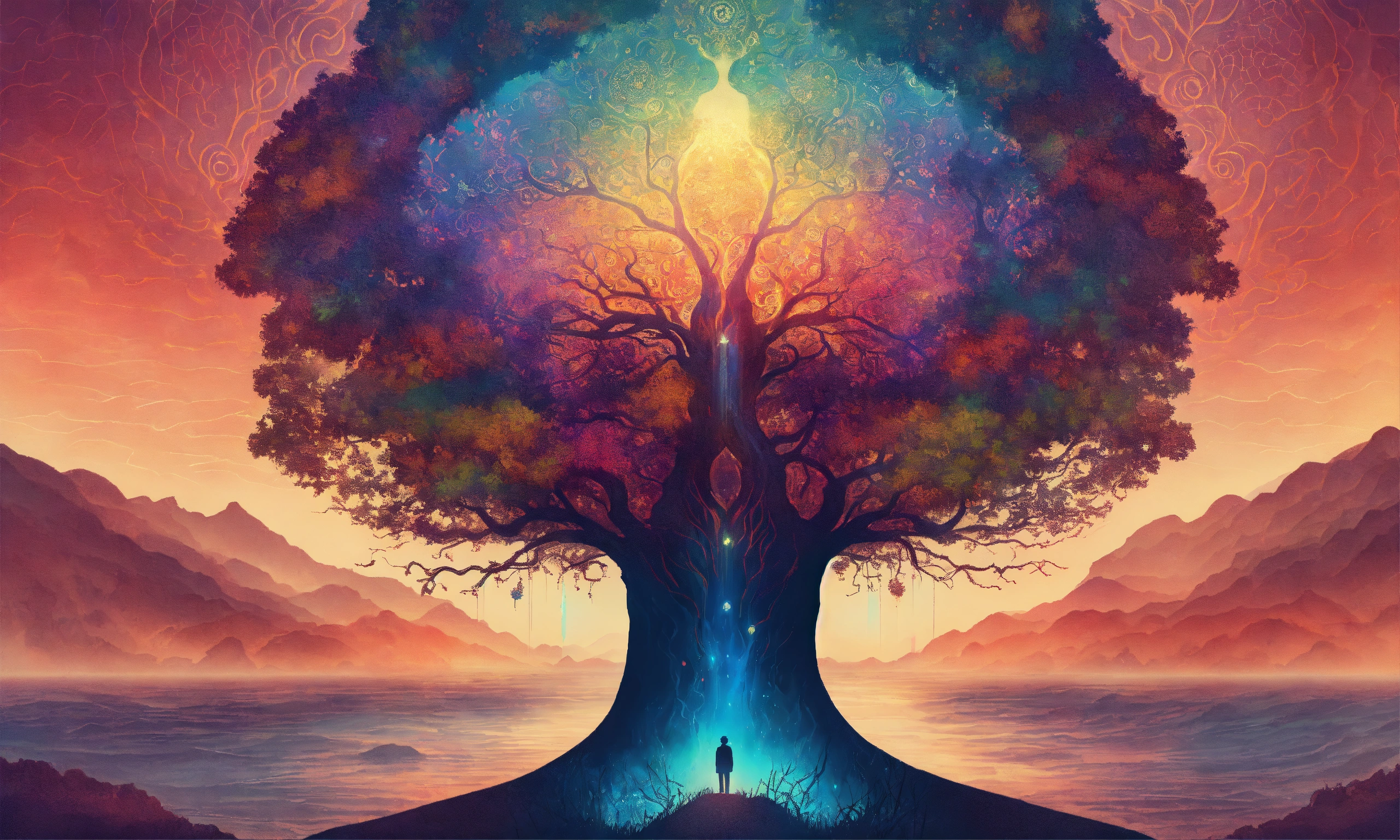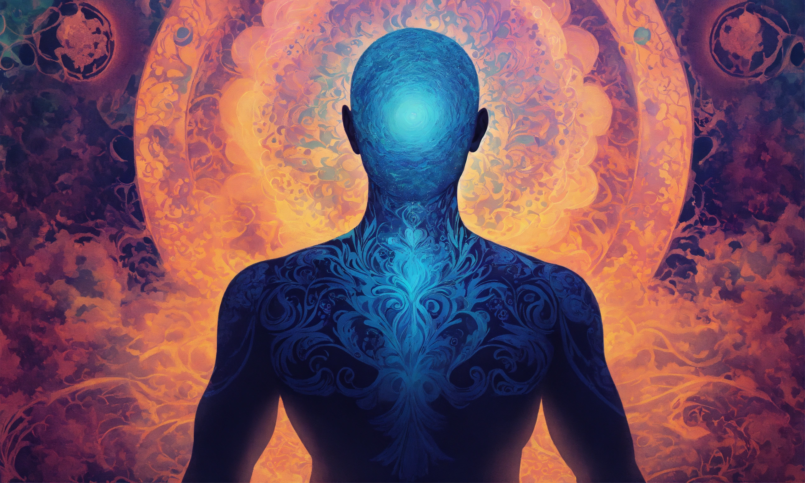 An intricately detailed illustration of a mind's silhouette where the conscious and unconscious realms converge. show layers gradually dissolving, with a serene, spiritual aura in the background, subtly enhanced by soothing patterns with psychedelic touch.