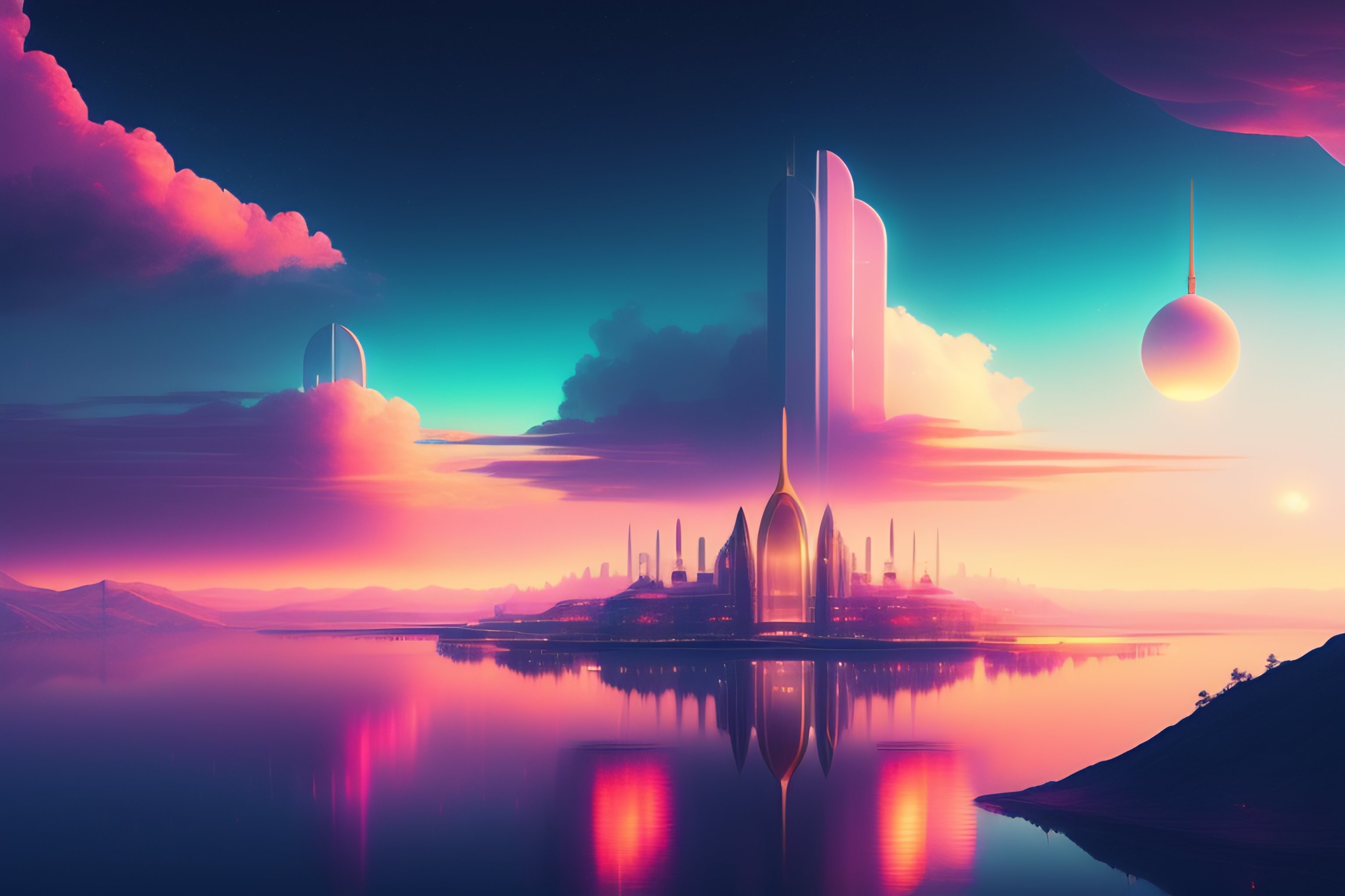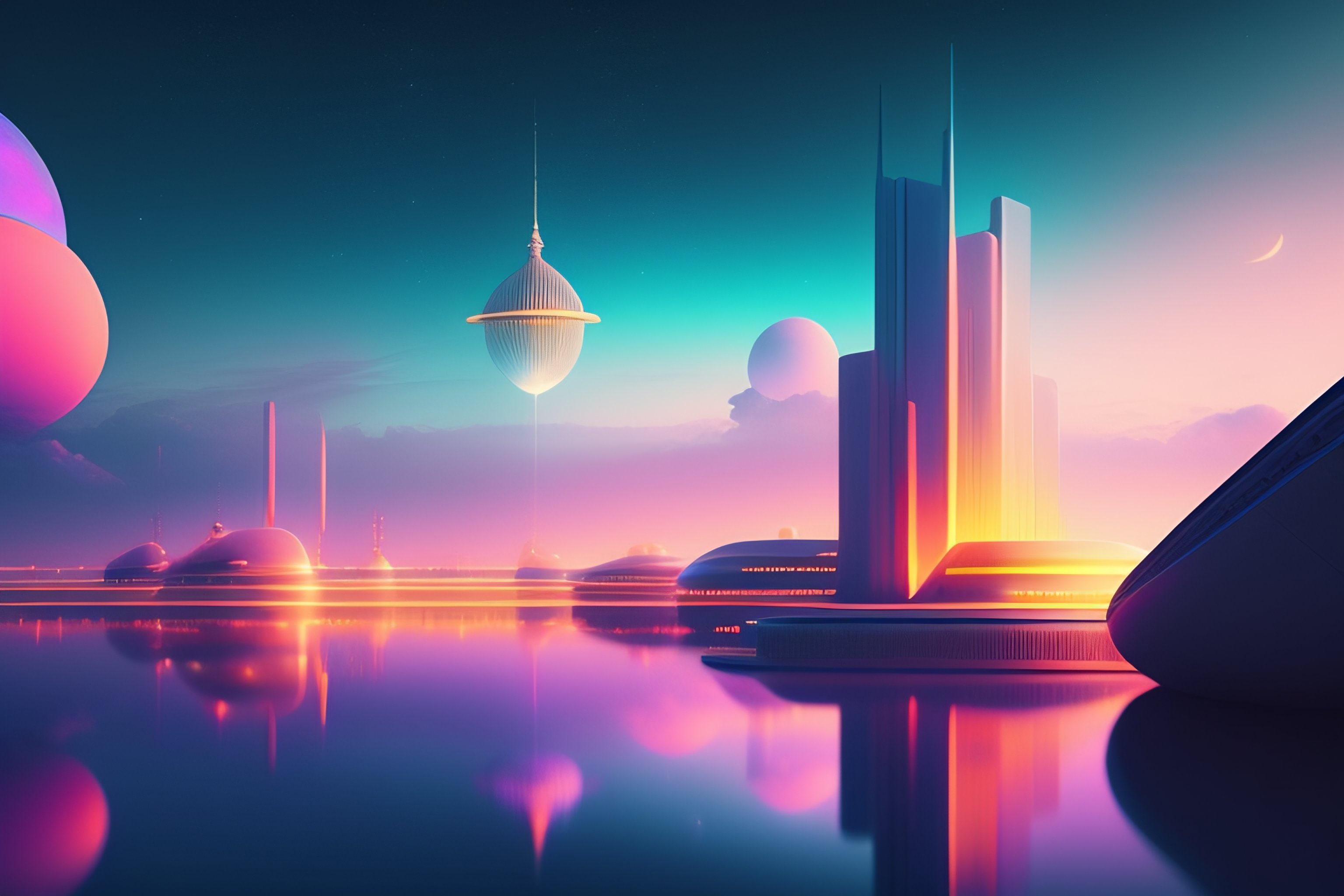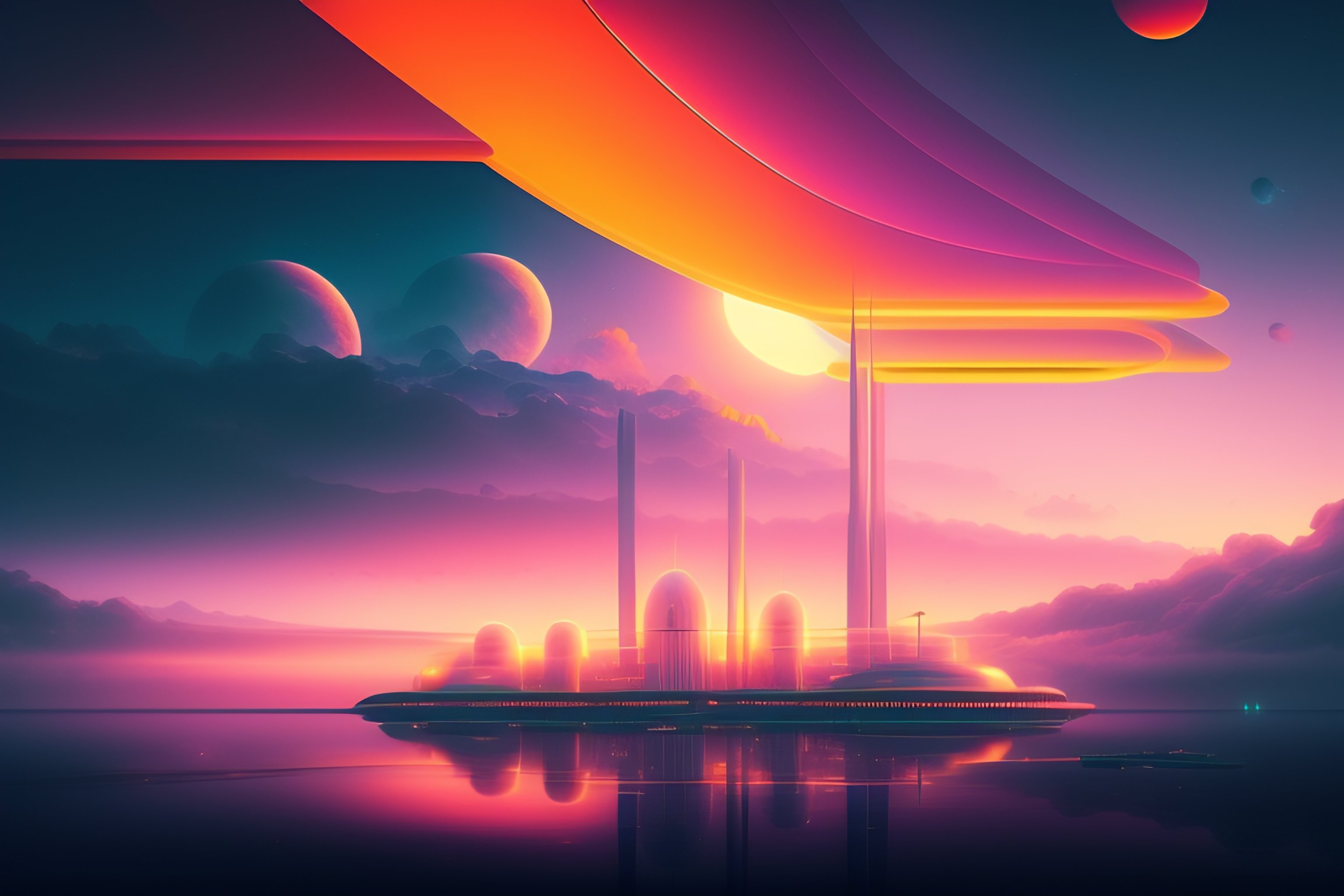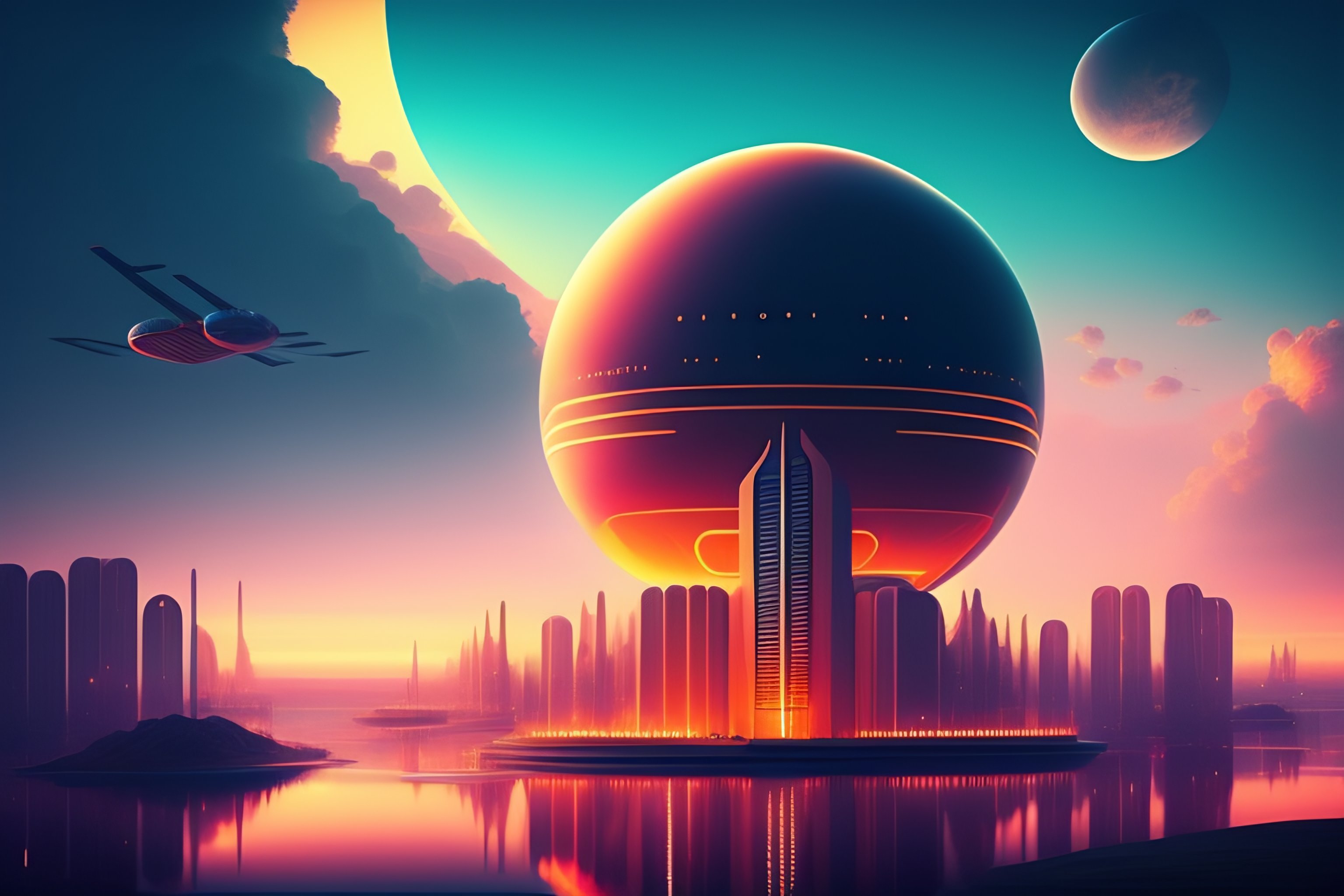 Utopia city in the sky cloudy rainy starry retro futuristic art matte painting digital art pop art neoclassic abstract cgi artstation behance pinterest designboom cinematic full picture detailed color, technicolor vintage style stills embossed oil painting maximalist minimalist wlop beeple romanticism ghibli