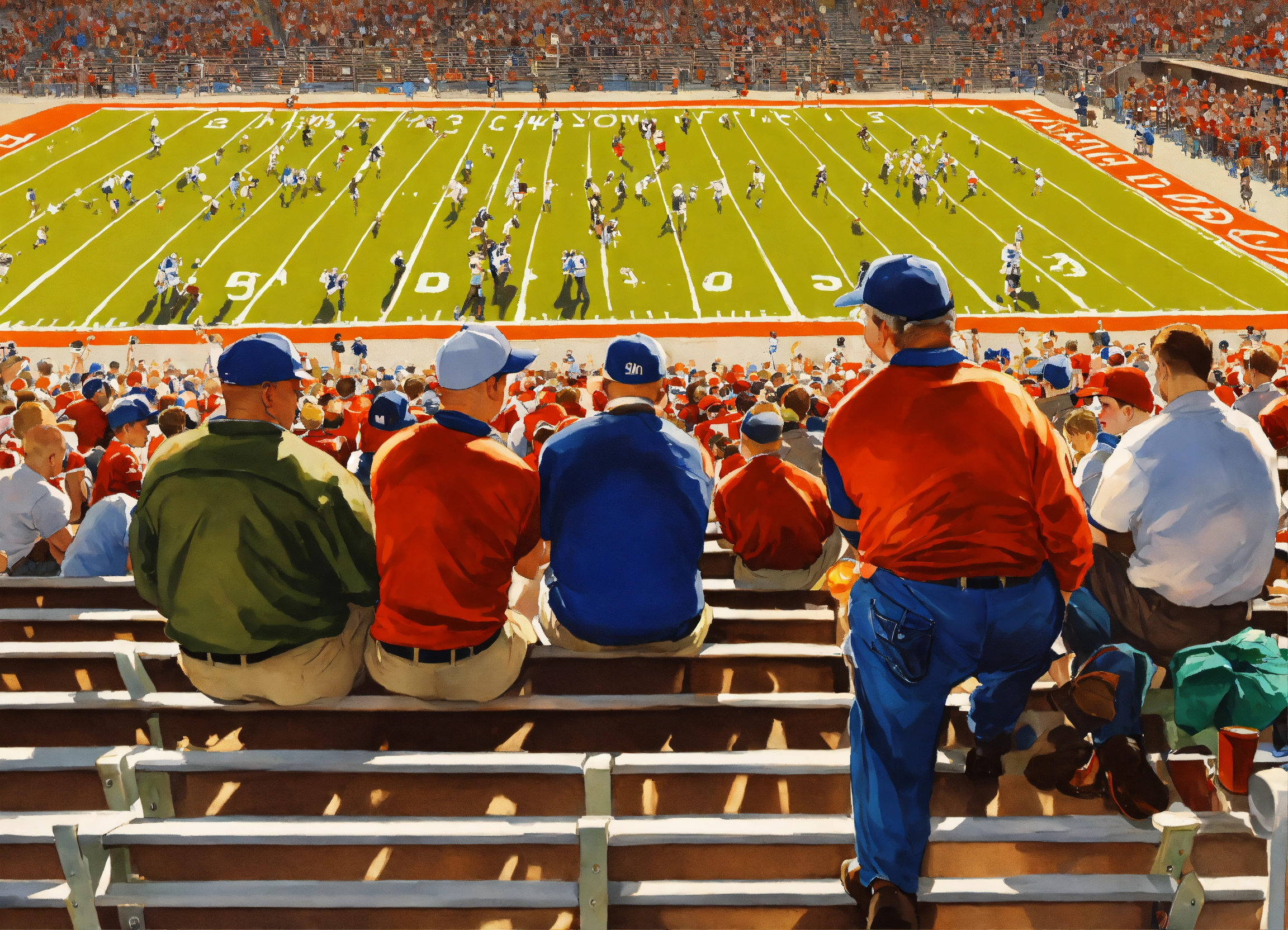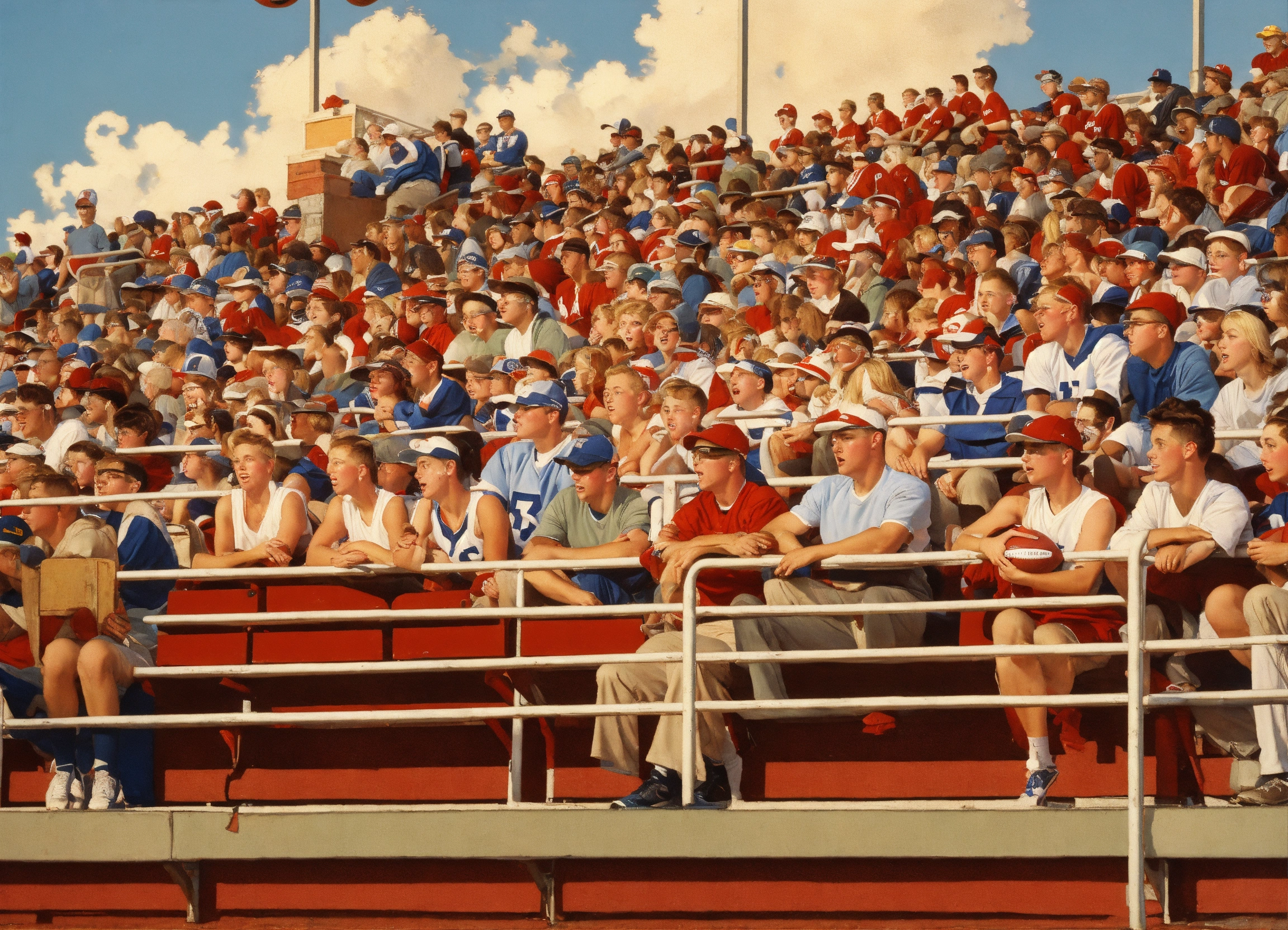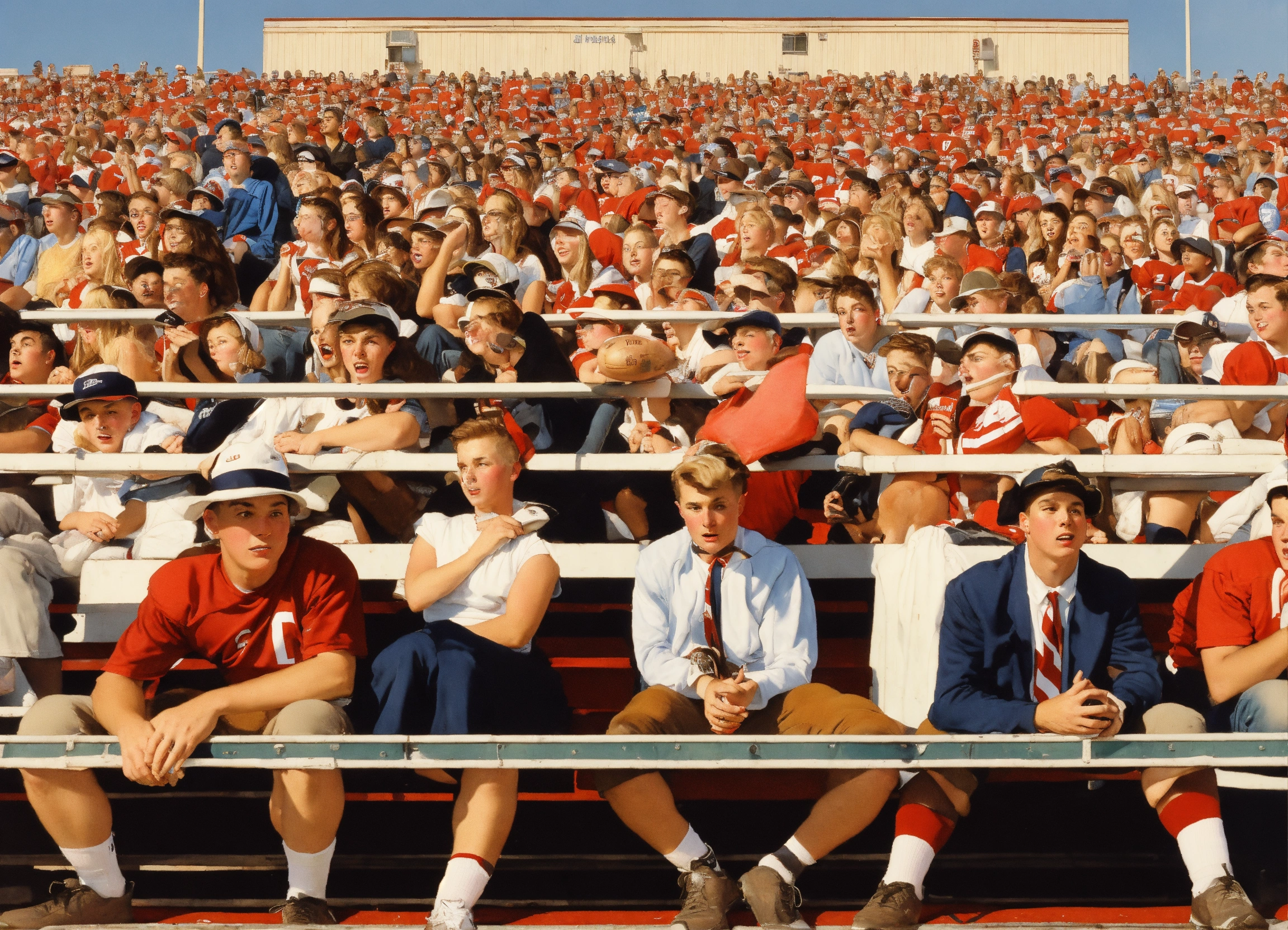 Sports fans watching a high school football game in the bleachers norman rockwell style