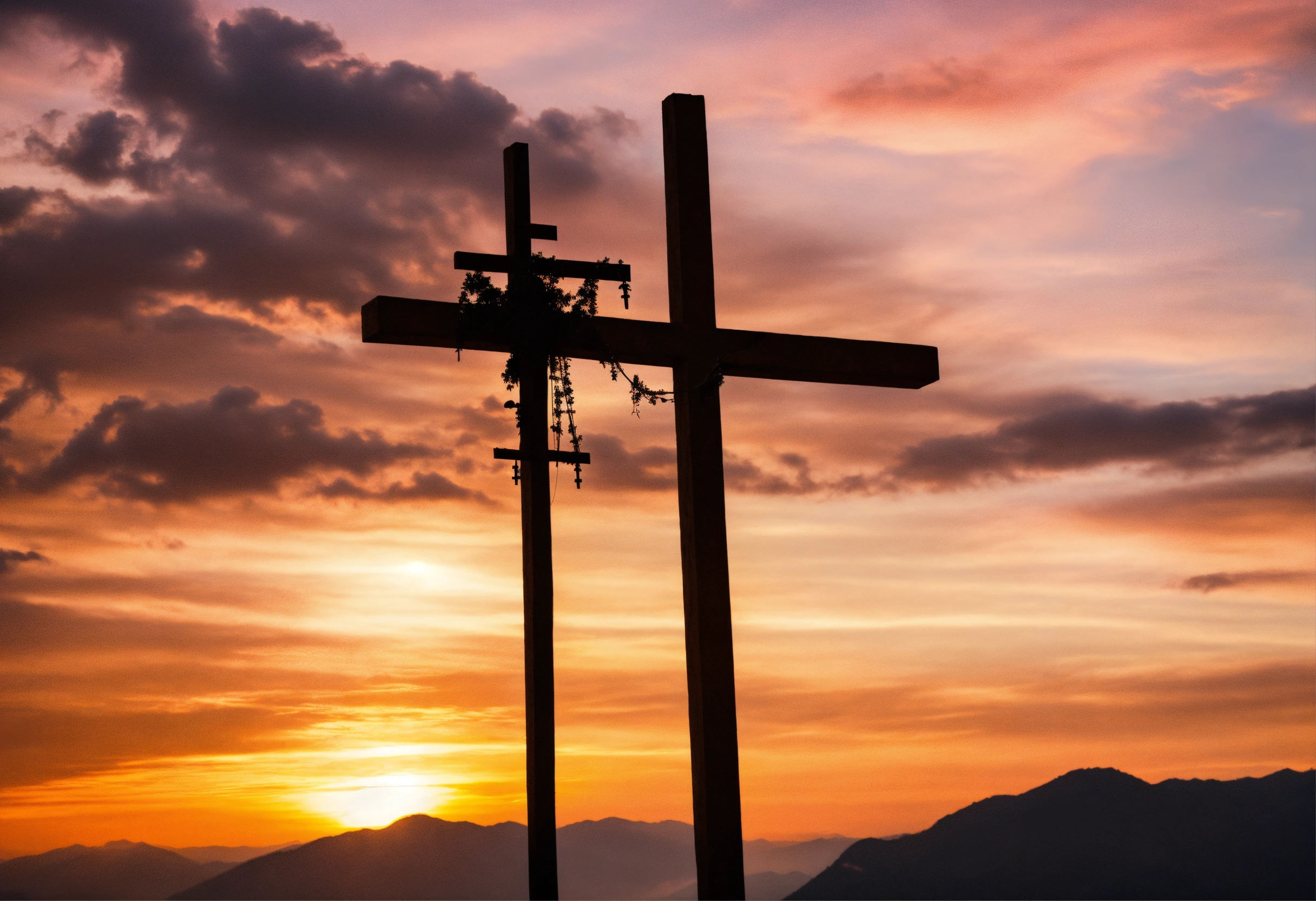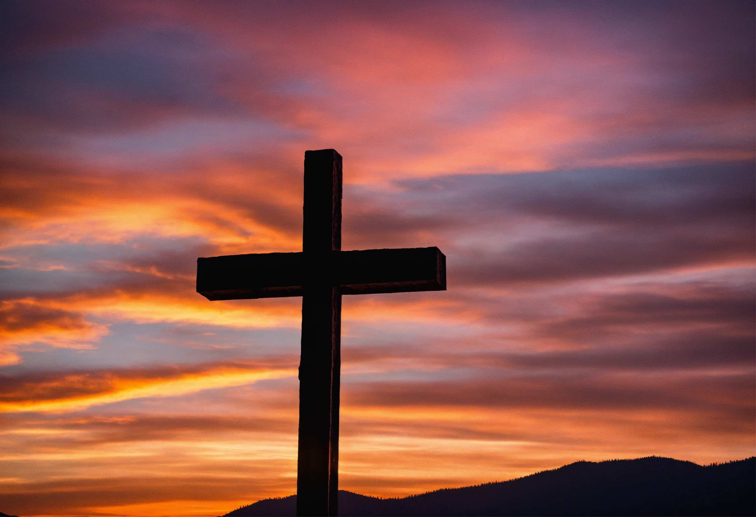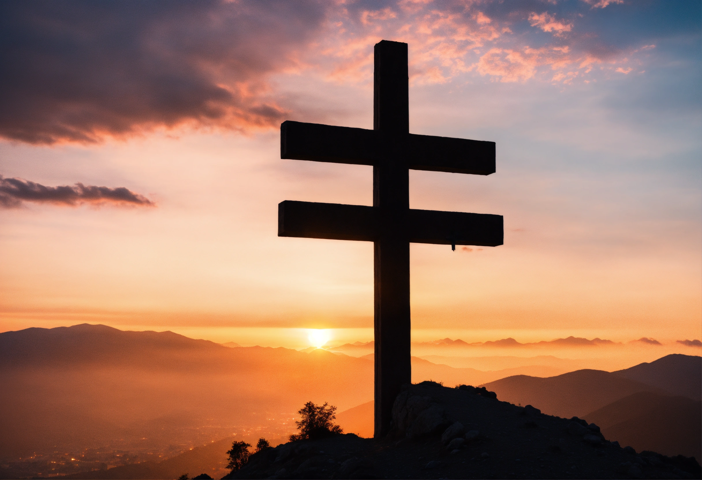Closeup on silhouette of crucifix cross on mountain at sunset sky background