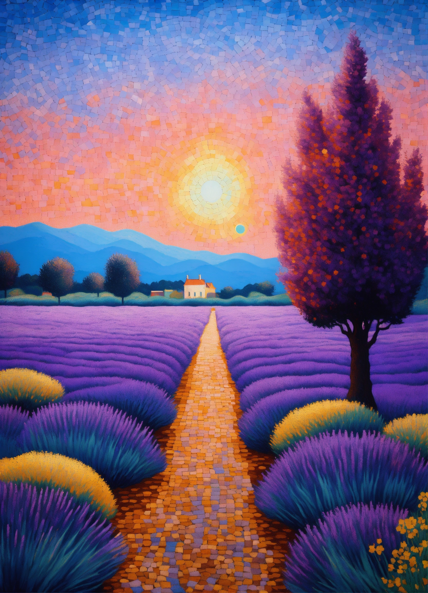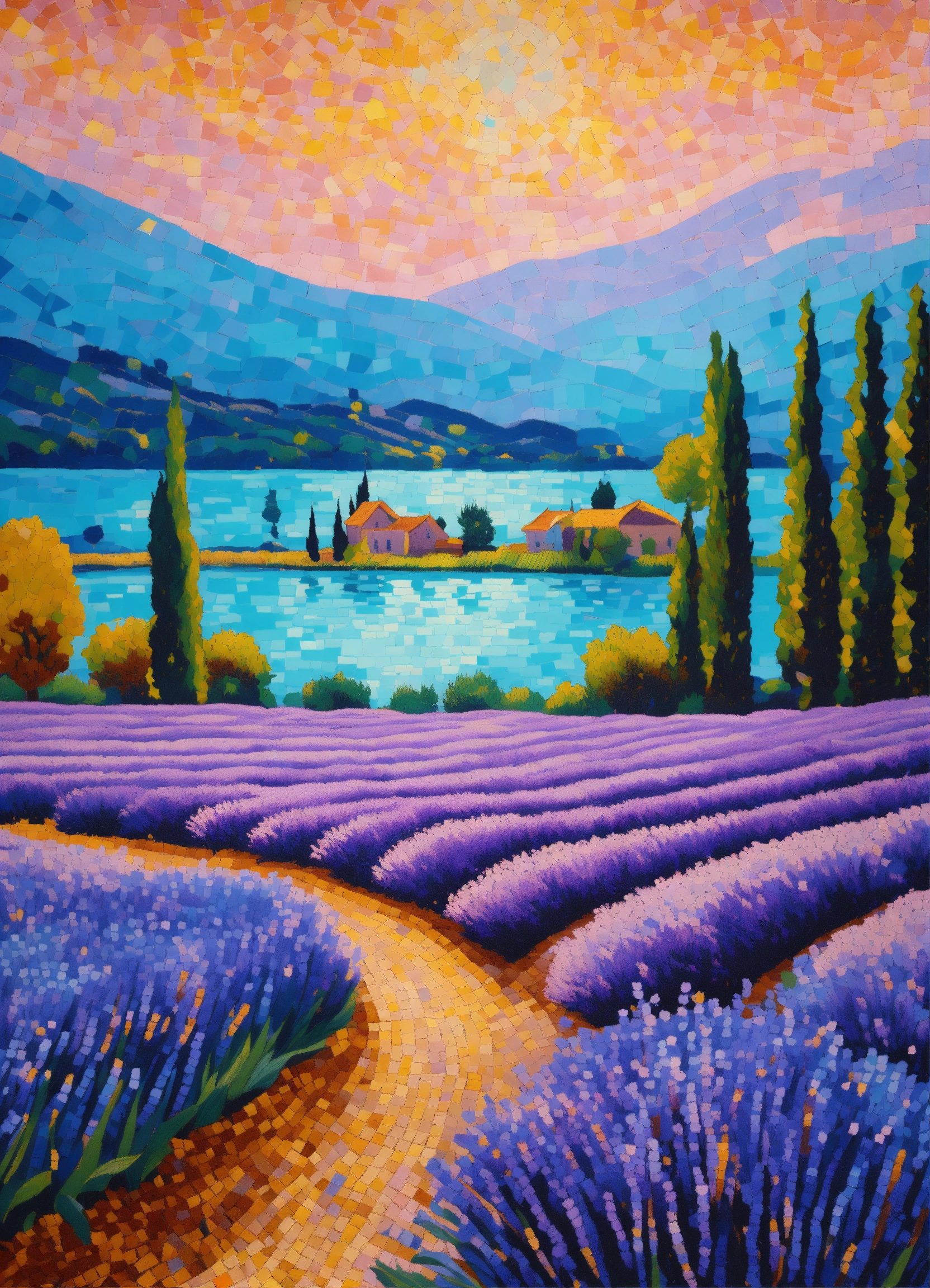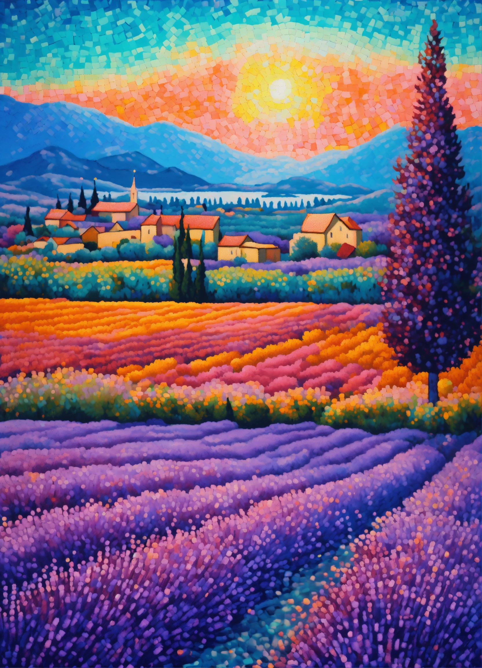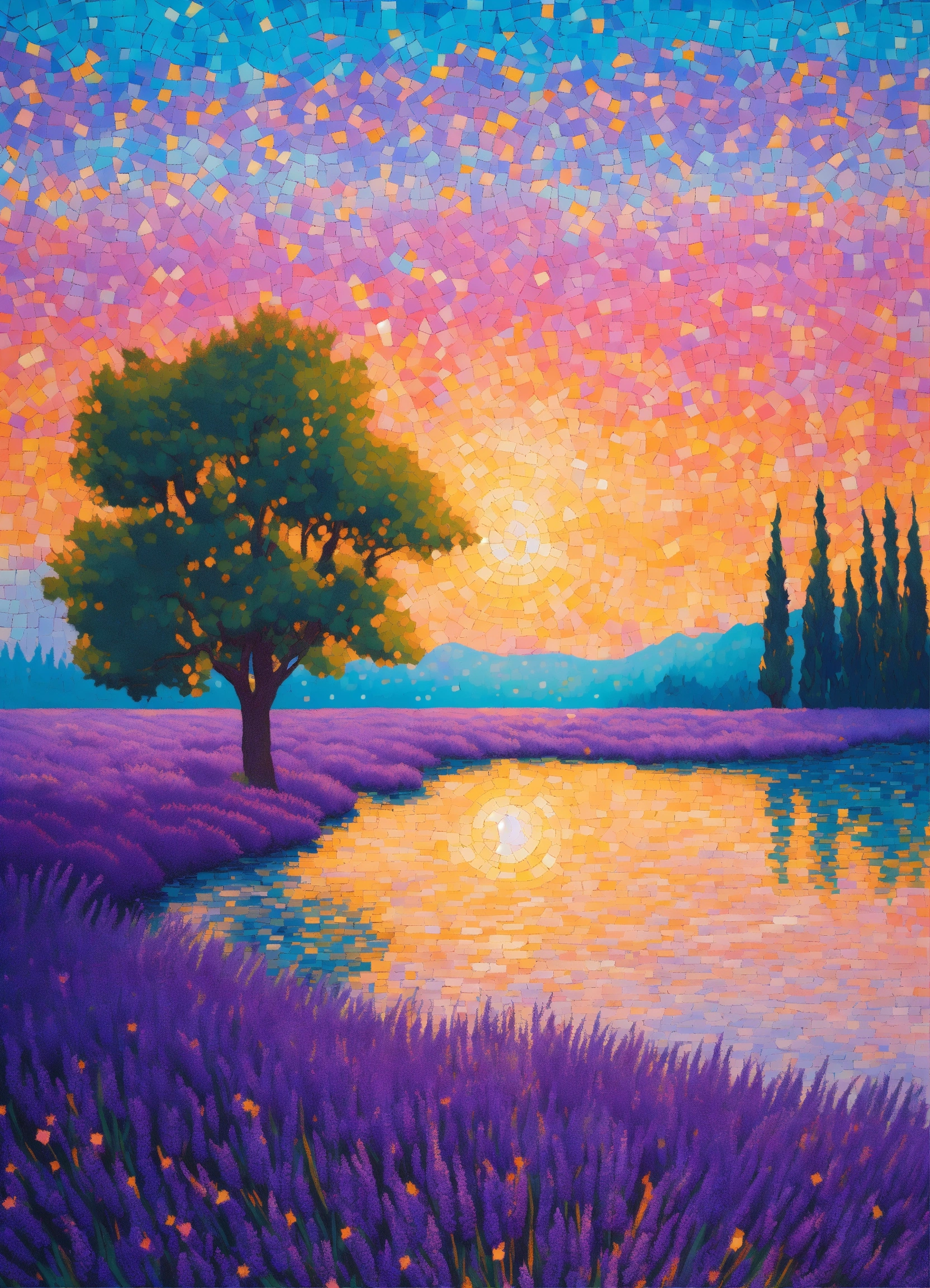 Pointillism field of lavender mosaic, pastel colors, ultra sharp detail, trees, aqua blue lake, glitter, stars, stardust, hyper realistic, well rendered, detailed, pink, orange and yellow sunrise sky in style of vincent van gogh