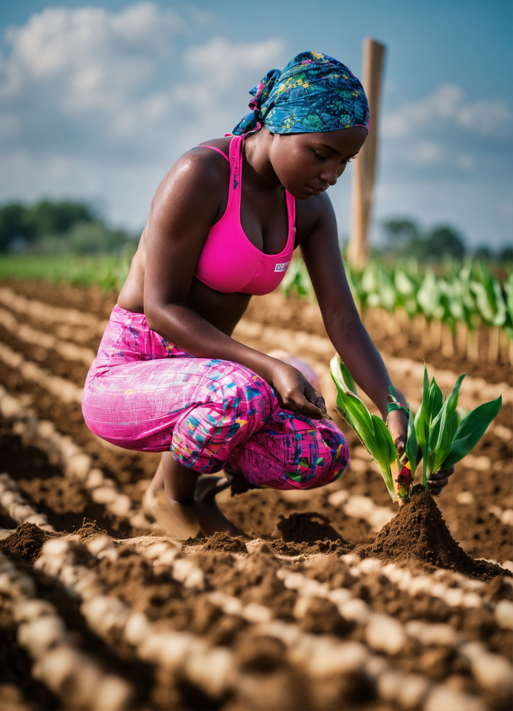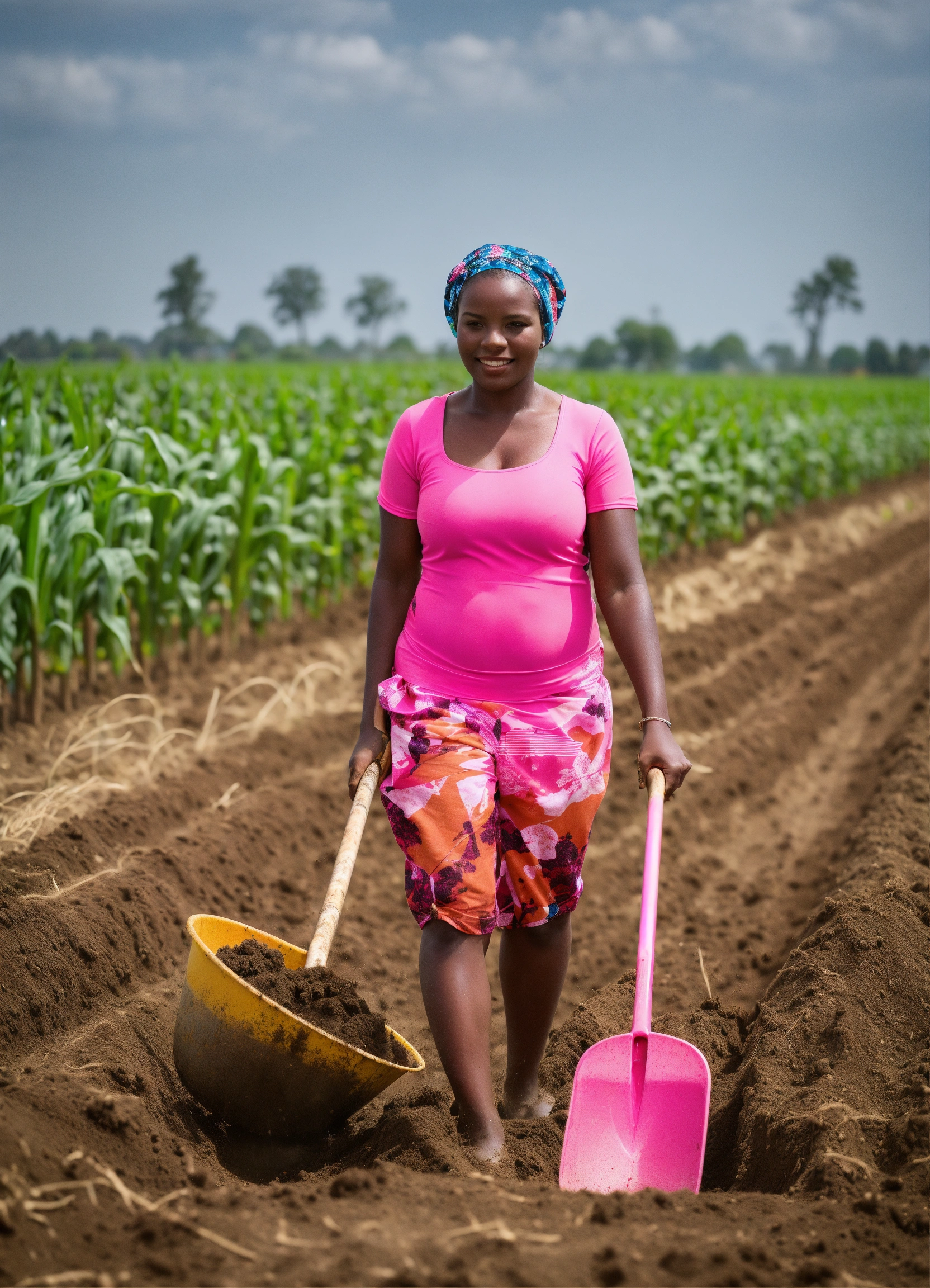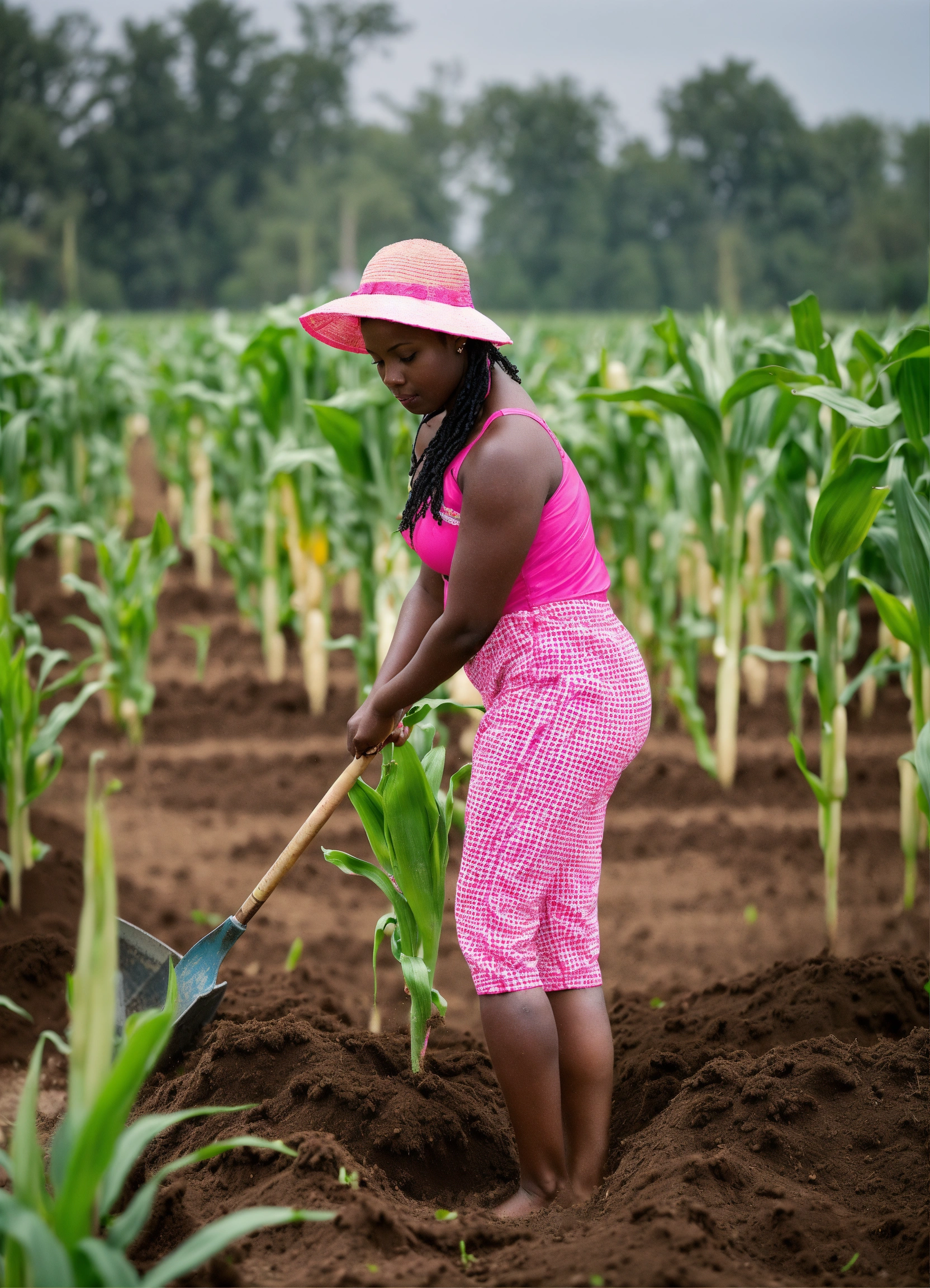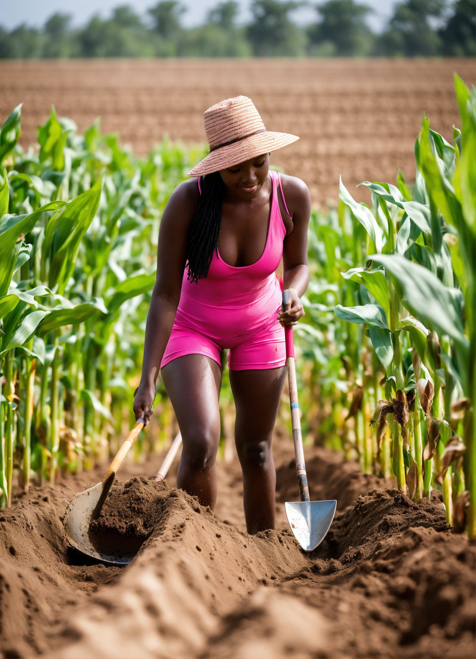 Lady of 25 years old in a pink swimming suits with a shovels in her hand checking quality of planting maize after planter in a row