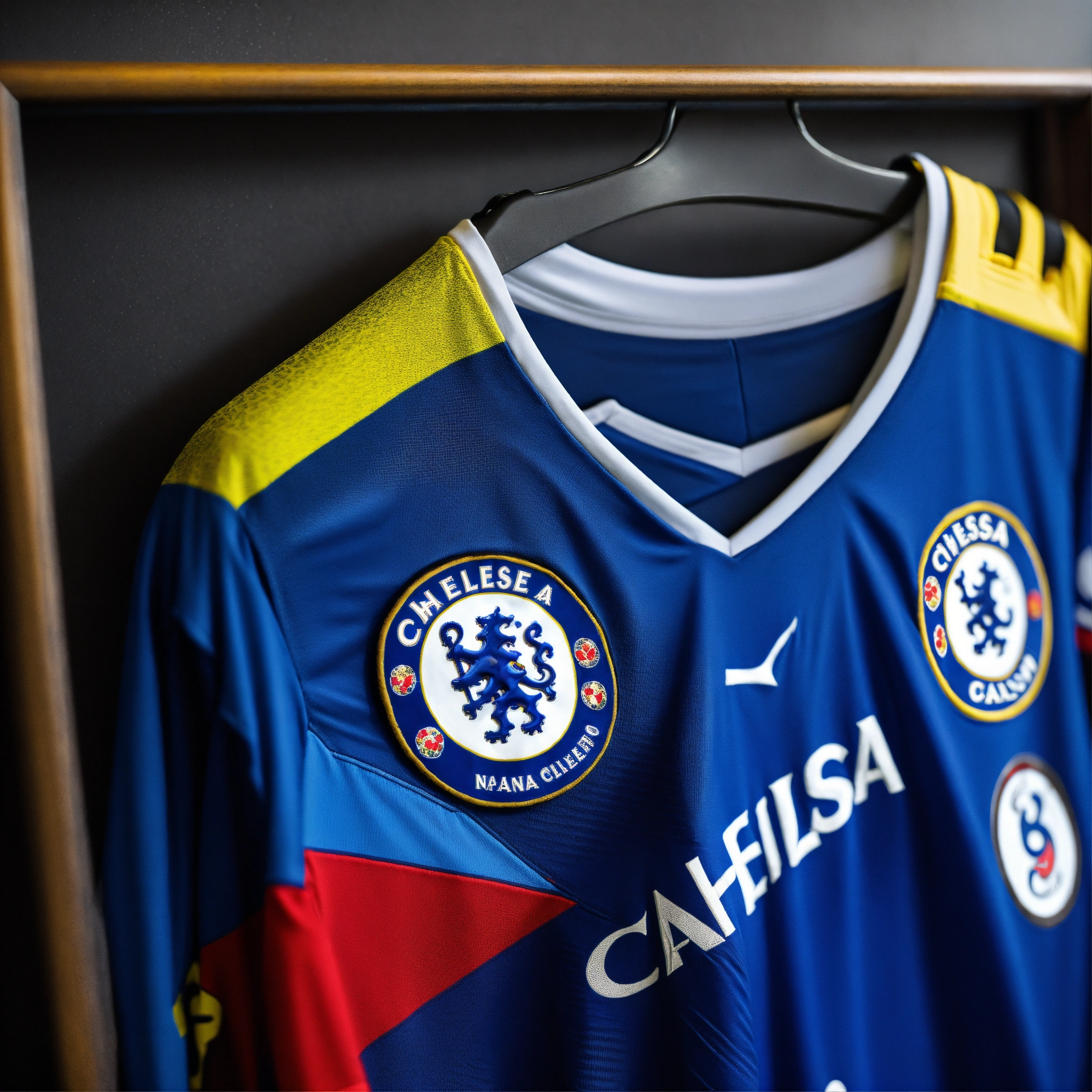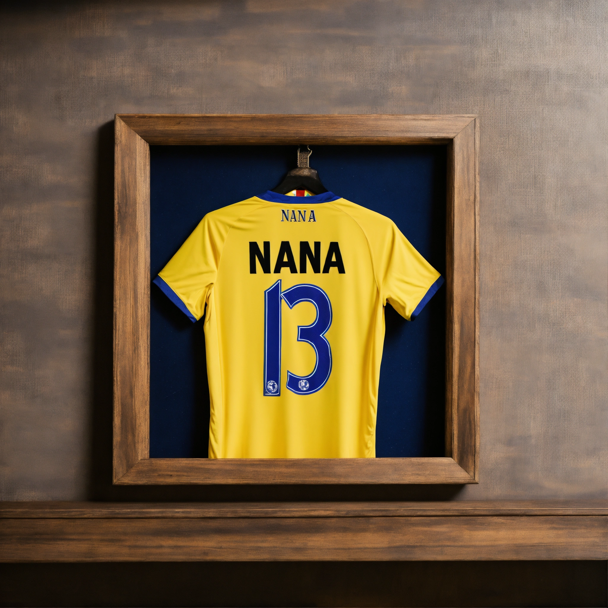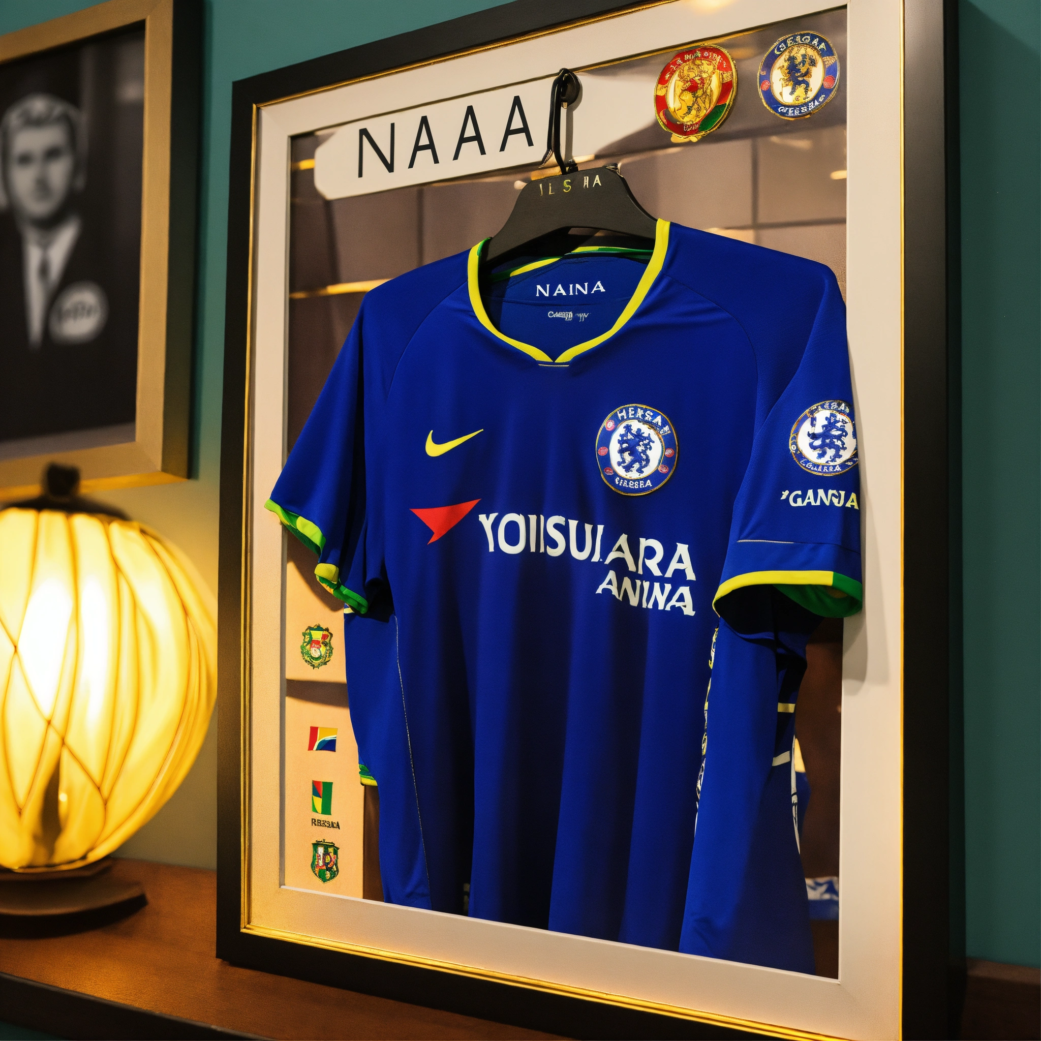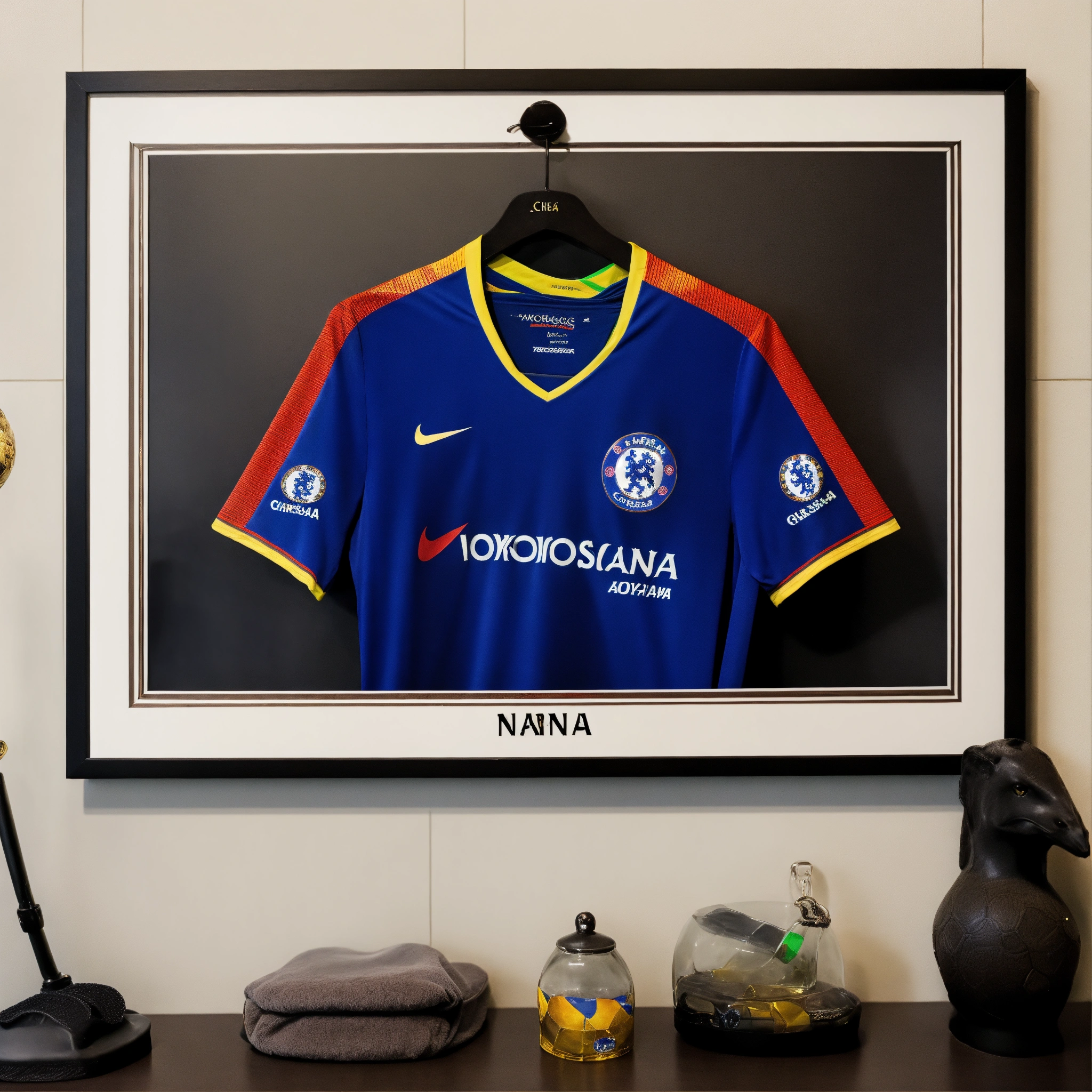 Striking close up of chelsea soccer jersey hanging in frame player name nana with ghana flag logo on it