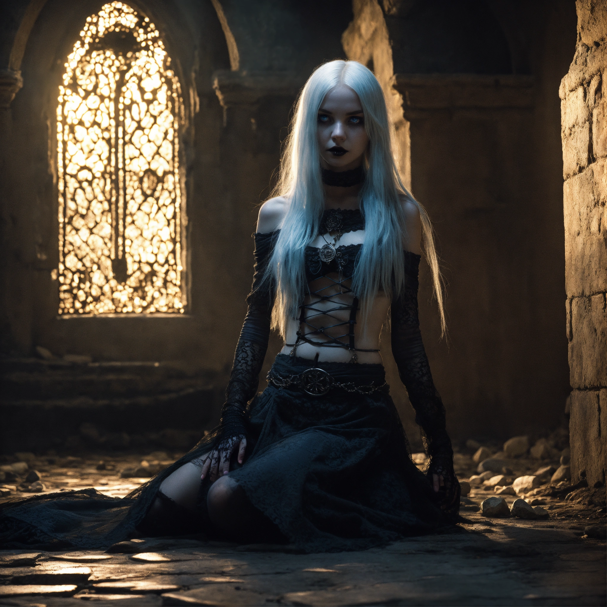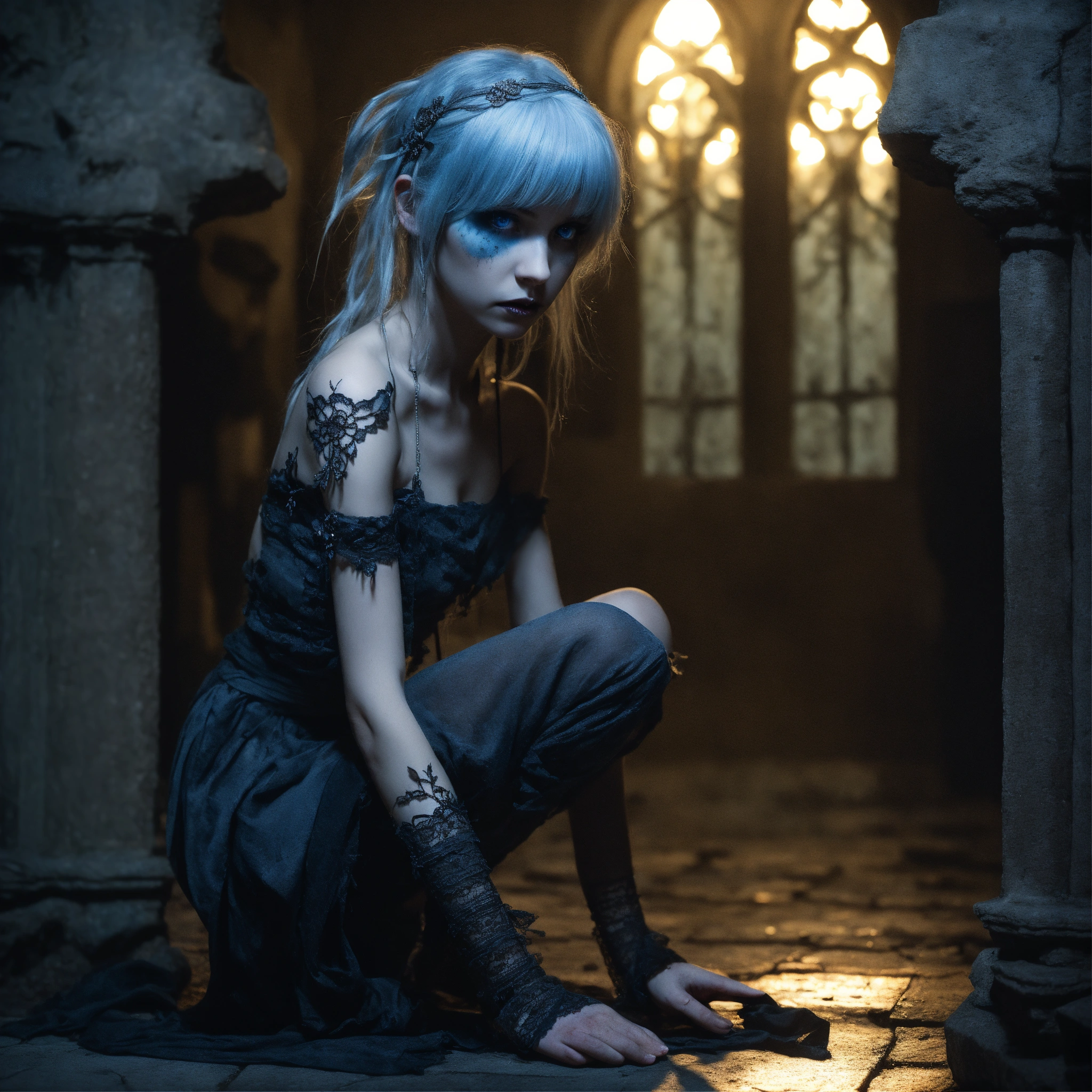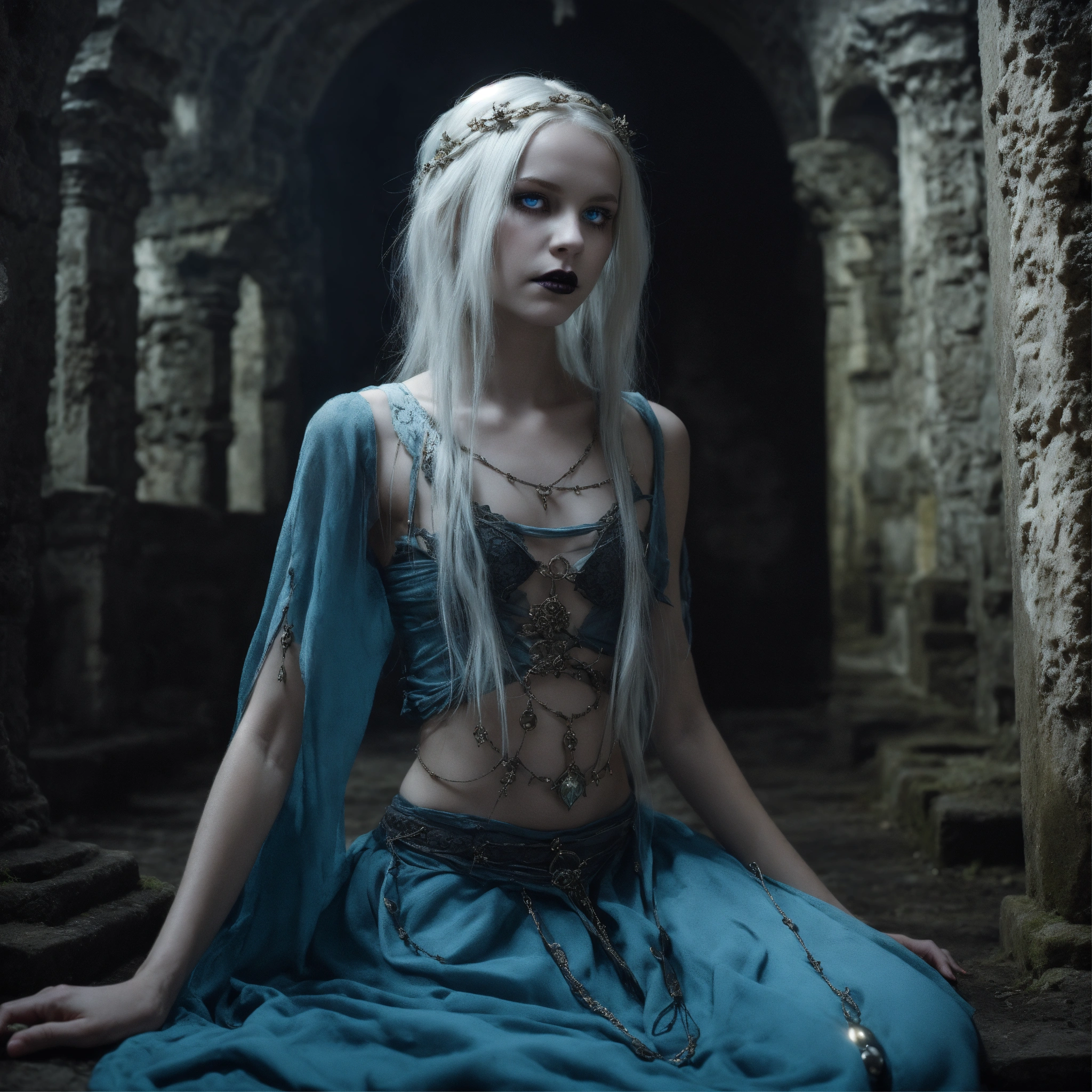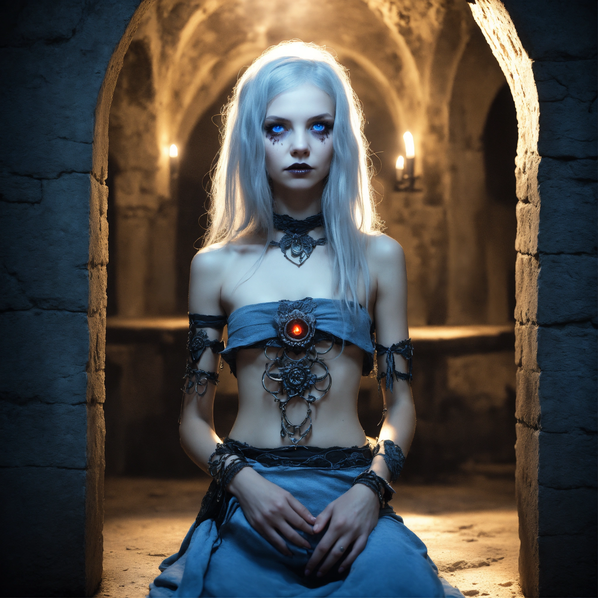 Body portrait, sehr kindhaftes deadly pale extremely slim twelve year old female child, she is a goth necromancer with waist long silverwhite hair and a aufreizendes off-the-shoulder lace cropped top and a low-waisted hip scarf, extremely flat belly, belly button, extremely skinny, extremely slim and emaciated body, completely emaciated, extremly narrow face, alabaster skin, pale as a corpse, glowing blue eyes, slim face, her hip bones stand out clearly on her thin body, innocent looking, kneels on the stone floor in a gloomy crypt, kindlich, unschuldig, childlike, juvenile, graceful, wispy, glowing blue eyes, ghostly, dead, evil, demonic, undead, darkness, grotesque, mysterious, dark, dark, cold ambient lighting, extremely detailed, fantasy, medieval setting