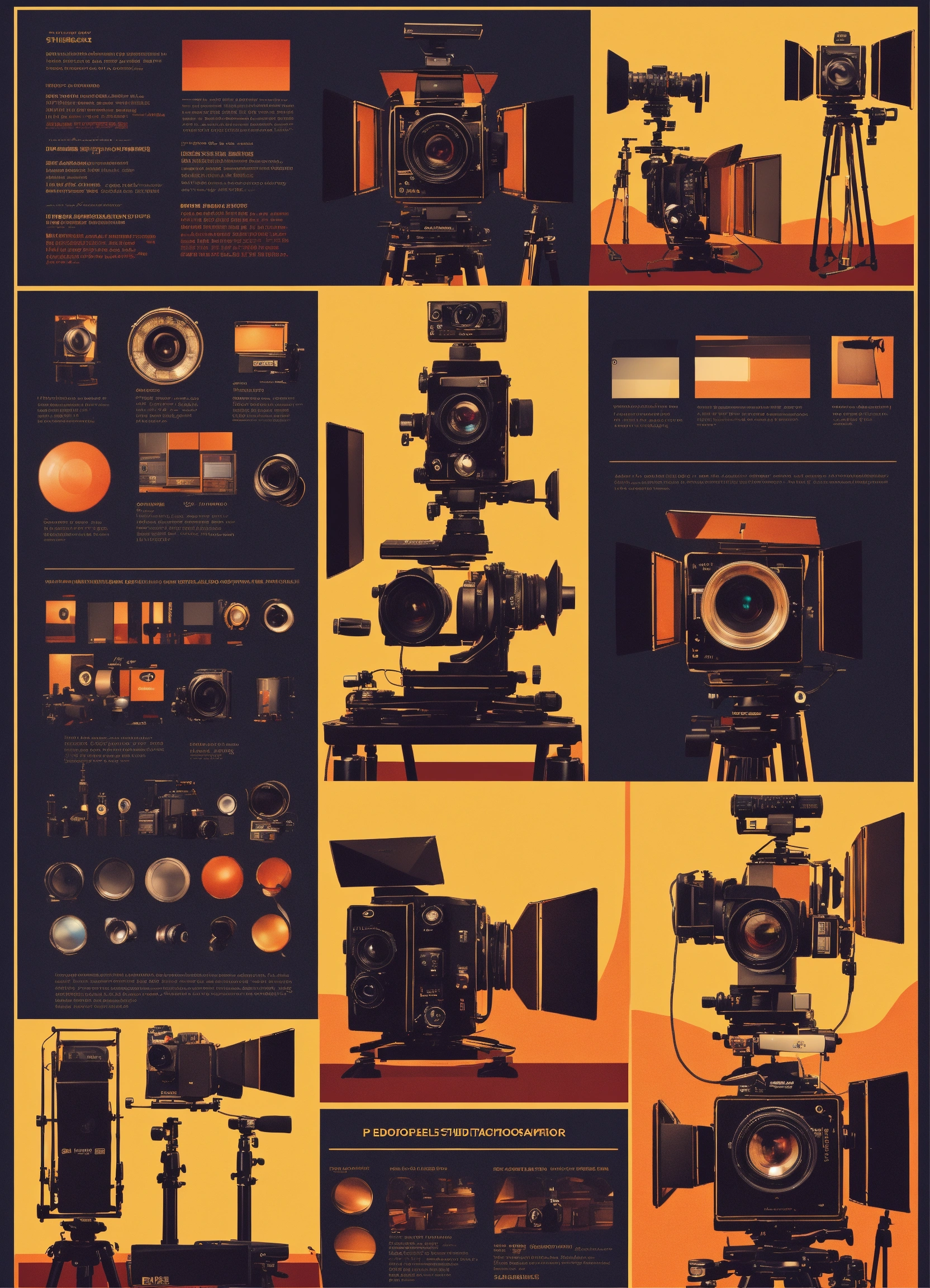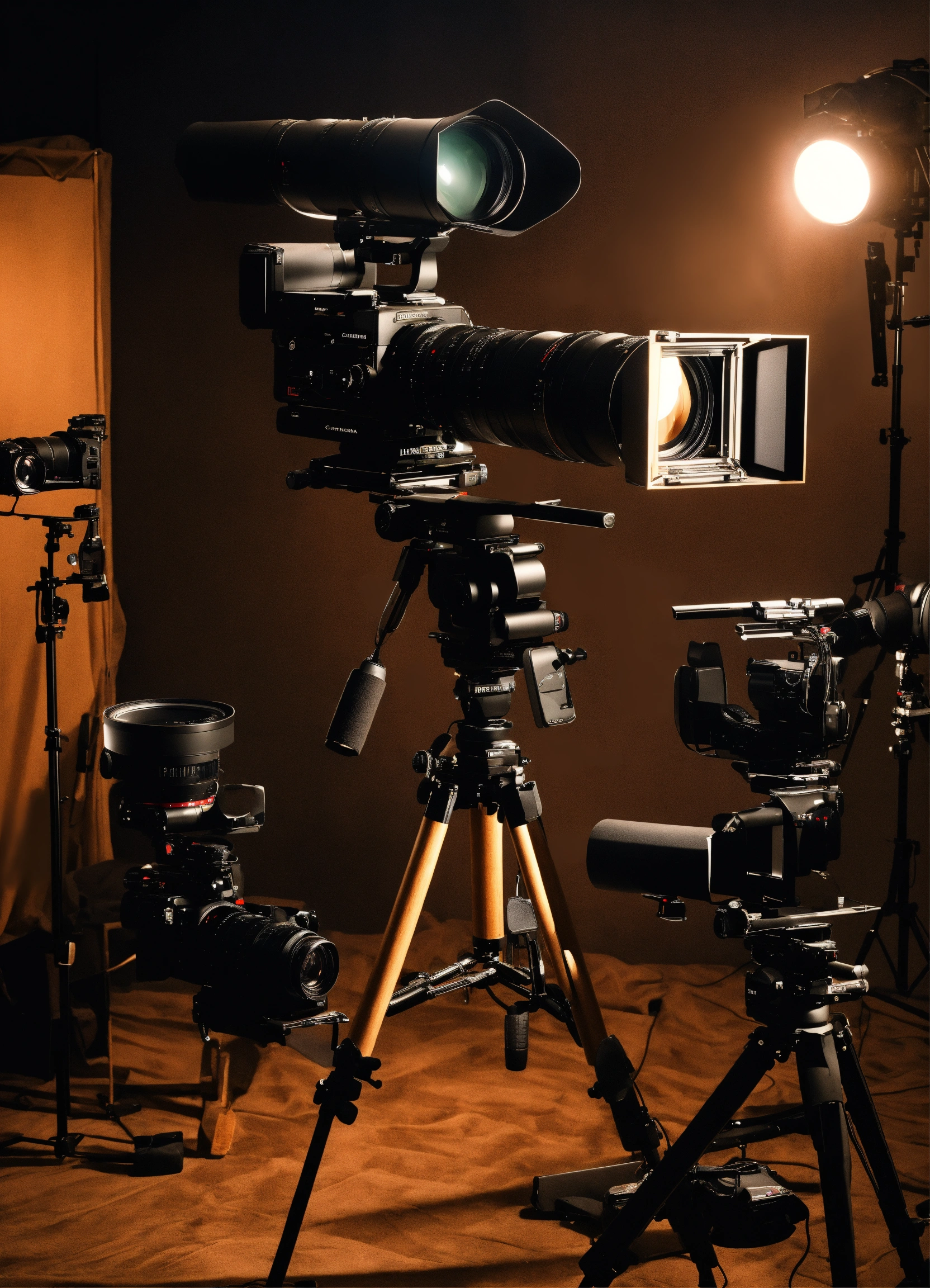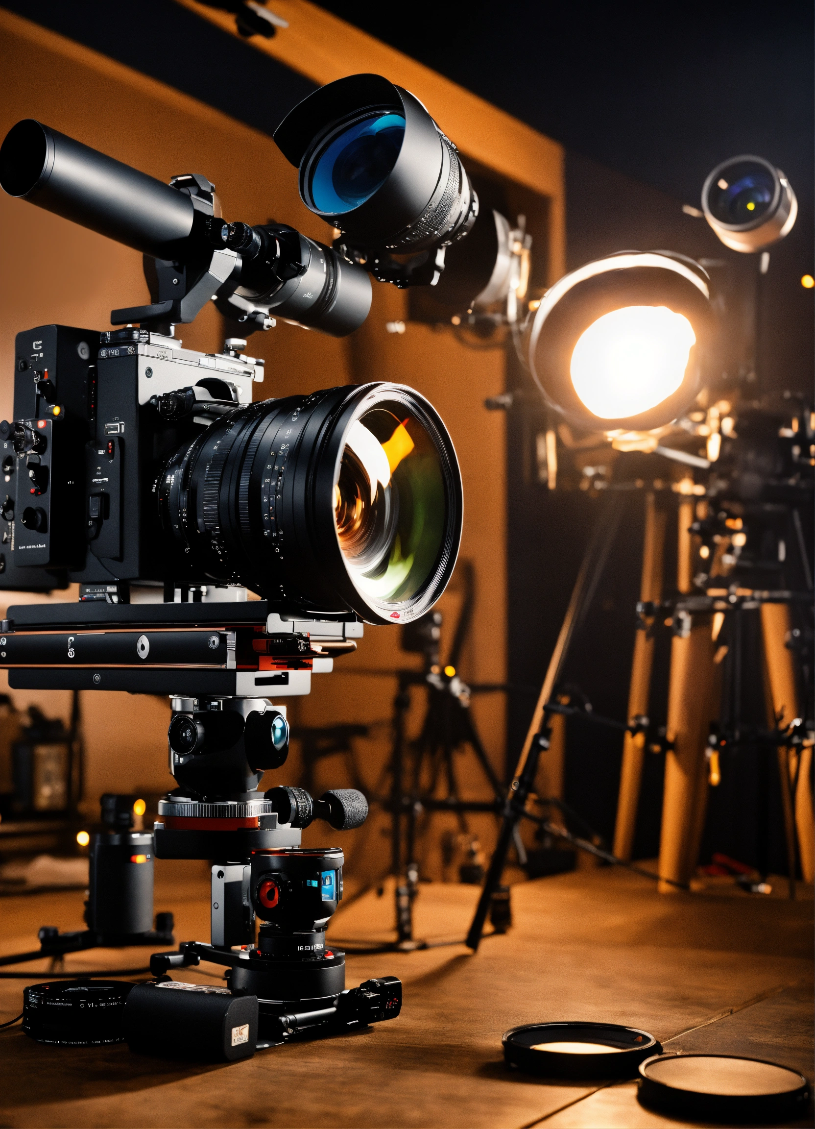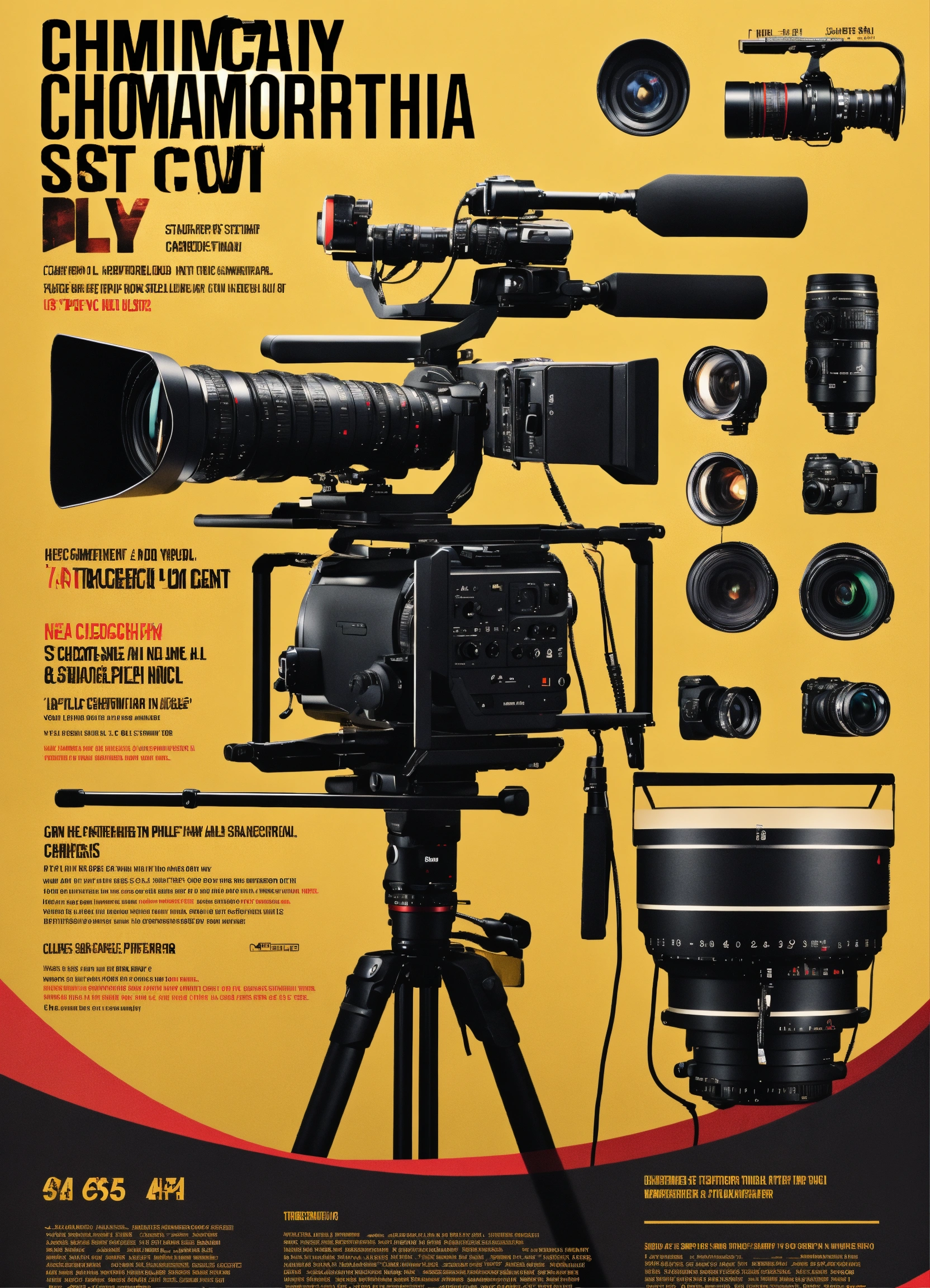Cinematography poster with cameras, with a director stand, lenses, studio equipment, lights, great composition, photography, high details