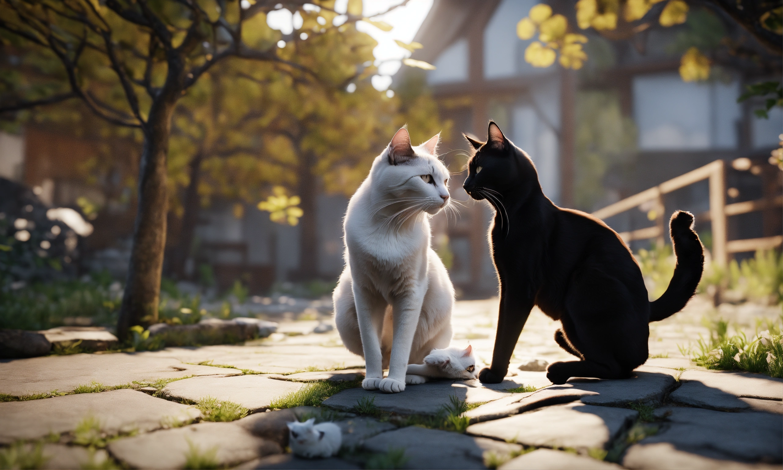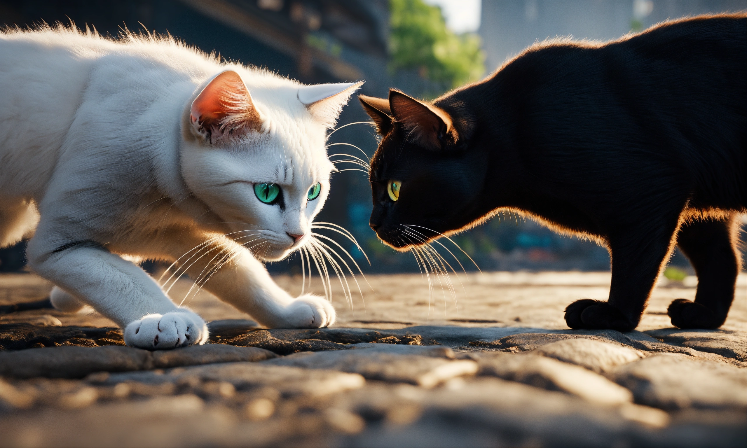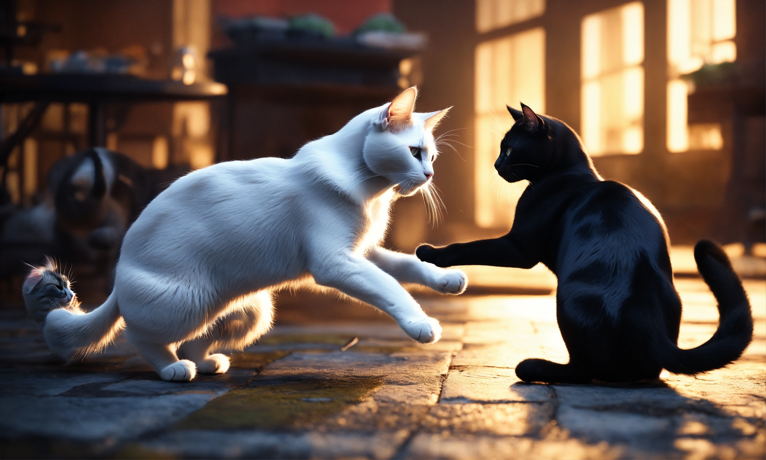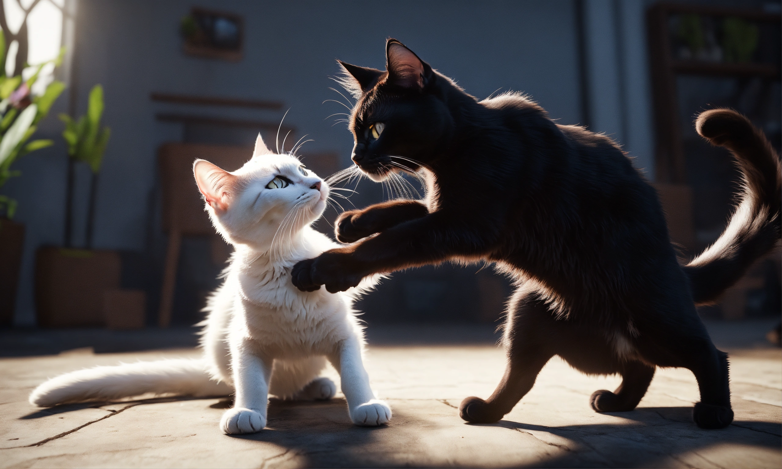 A black cat and a white cat fighting each other, unreal engine 5 render, photorealistic, dramatic scene, 4k