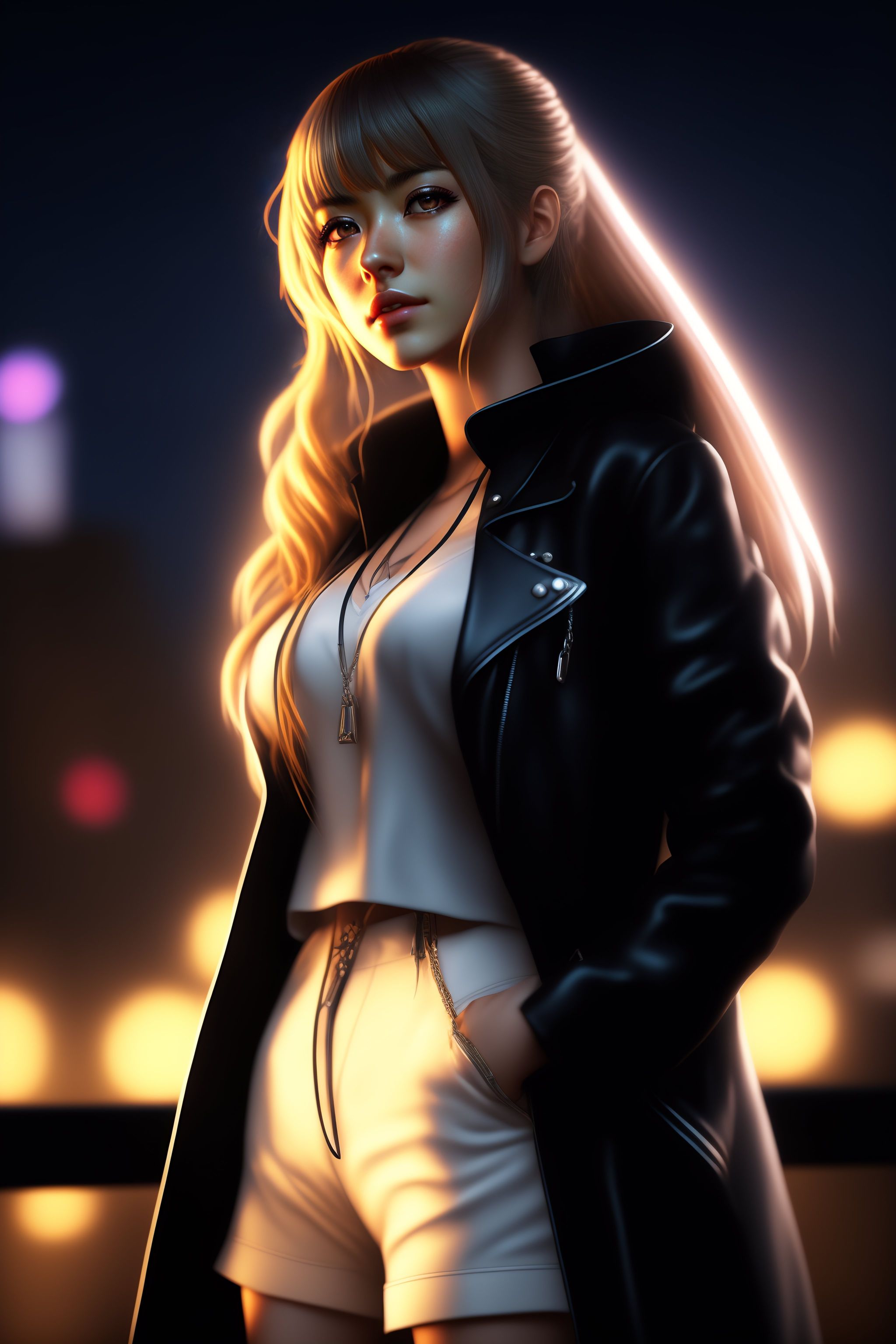 Highly detailed and realistic illustration of misa amane from death note, standing on a rooftop at night, with a cool and mysterious atmosphere, (3d rendering, concept art, digital painting), by daisuke saito