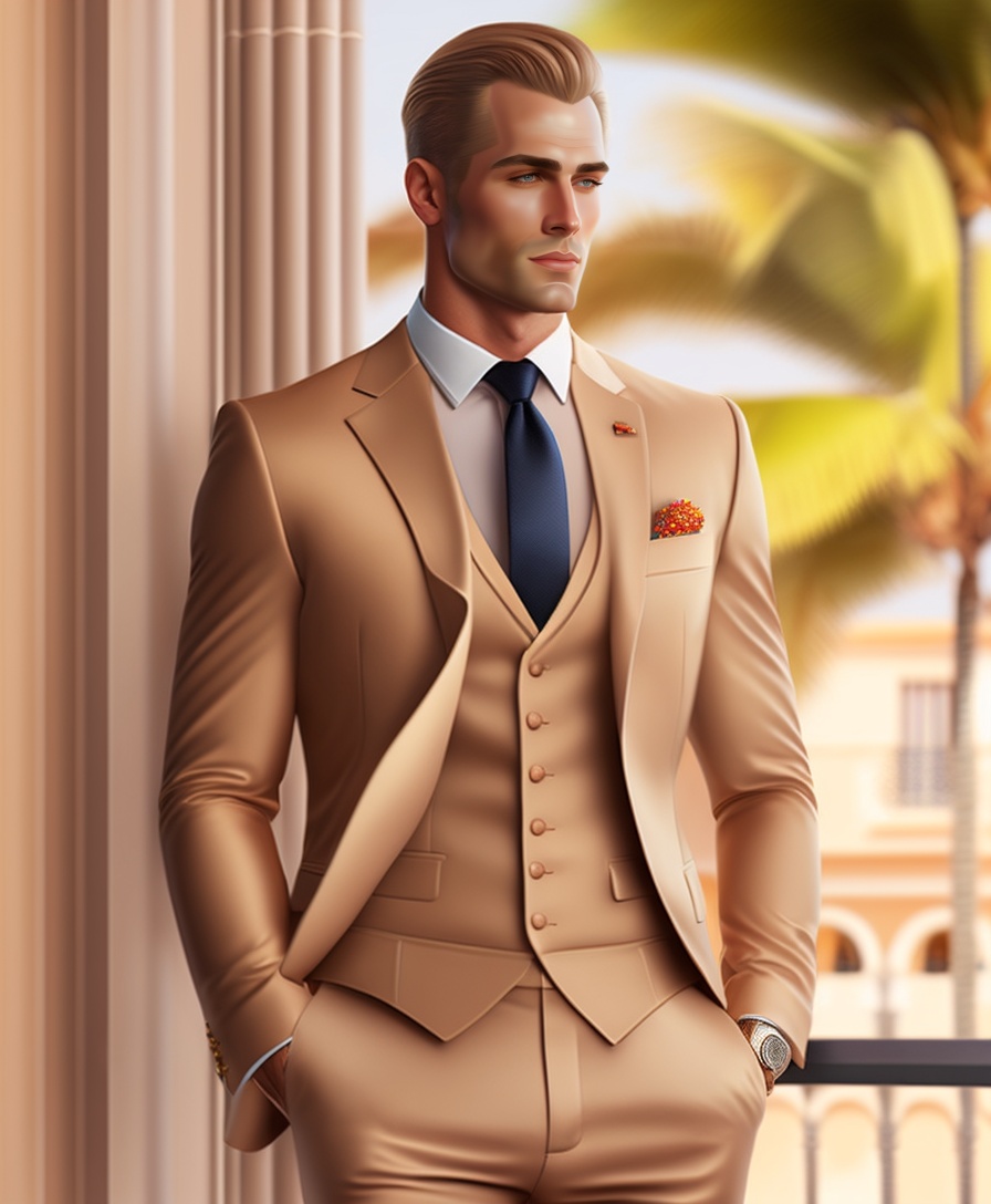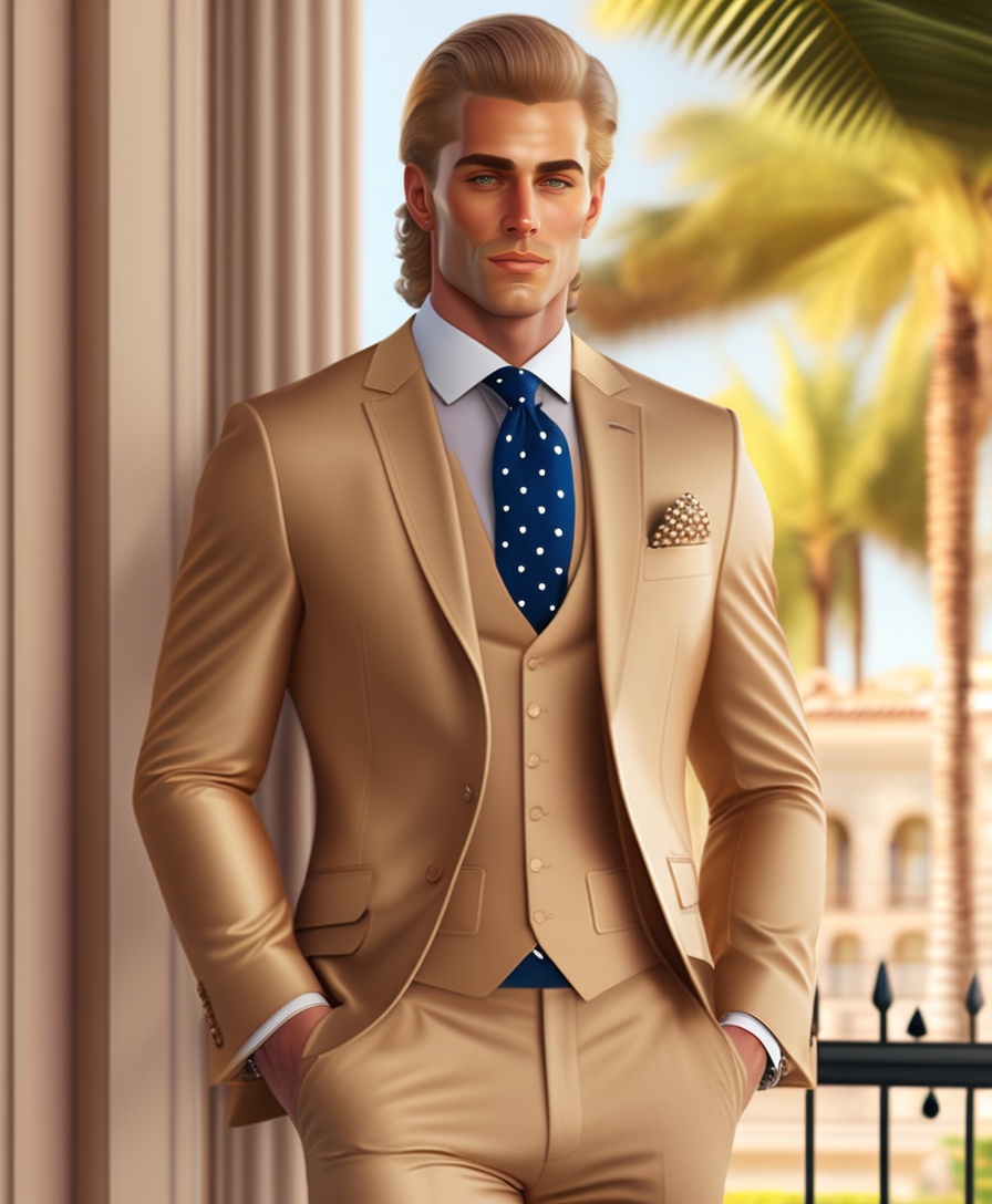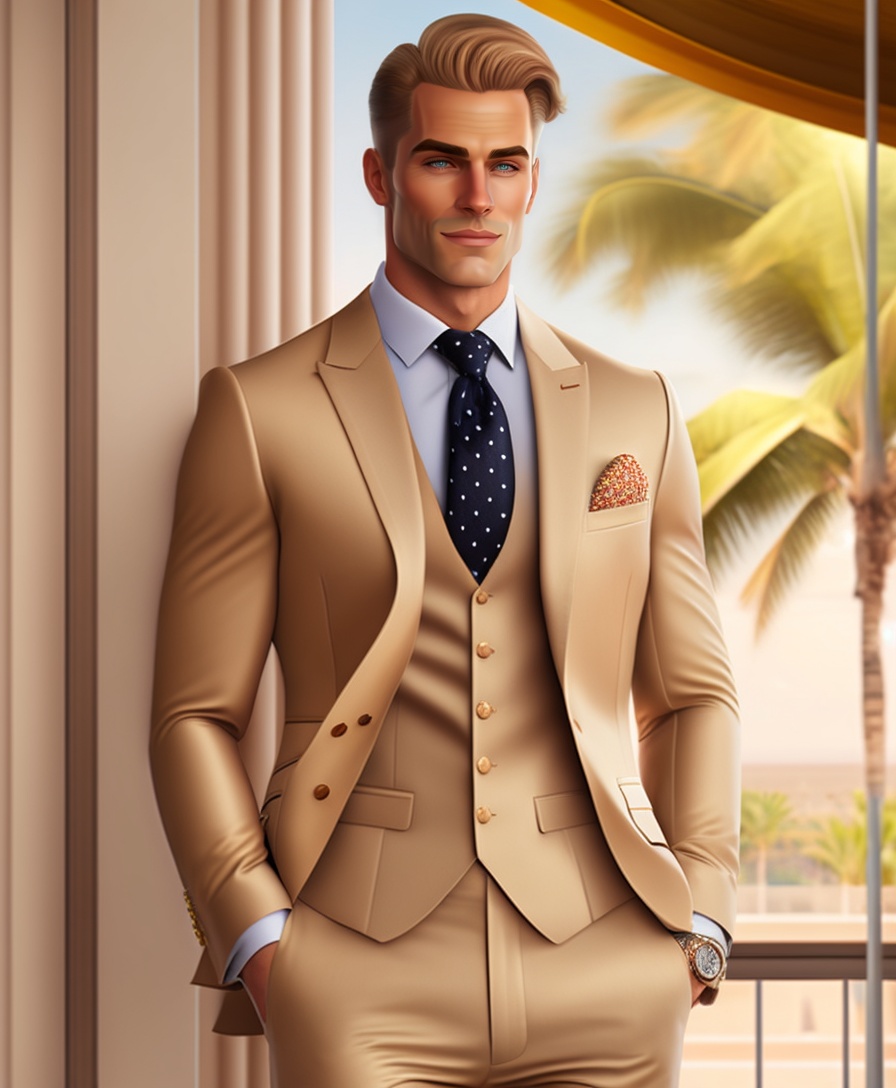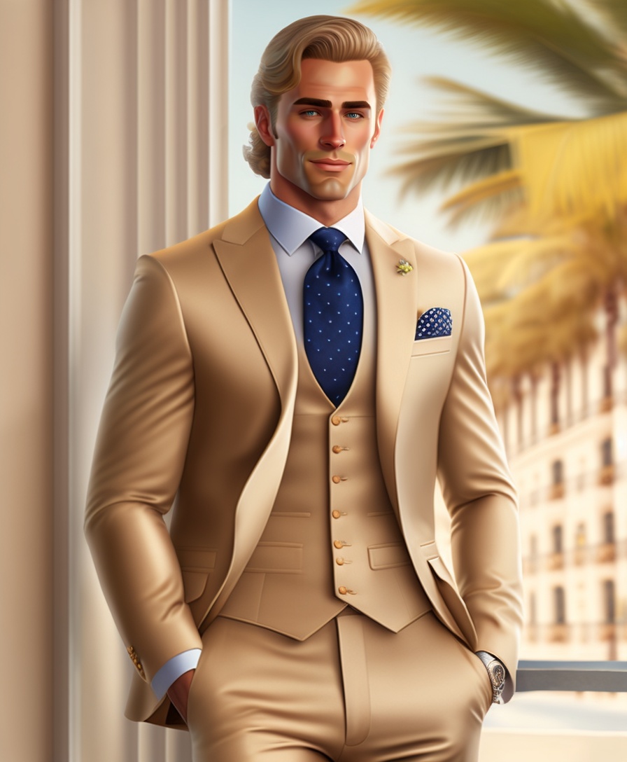 A blonde man in a beige vested suit